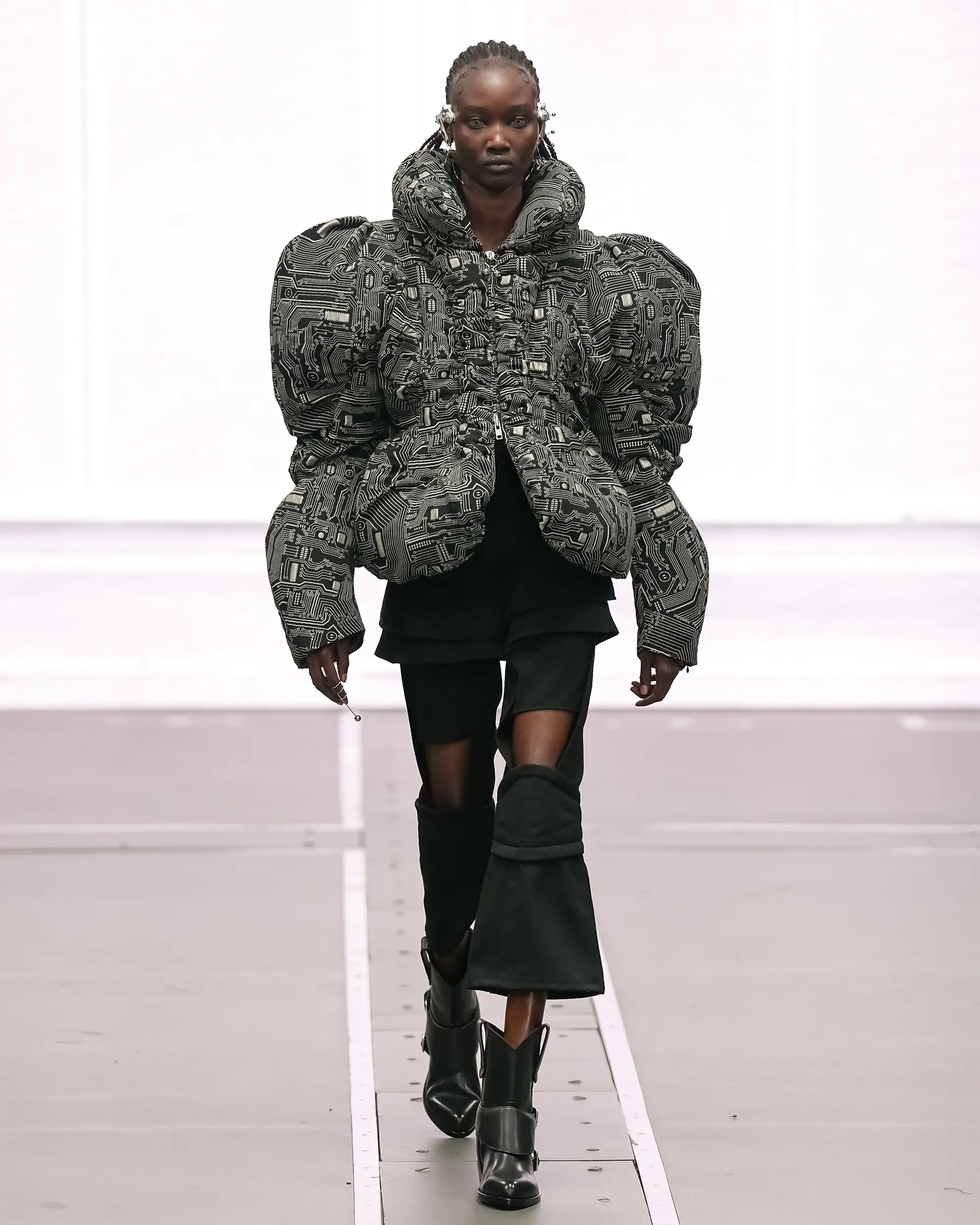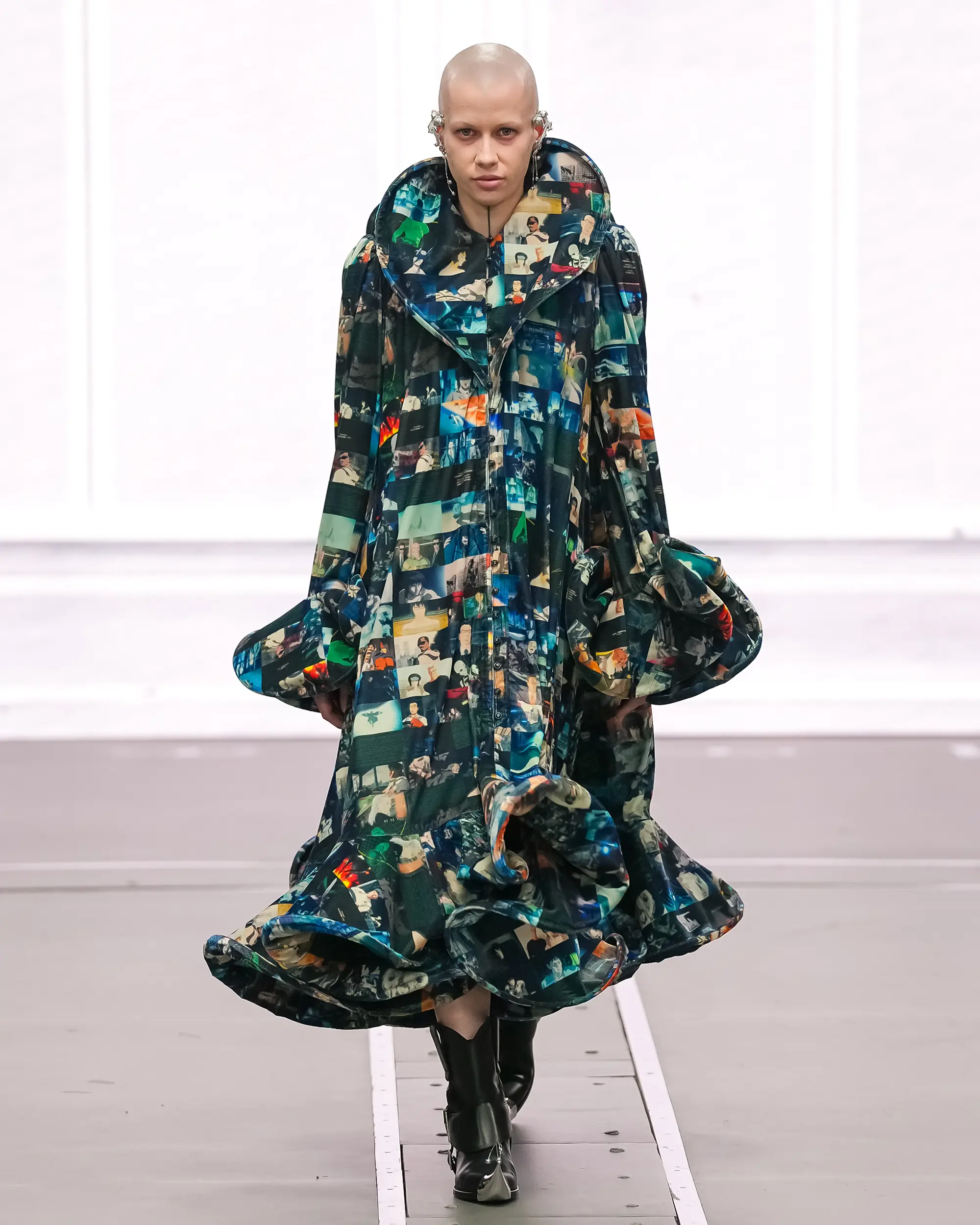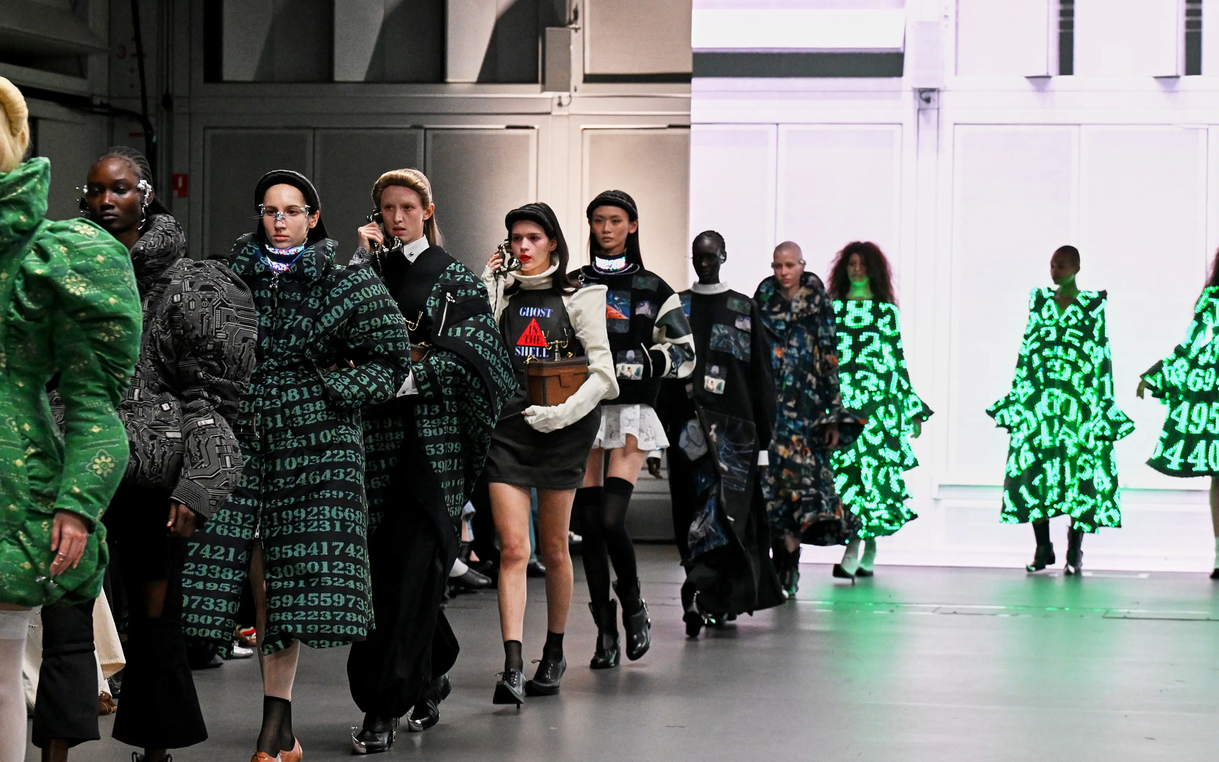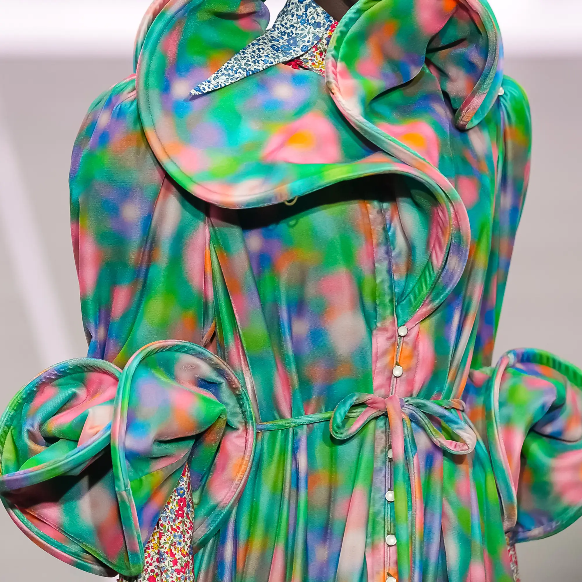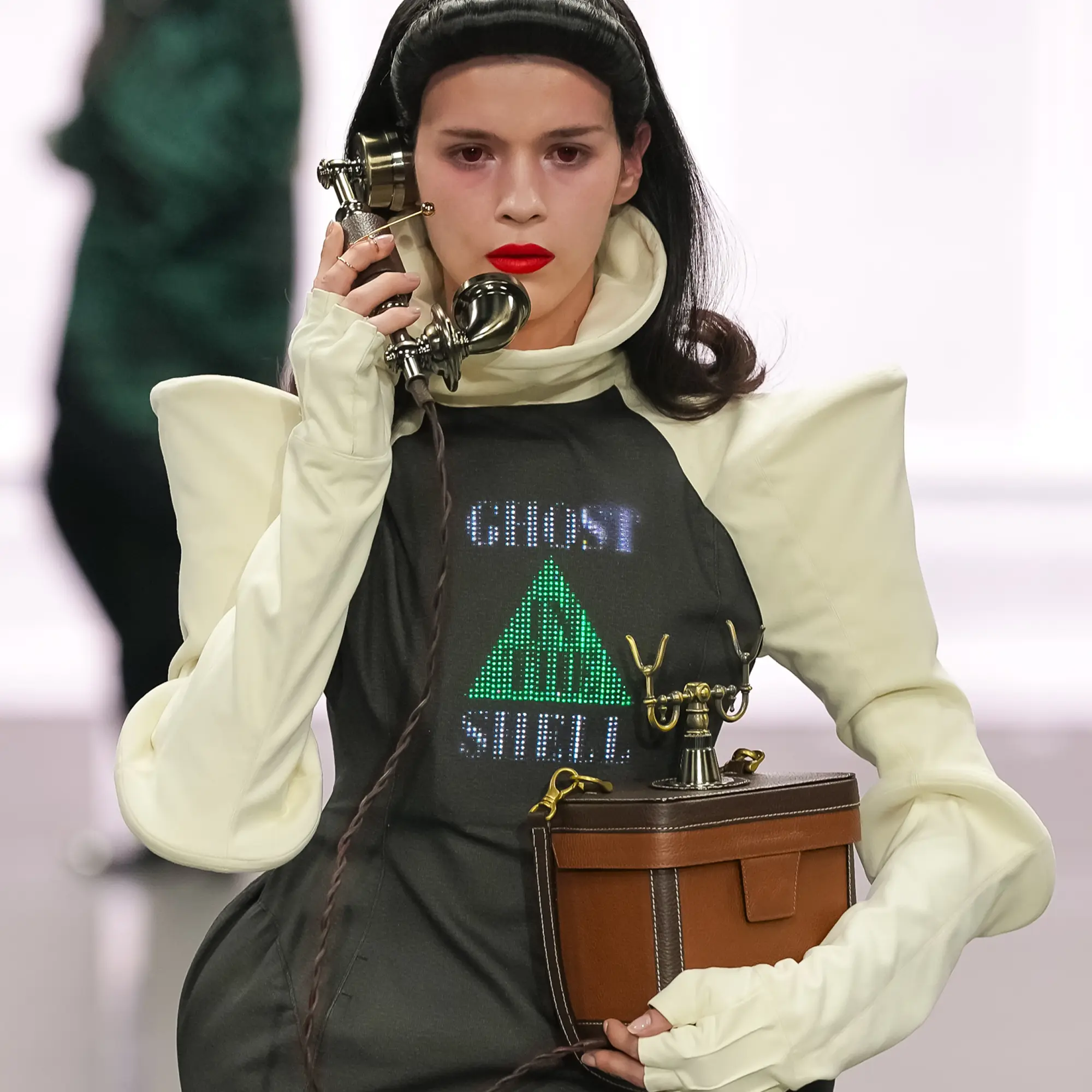 Against this erasure, a counterpoint of excess unfolds. Voluminous, Seventies-inflected silhouettes—romantic, flamboyant, unapologetically present—collide with engineered precision. Antenna-like adornments suggest transmission, extending the body into interface. If invisibility is one future, amplification is its opposite. Materials resist stability. Florals blur into digital noise; fragments of Ghost in the Shell dissolve into code and circuitry. Textiles produced with KYOCERA’s FOREARTH technology achieve painterly softness without water—presence emerging through absence.