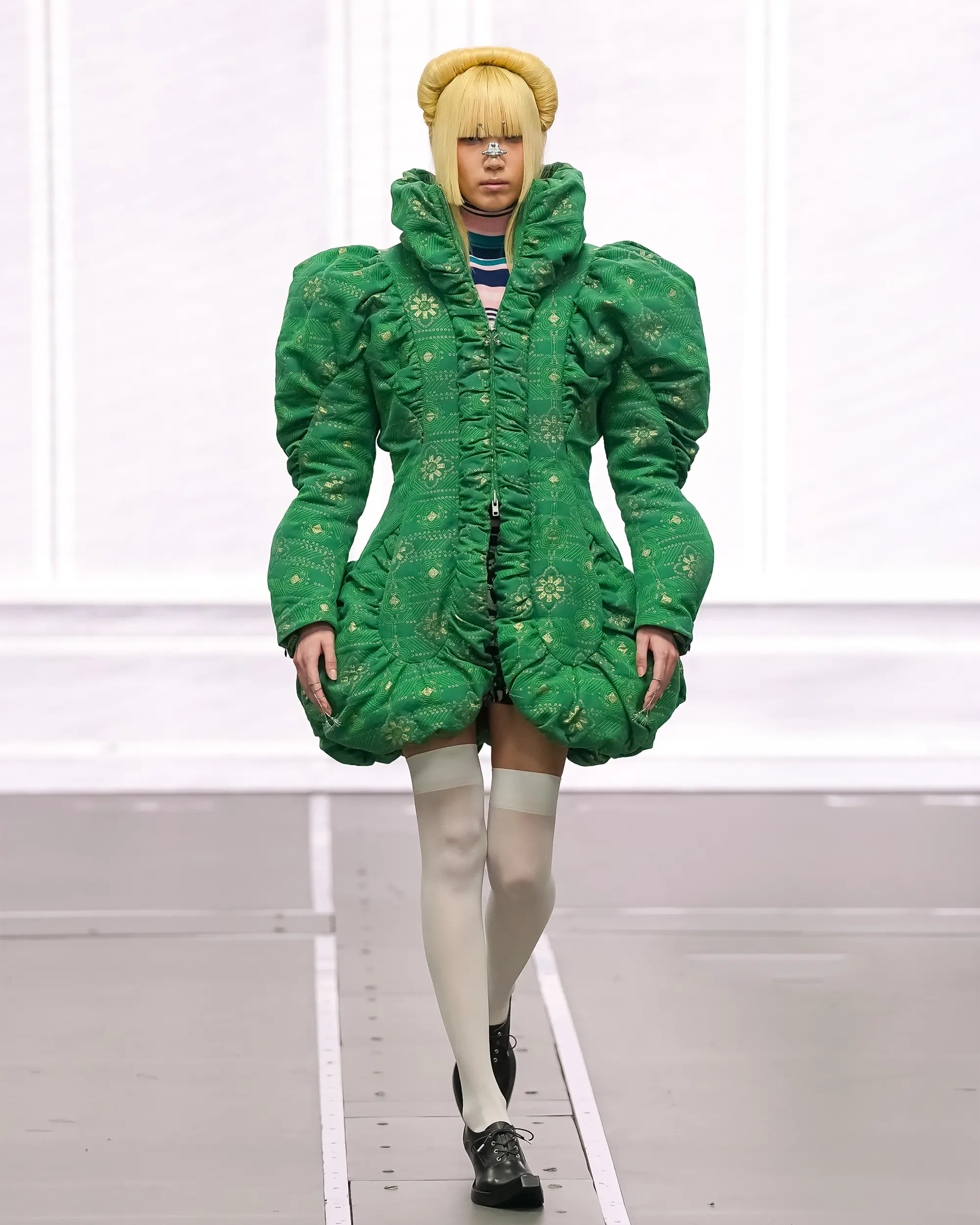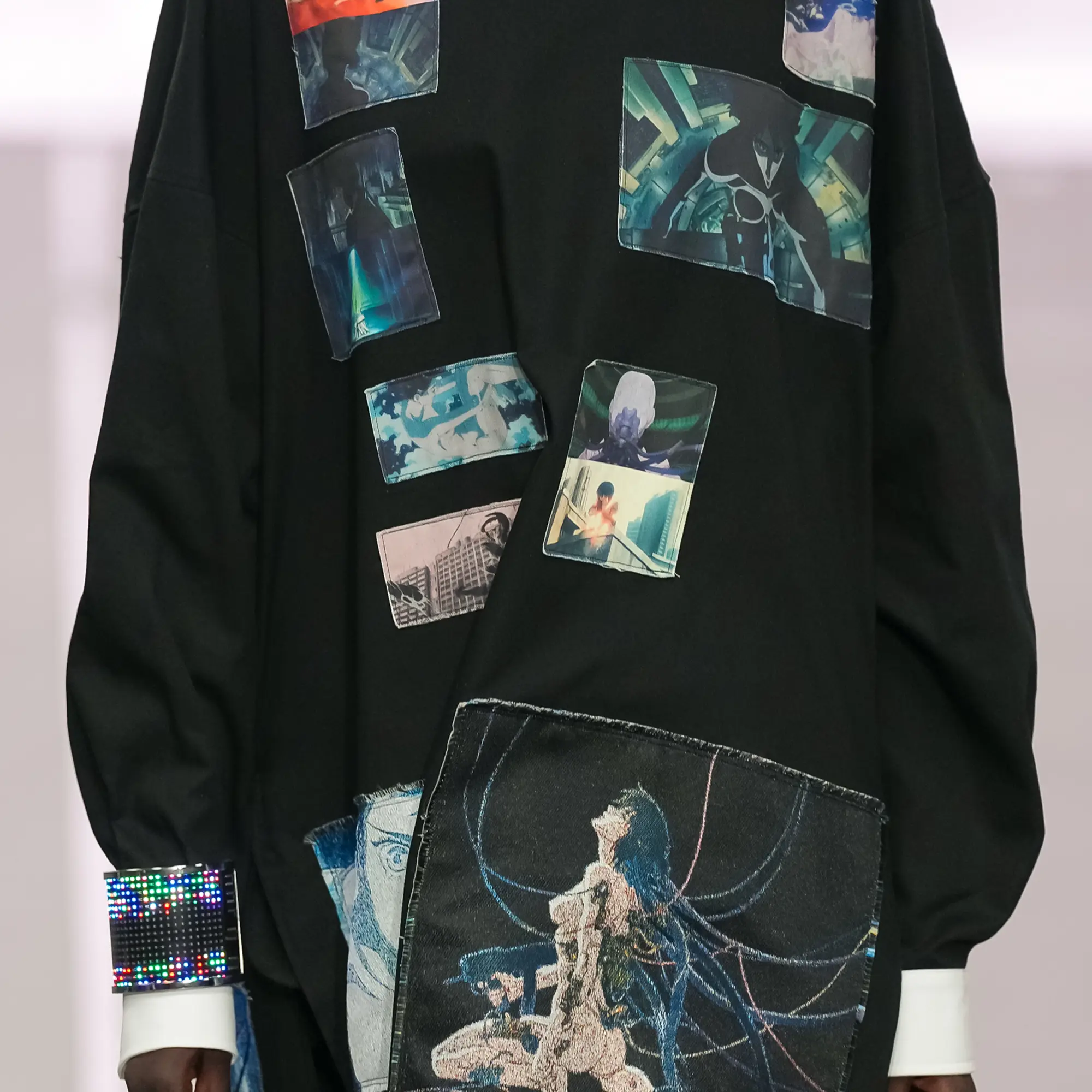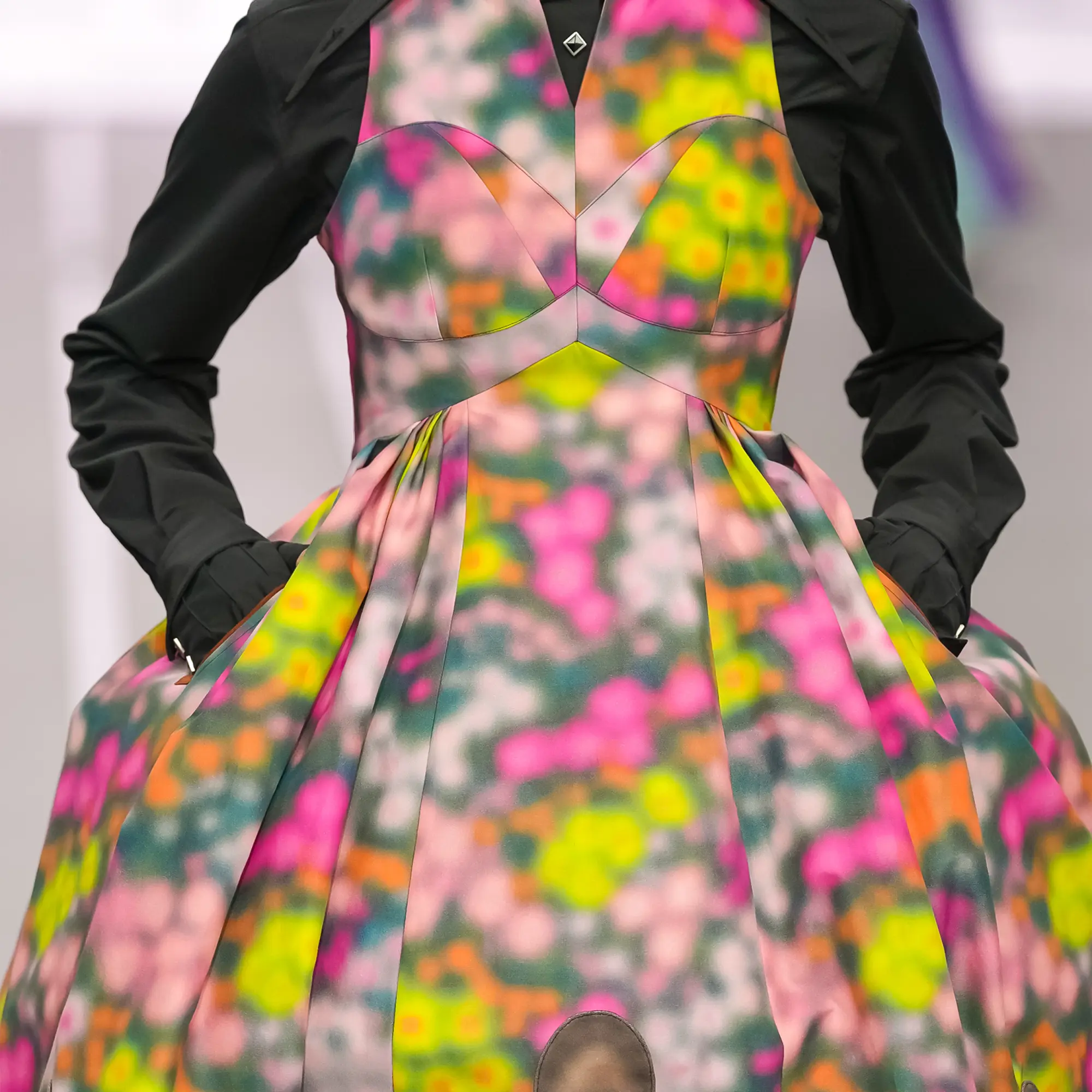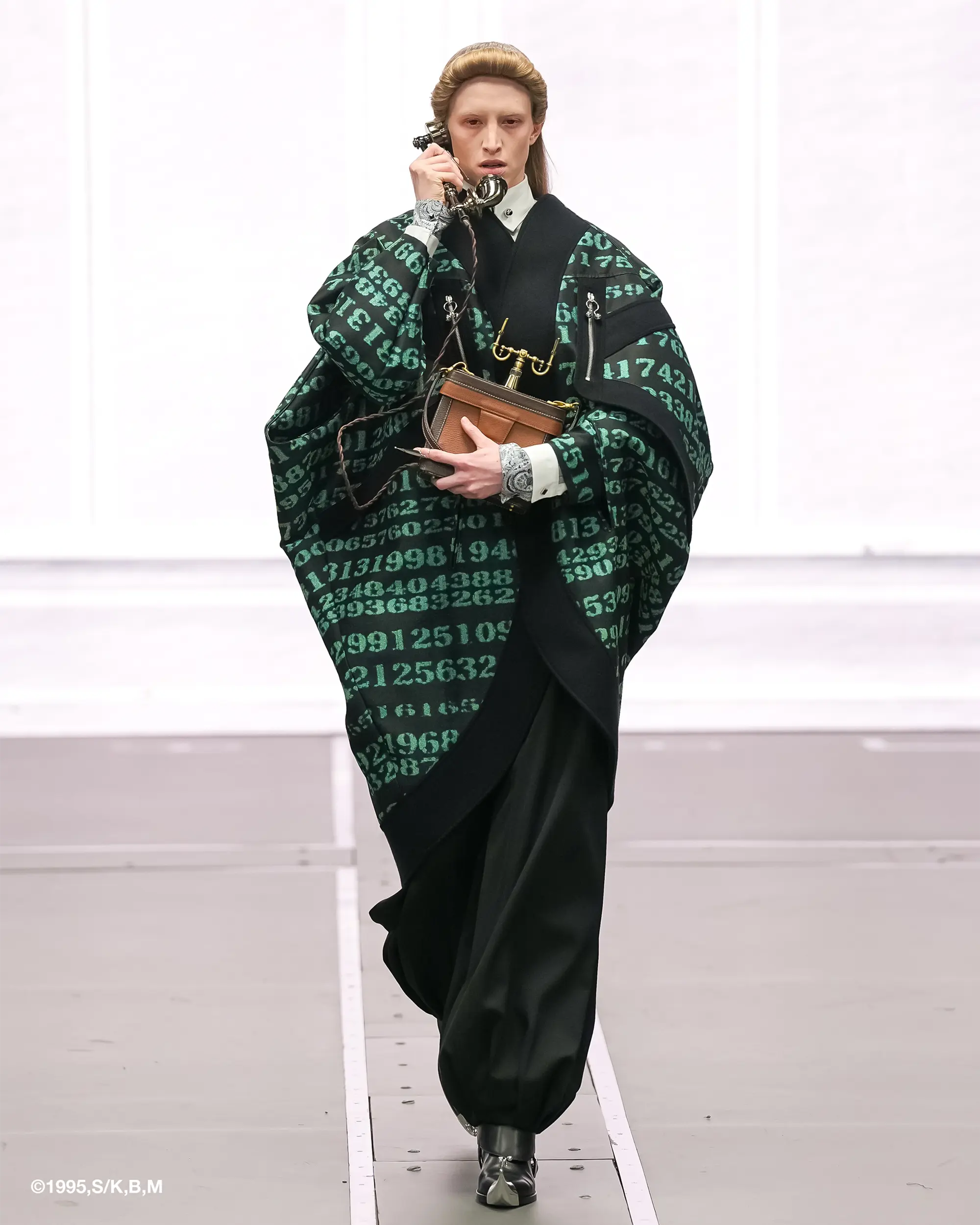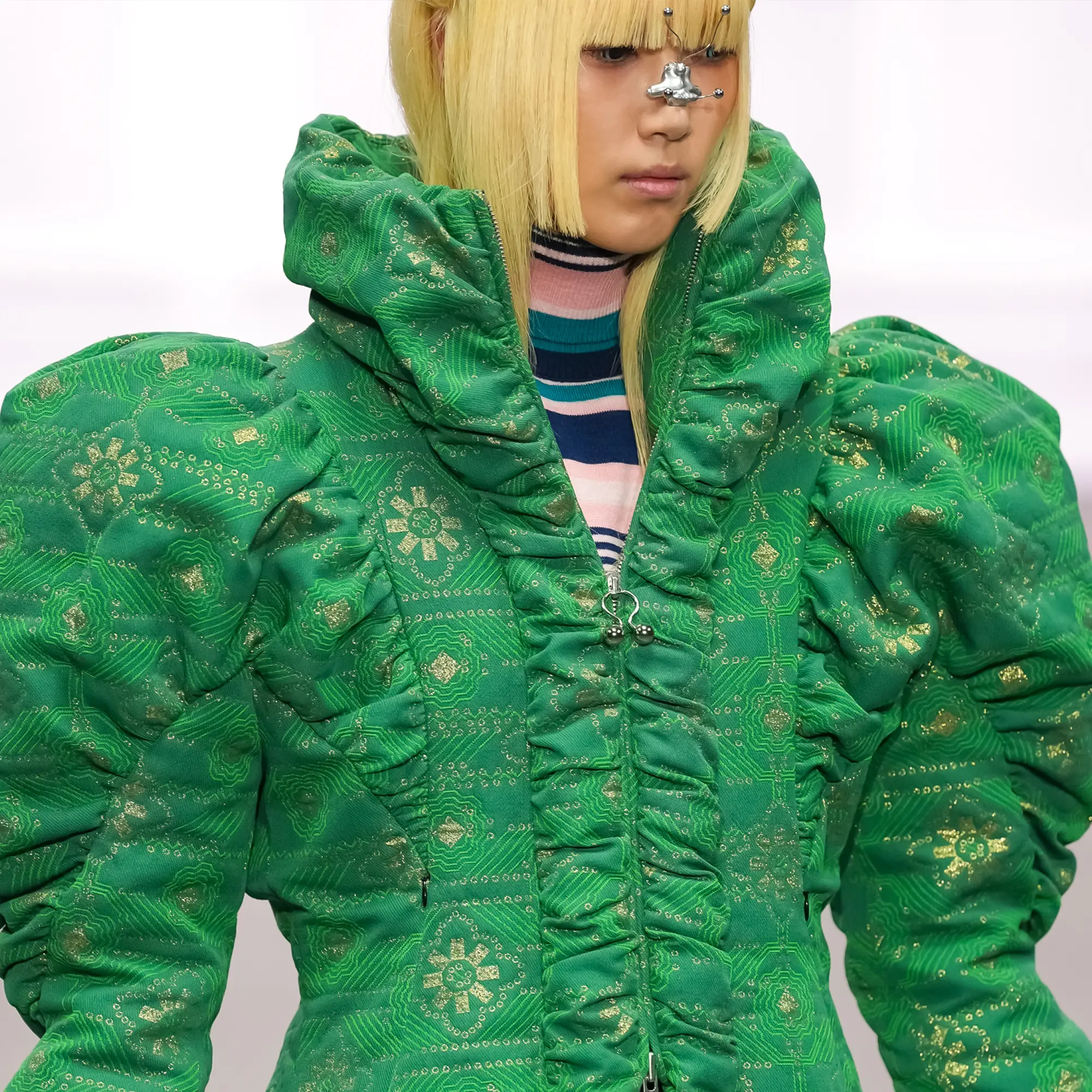 Against this erasure, a counterpoint of excess unfolds. Voluminous, Seventies-inflected silhouettes—romantic, flamboyant, unapologetically present—collide with engineered precision. Antenna-like adornments suggest transmission, extending the body into interface. If invisibility is one future, amplification is its opposite. Materials resist stability. Florals blur into digital noise; fragments of Ghost in the Shell dissolve into code and circuitry. Textiles produced with KYOCERA’s FOREARTH technology achieve painterly softness without water—presence emerging through absence.