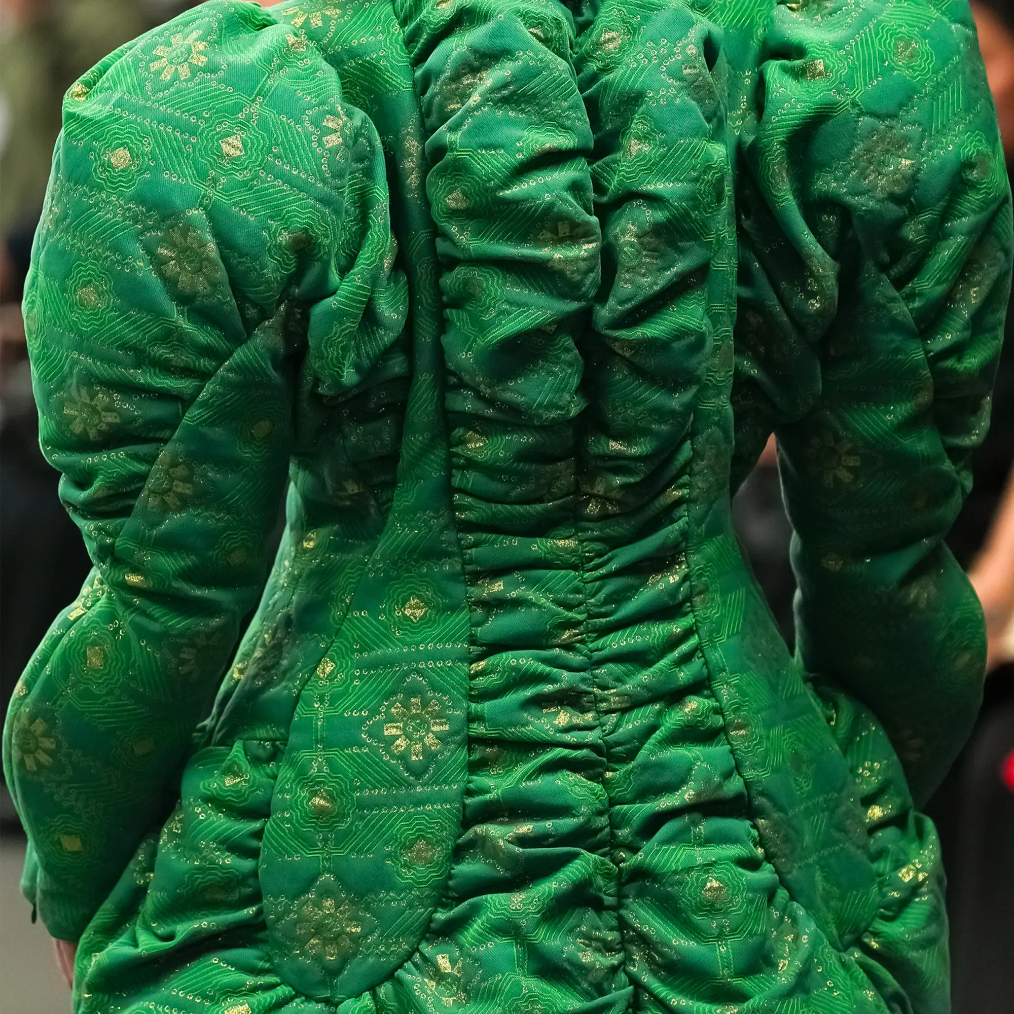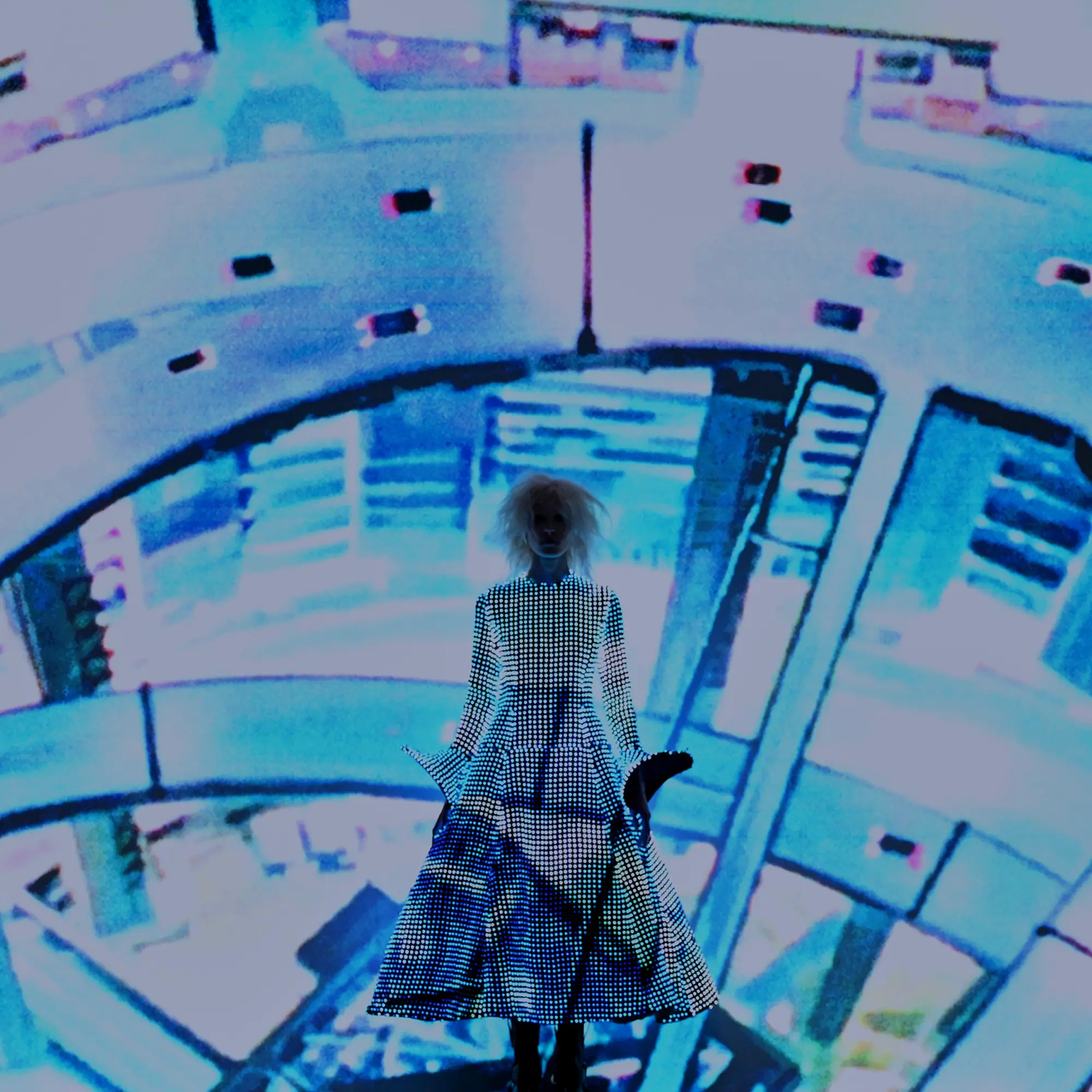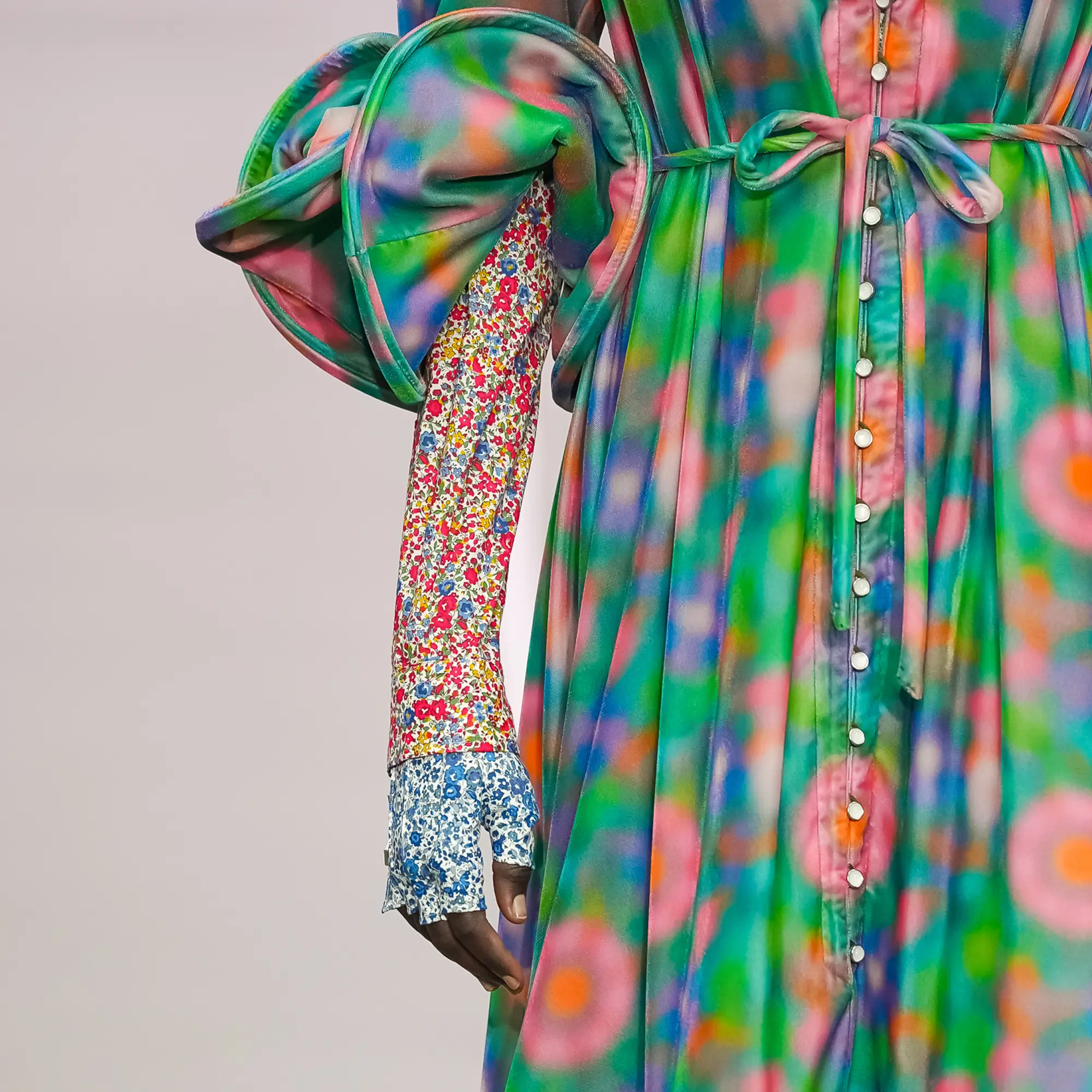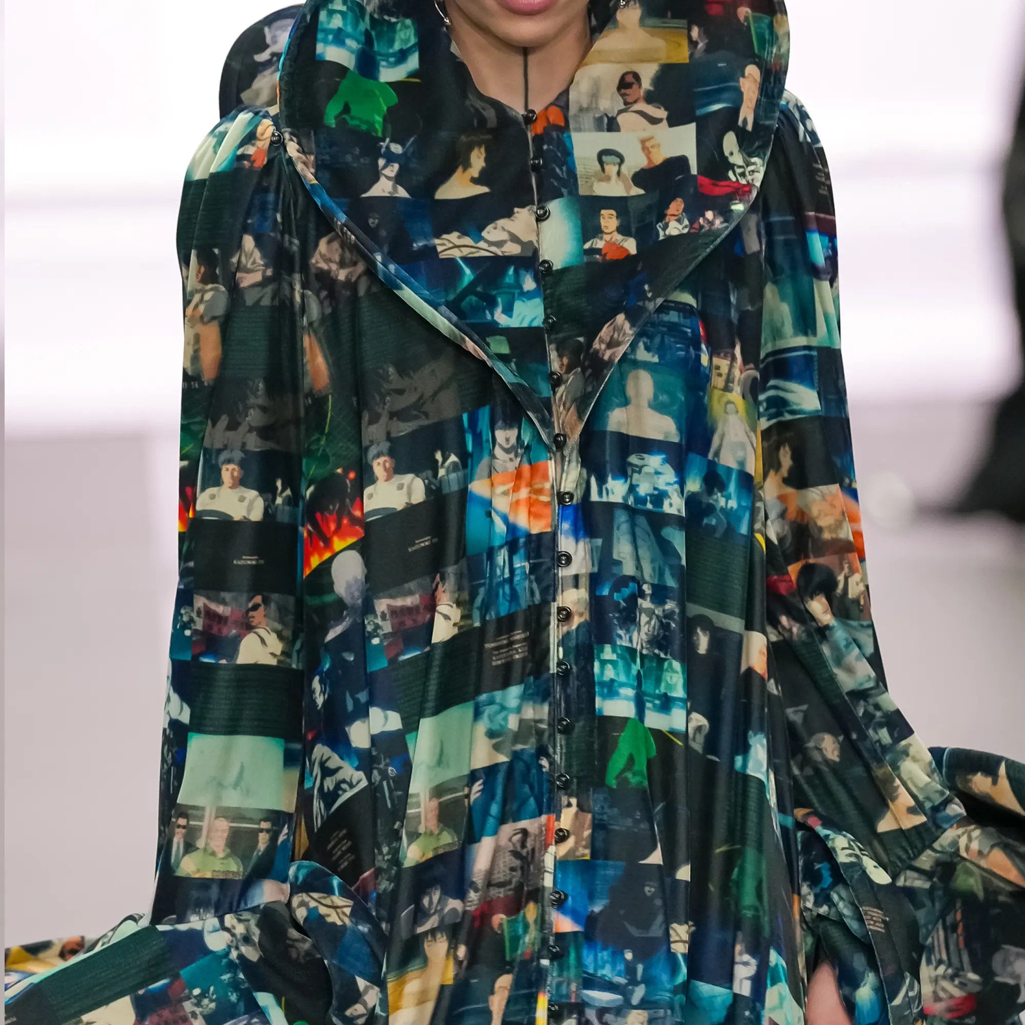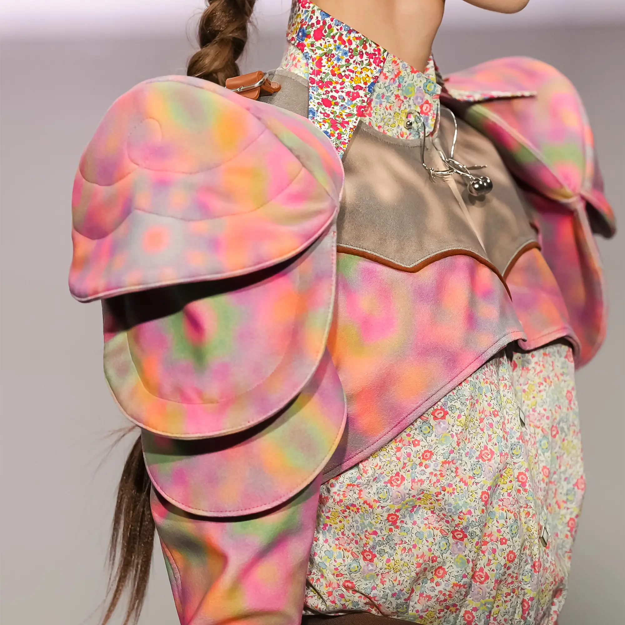 Against this erasure, a counterpoint of excess unfolds. Voluminous, Seventies-inflected silhouettes—romantic, flamboyant, unapologetically present—collide with engineered precision. Antenna-like adornments suggest transmission, extending the body into interface. If invisibility is one future, amplification is its opposite. Materials resist stability. Florals blur into digital noise; fragments of Ghost in the Shell dissolve into code and circuitry. Textiles produced with KYOCERA’s FOREARTH technology achieve painterly softness without water—presence emerging through absence.