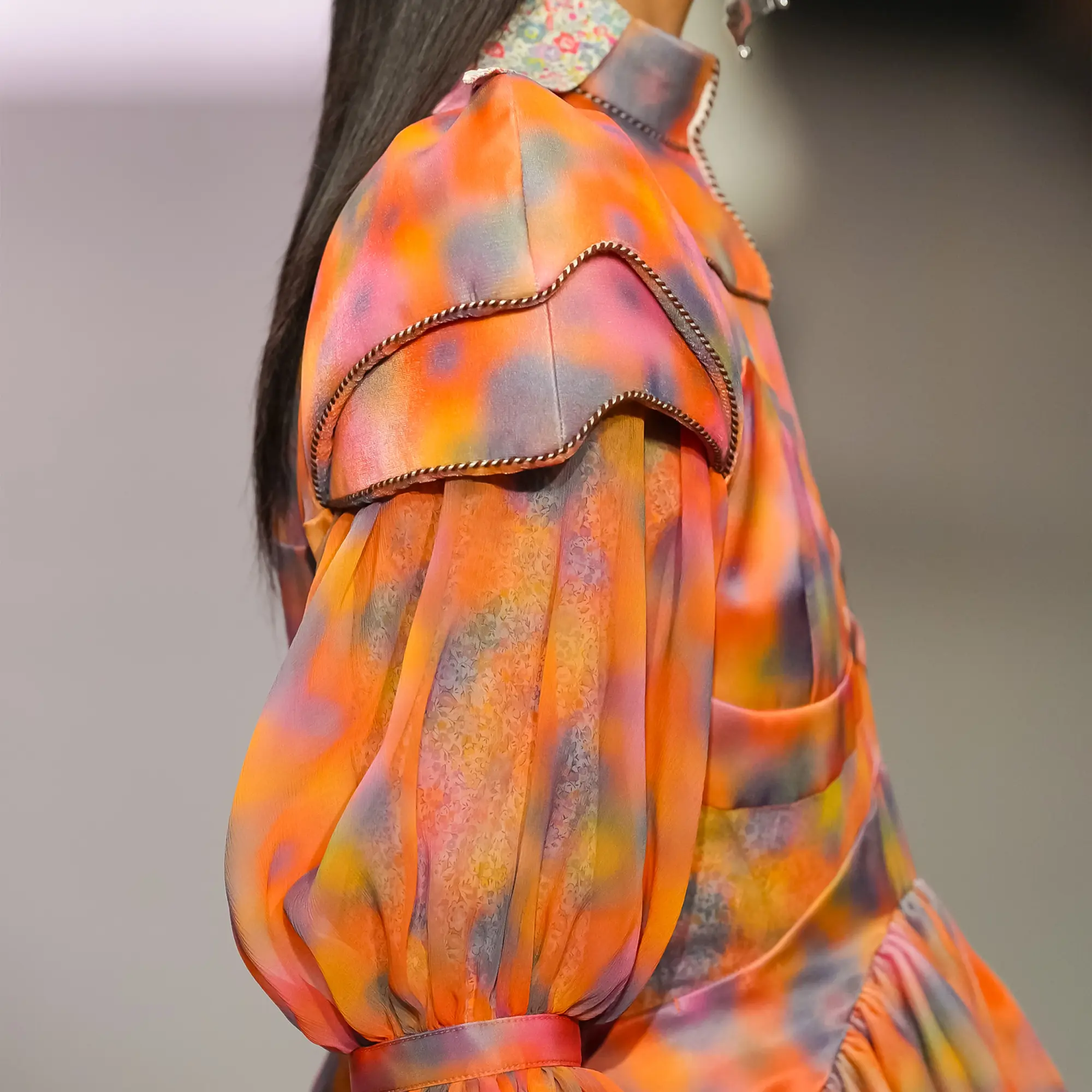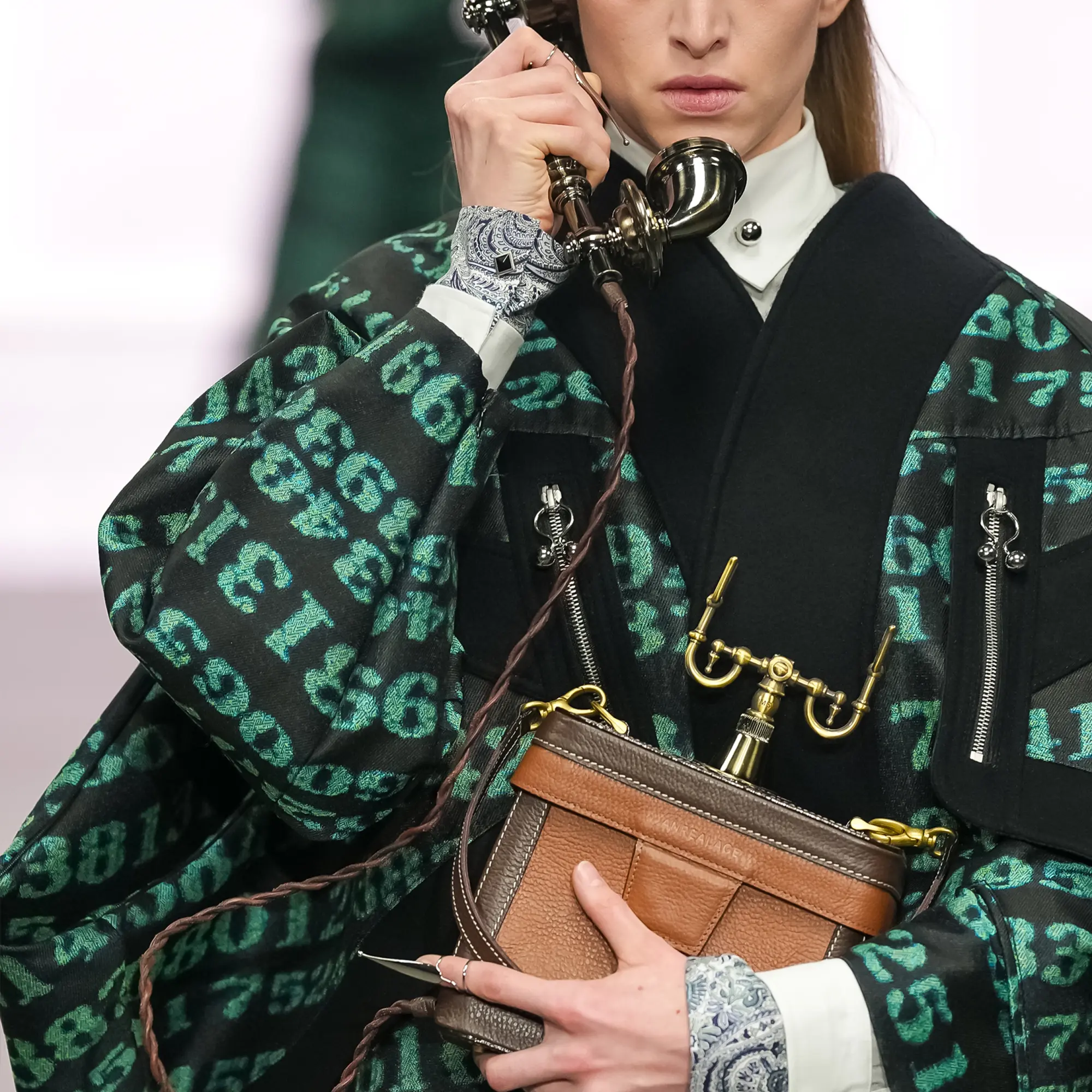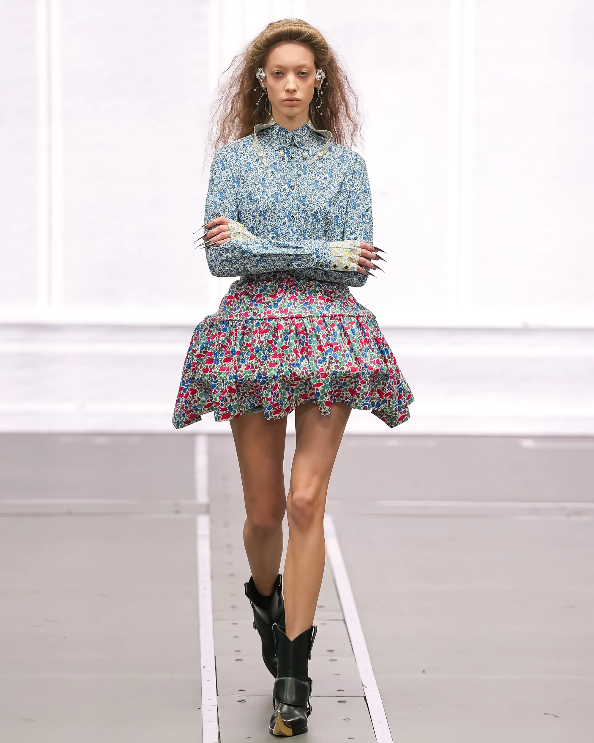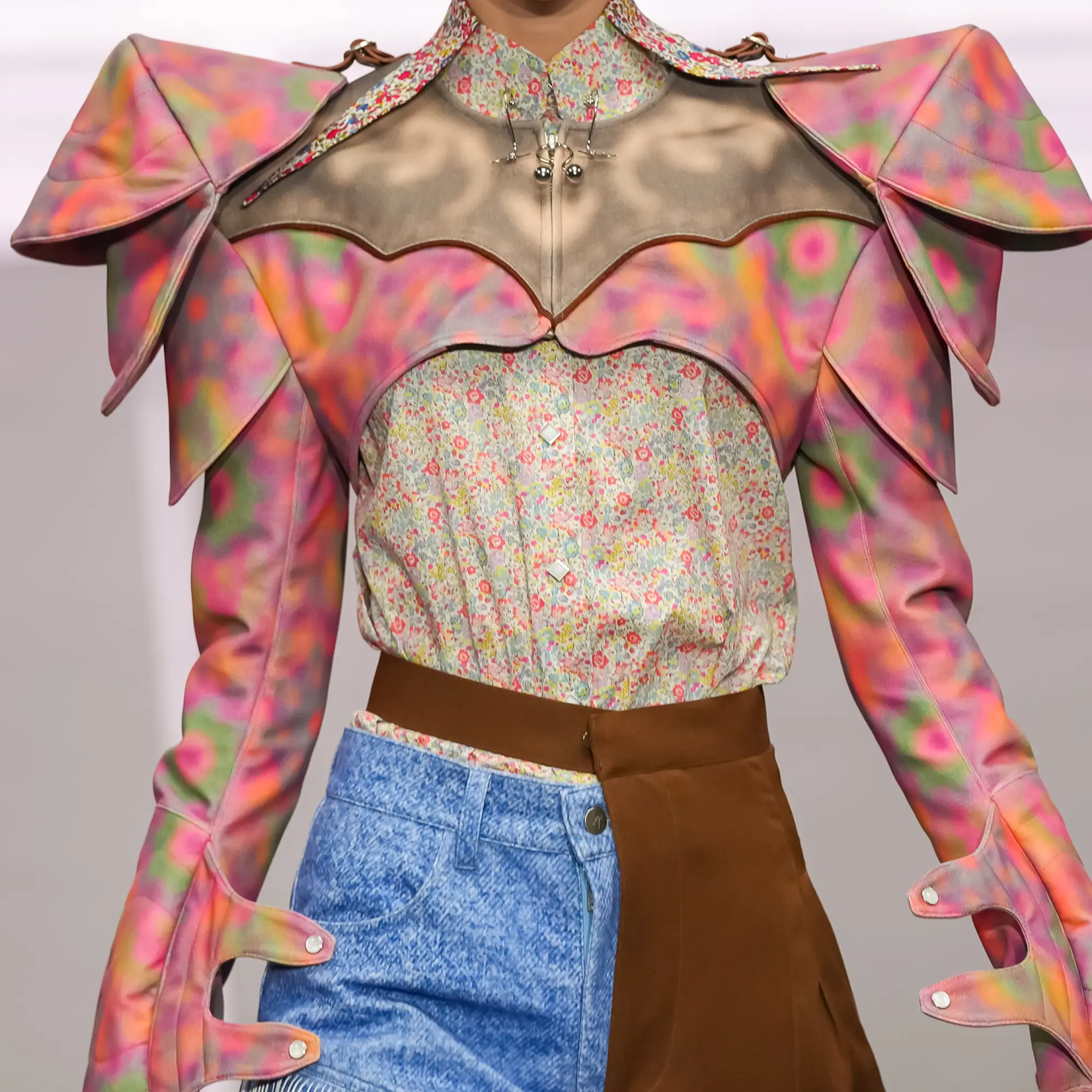 Against this erasure, a counterpoint of excess unfolds. Voluminous, Seventies-inflected silhouettes—romantic, flamboyant, unapologetically present—collide with engineered precision. Antenna-like adornments suggest transmission, extending the body into interface. If invisibility is one future, amplification is its opposite. Materials resist stability. Florals blur into digital noise; fragments of Ghost in the Shell dissolve into code and circuitry. Textiles produced with KYOCERA’s FOREARTH technology achieve painterly softness without water—presence emerging through absence.