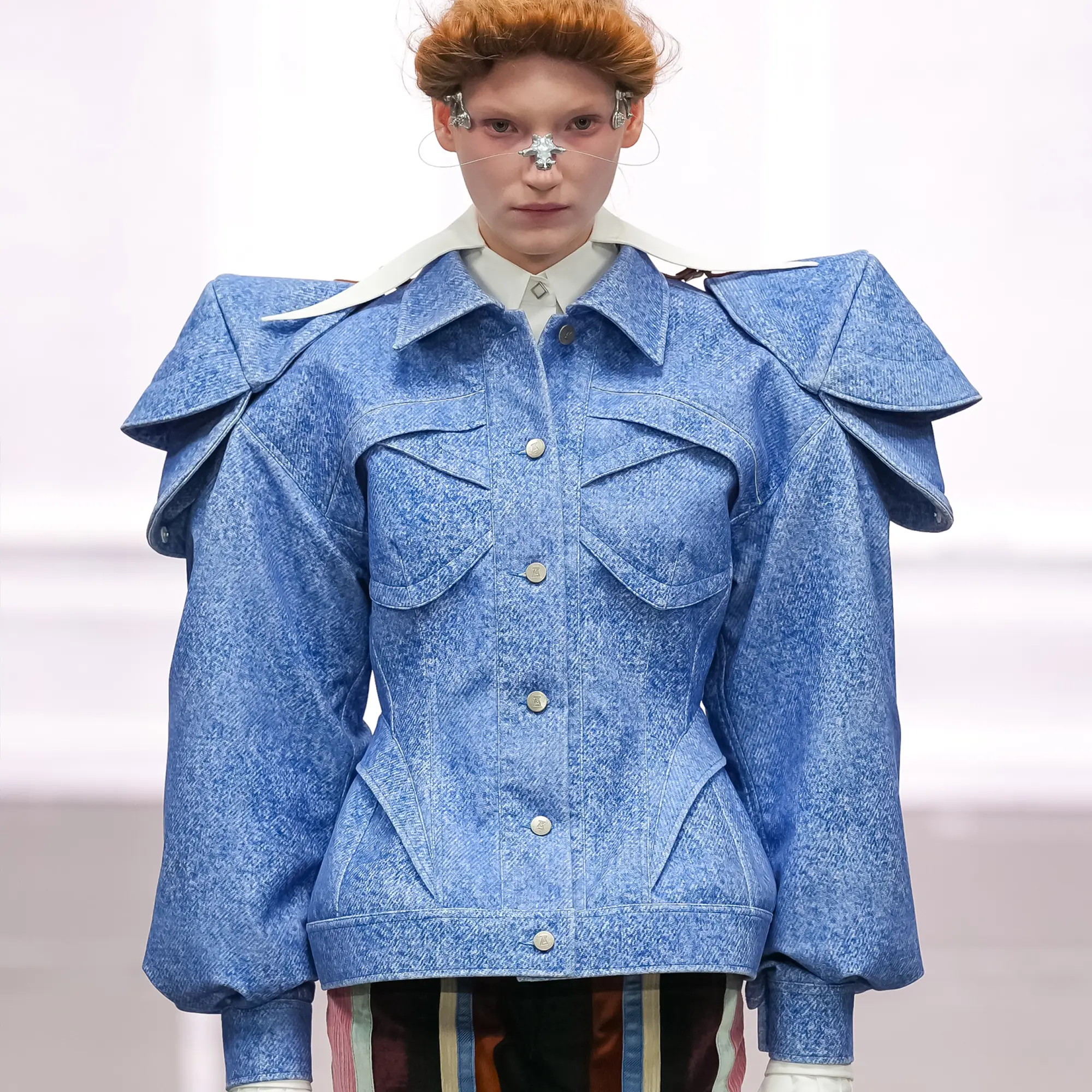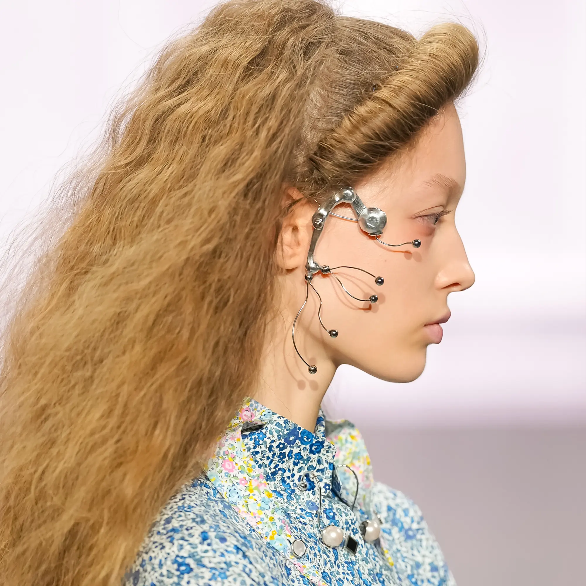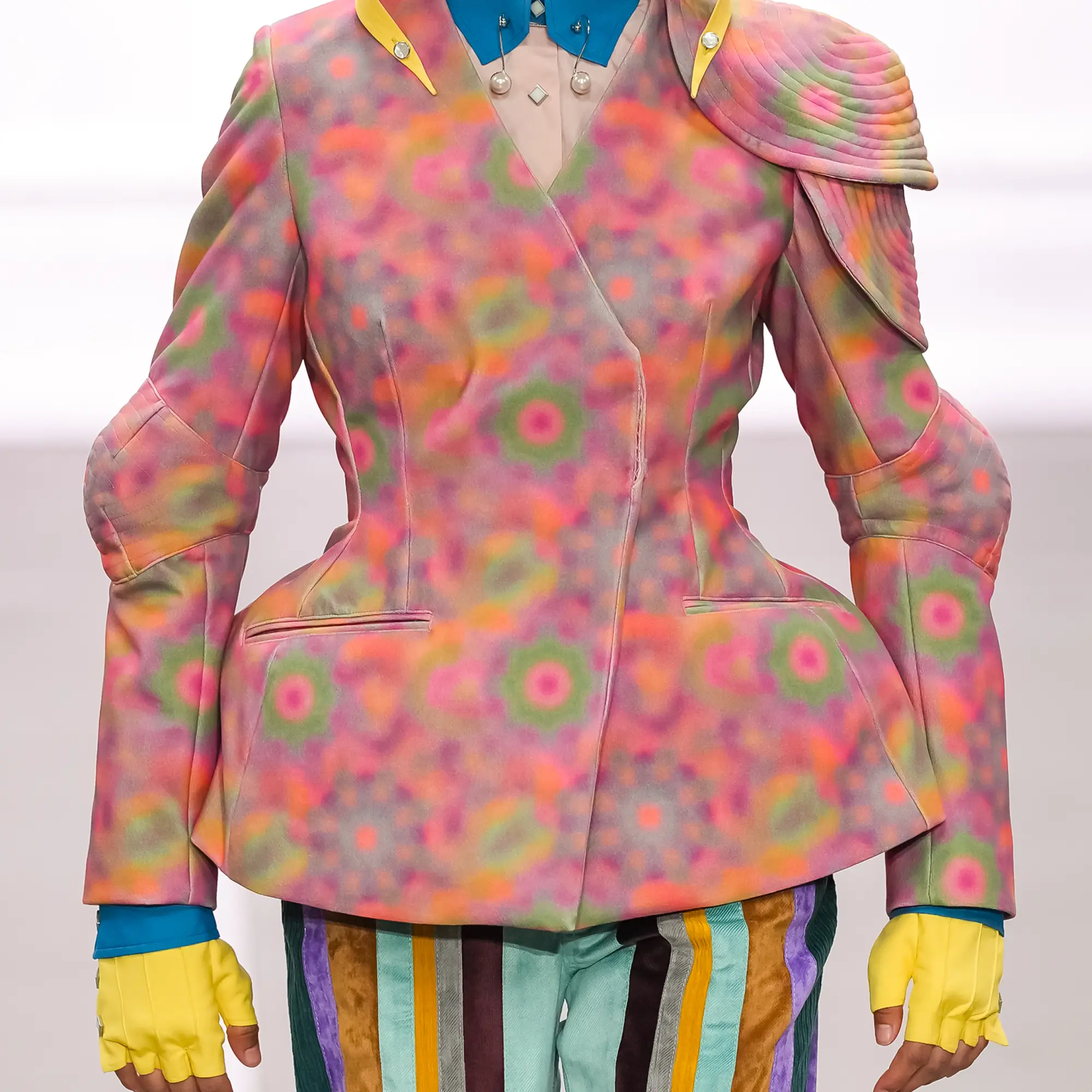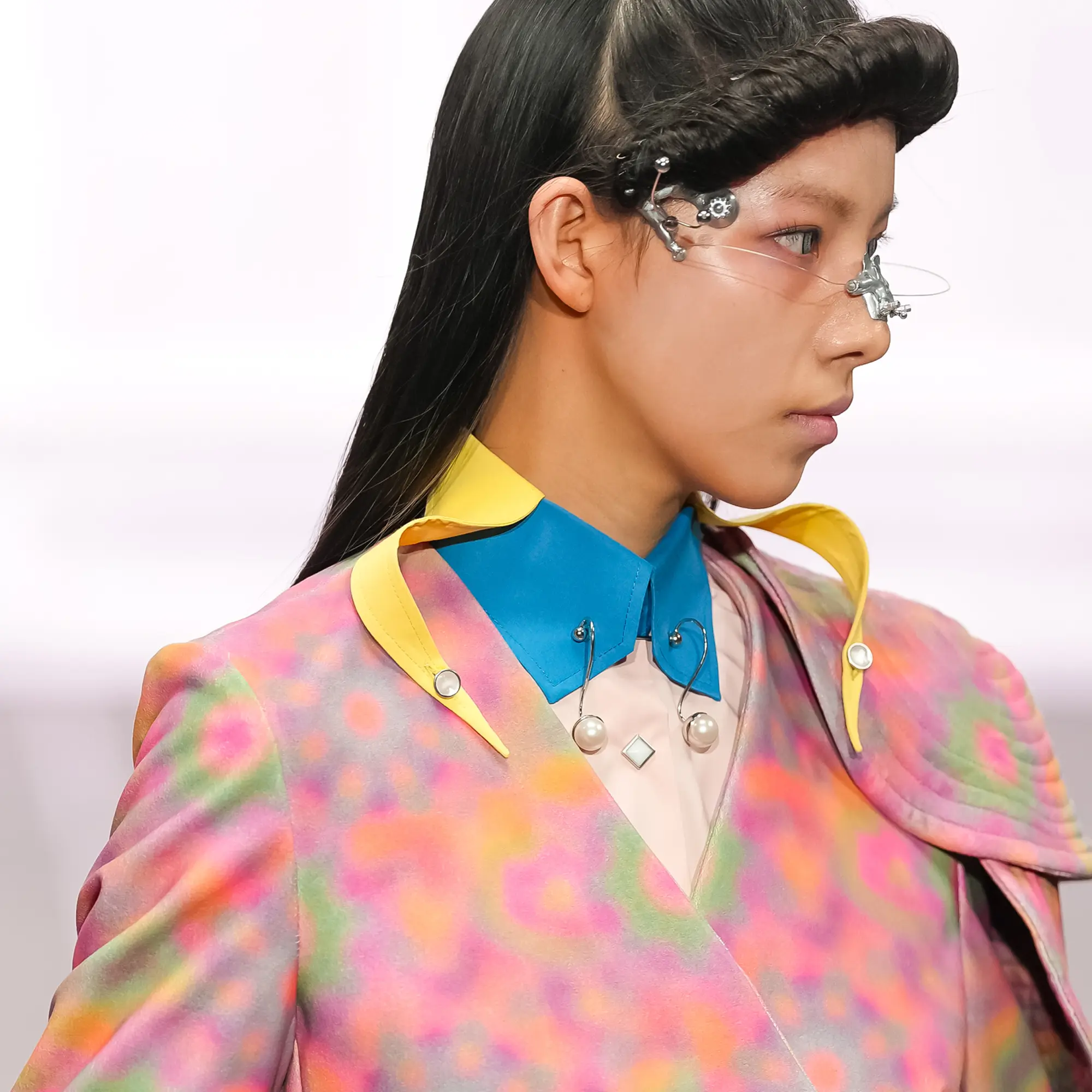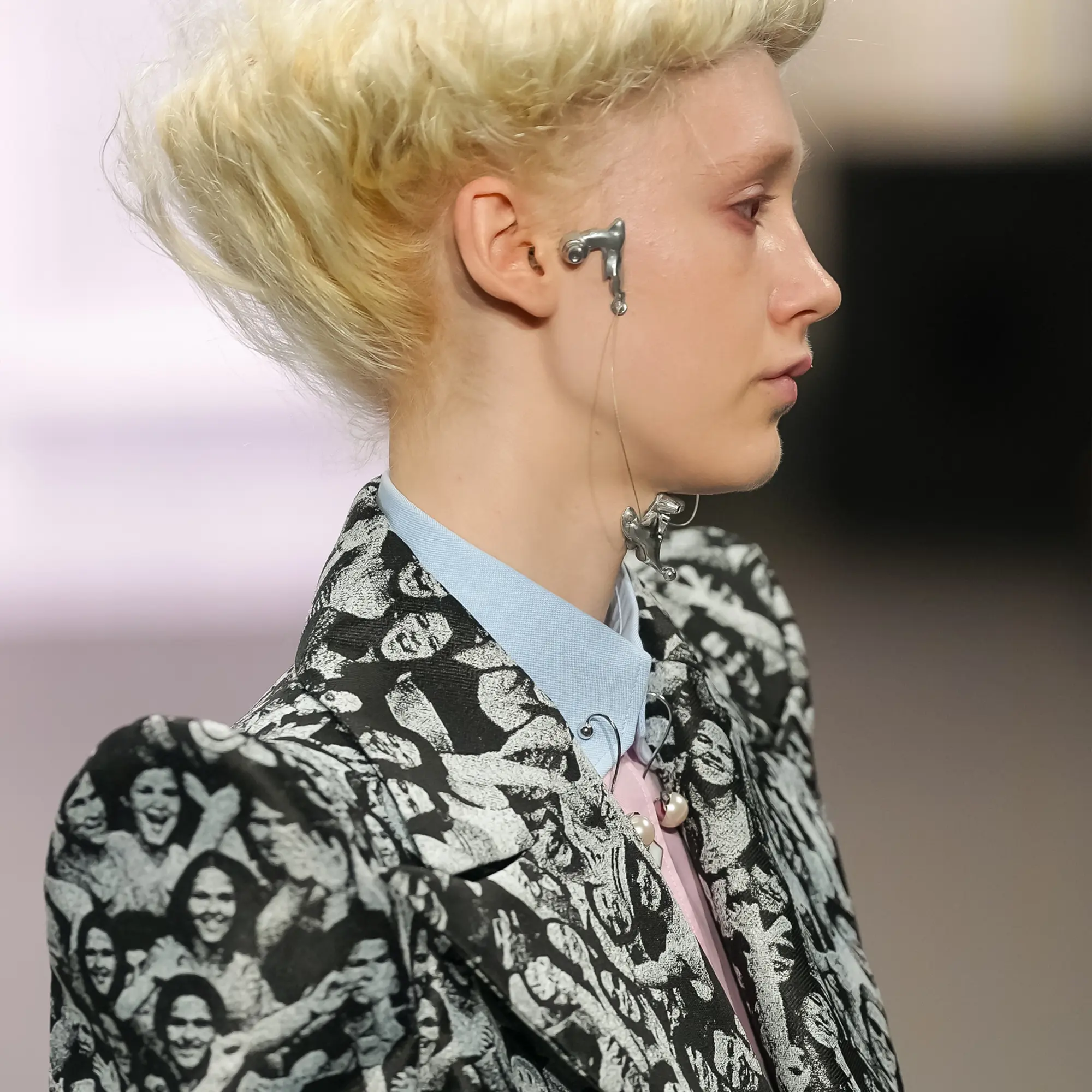 Against this erasure, a counterpoint of excess unfolds. Voluminous, Seventies-inflected silhouettes—romantic, flamboyant, unapologetically present—collide with engineered precision. Antenna-like adornments suggest transmission, extending the body into interface. If invisibility is one future, amplification is its opposite. Materials resist stability. Florals blur into digital noise; fragments of Ghost in the Shell dissolve into code and circuitry. Textiles produced with KYOCERA’s FOREARTH technology achieve painterly softness without water—presence emerging through absence.