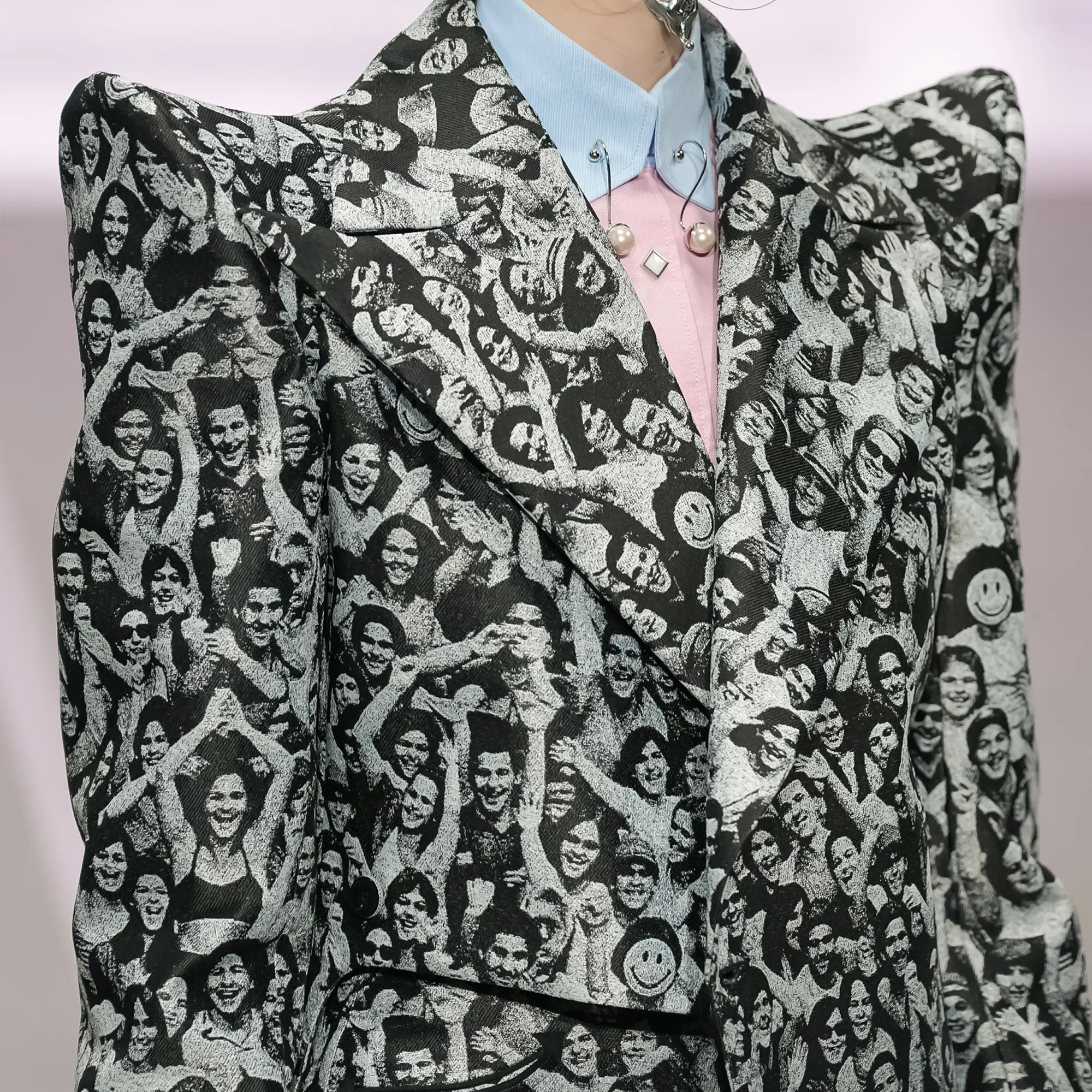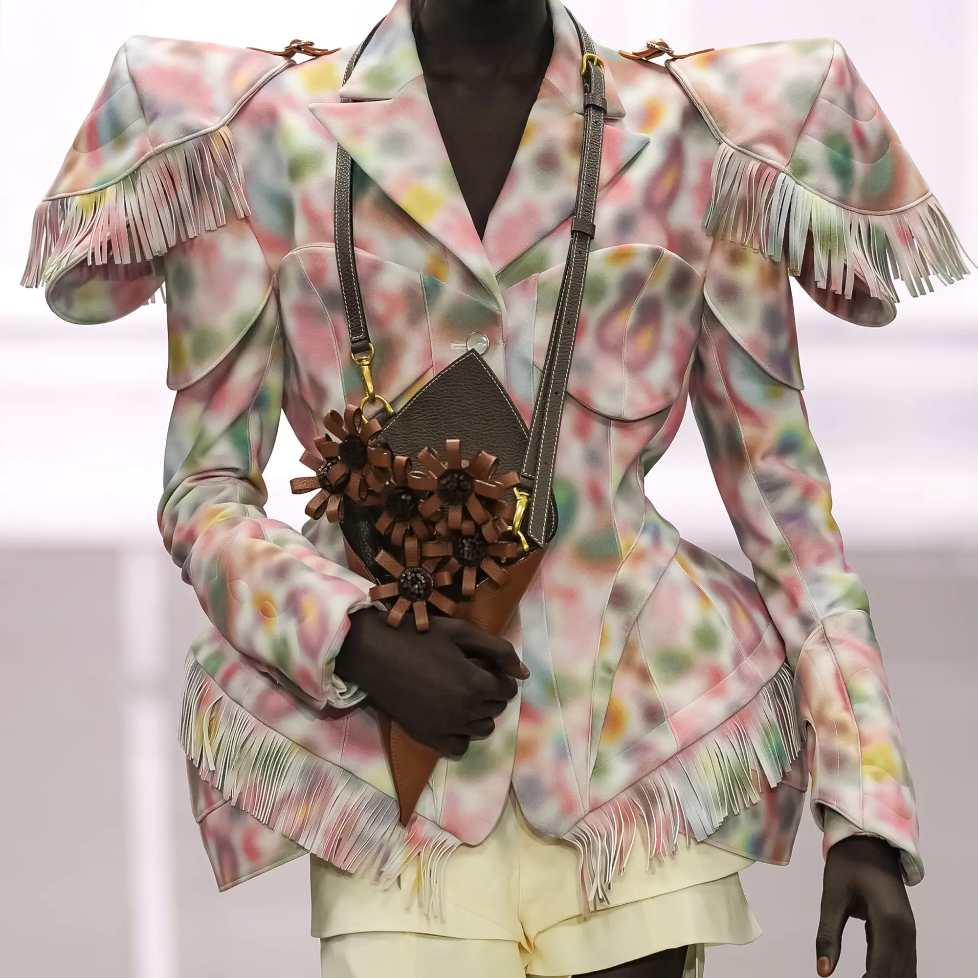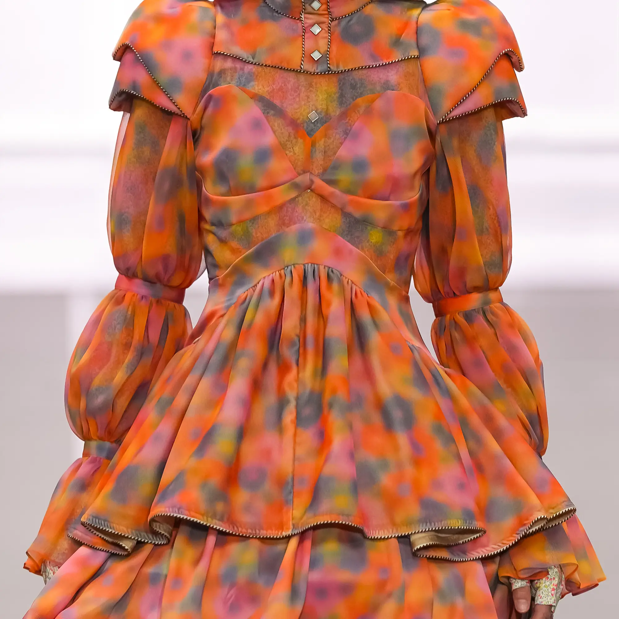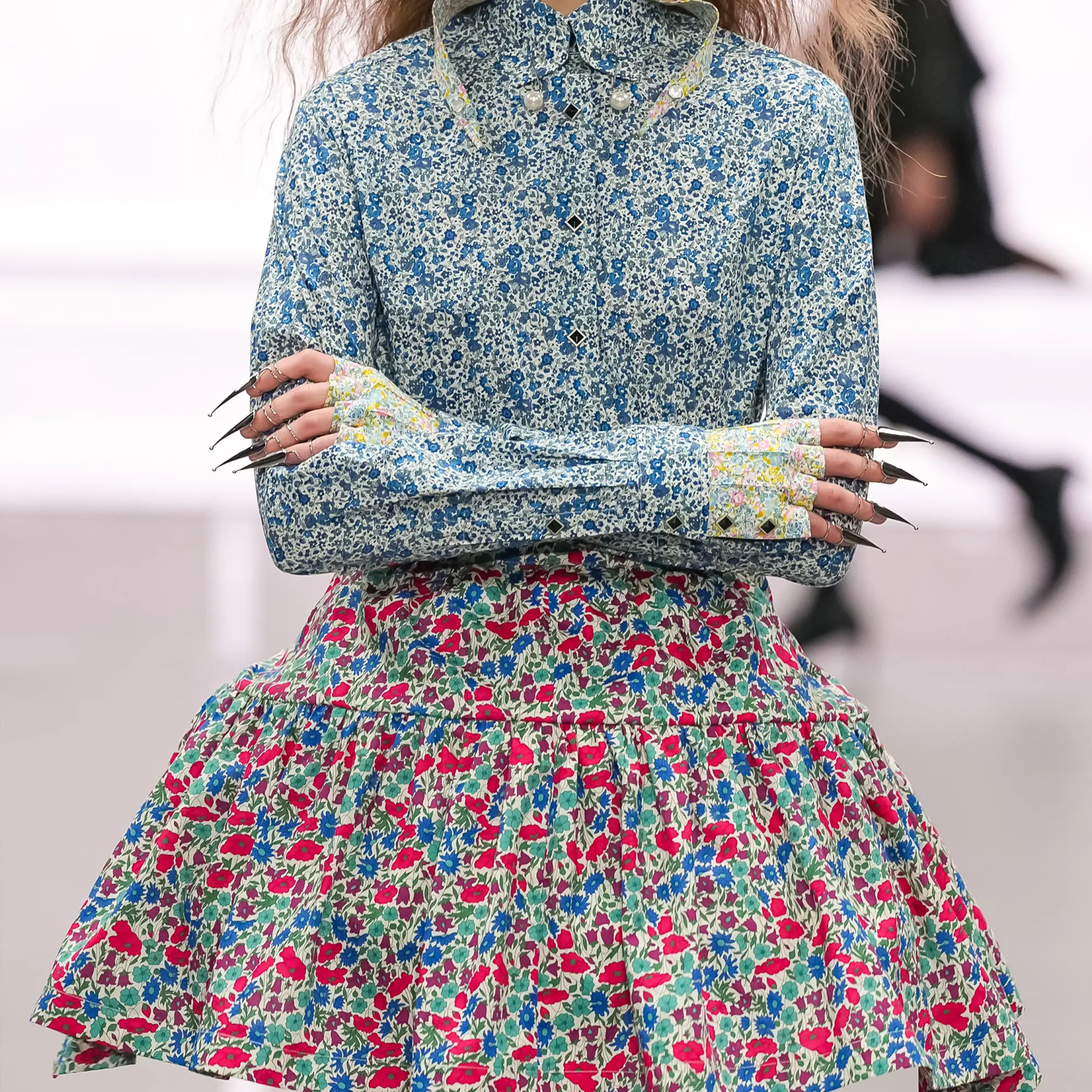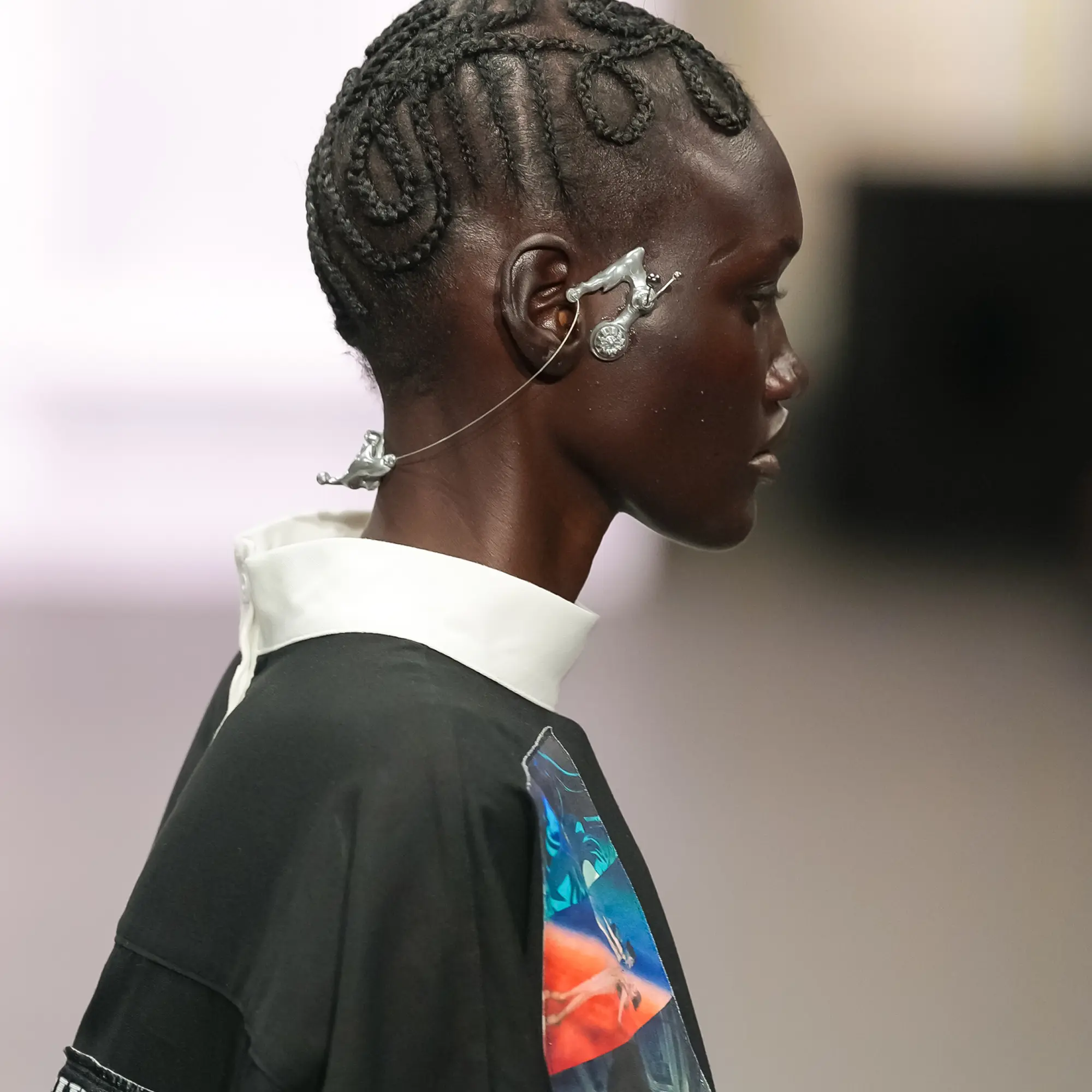 Against this erasure, a counterpoint of excess unfolds. Voluminous, Seventies-inflected silhouettes—romantic, flamboyant, unapologetically present—collide with engineered precision. Antenna-like adornments suggest transmission, extending the body into interface. If invisibility is one future, amplification is its opposite. Materials resist stability. Florals blur into digital noise; fragments of Ghost in the Shell dissolve into code and circuitry. Textiles produced with KYOCERA’s FOREARTH technology achieve painterly softness without water—presence emerging through absence.
