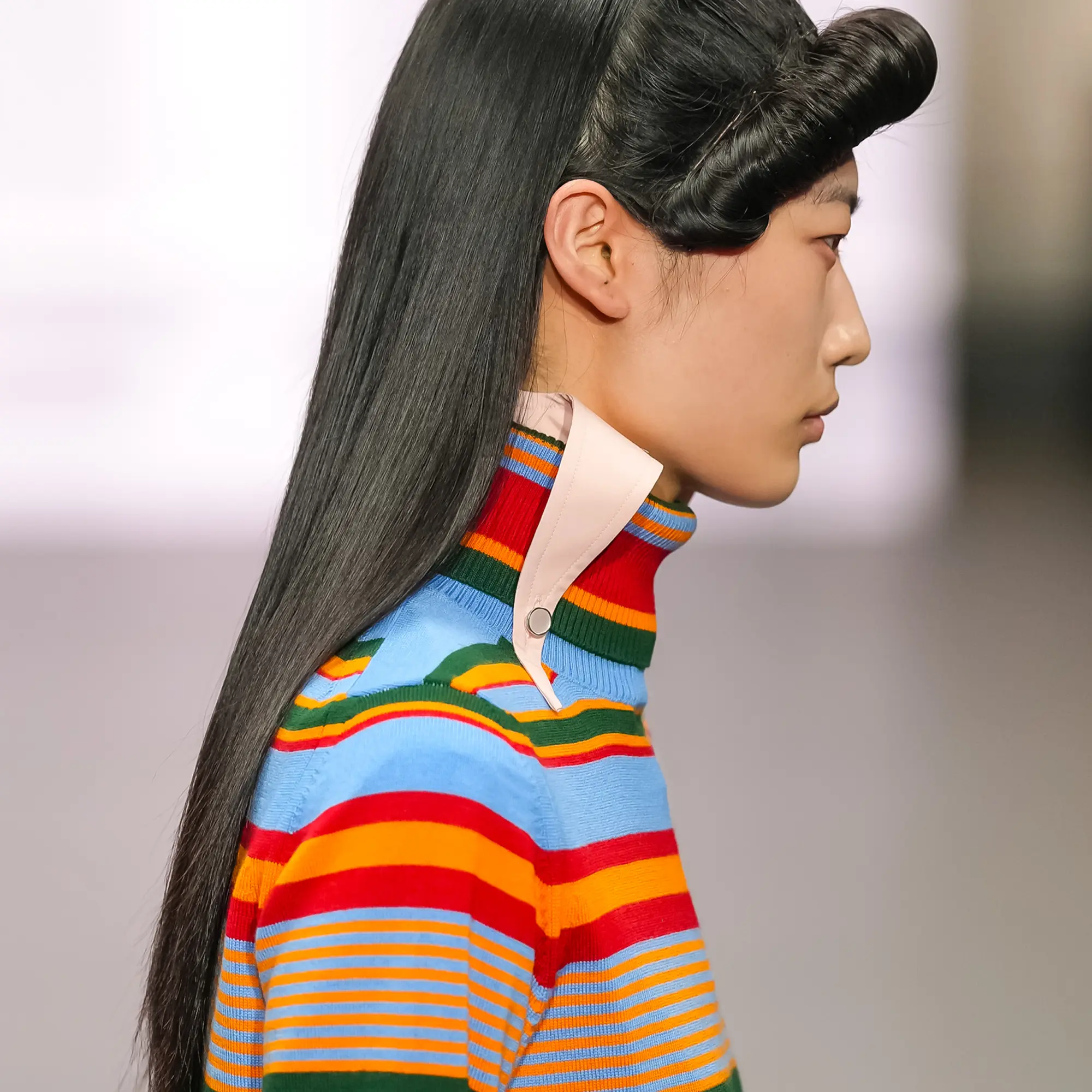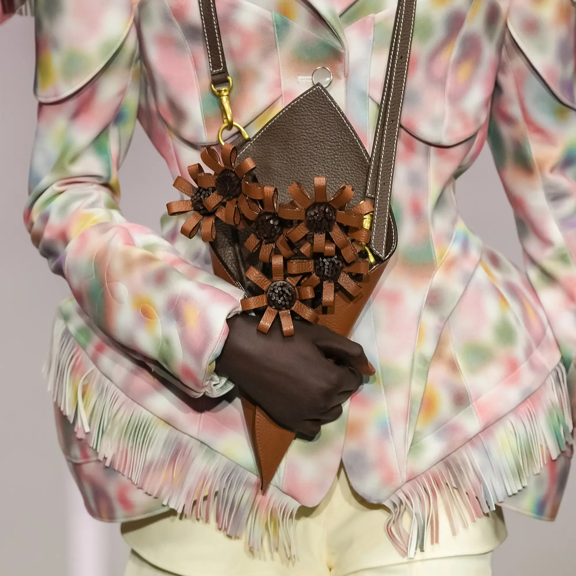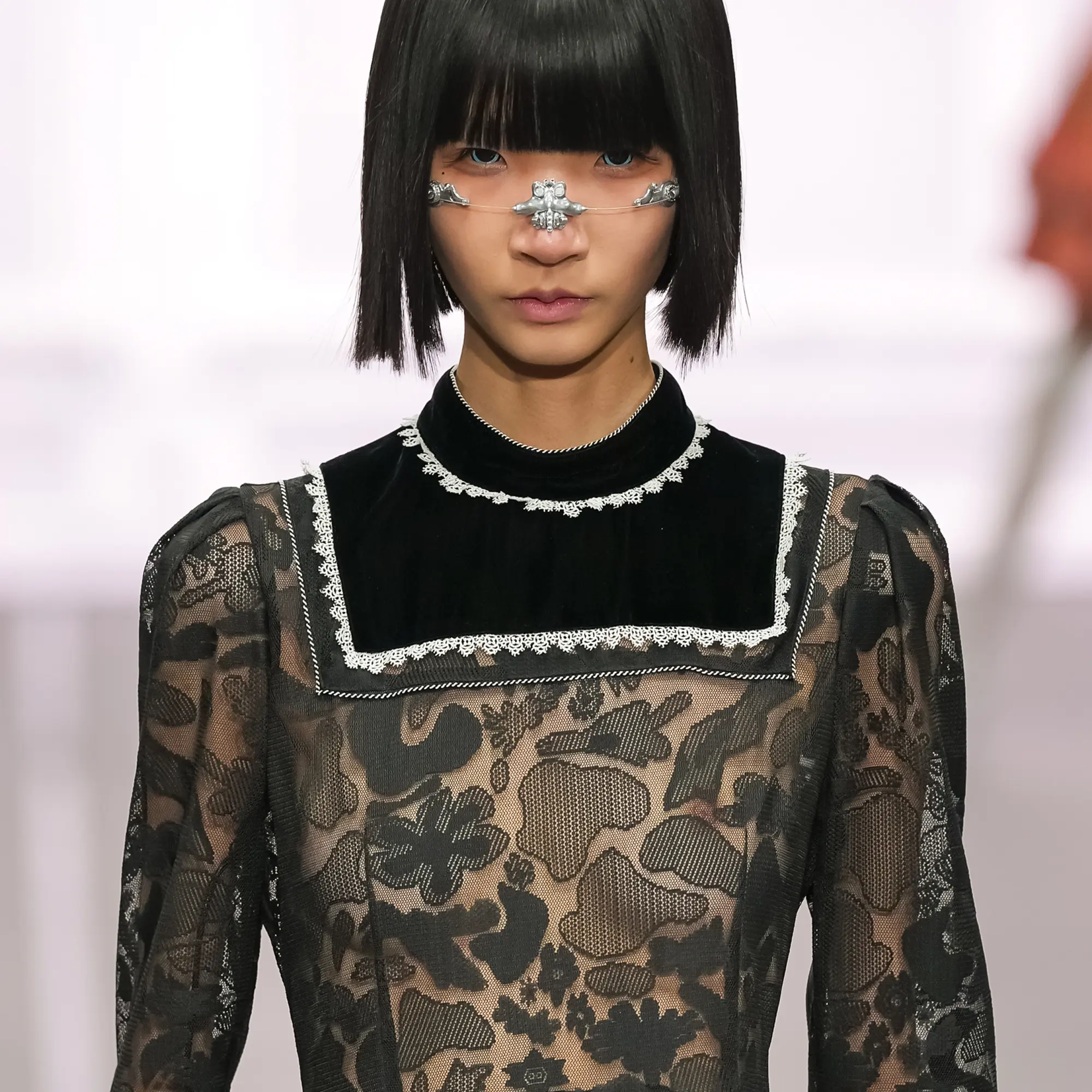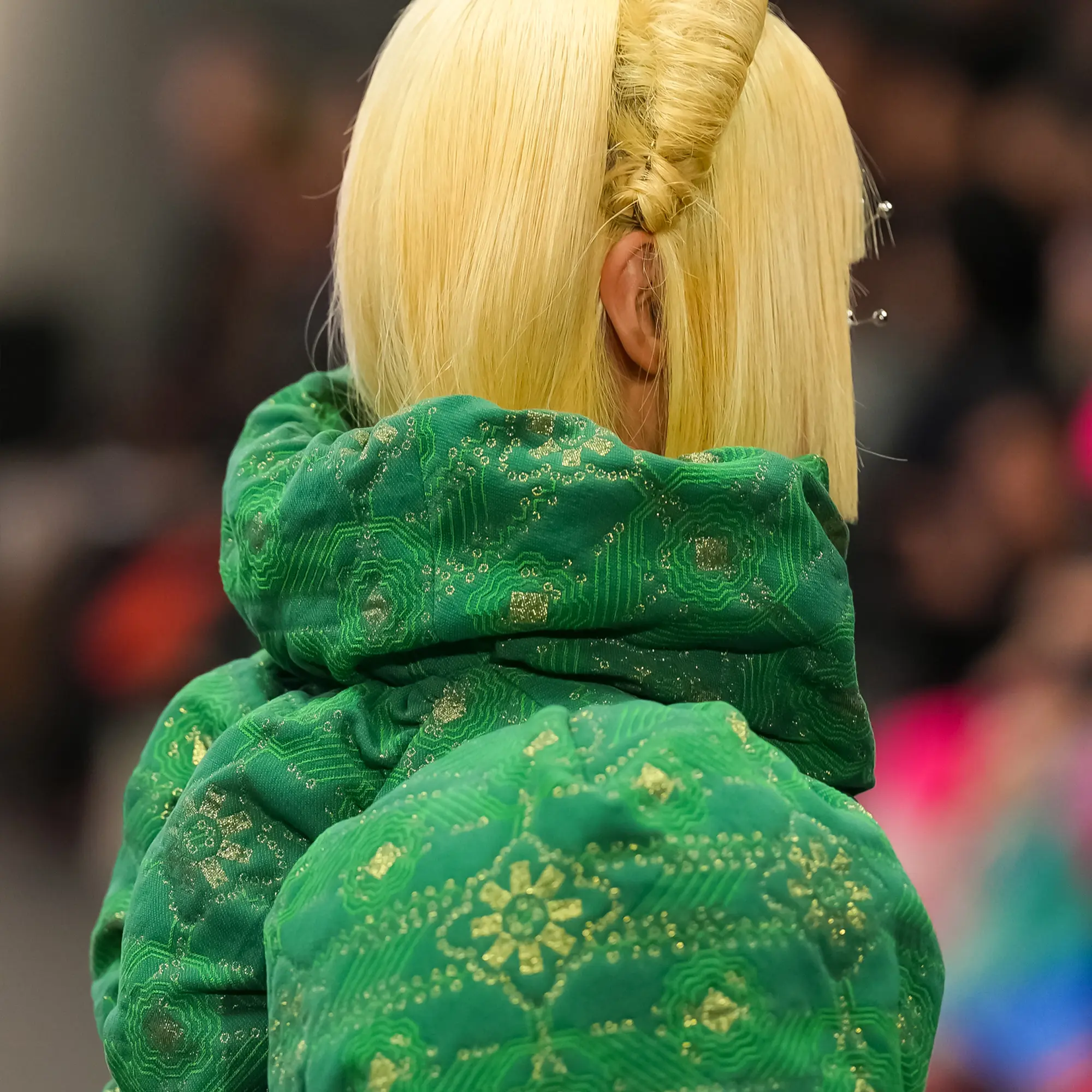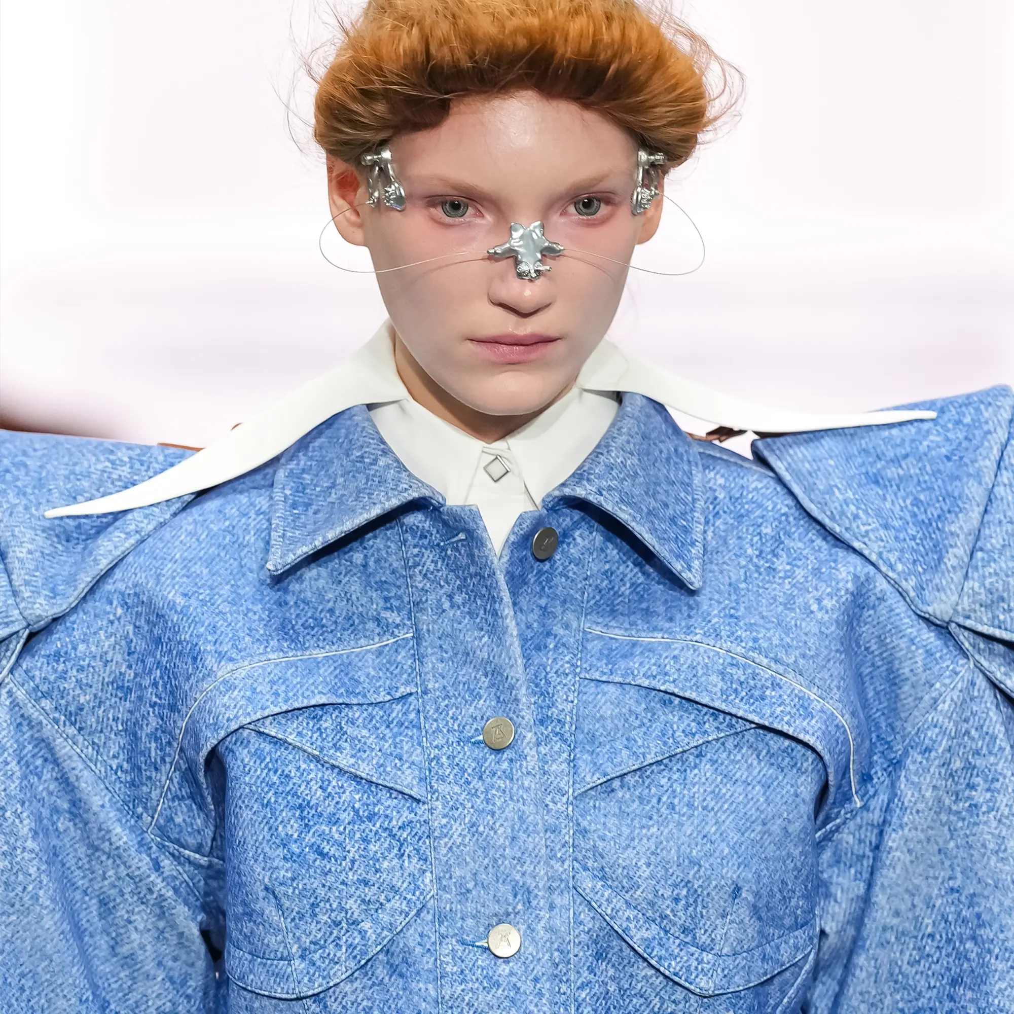 Against this erasure, a counterpoint of excess unfolds. Voluminous, Seventies-inflected silhouettes—romantic, flamboyant, unapologetically present—collide with engineered precision. Antenna-like adornments suggest transmission, extending the body into interface. If invisibility is one future, amplification is its opposite. Materials resist stability. Florals blur into digital noise; fragments of Ghost in the Shell dissolve into code and circuitry. Textiles produced with KYOCERA’s FOREARTH technology achieve painterly softness without water—presence emerging through absence.