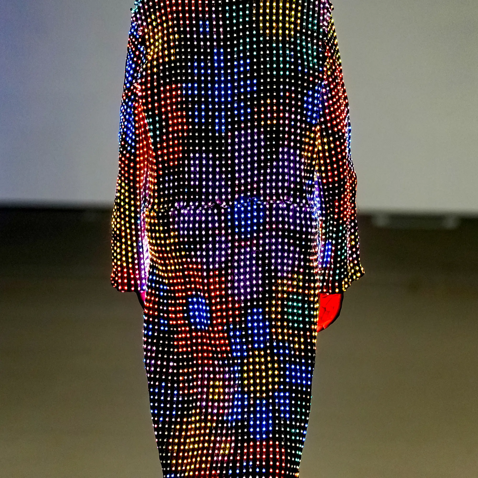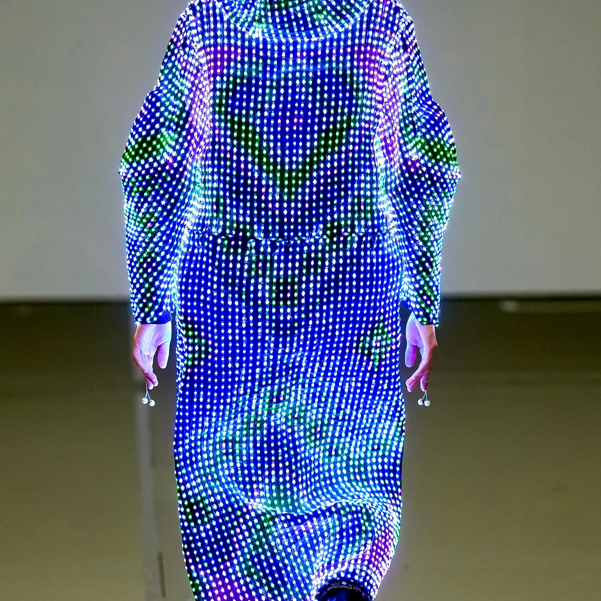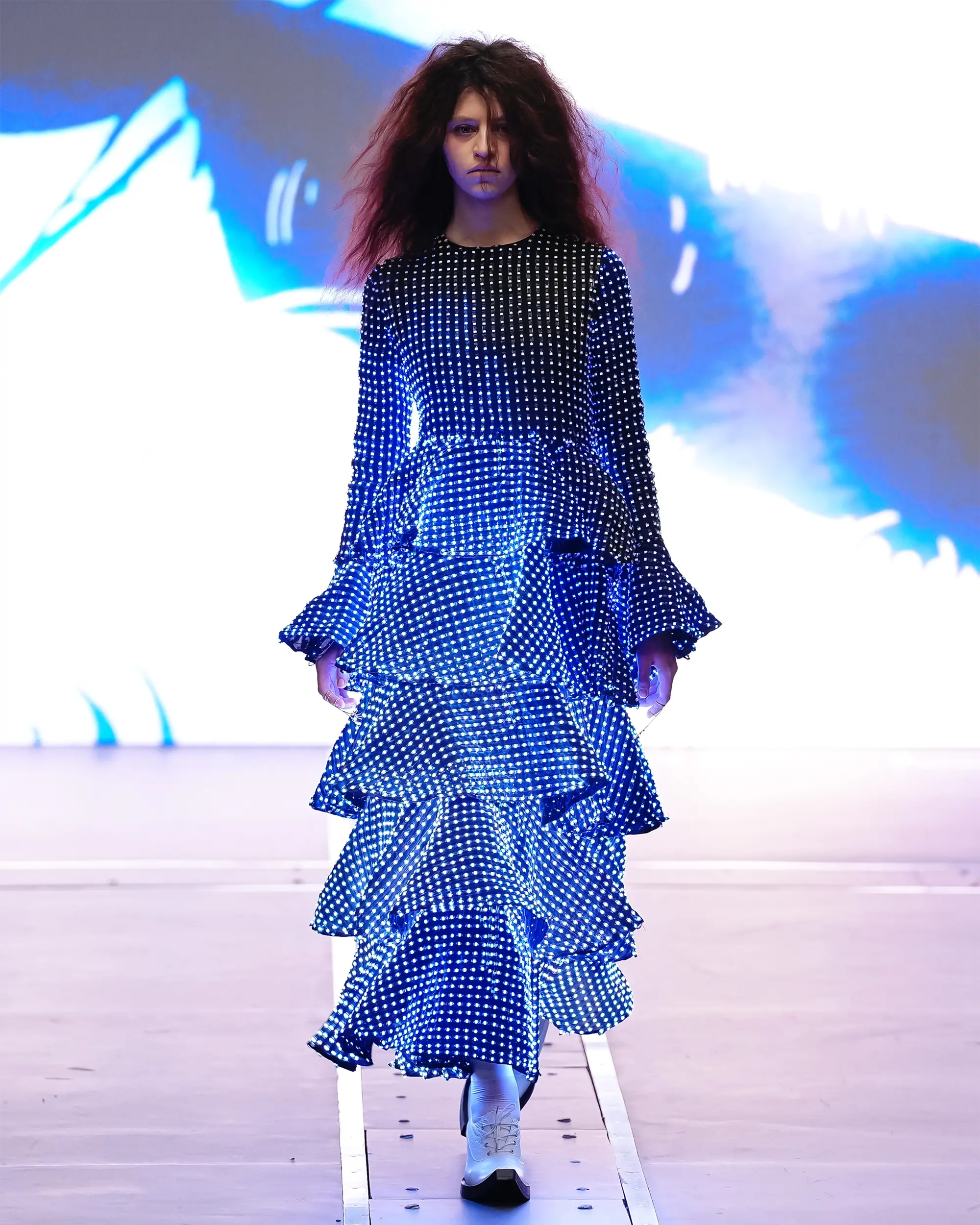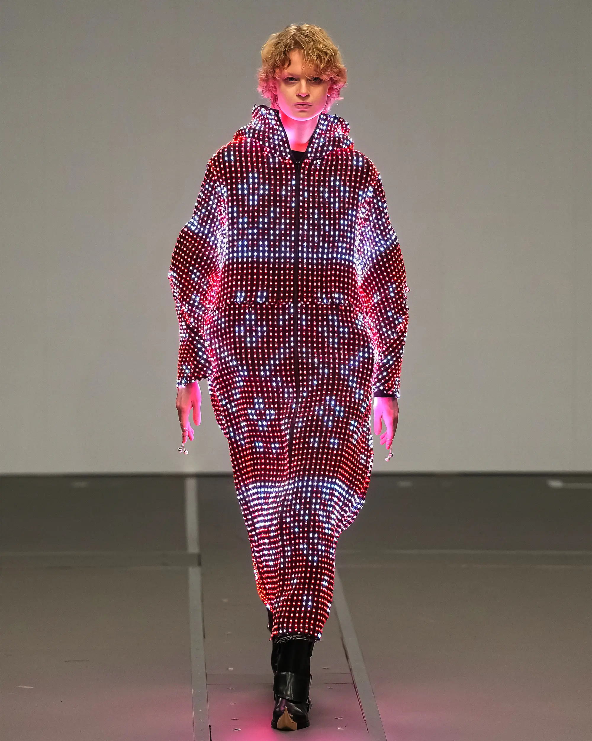 Morinaga translates this into clothing that no longer defines the body, but destabilises it.The runway operates as system rather than stage—a saturated field of code, light and fractured imagery. Silhouettes emerge bold and exoskeletal, only to dissolve as their reactive surfaces, developed with LED TOKYO, absorb and retransmit their environment. At the moment of synchronisation, the outline disappears. The body persists only in motion—never fixed, never fully seen.