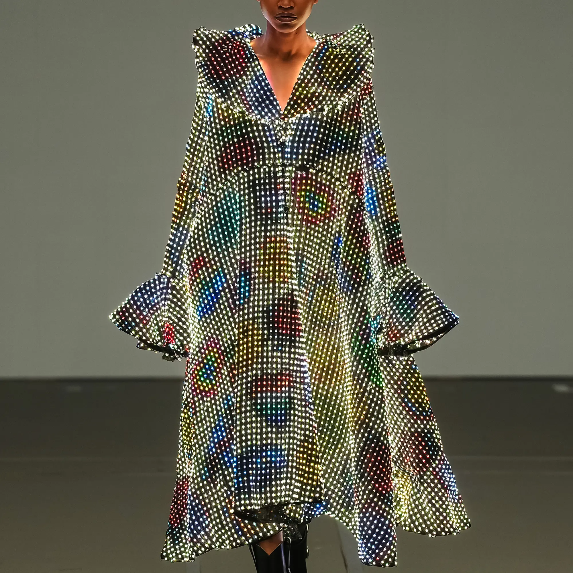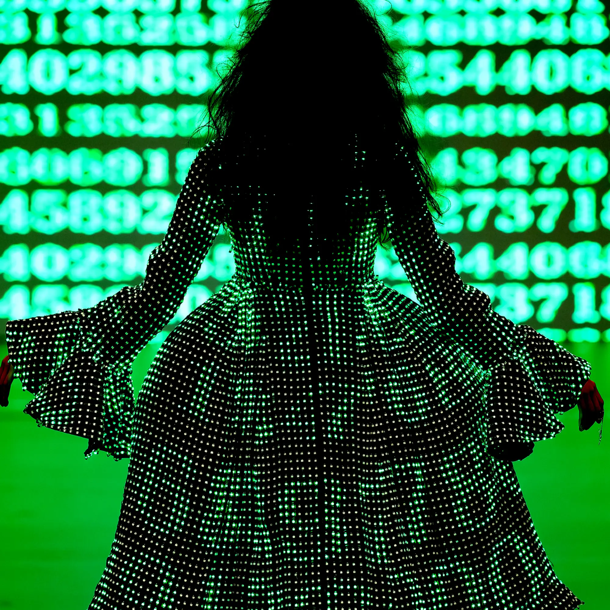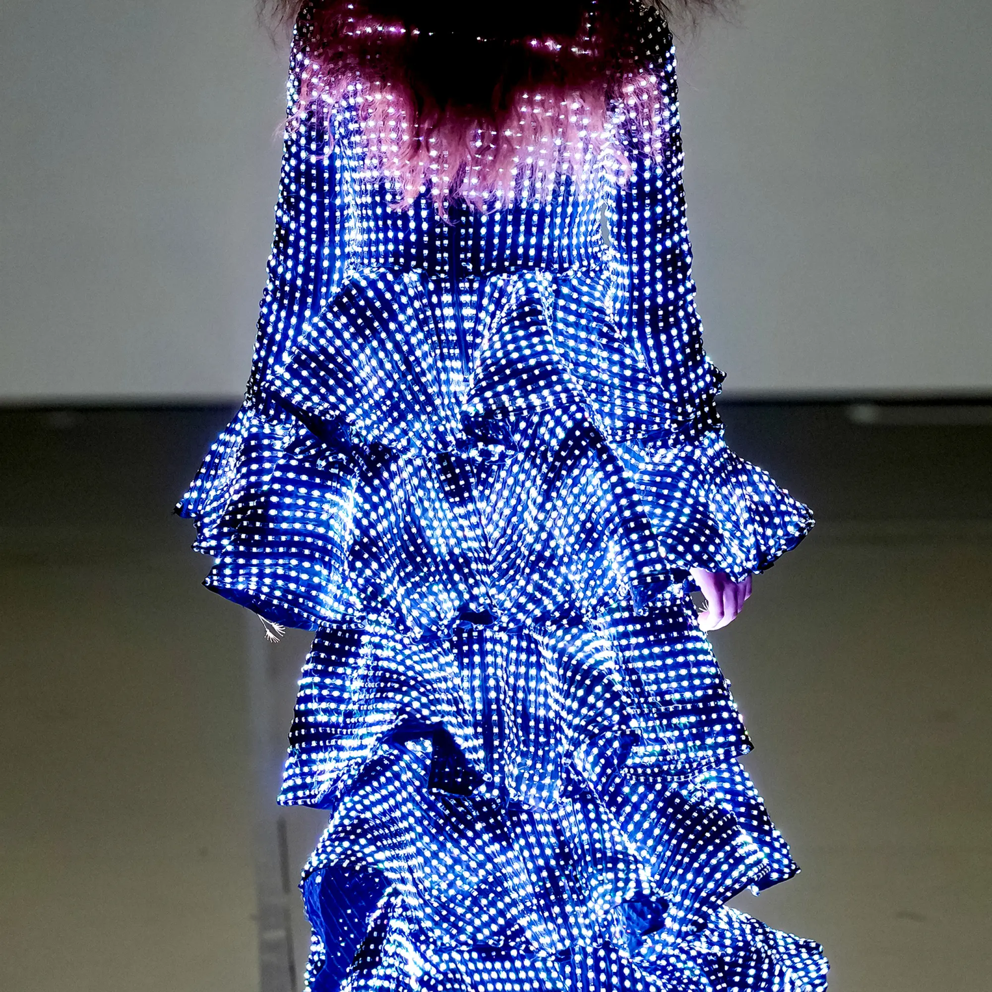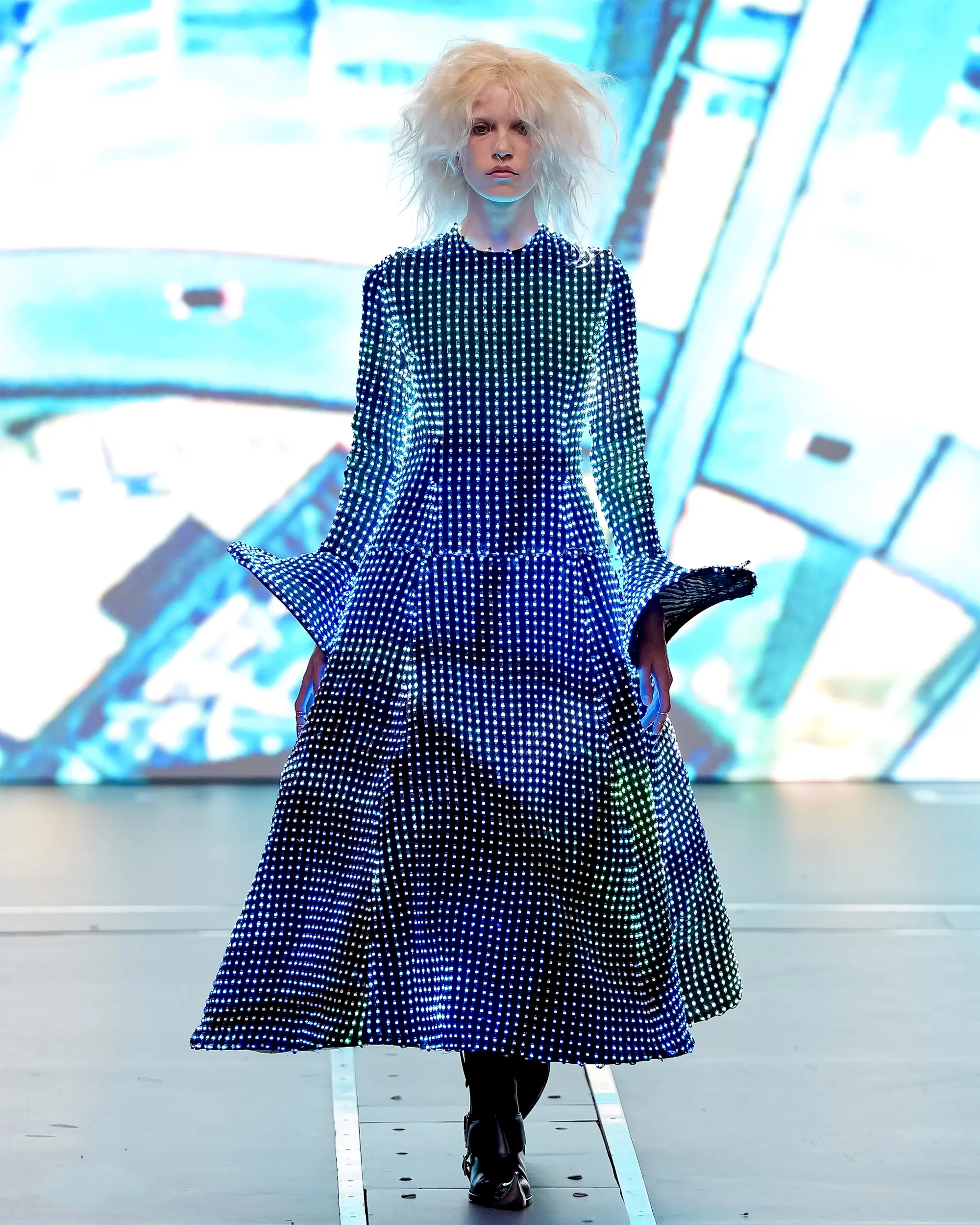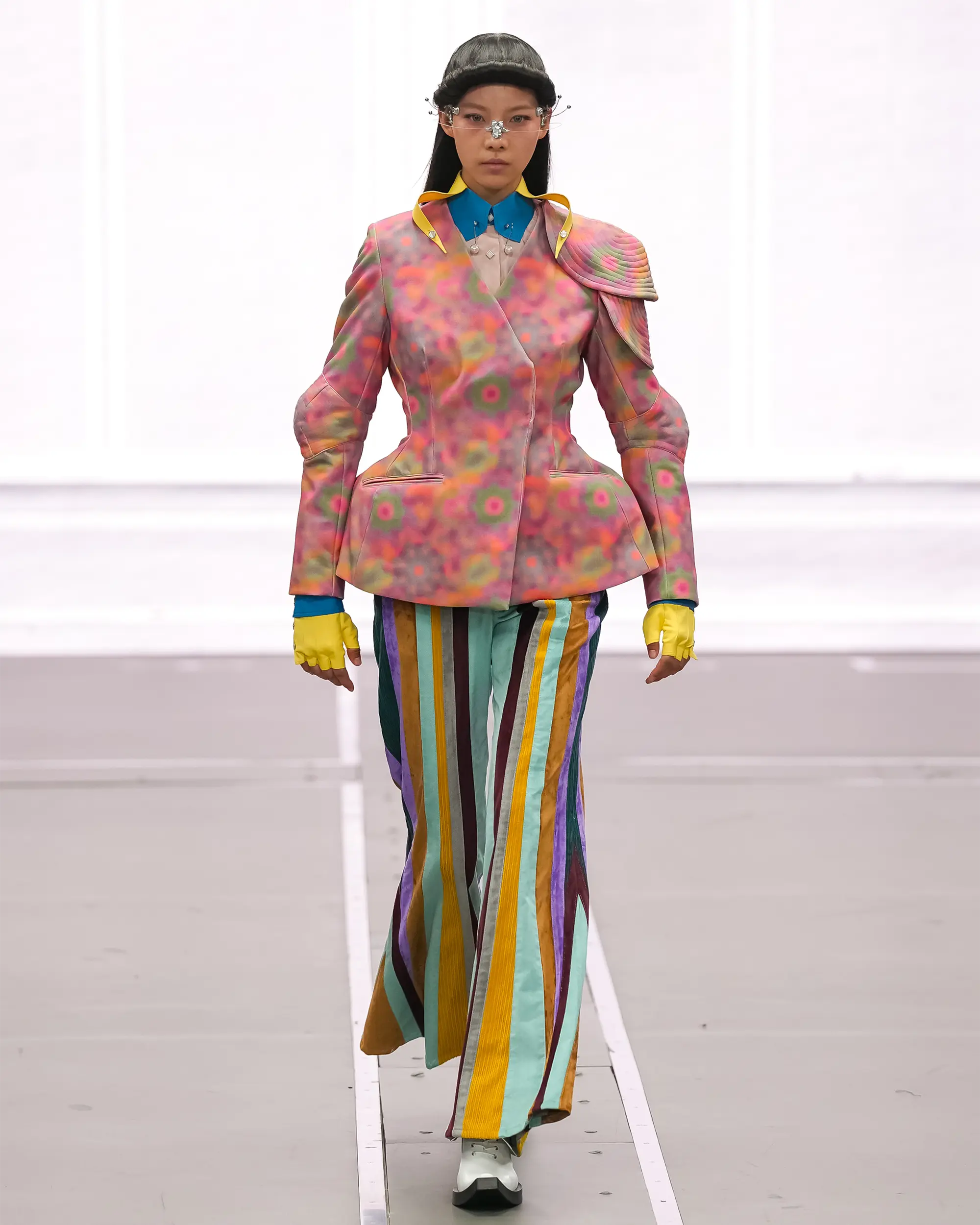 Morinaga translates this into clothing that no longer defines the body, but destabilises it.The runway operates as system rather than stage—a saturated field of code, light and fractured imagery. Silhouettes emerge bold and exoskeletal, only to dissolve as their reactive surfaces, developed with LED TOKYO, absorb and retransmit their environment. At the moment of synchronisation, the outline disappears. The body persists only in motion—never fixed, never fully seen.