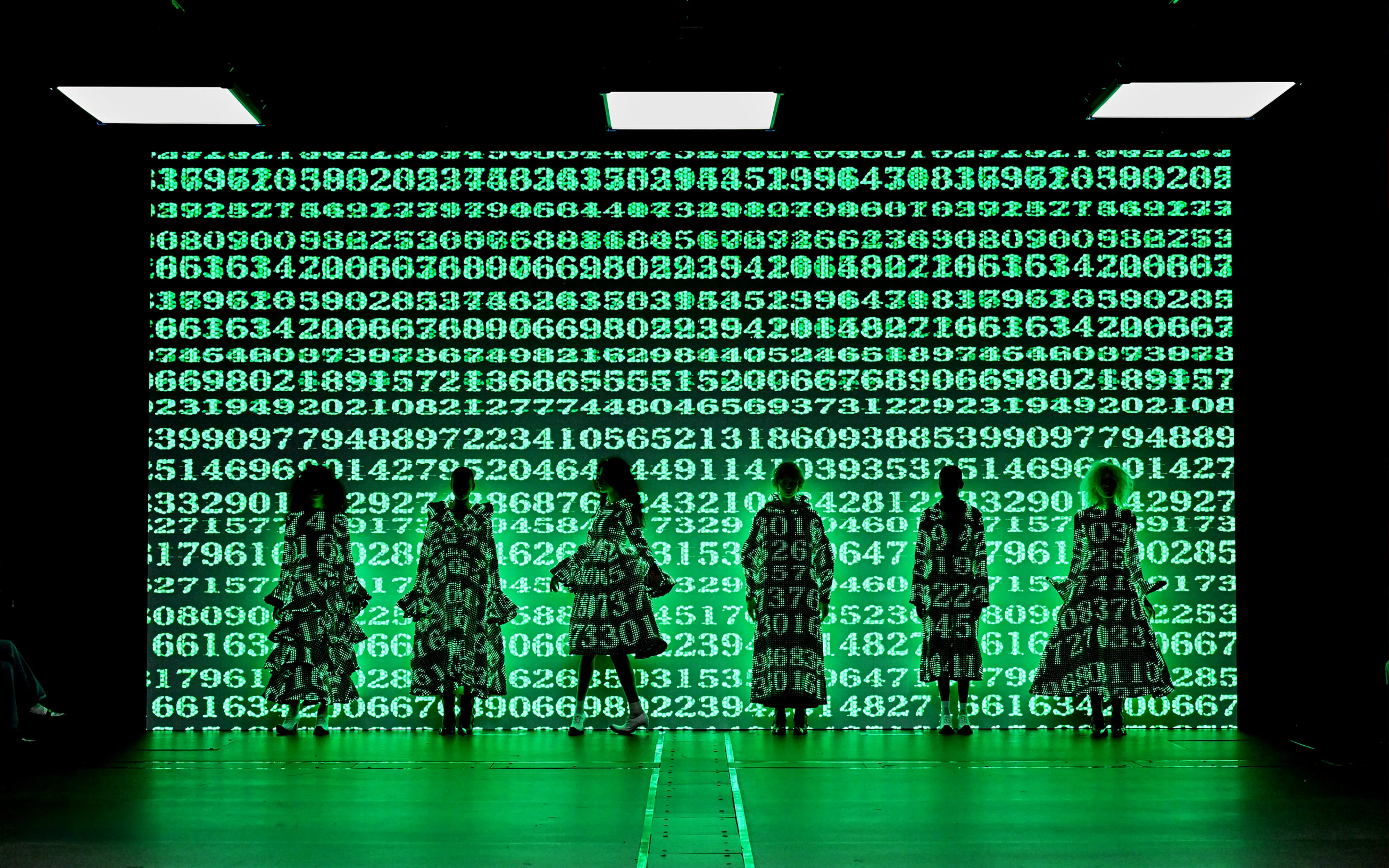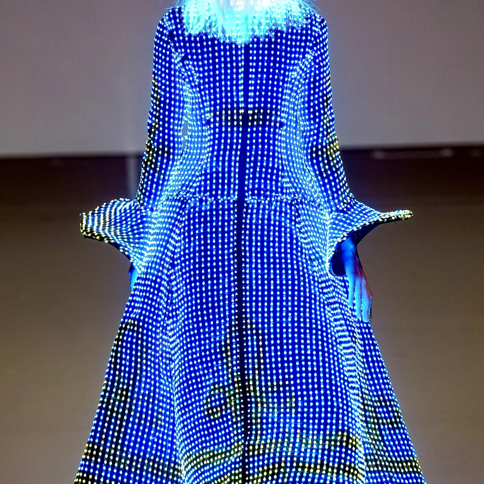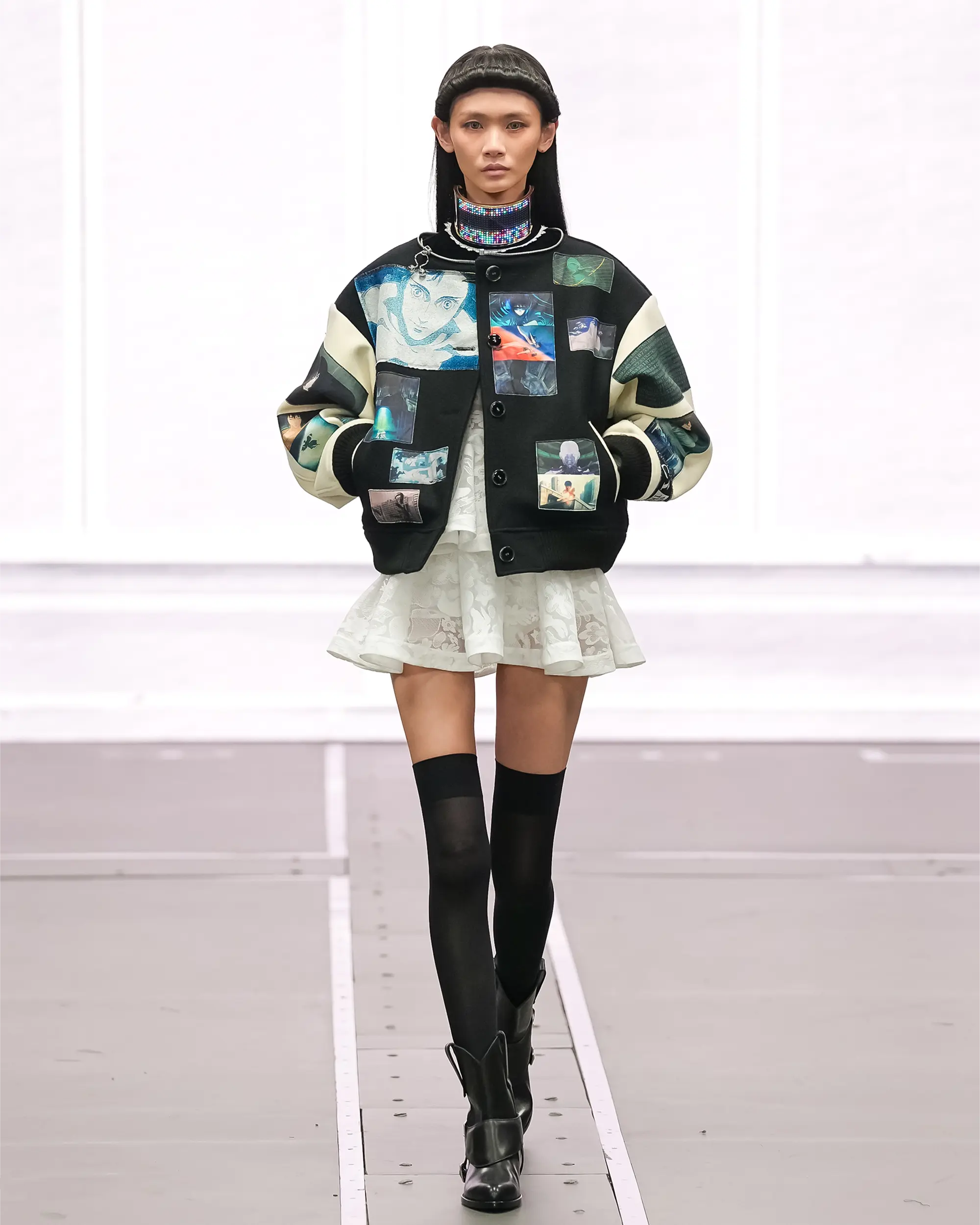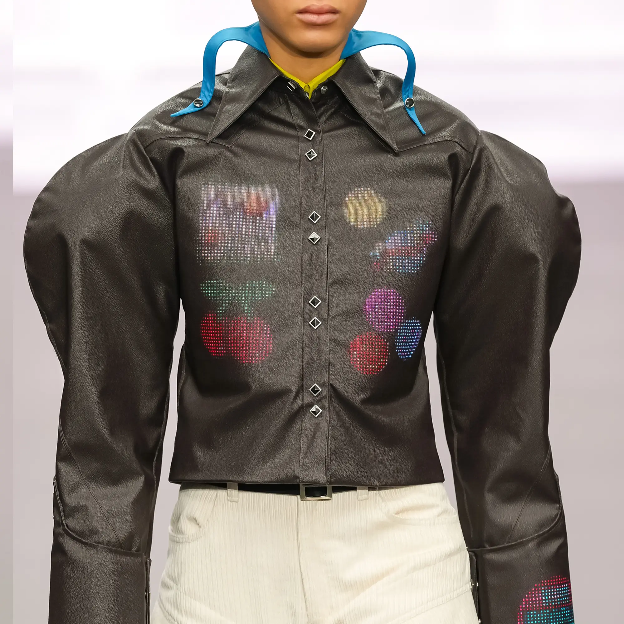 Morinaga translates this into clothing that no longer defines the body, but destabilises it.The runway operates as system rather than stage—a saturated field of code, light and fractured imagery. Silhouettes emerge bold and exoskeletal, only to dissolve as their reactive surfaces, developed with LED TOKYO, absorb and retransmit their environment. At the moment of synchronisation, the outline disappears. The body persists only in motion—never fixed, never fully seen.