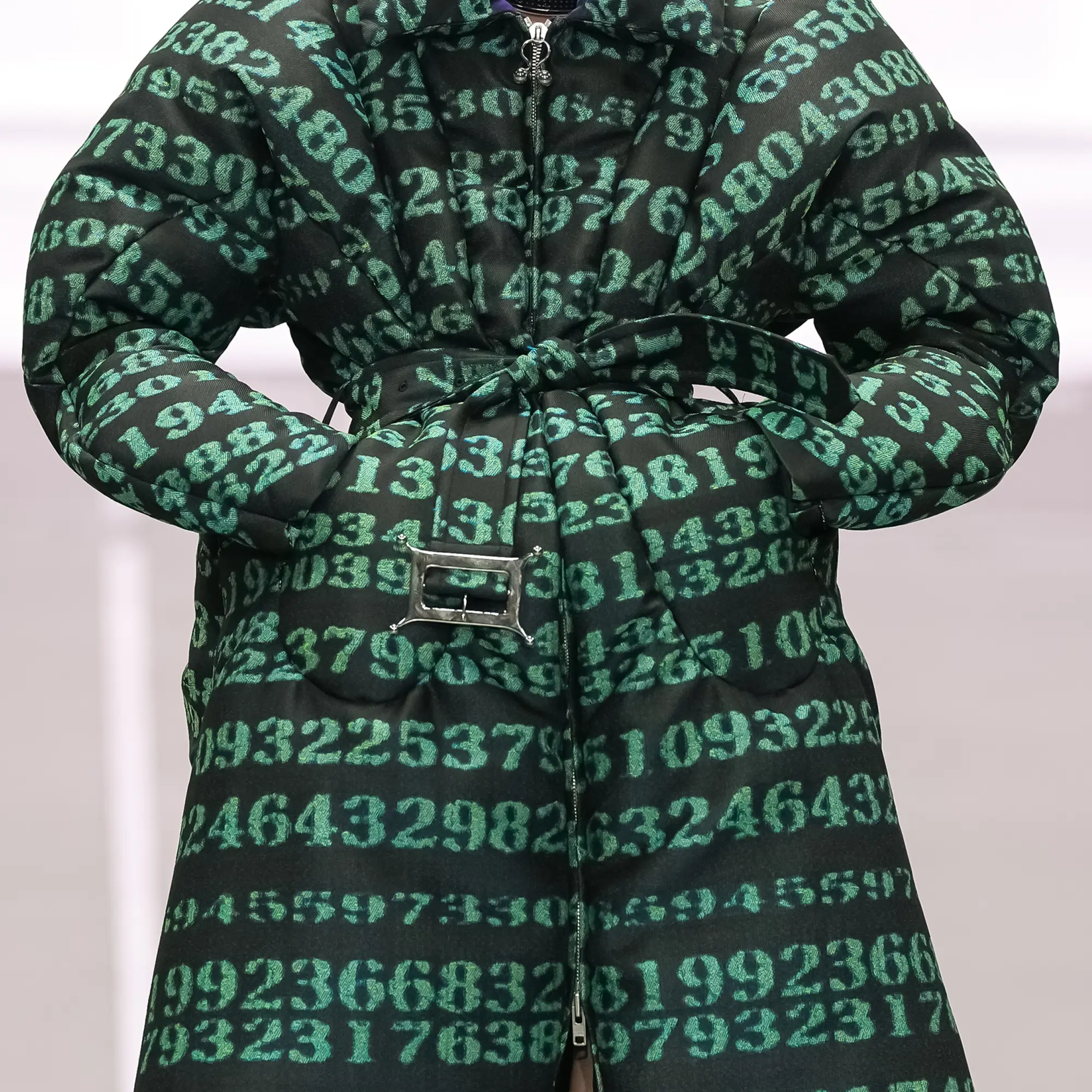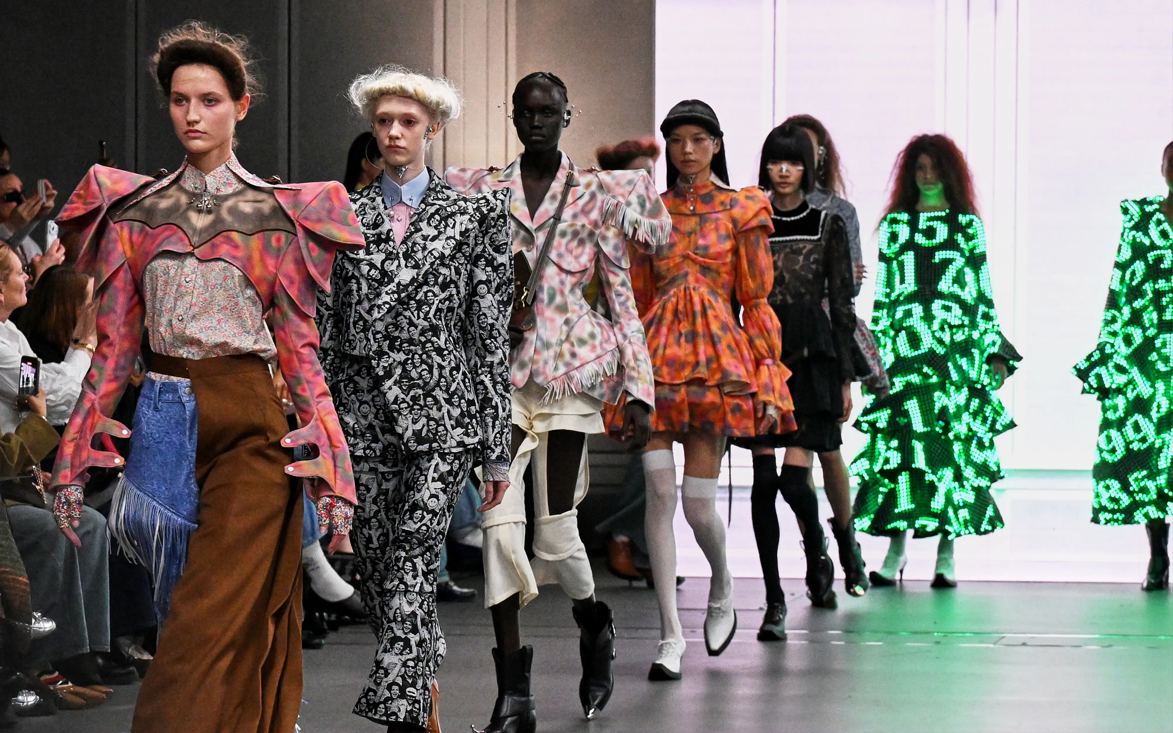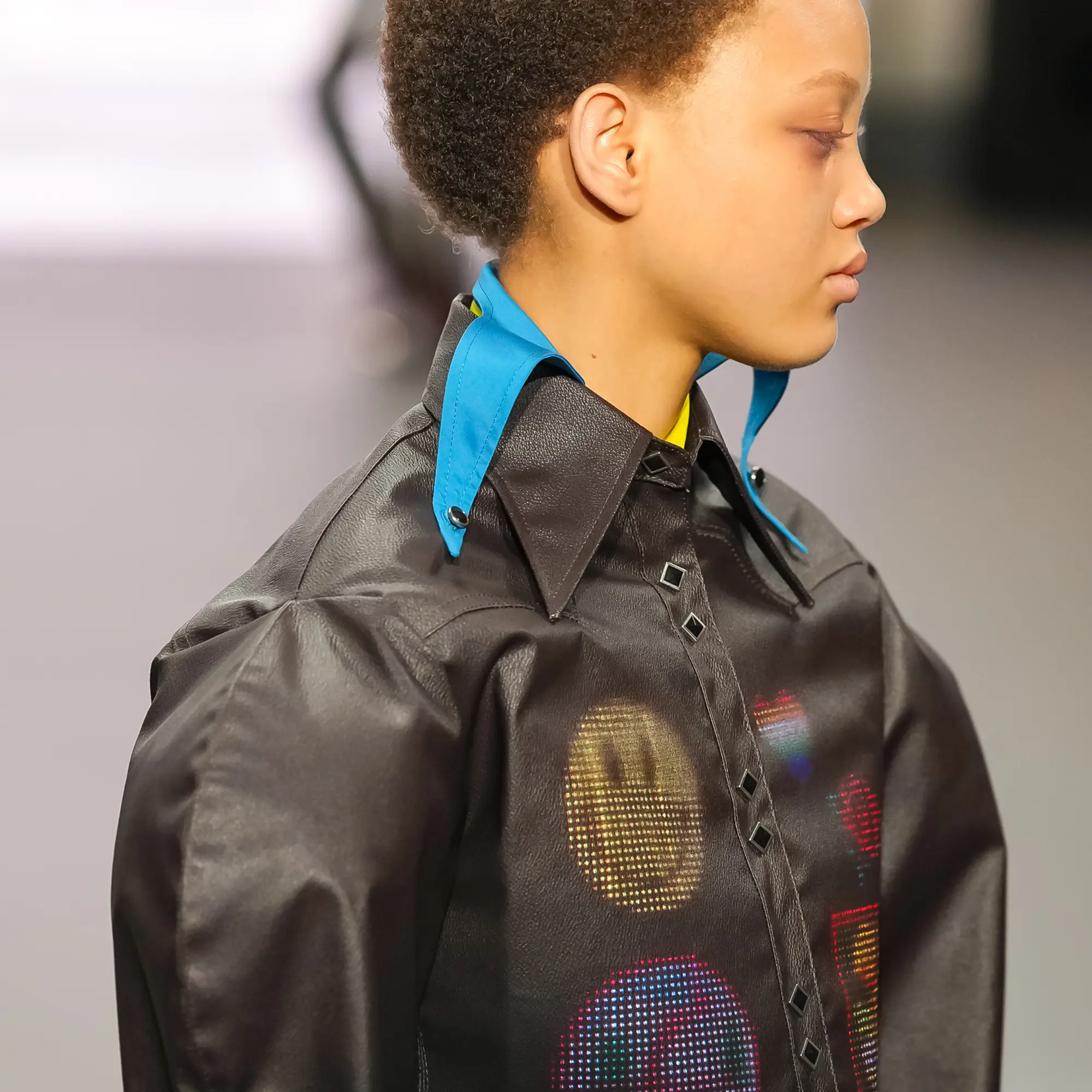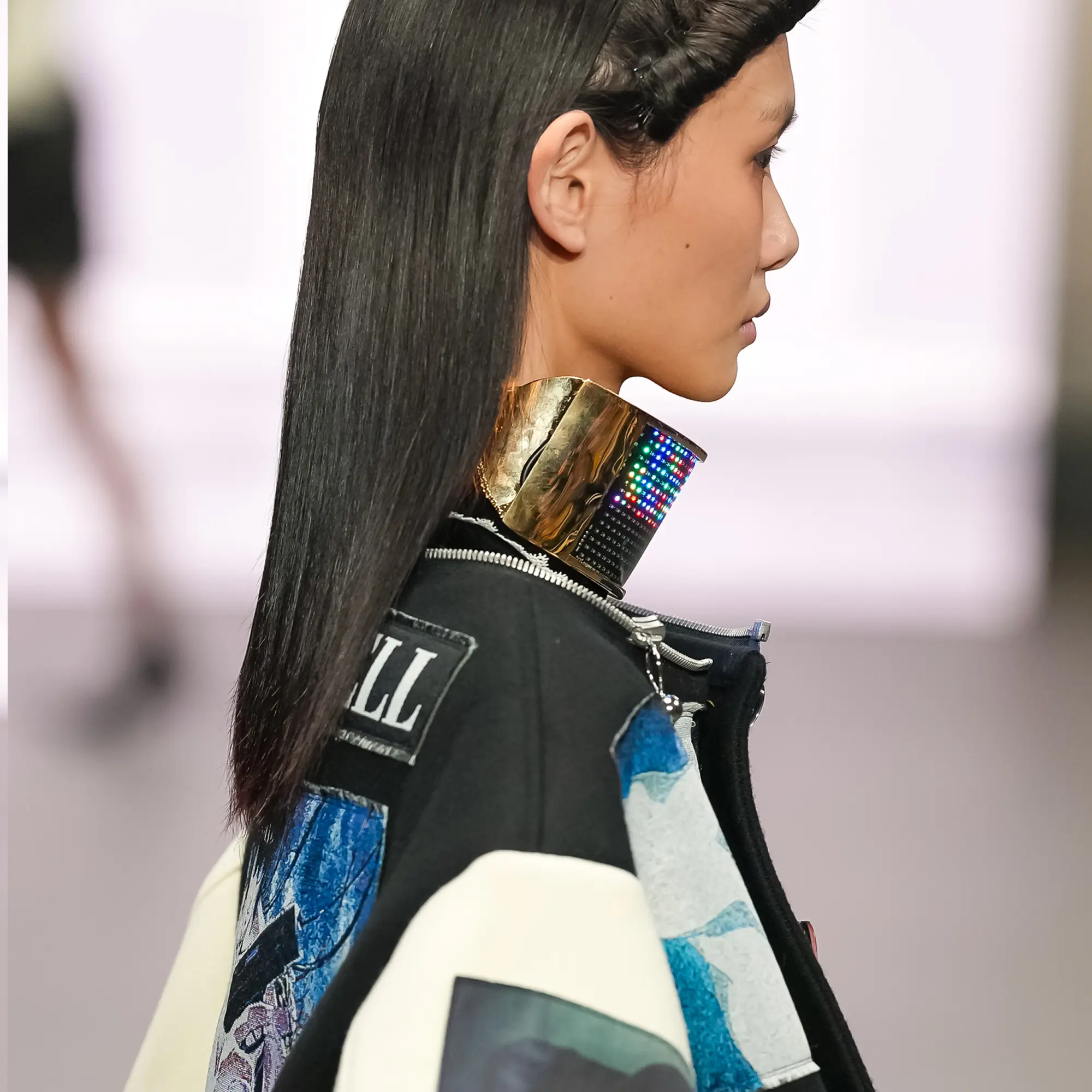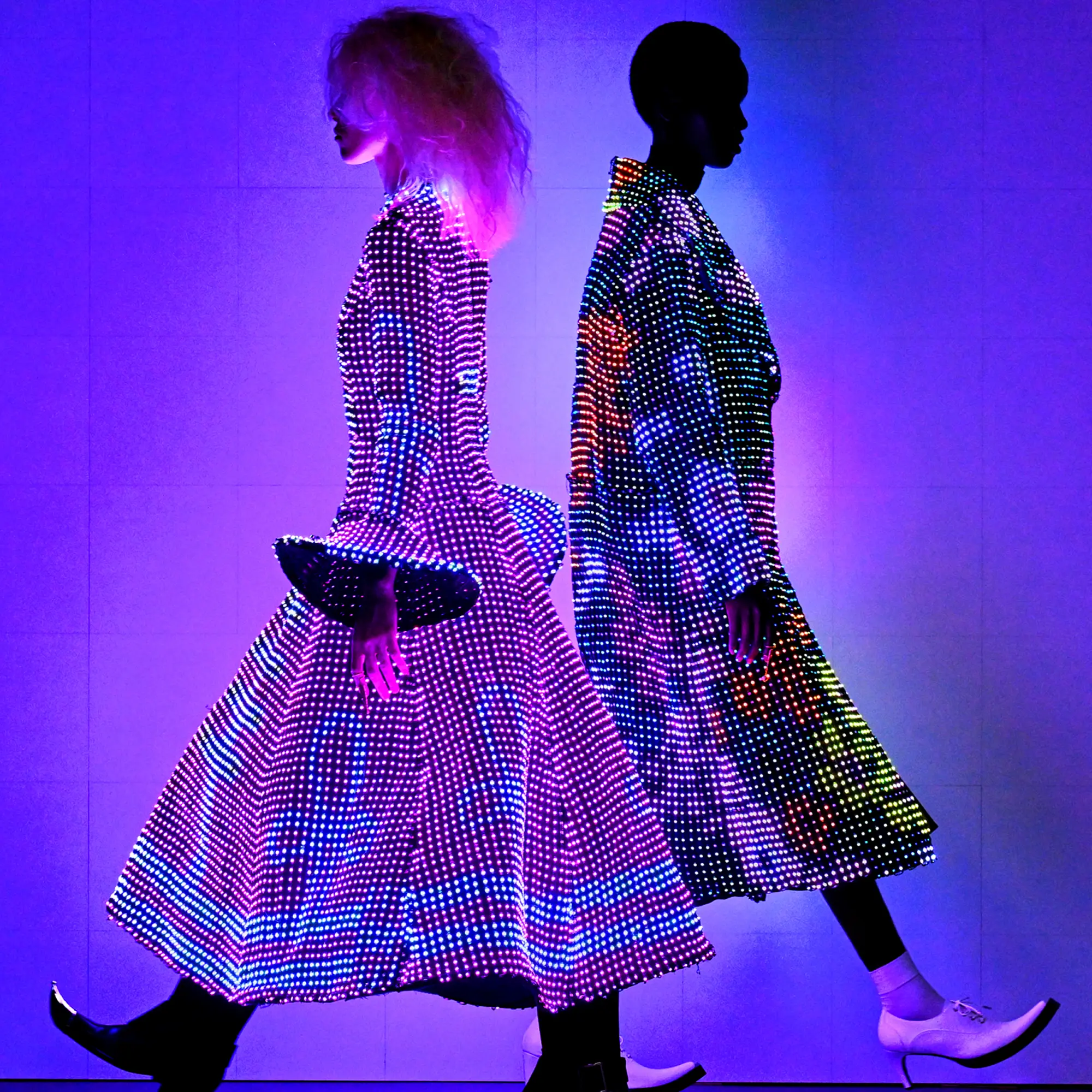 Morinaga translates this into clothing that no longer defines the body, but destabilises it.The runway operates as system rather than stage—a saturated field of code, light and fractured imagery. Silhouettes emerge bold and exoskeletal, only to dissolve as their reactive surfaces, developed with LED TOKYO, absorb and retransmit their environment. At the moment of synchronisation, the outline disappears. The body persists only in motion—never fixed, never fully seen.