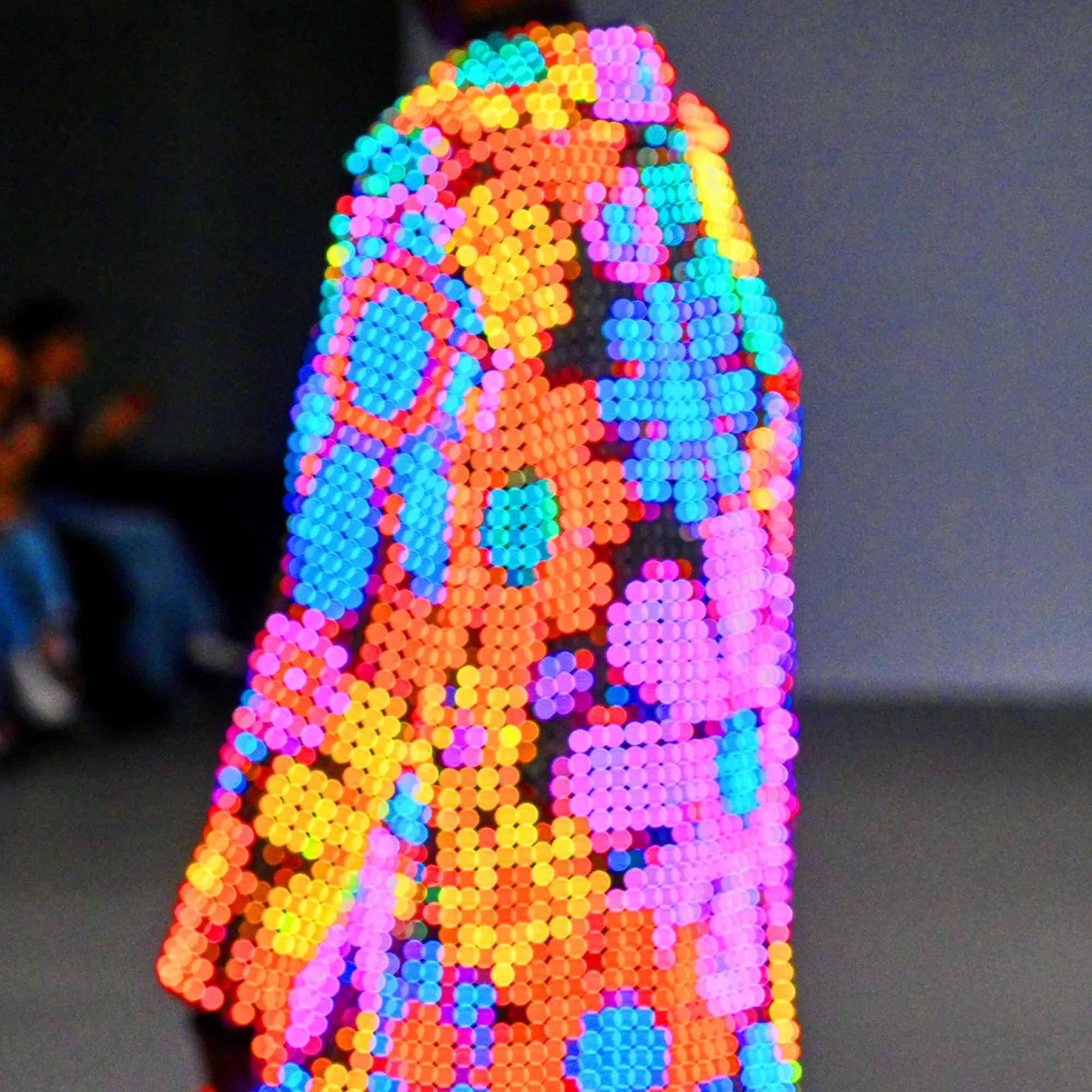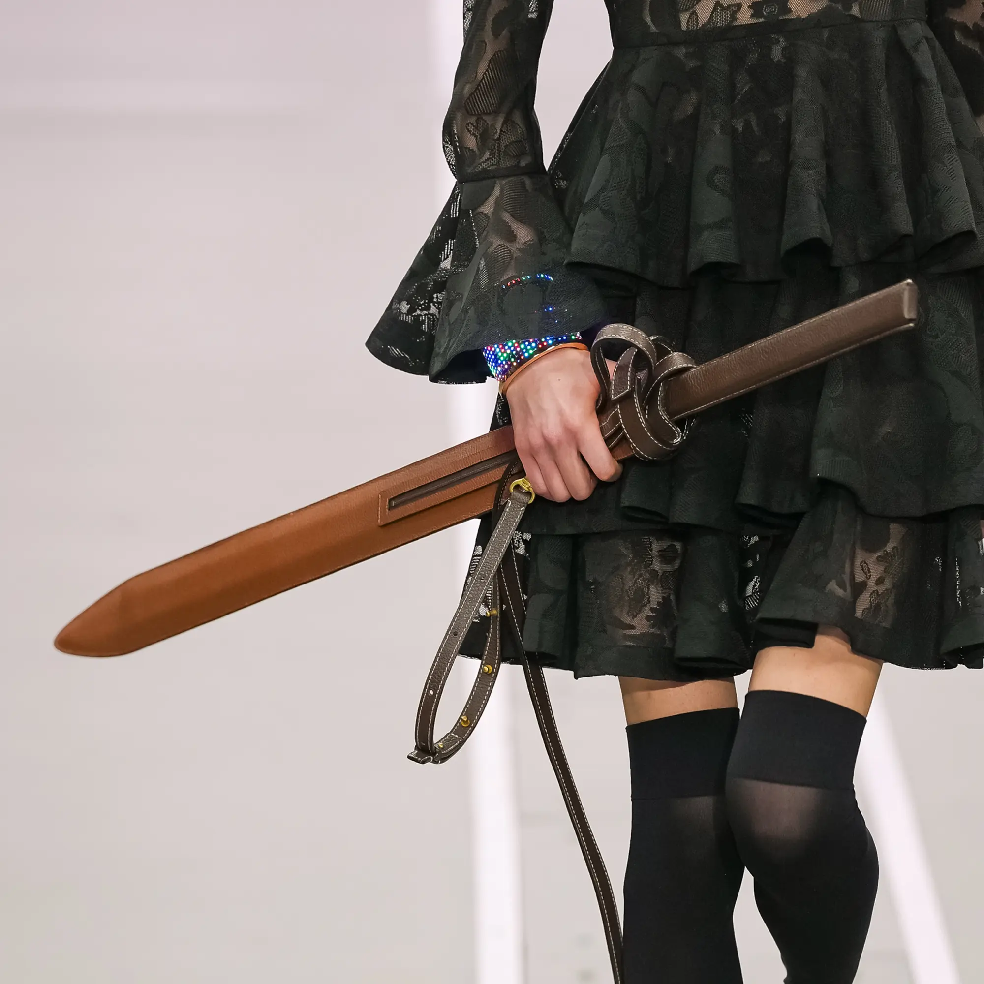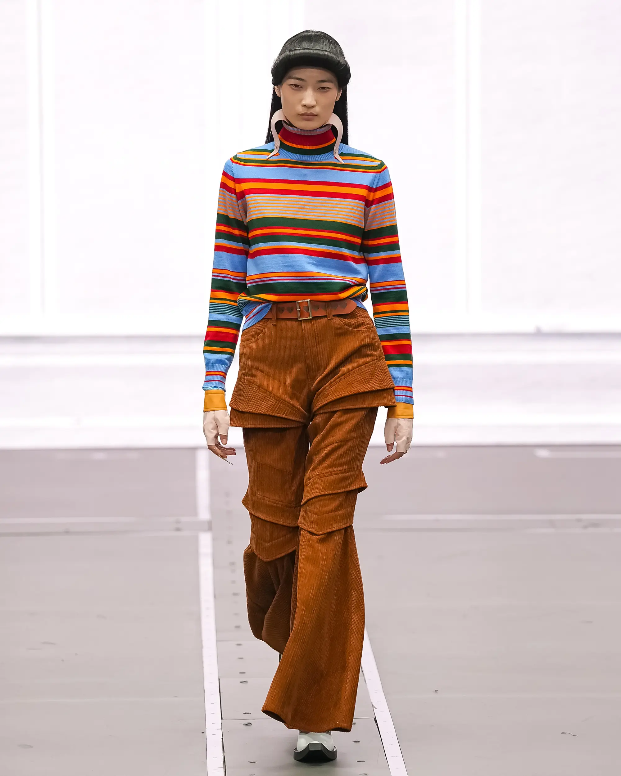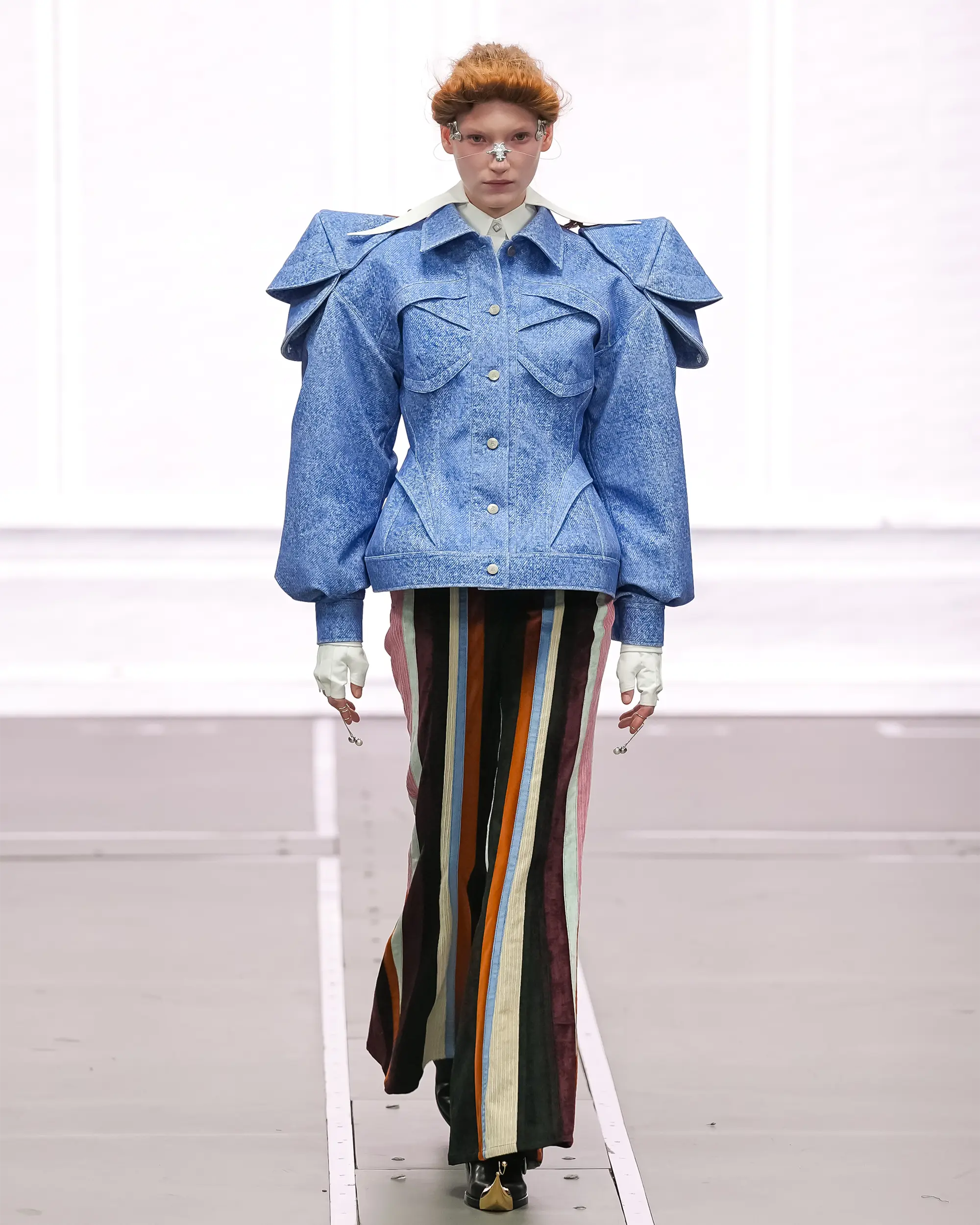 Morinaga translates this into clothing that no longer defines the body, but destabilises it.The runway operates as system rather than stage—a saturated field of code, light and fractured imagery. Silhouettes emerge bold and exoskeletal, only to dissolve as their reactive surfaces, developed with LED TOKYO, absorb and retransmit their environment. At the moment of synchronisation, the outline disappears. The body persists only in motion—never fixed, never fully seen.
