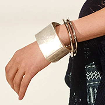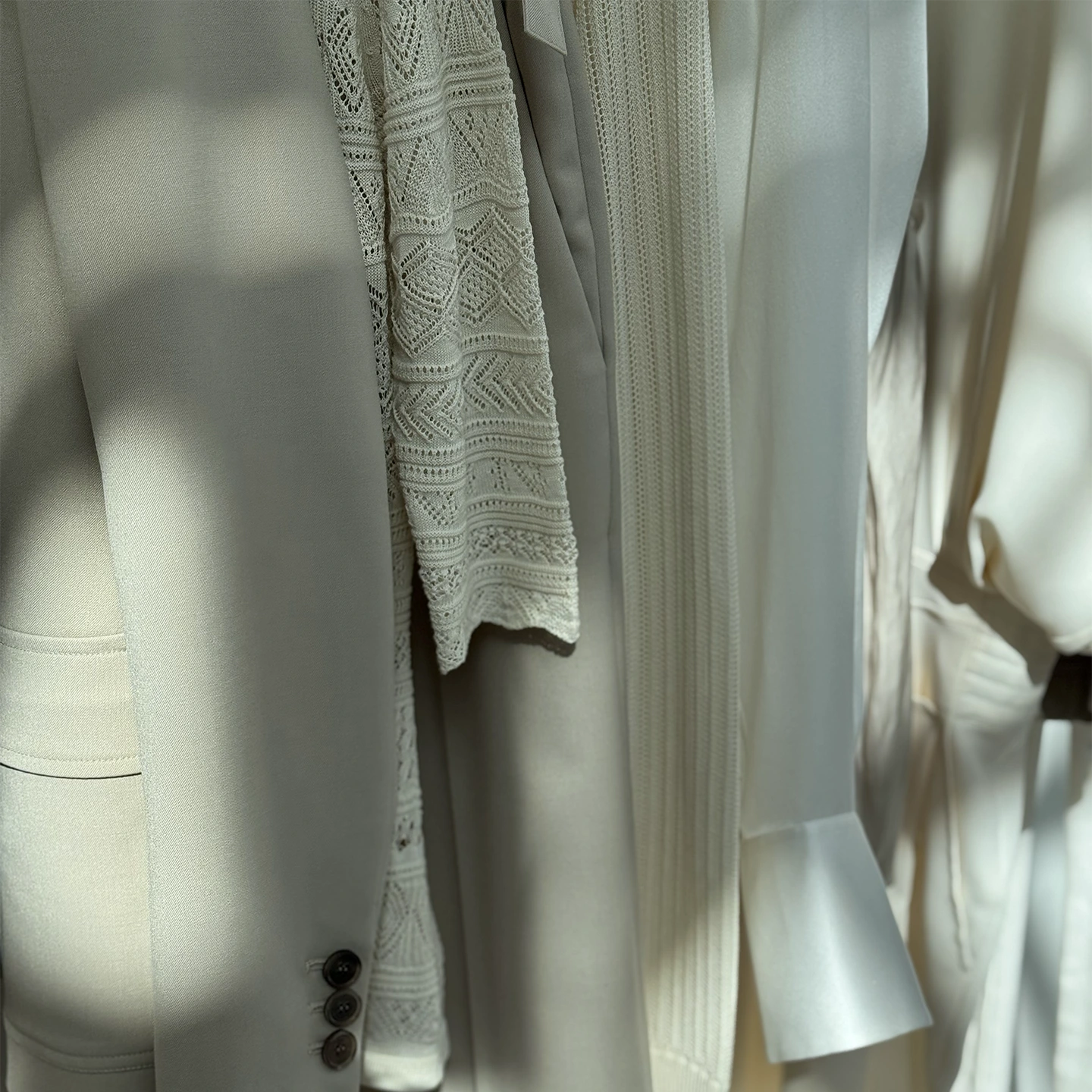 Racks display a complete vision: patterns, handbags, and accessories that encapsulate the Barbara Bui identity. Metallic bracelets meet soft fabrics; rock-inspired details intertwine with refined tailoring. From this harmony emerges the essence of the Barbara Bui woman — strong yet graceful, rebellious yet polished, understated yet magnetic.