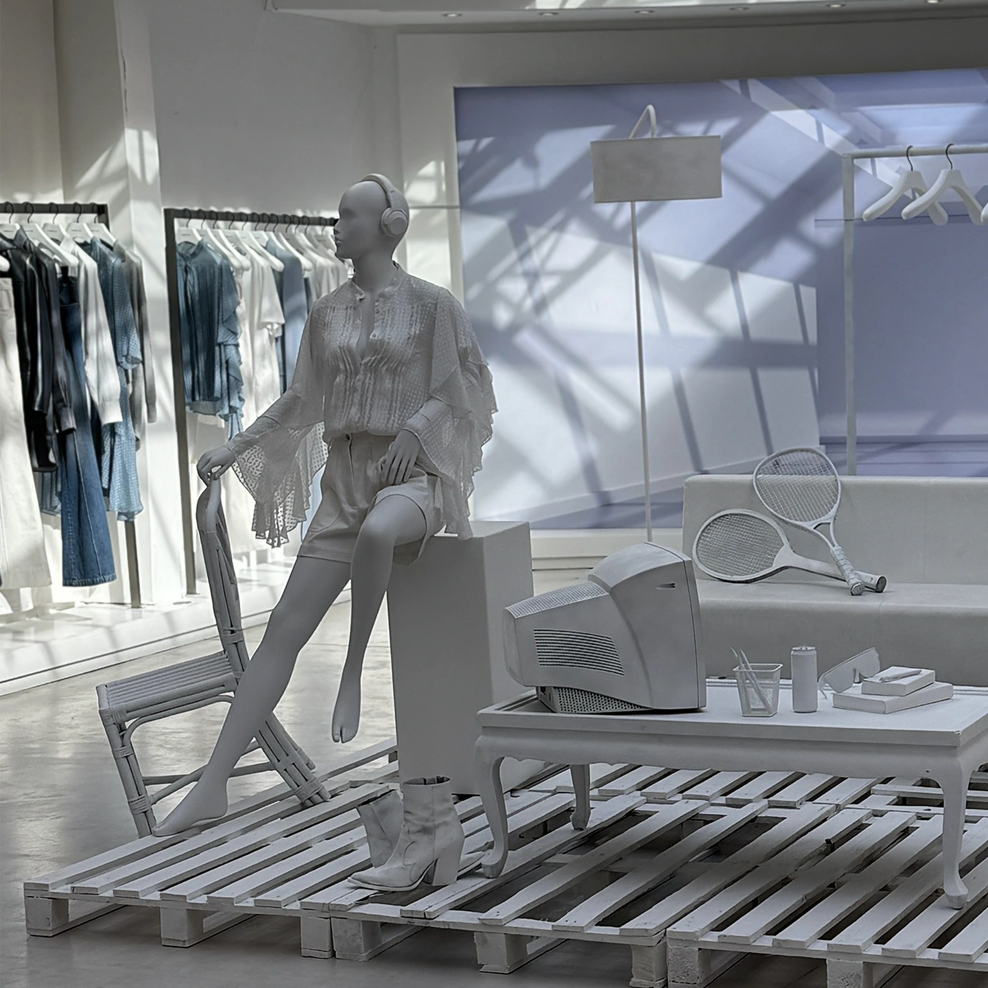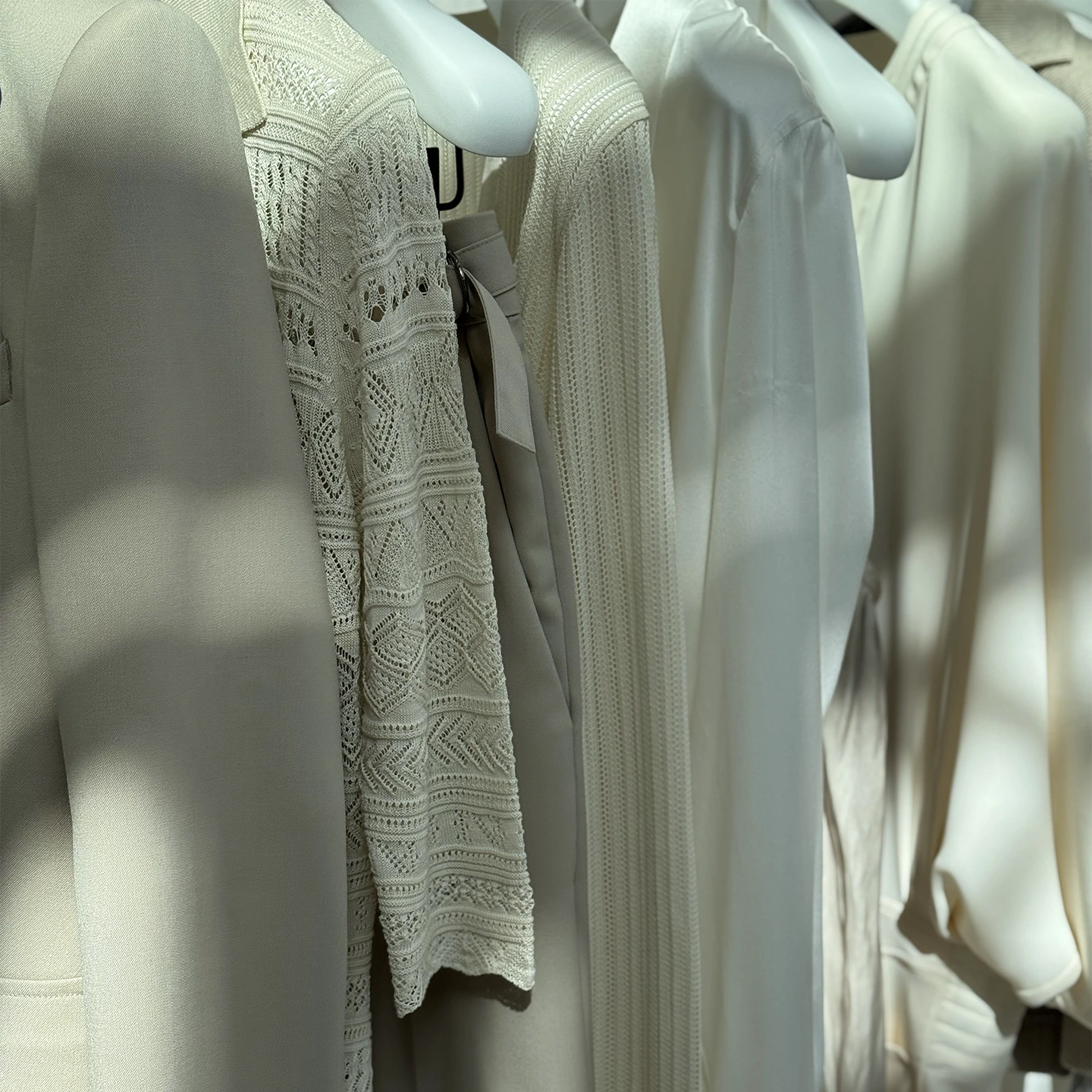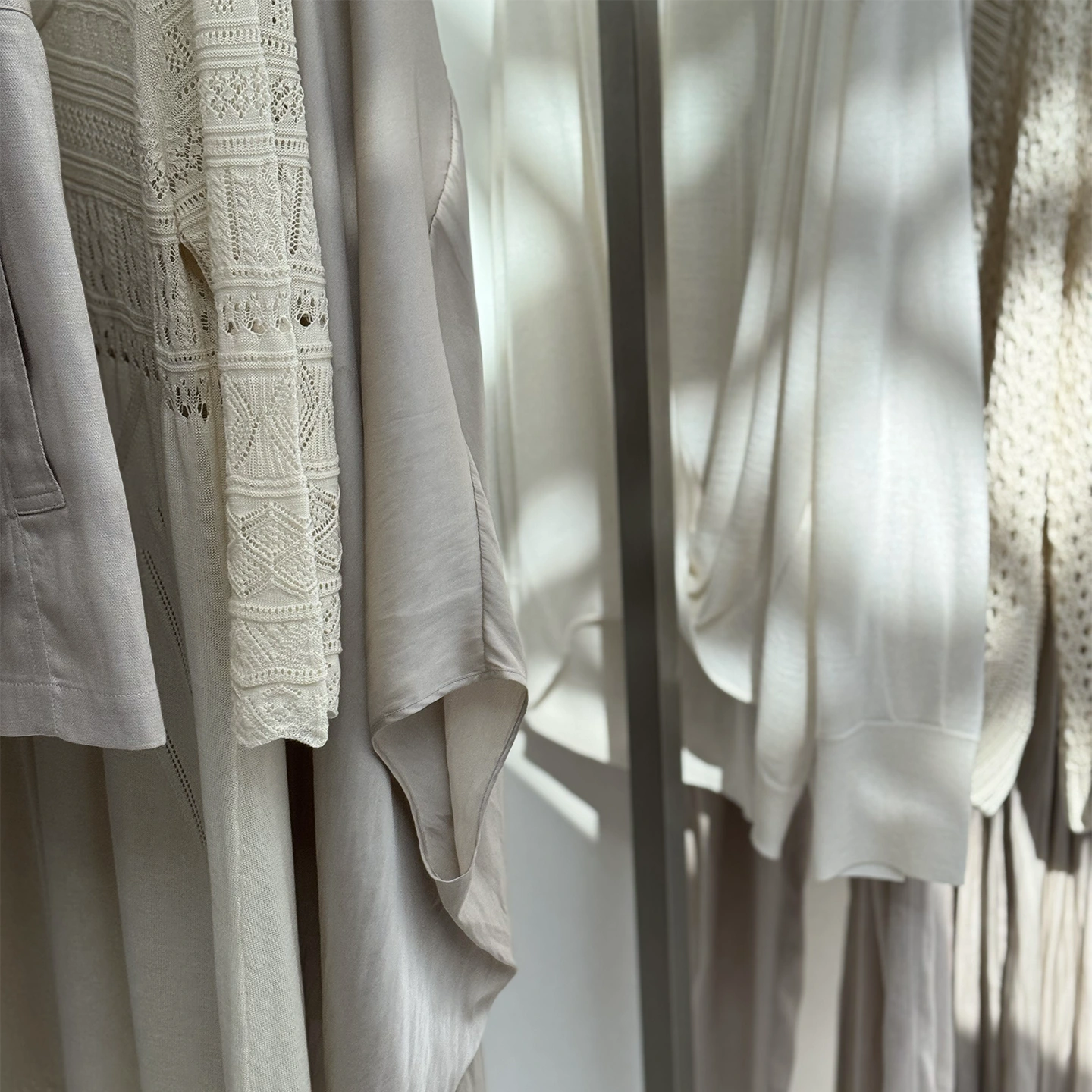 Stepping into the Marais showroom is to enter more than a space — it is to experience a world curated with intent. Vast, luminous, and minimalist, the room embodies contemporary Parisian elegance: white walls, polished surfaces, glass, and natural light drifting across the floor like liquid. On a central platform, mannequins present an exquisite white collection with effortless poise: cool, bohemian safari-inspired ensembles — jeans, cotton blouses and shorts, linen suits, cardigans, Prince of Wales checks, and swimwear pieces — each garment appearing almost weightless, given space to breathe and command attention. Subtle props — tennis rackets and artistic accents — add a playful touch while maintaining the serene sophistication of the setting.