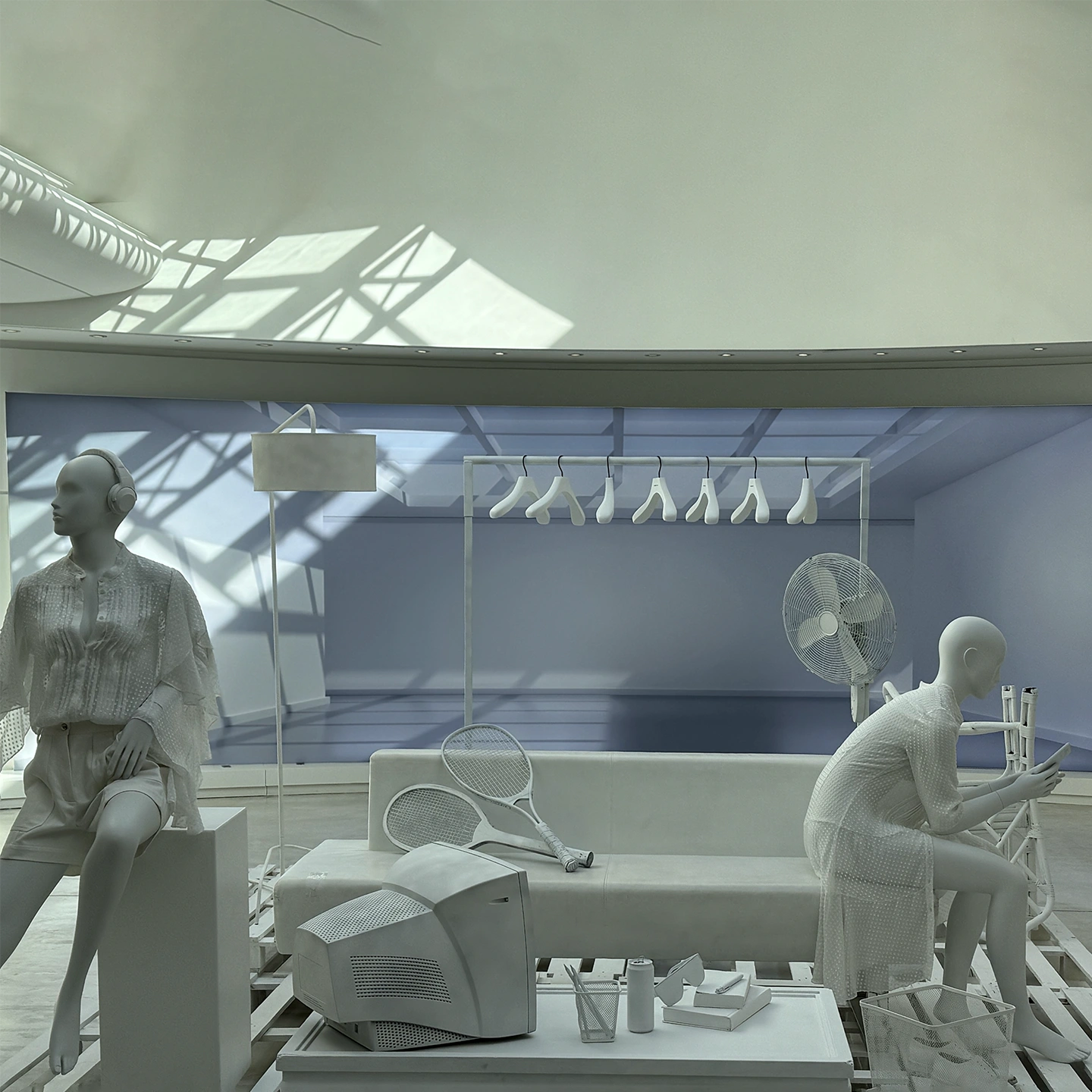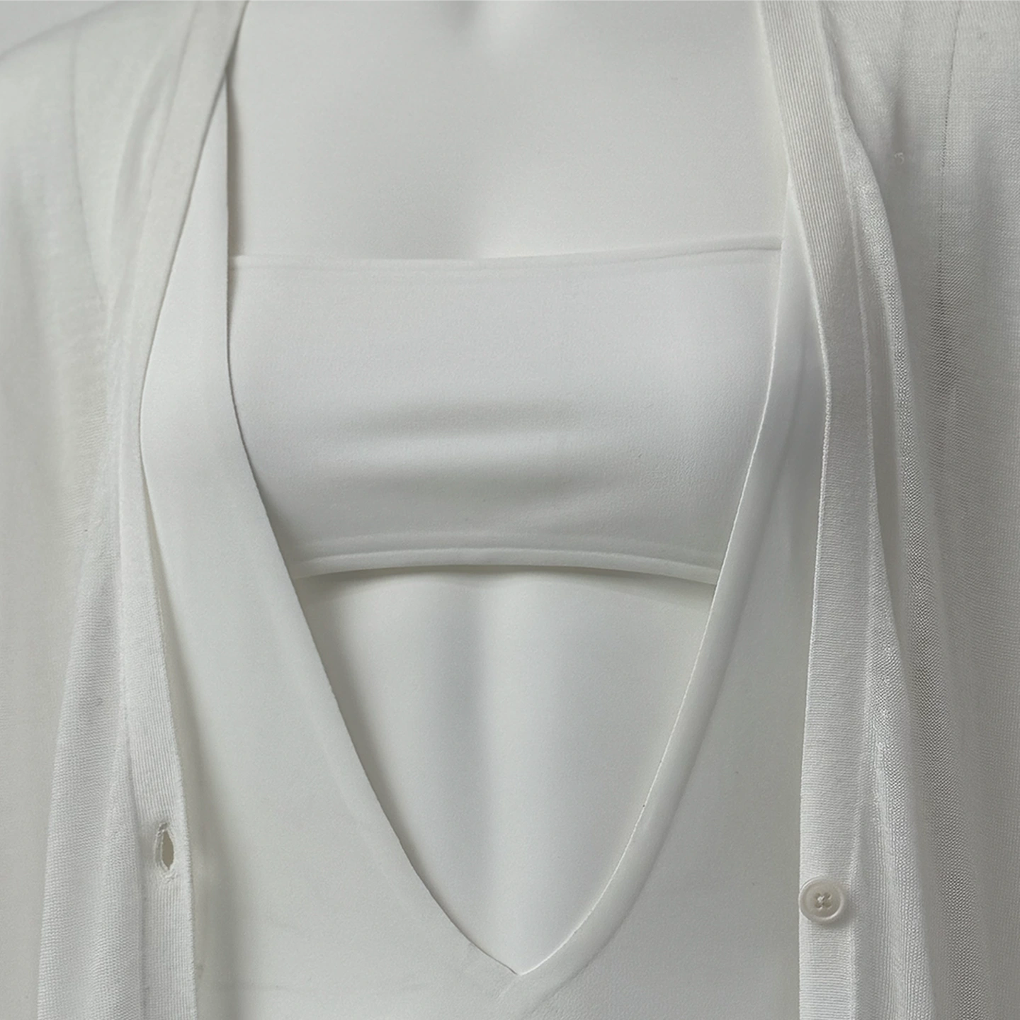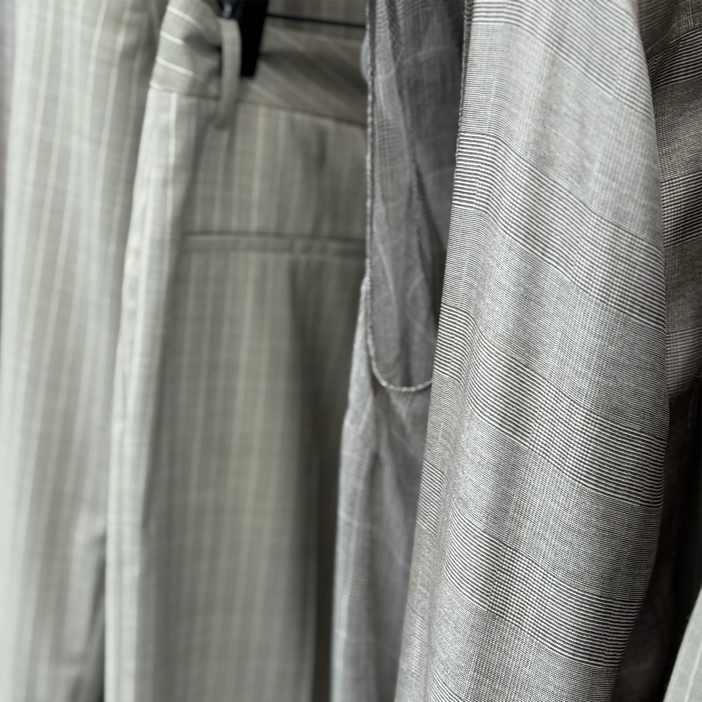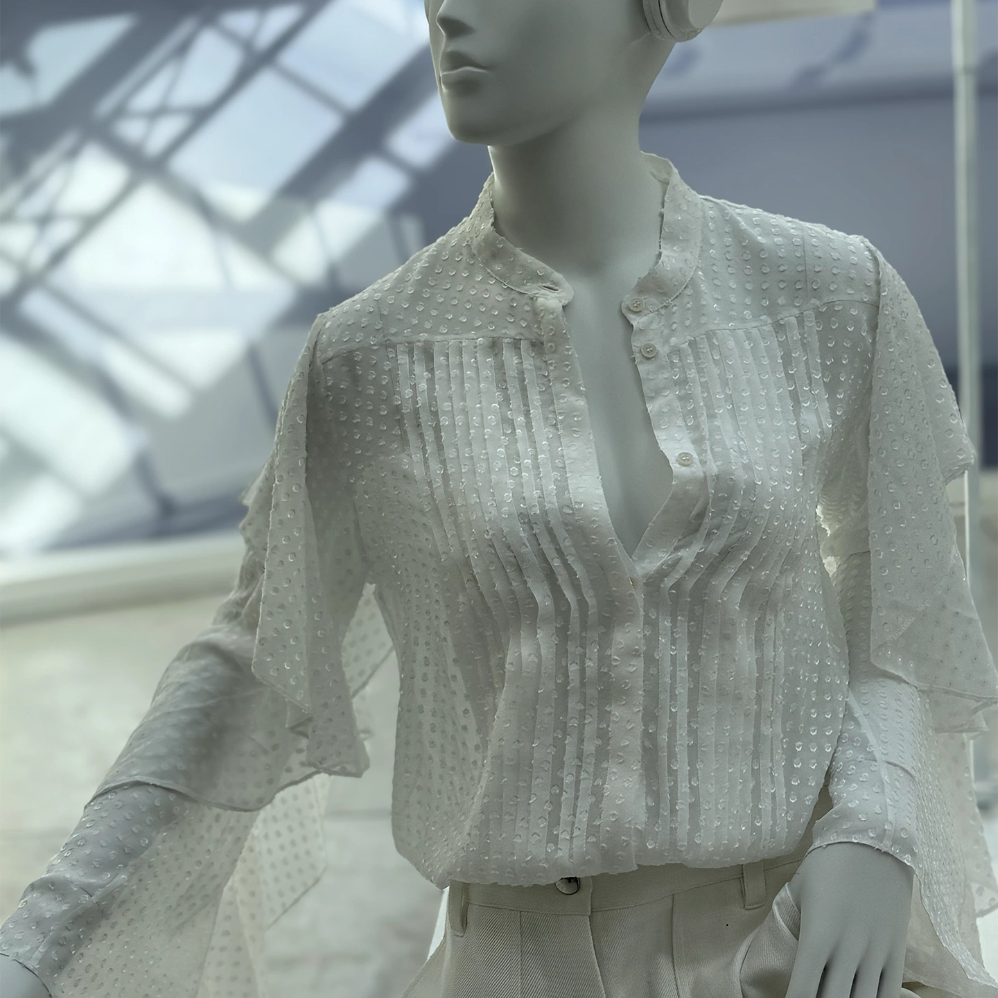 Stepping into the Marais showroom is to enter more than a space — it is to experience a world curated with intent. Vast, luminous, and minimalist, the room embodies contemporary Parisian elegance: white walls, polished surfaces, glass, and natural light drifting across the floor like liquid. On a central platform, mannequins present an exquisite white collection with effortless poise: cool, bohemian safari-inspired ensembles — jeans, cotton blouses and shorts, linen suits, cardigans, Prince of Wales checks, and swimwear pieces — each garment appearing almost weightless, given space to breathe and command attention. Subtle props — tennis rackets and artistic accents — add a playful touch while maintaining the serene sophistication of the setting.