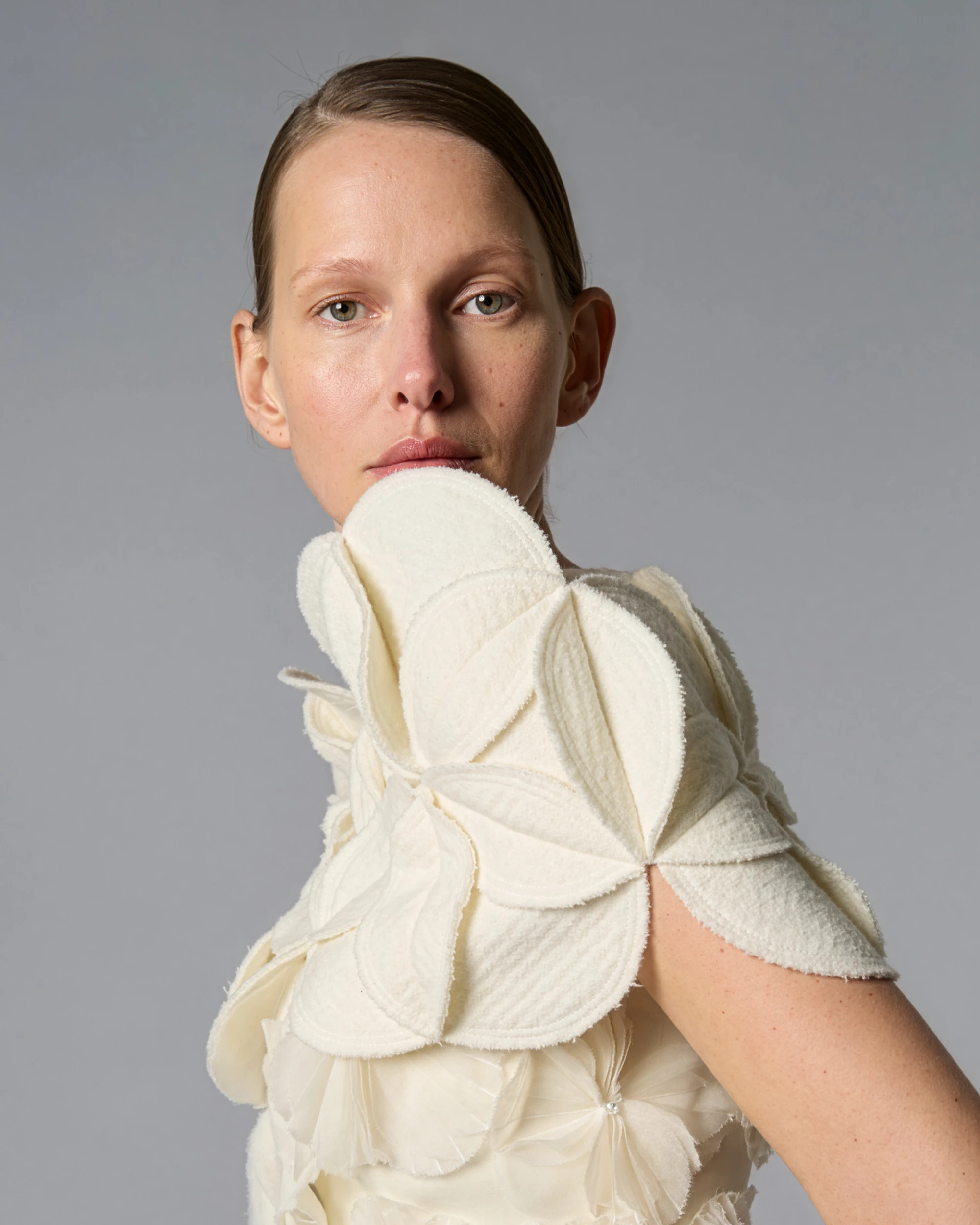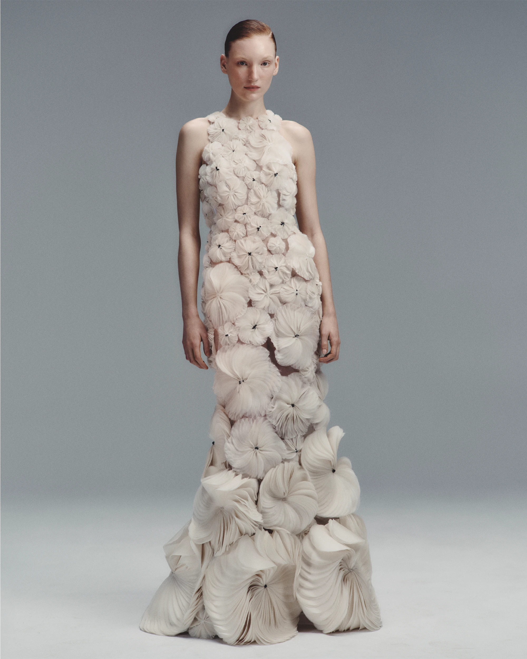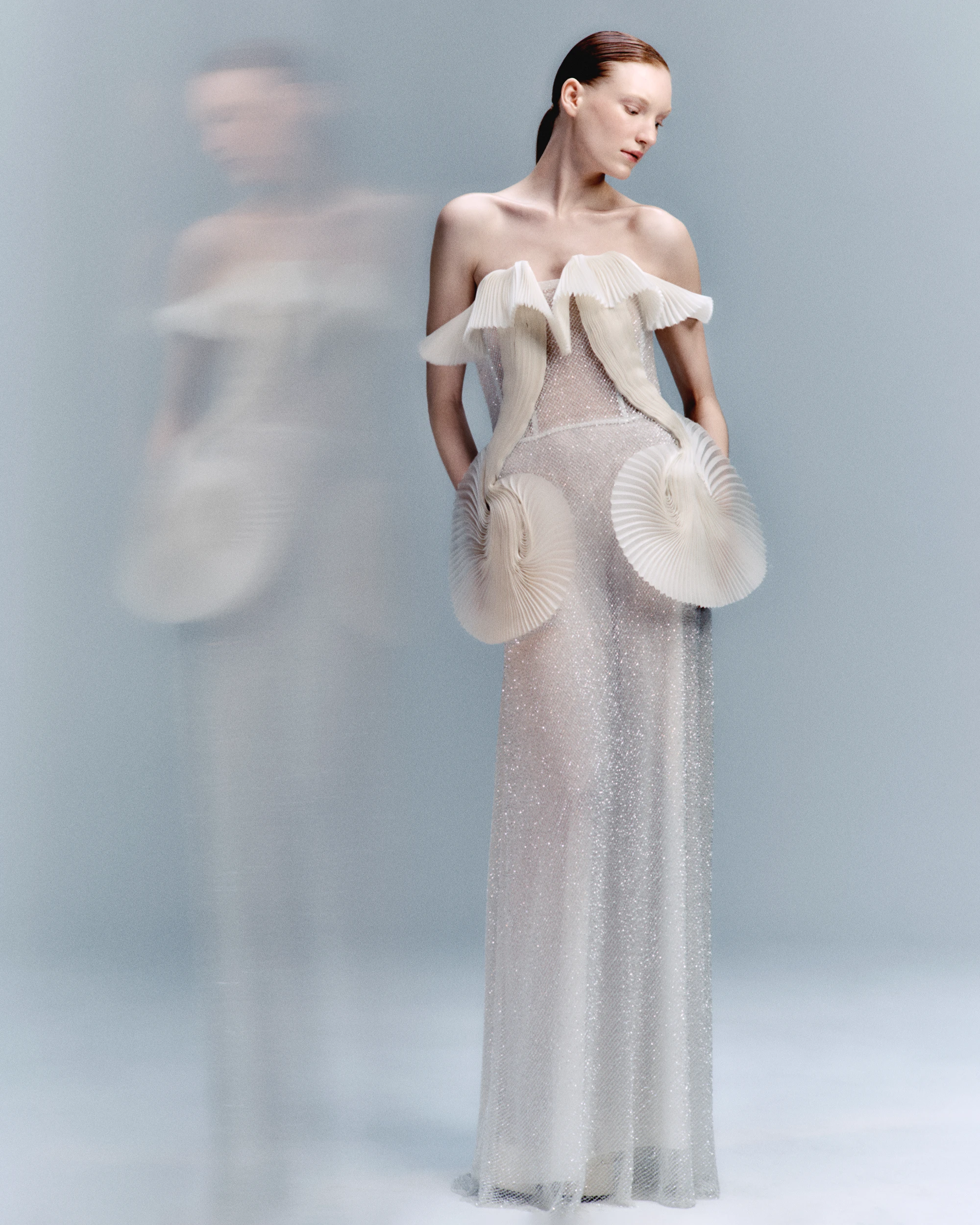 If the ready-to-wear speaks in nuance, the couture articulates its philosophy in full. Drawing from zhezhi, the ancient Chinese art of paper folding, Fang Yang constructs garments as sculptural propositions. Fabric is folded, layered and engineered into forms that hover between garment and object. Each piece carries the imprint of time, with hours distilled into gesture and repetition refined into clarity.
