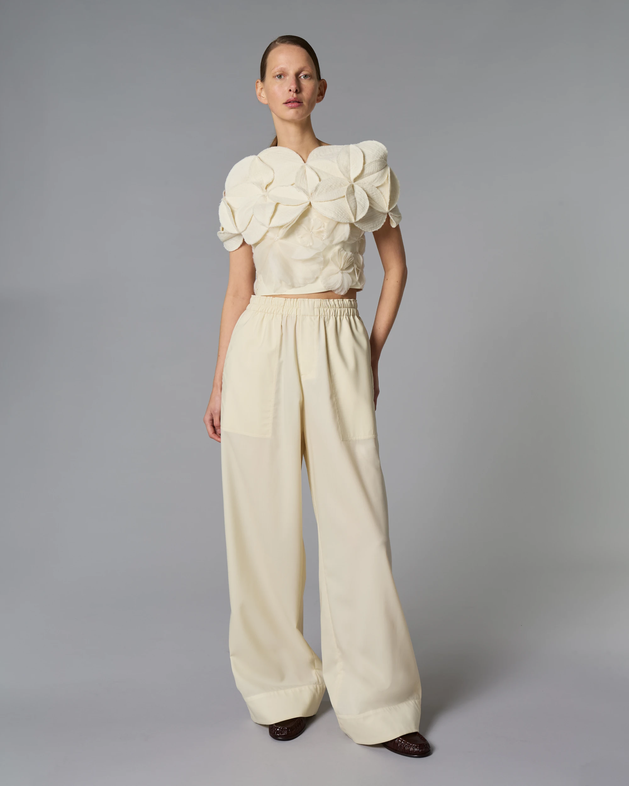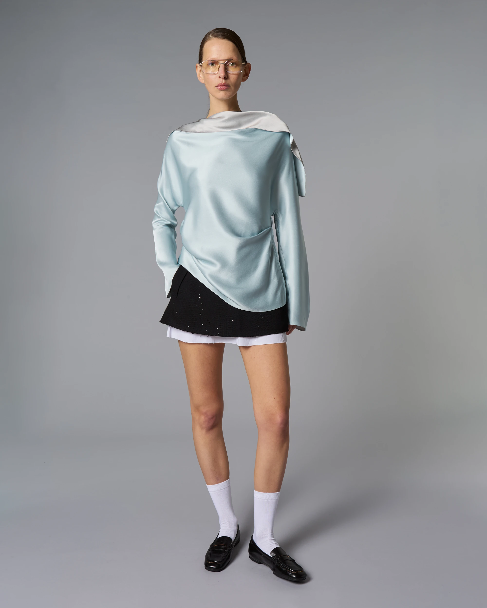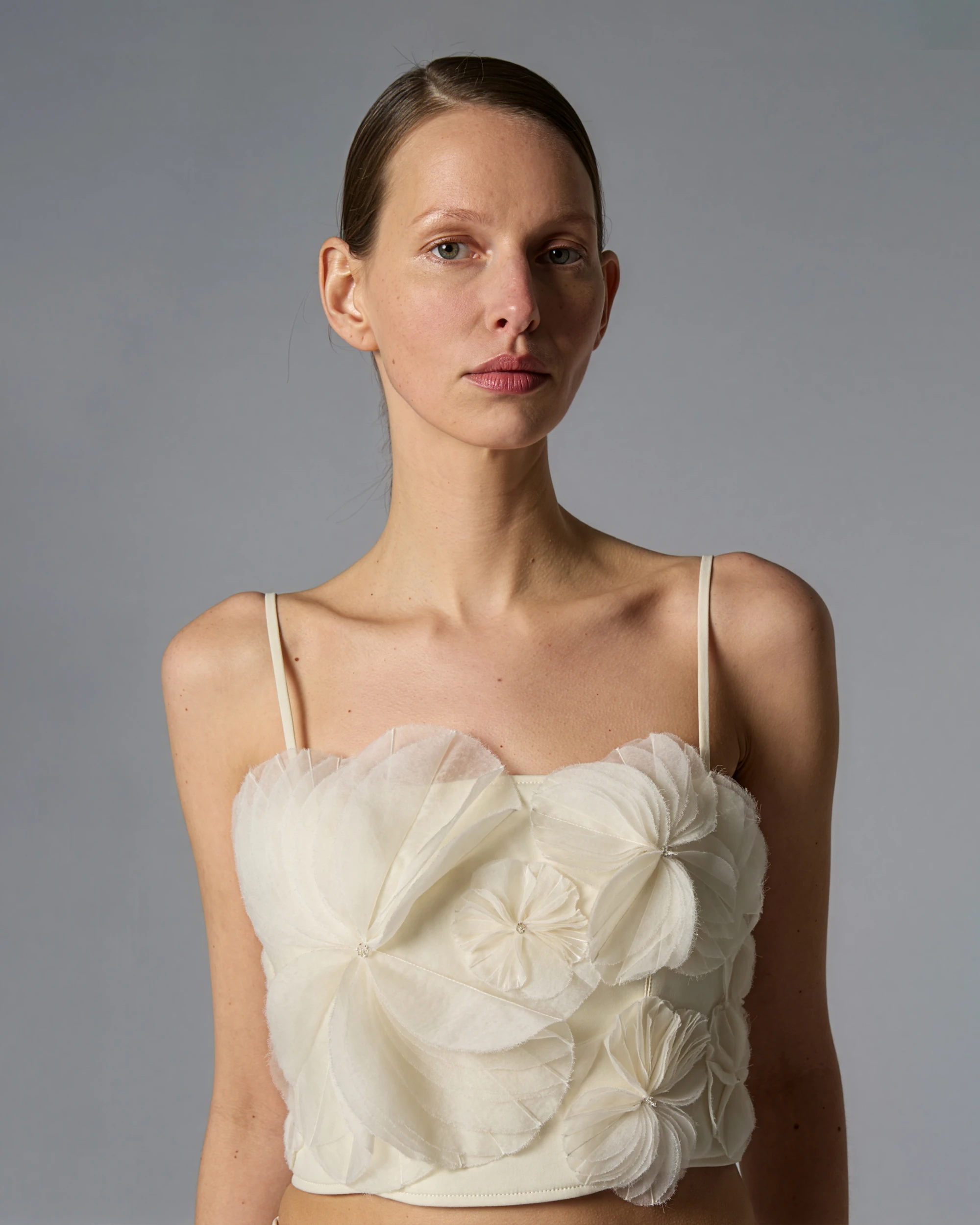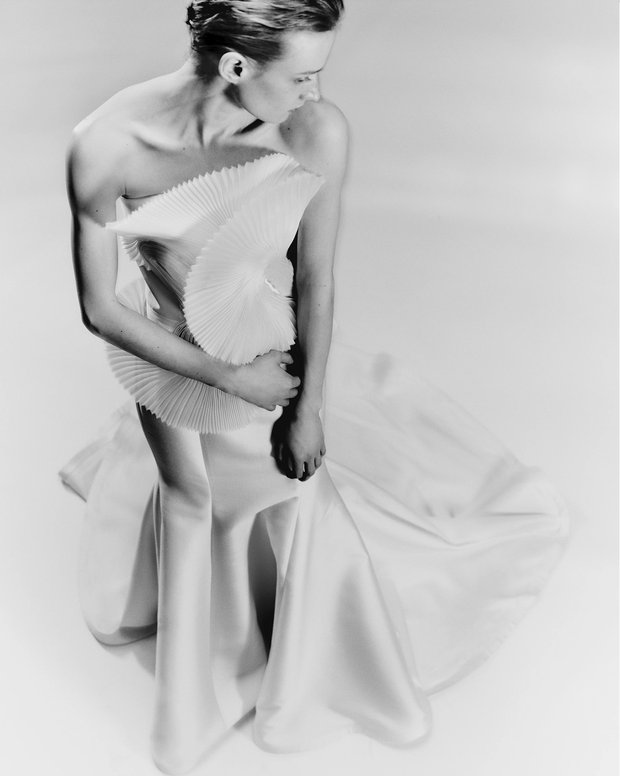 If the ready-to-wear speaks in nuance, the couture articulates its philosophy in full. Drawing from zhezhi, the ancient Chinese art of paper folding, Fang Yang constructs garments as sculptural propositions. Fabric is folded, layered and engineered into forms that hover between garment and object. Each piece carries the imprint of time, with hours distilled into gesture and repetition refined into clarity.