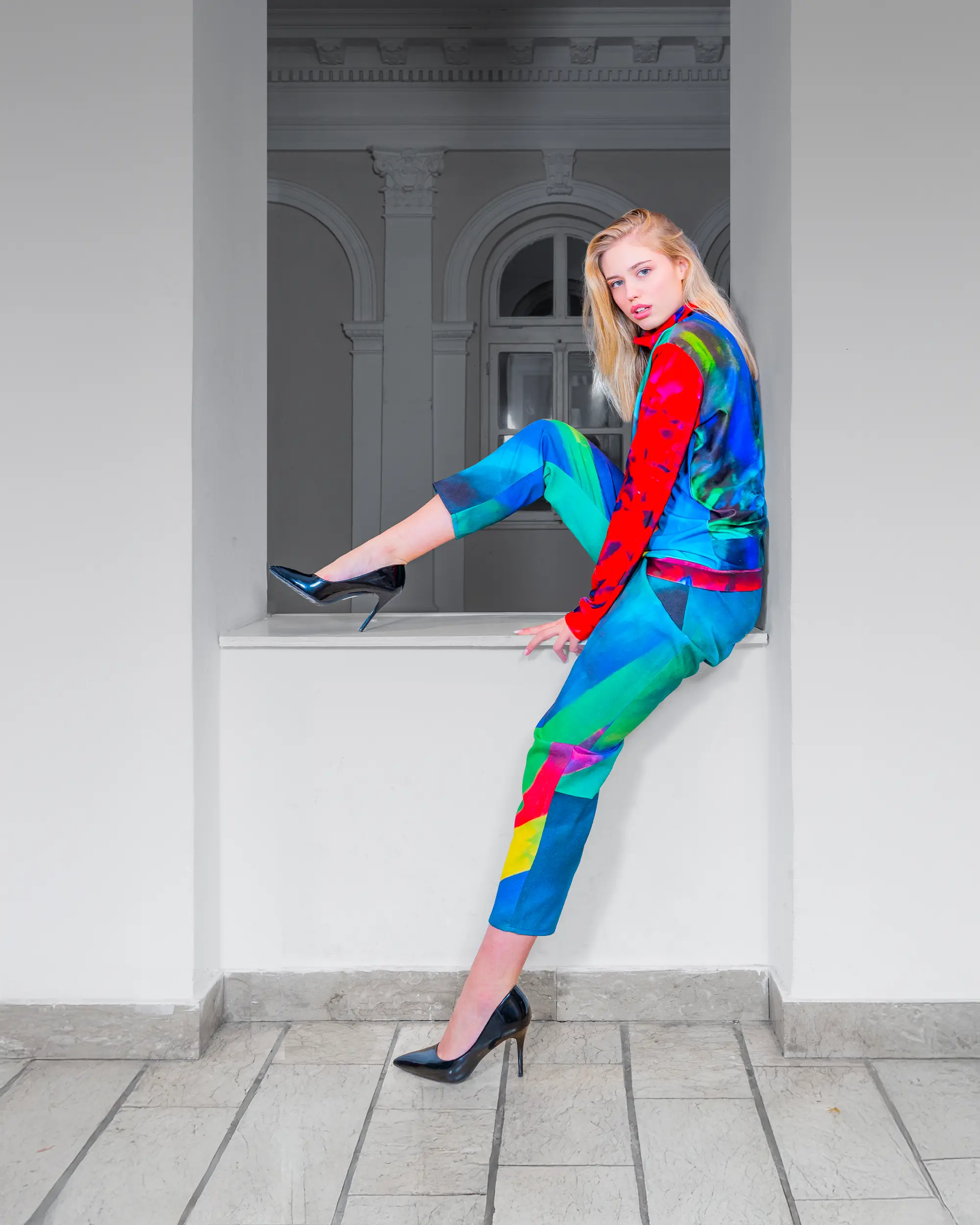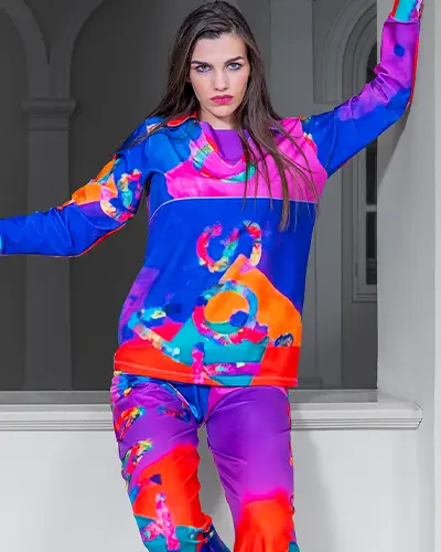 Graphic color-blocked tops paired with matching pants offer a powerful, contemporary statement. Strong tones and expressive visuals transform these looks into wearable artworks, balancing structure with ease. Youthful, sensual, and confident, they embody a style that commands attention — beautifully.