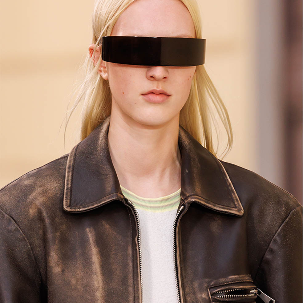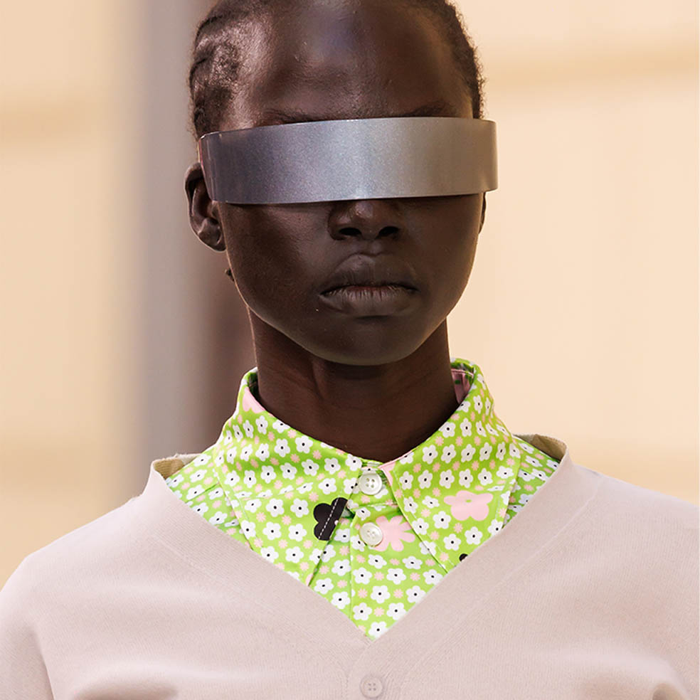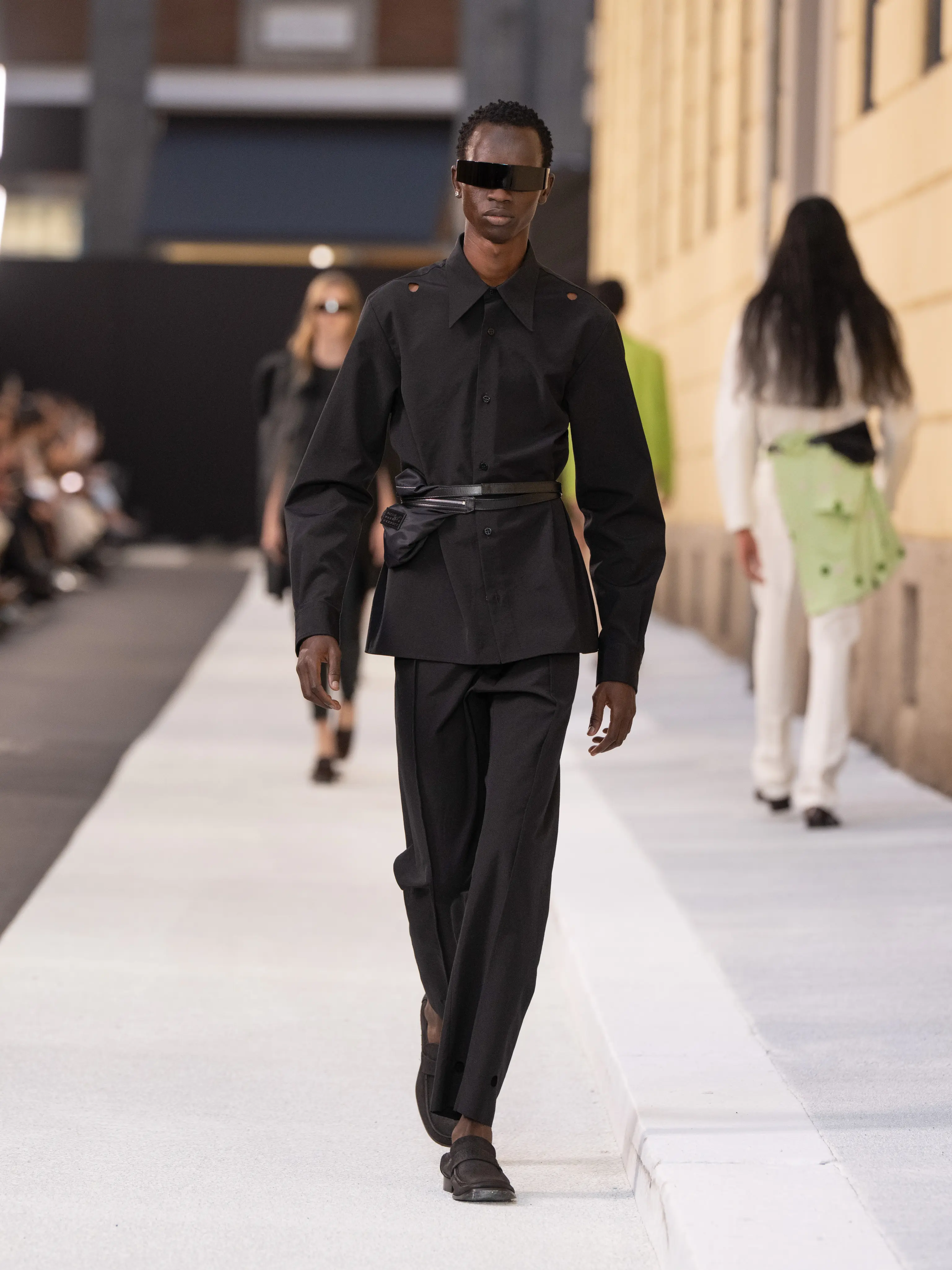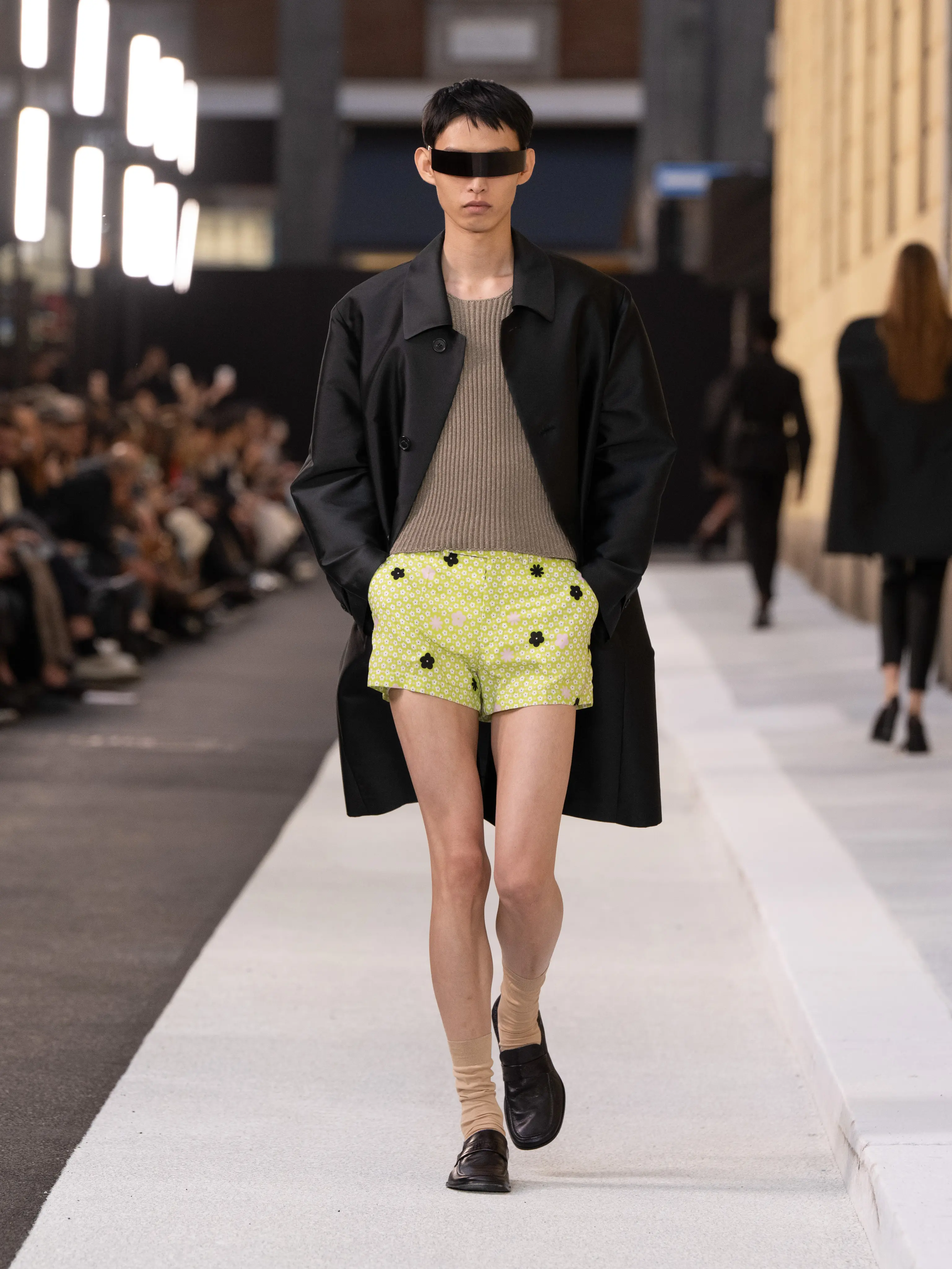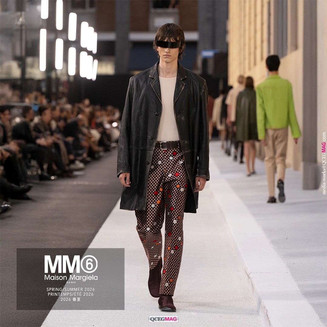 The Collection: Rewriting the Everyday — The SS26 lineup was a masterclass in transforming wardrobe staples into objects of desire, balancing streamlined silhouettes with off-kilter details that winked at the house’s deconstructivist roots. The color palette—a “panoply of post-it colors”—mixed thrift-inspired neutrals (grays, beiges, faded blacks) with electric jolts of acid green, neon blue, and a revived archival geometric floral print in vivid hues. Fabrics ranged from distressed leathers to crisp cottons, with frayed hems and dangling end-of-roll labels adding tactile imperfection. Each piece felt like a conversation between the curated and the chaotic, designed for a wearer who moves effortlessly between the gallery and the grit of the street. Standout looks included garment-bag blousons and capes, their structured yet fluid forms evoking both practicality and surrealism. Tailored trousers masqueraded as denim, while high-waisted jeans embraced relaxed, almost slouchy fits in faded washes or bold prints. Camp-collar shirts and buttoned blousons, often layered with illusionary prints, nodded to a retro sensibility, their covered buttons lending a veneer of “neat” appropriateness. Pantsuits were scrambled with mismatched fabrics, and shift dresses, crafted from garment-bag motifs, swayed with frayed edges that danced in the Milan breeze. Accessories leaned into the playful: satin fanny packs slung low, kitten-heel loafers reimagined as mules, and the house’s signature censor-bar sunglasses, a subtle nod to Margiela’s ironic legacy.