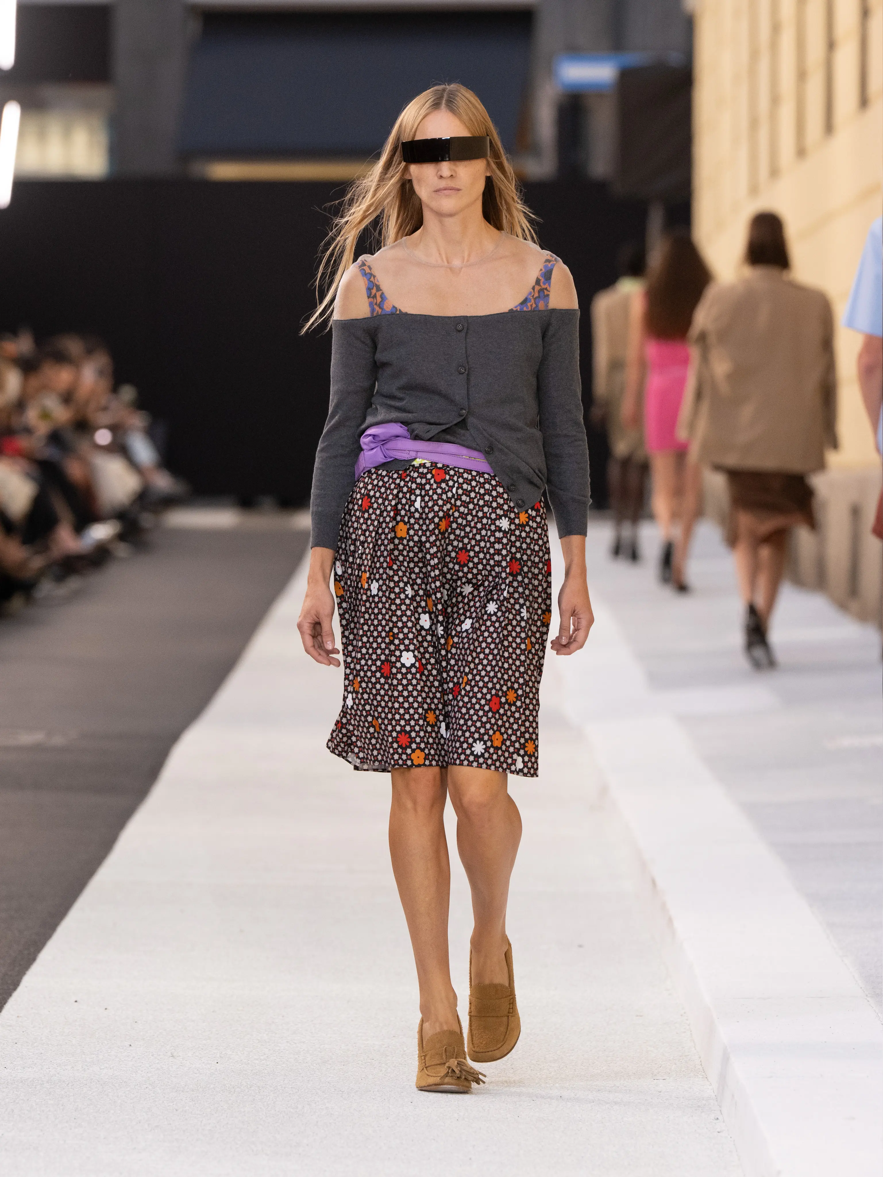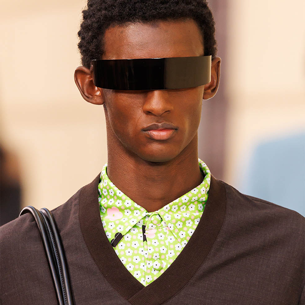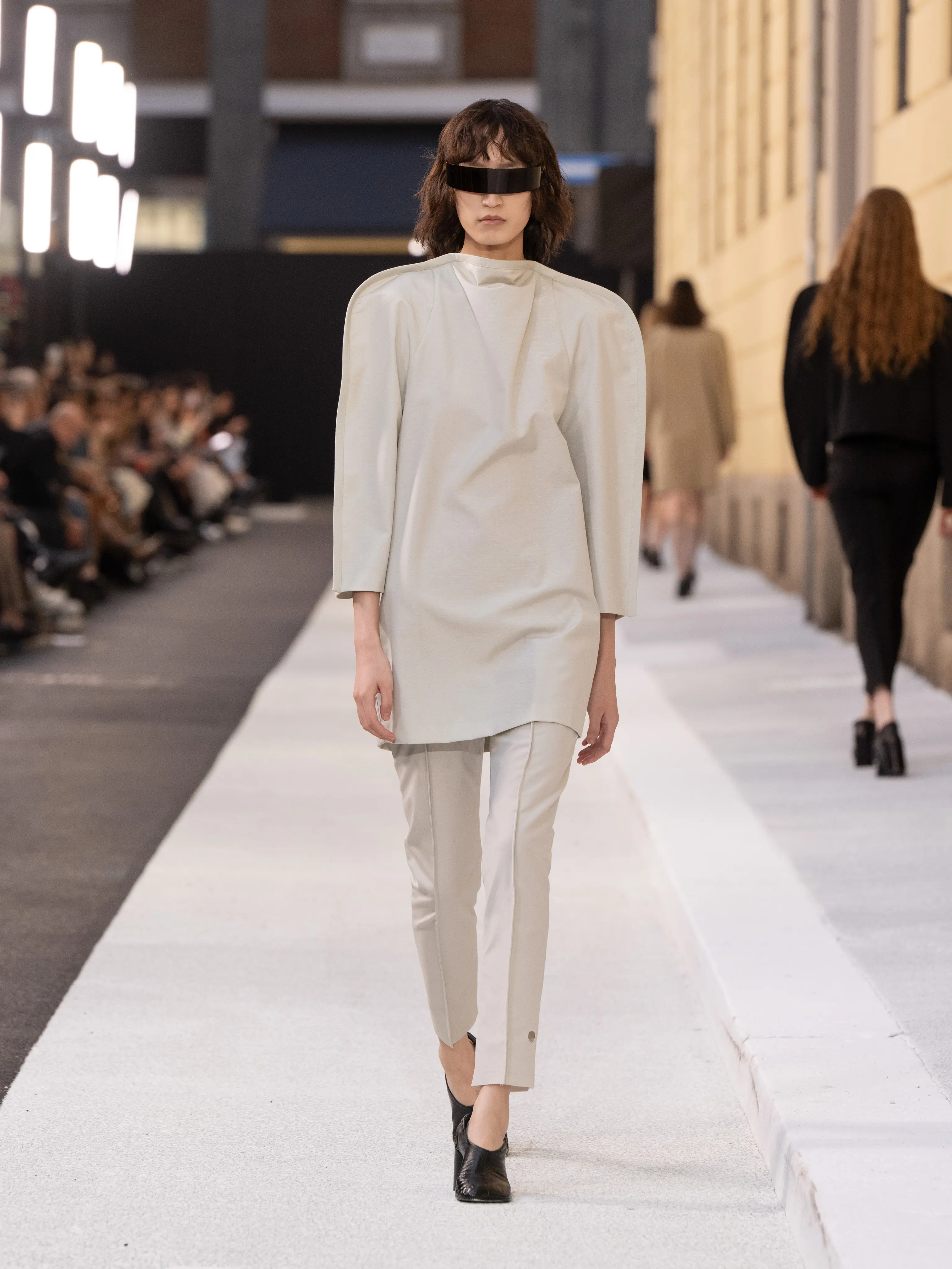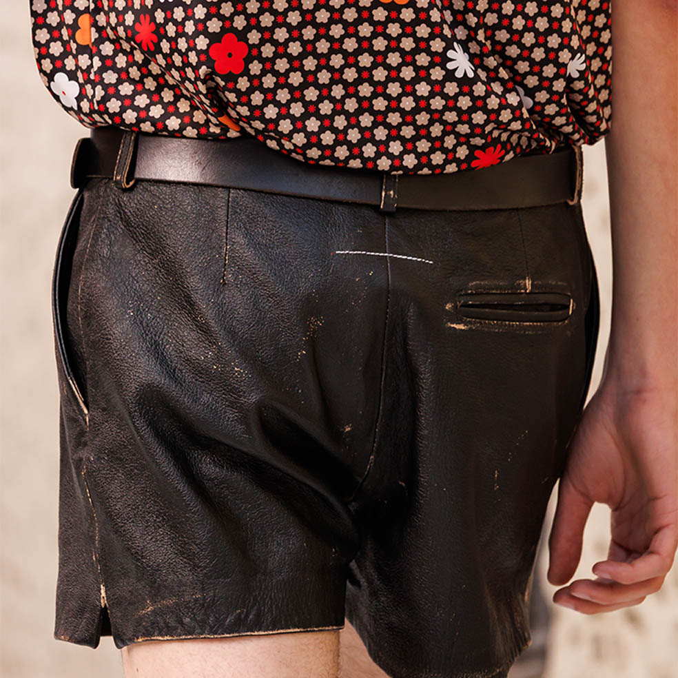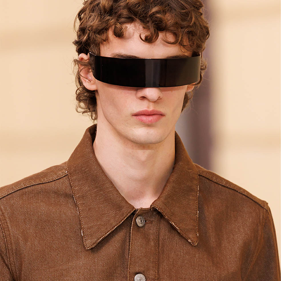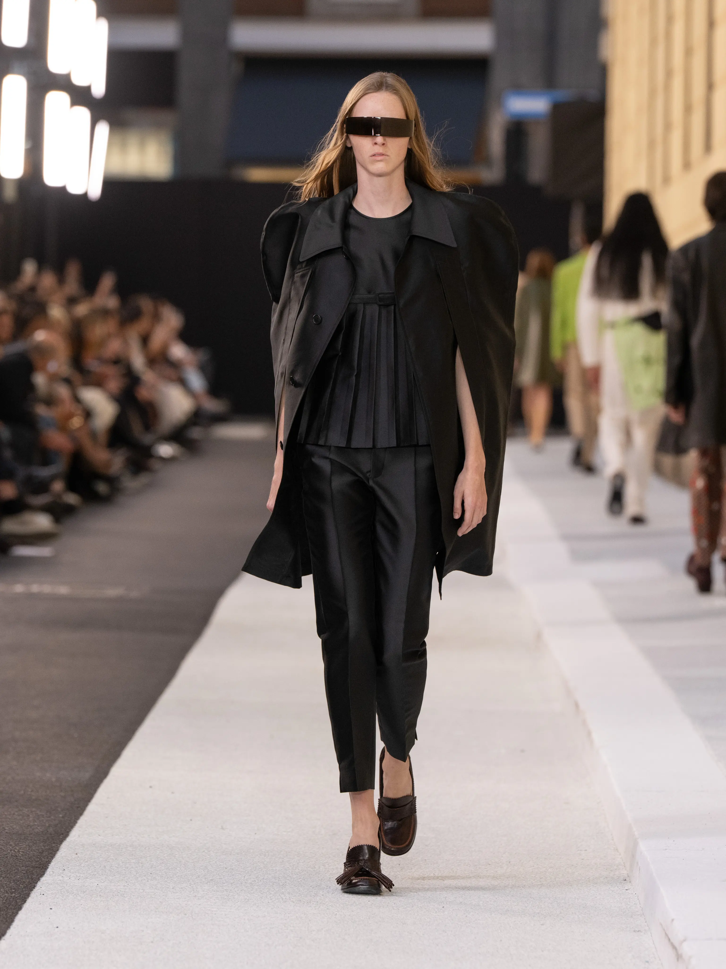 The Collection: Rewriting the Everyday — The SS26 lineup was a masterclass in transforming wardrobe staples into objects of desire, balancing streamlined silhouettes with off-kilter details that winked at the house’s deconstructivist roots. The color palette—a “panoply of post-it colors”—mixed thrift-inspired neutrals (grays, beiges, faded blacks) with electric jolts of acid green, neon blue, and a revived archival geometric floral print in vivid hues. Fabrics ranged from distressed leathers to crisp cottons, with frayed hems and dangling end-of-roll labels adding tactile imperfection. Each piece felt like a conversation between the curated and the chaotic, designed for a wearer who moves effortlessly between the gallery and the grit of the street. Standout looks included garment-bag blousons and capes, their structured yet fluid forms evoking both practicality and surrealism. Tailored trousers masqueraded as denim, while high-waisted jeans embraced relaxed, almost slouchy fits in faded washes or bold prints. Camp-collar shirts and buttoned blousons, often layered with illusionary prints, nodded to a retro sensibility, their covered buttons lending a veneer of “neat” appropriateness. Pantsuits were scrambled with mismatched fabrics, and shift dresses, crafted from garment-bag motifs, swayed with frayed edges that danced in the Milan breeze. Accessories leaned into the playful: satin fanny packs slung low, kitten-heel loafers reimagined as mules, and the house’s signature censor-bar sunglasses, a subtle nod to Margiela’s ironic legacy.
