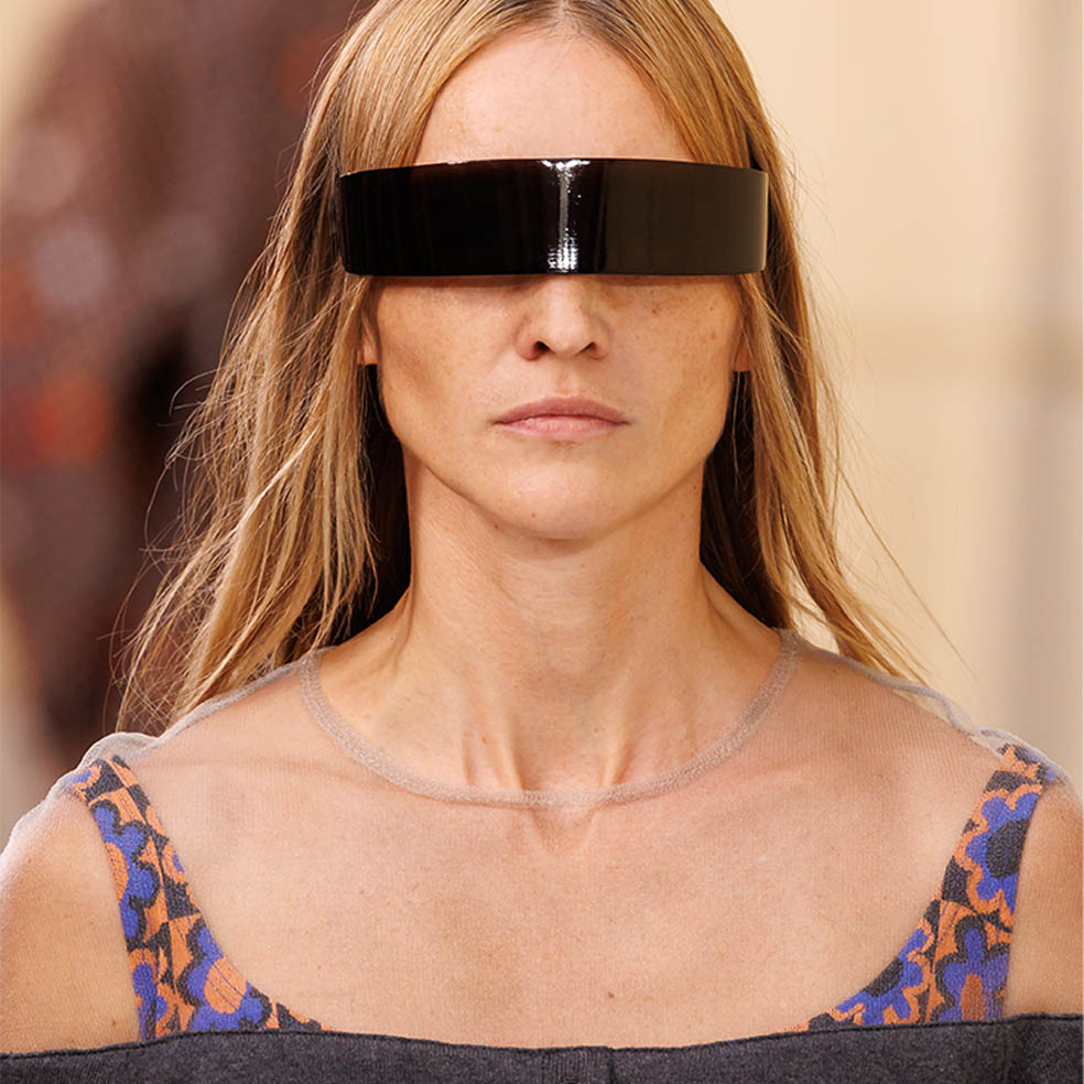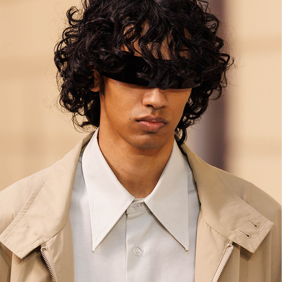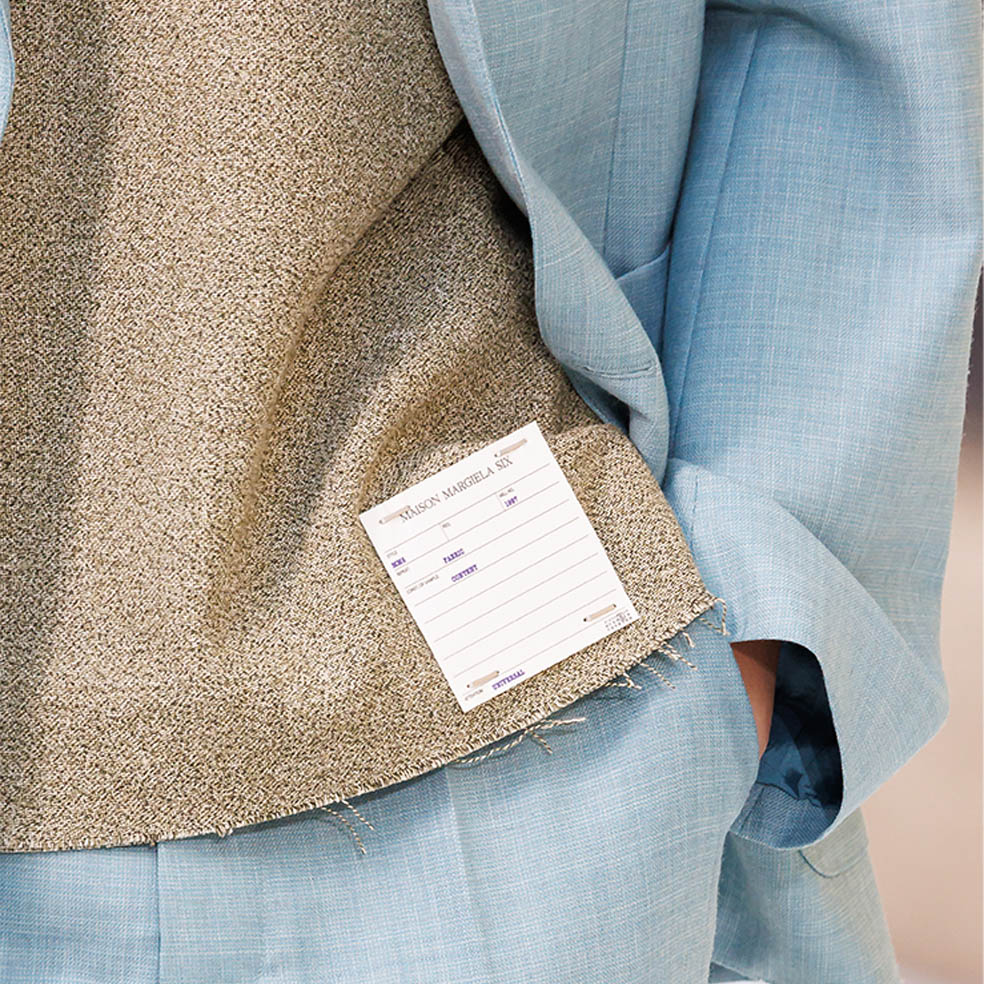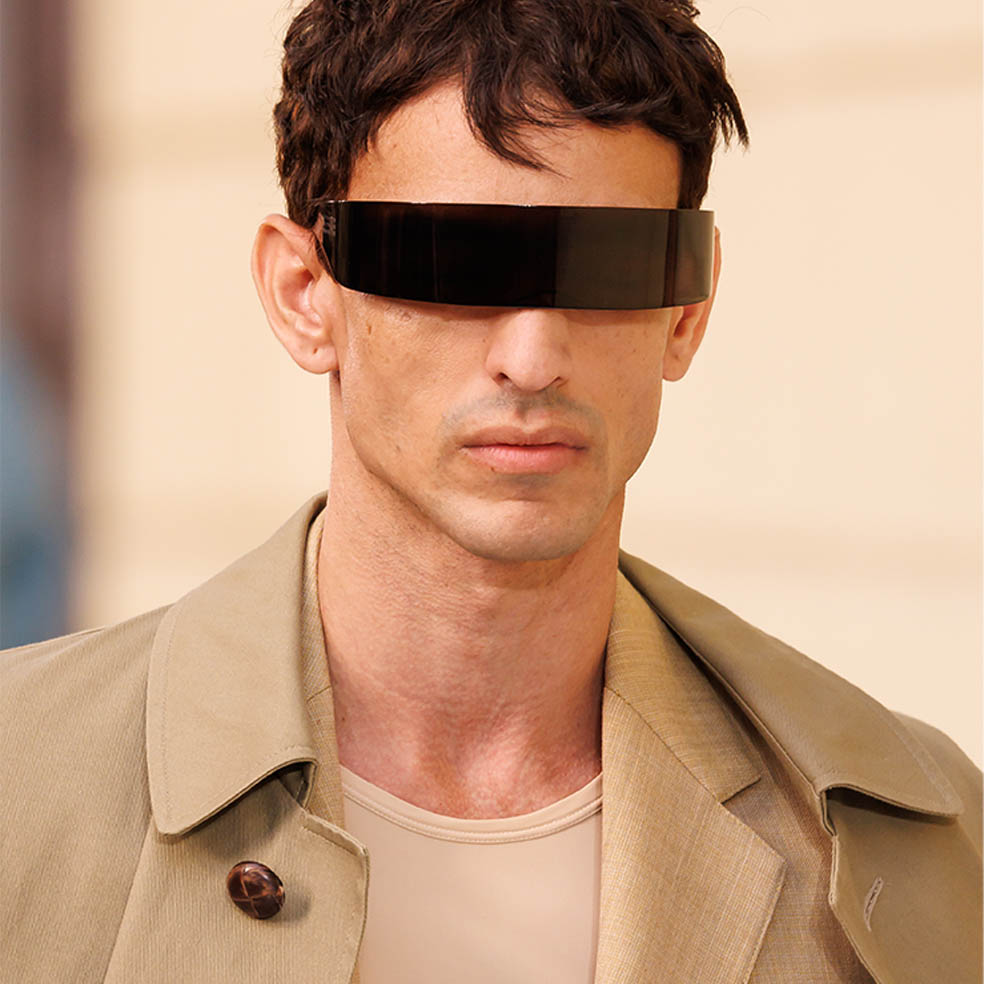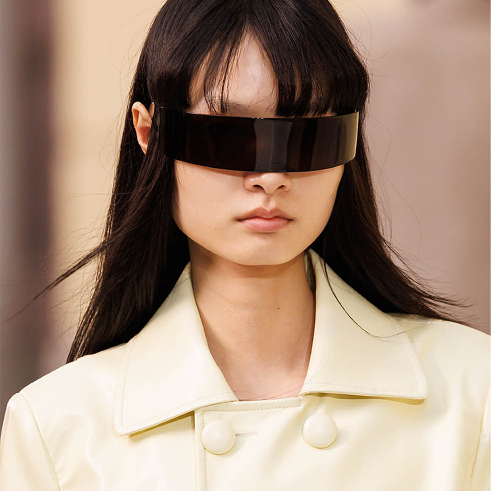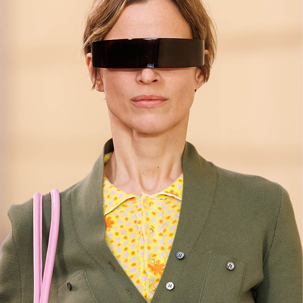 The Collection: Rewriting the Everyday — The SS26 lineup was a masterclass in transforming wardrobe staples into objects of desire, balancing streamlined silhouettes with off-kilter details that winked at the house’s deconstructivist roots. The color palette—a “panoply of post-it colors”—mixed thrift-inspired neutrals (grays, beiges, faded blacks) with electric jolts of acid green, neon blue, and a revived archival geometric floral print in vivid hues. Fabrics ranged from distressed leathers to crisp cottons, with frayed hems and dangling end-of-roll labels adding tactile imperfection. Each piece felt like a conversation between the curated and the chaotic, designed for a wearer who moves effortlessly between the gallery and the grit of the street. Standout looks included garment-bag blousons and capes, their structured yet fluid forms evoking both practicality and surrealism. Tailored trousers masqueraded as denim, while high-waisted jeans embraced relaxed, almost slouchy fits in faded washes or bold prints. Camp-collar shirts and buttoned blousons, often layered with illusionary prints, nodded to a retro sensibility, their covered buttons lending a veneer of “neat” appropriateness. Pantsuits were scrambled with mismatched fabrics, and shift dresses, crafted from garment-bag motifs, swayed with frayed edges that danced in the Milan breeze. Accessories leaned into the playful: satin fanny packs slung low, kitten-heel loafers reimagined as mules, and the house’s signature censor-bar sunglasses, a subtle nod to Margiela’s ironic legacy.