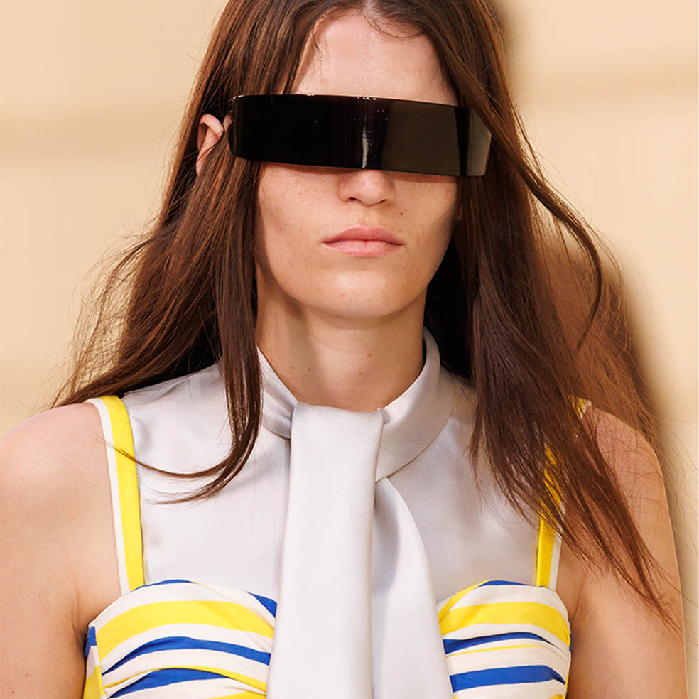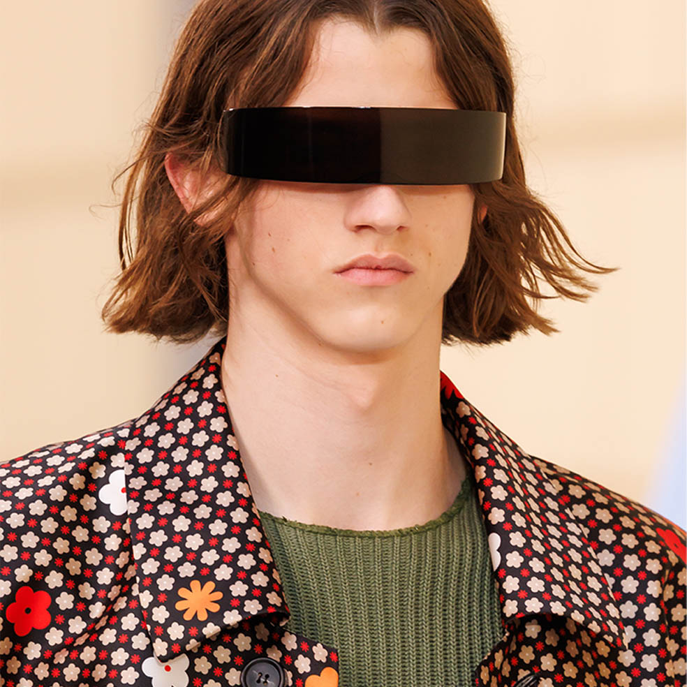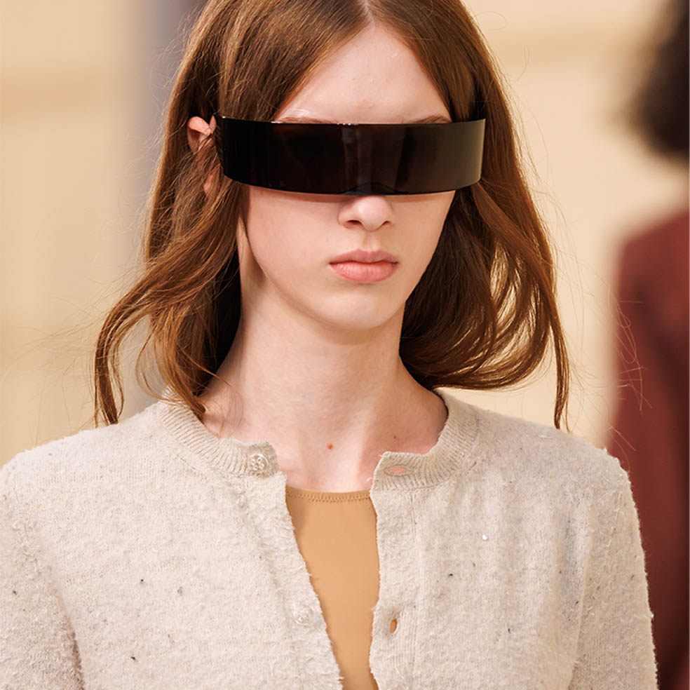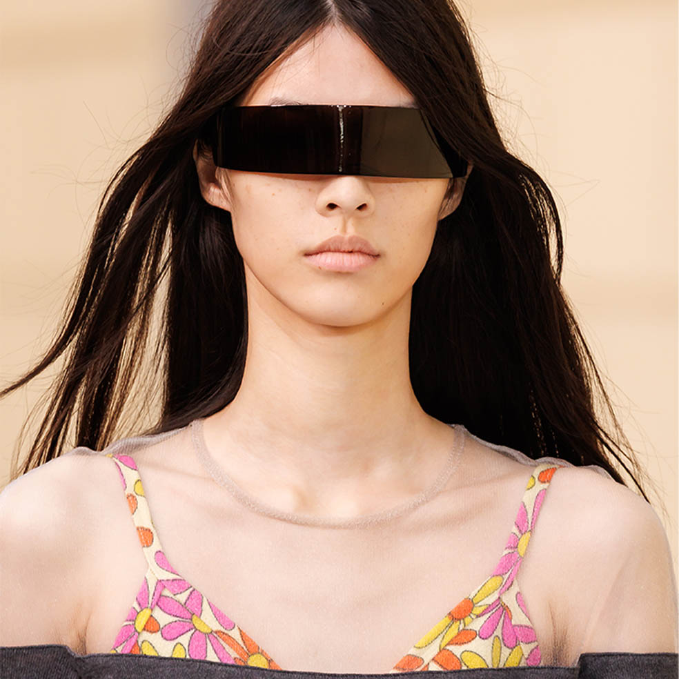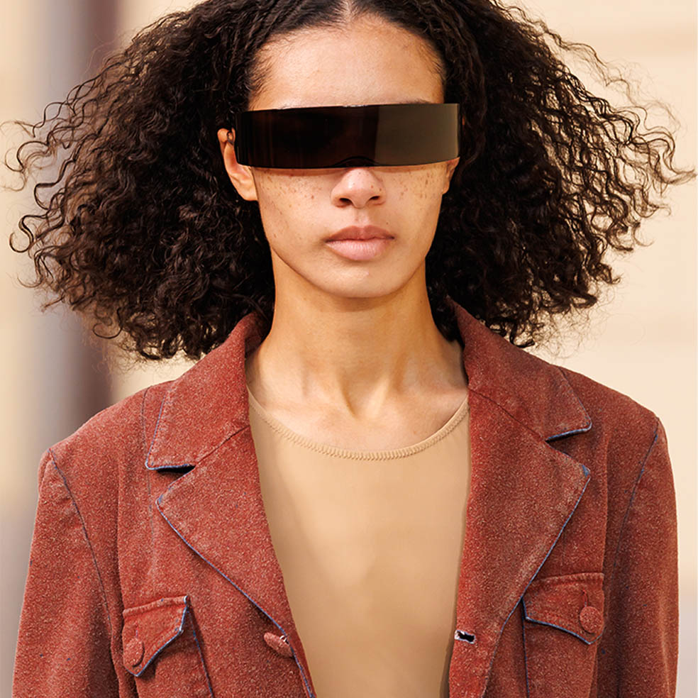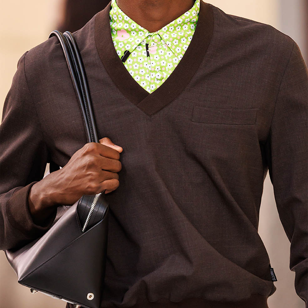 The Collection: Rewriting the Everyday — The SS26 lineup was a masterclass in transforming wardrobe staples into objects of desire, balancing streamlined silhouettes with off-kilter details that winked at the house’s deconstructivist roots. The color palette—a “panoply of post-it colors”—mixed thrift-inspired neutrals (grays, beiges, faded blacks) with electric jolts of acid green, neon blue, and a revived archival geometric floral print in vivid hues. Fabrics ranged from distressed leathers to crisp cottons, with frayed hems and dangling end-of-roll labels adding tactile imperfection. Each piece felt like a conversation between the curated and the chaotic, designed for a wearer who moves effortlessly between the gallery and the grit of the street. Standout looks included garment-bag blousons and capes, their structured yet fluid forms evoking both practicality and surrealism. Tailored trousers masqueraded as denim, while high-waisted jeans embraced relaxed, almost slouchy fits in faded washes or bold prints. Camp-collar shirts and buttoned blousons, often layered with illusionary prints, nodded to a retro sensibility, their covered buttons lending a veneer of “neat” appropriateness. Pantsuits were scrambled with mismatched fabrics, and shift dresses, crafted from garment-bag motifs, swayed with frayed edges that danced in the Milan breeze. Accessories leaned into the playful: satin fanny packs slung low, kitten-heel loafers reimagined as mules, and the house’s signature censor-bar sunglasses, a subtle nod to Margiela’s ironic legacy.