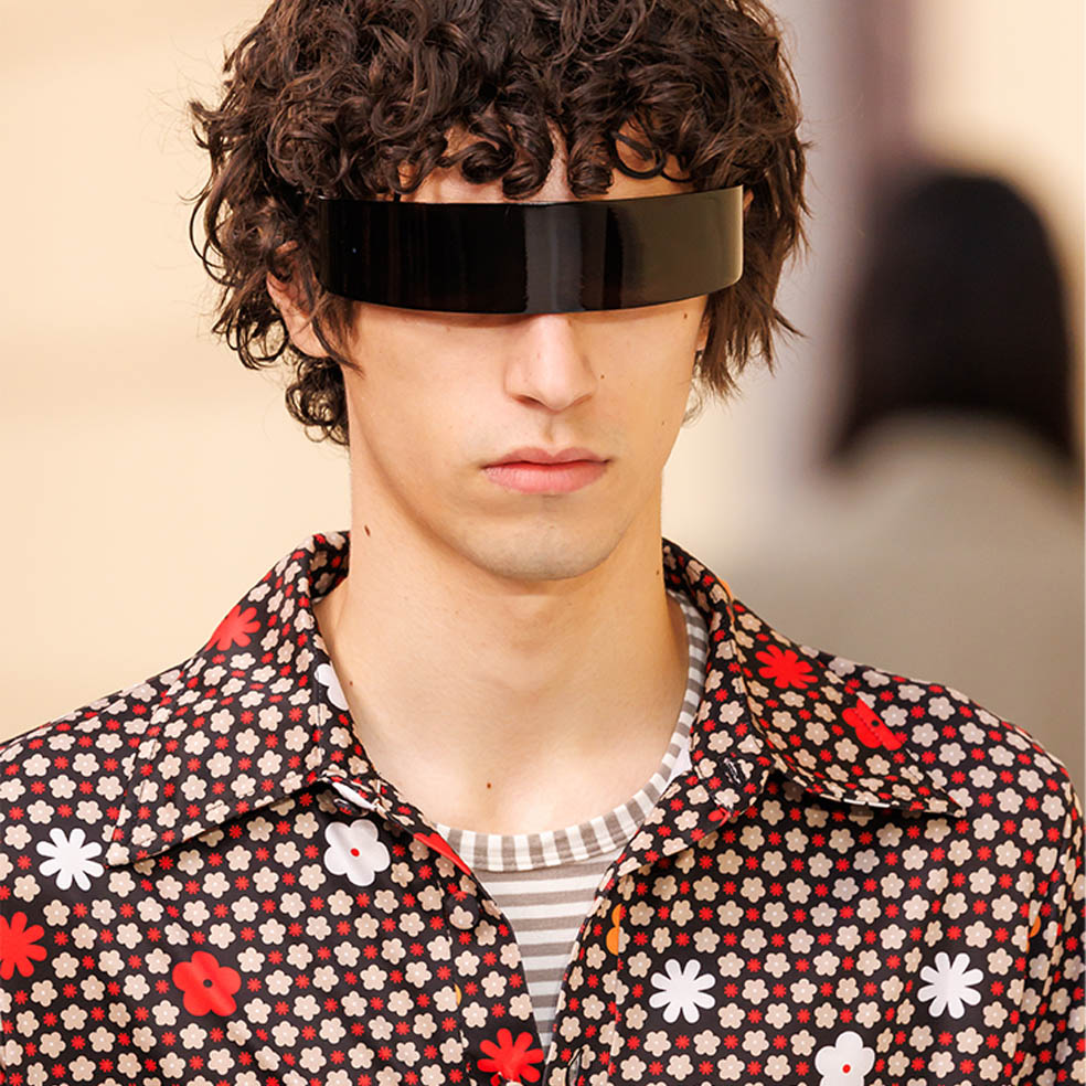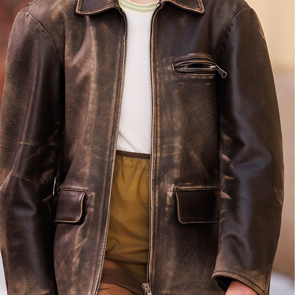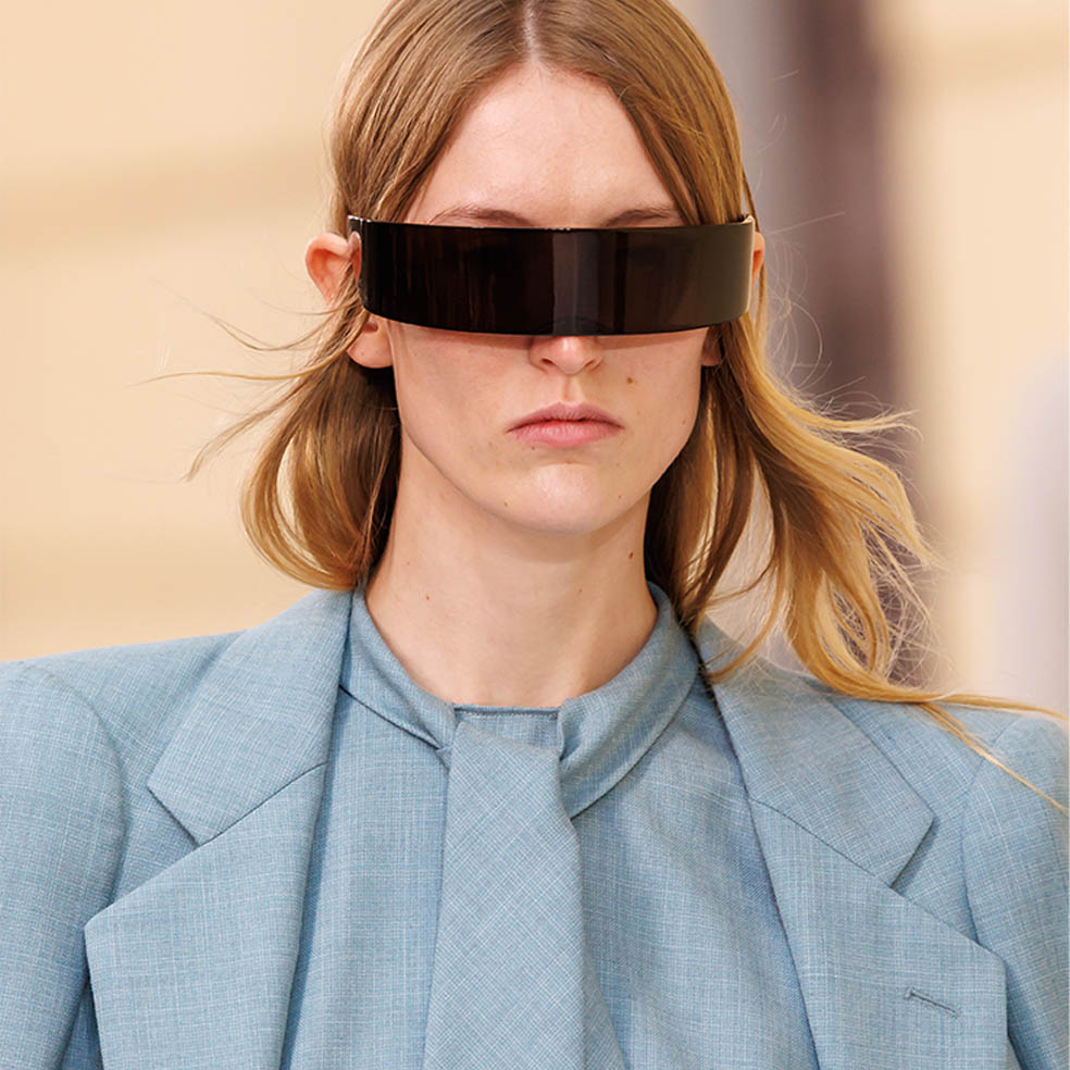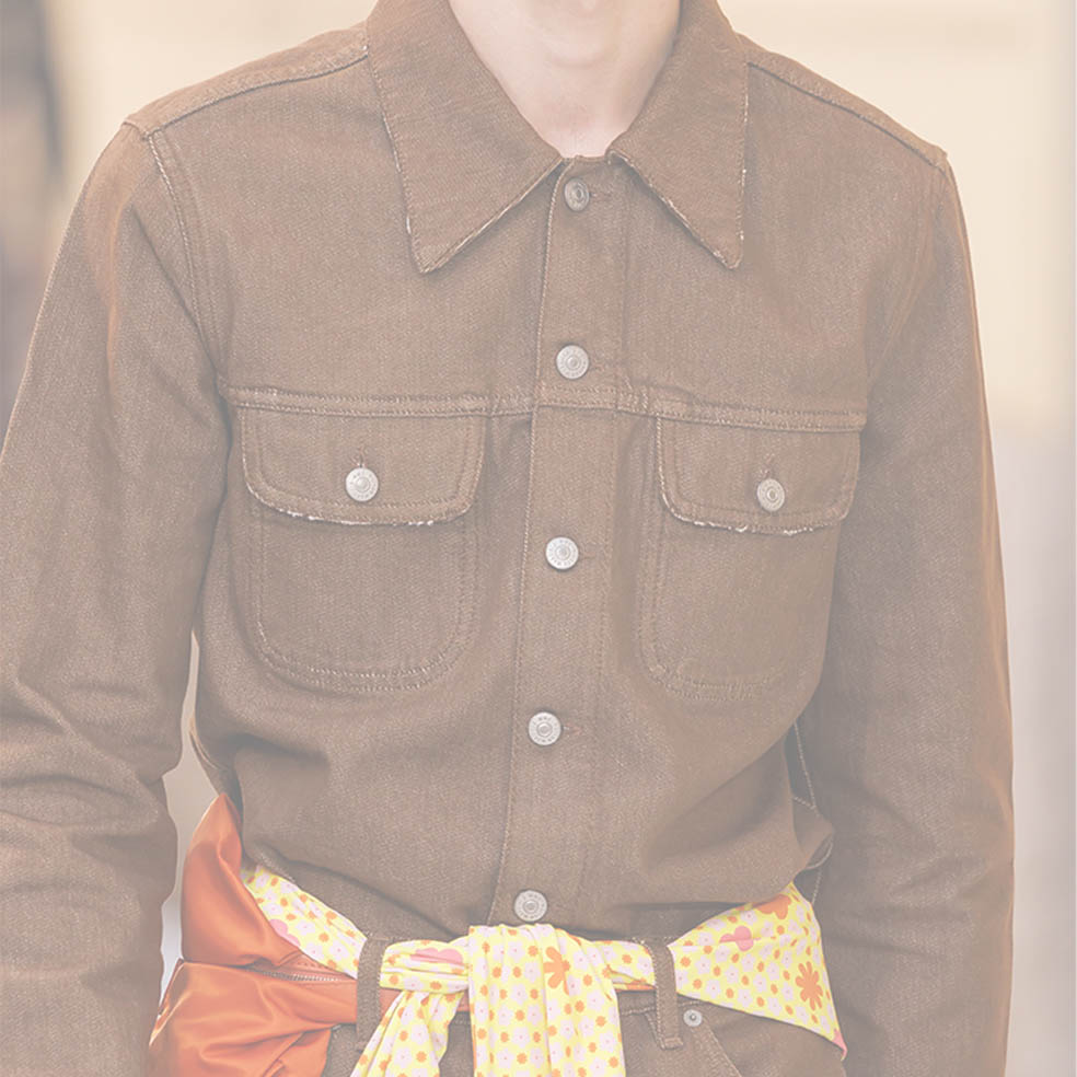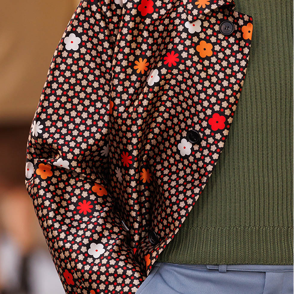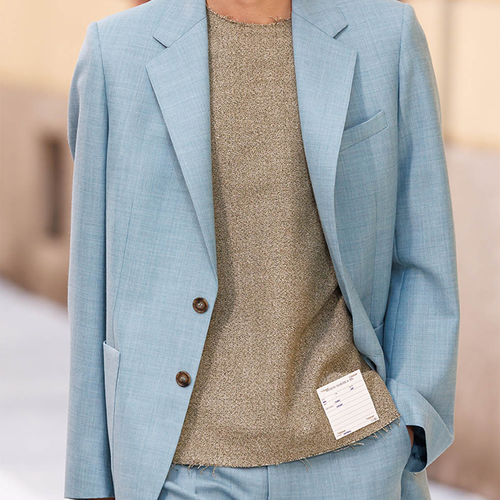 The Collection: Rewriting the Everyday — The SS26 lineup was a masterclass in transforming wardrobe staples into objects of desire, balancing streamlined silhouettes with off-kilter details that winked at the house’s deconstructivist roots. The color palette—a “panoply of post-it colors”—mixed thrift-inspired neutrals (grays, beiges, faded blacks) with electric jolts of acid green, neon blue, and a revived archival geometric floral print in vivid hues. Fabrics ranged from distressed leathers to crisp cottons, with frayed hems and dangling end-of-roll labels adding tactile imperfection. Each piece felt like a conversation between the curated and the chaotic, designed for a wearer who moves effortlessly between the gallery and the grit of the street. Standout looks included garment-bag blousons and capes, their structured yet fluid forms evoking both practicality and surrealism. Tailored trousers masqueraded as denim, while high-waisted jeans embraced relaxed, almost slouchy fits in faded washes or bold prints. Camp-collar shirts and buttoned blousons, often layered with illusionary prints, nodded to a retro sensibility, their covered buttons lending a veneer of “neat” appropriateness. Pantsuits were scrambled with mismatched fabrics, and shift dresses, crafted from garment-bag motifs, swayed with frayed edges that danced in the Milan breeze. Accessories leaned into the playful: satin fanny packs slung low, kitten-heel loafers reimagined as mules, and the house’s signature censor-bar sunglasses, a subtle nod to Margiela’s ironic legacy.