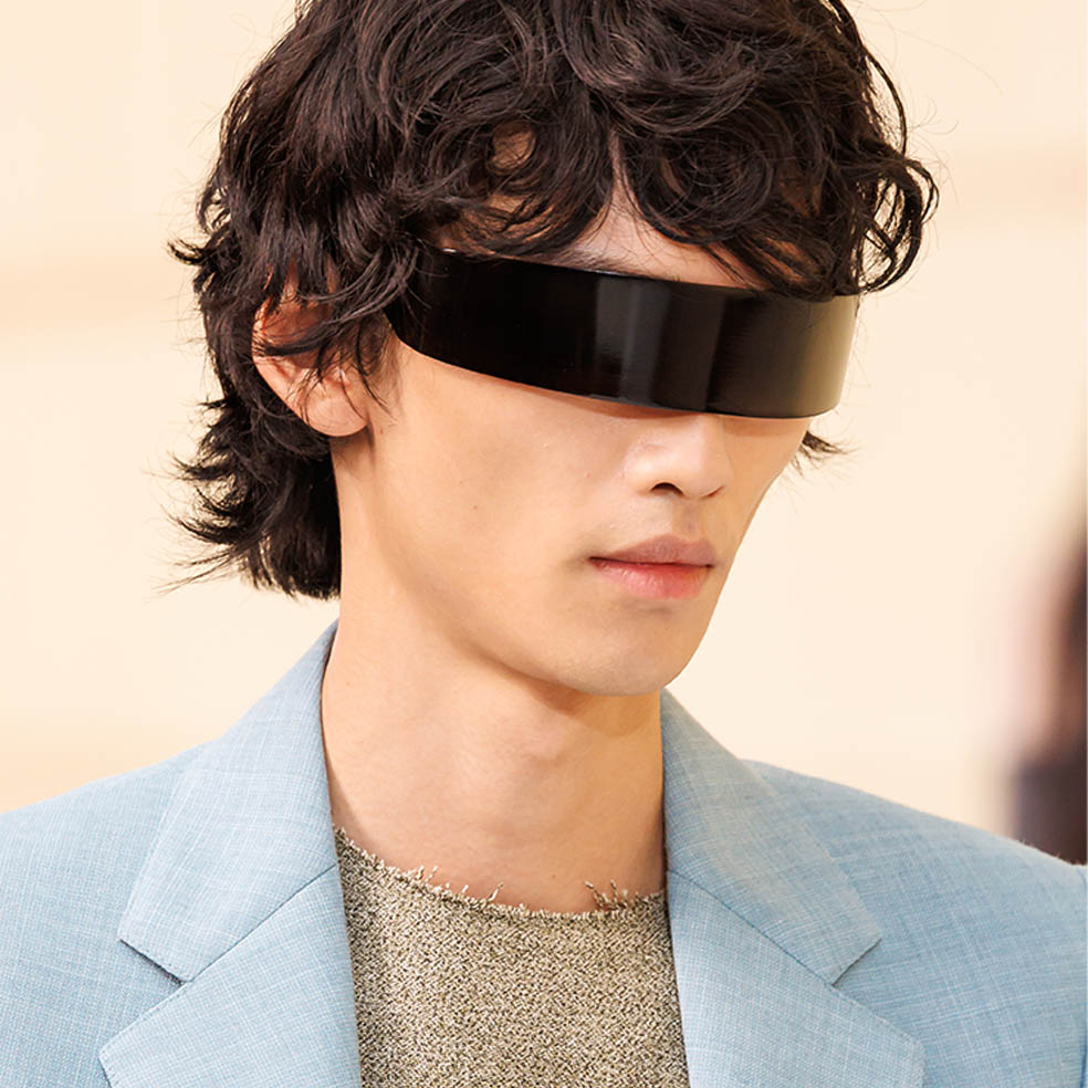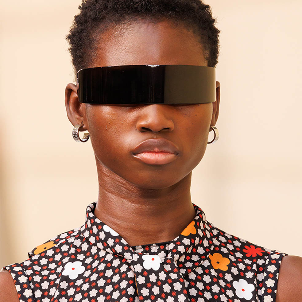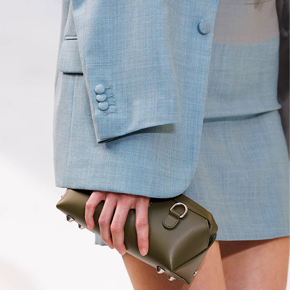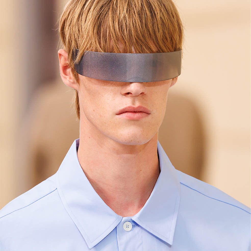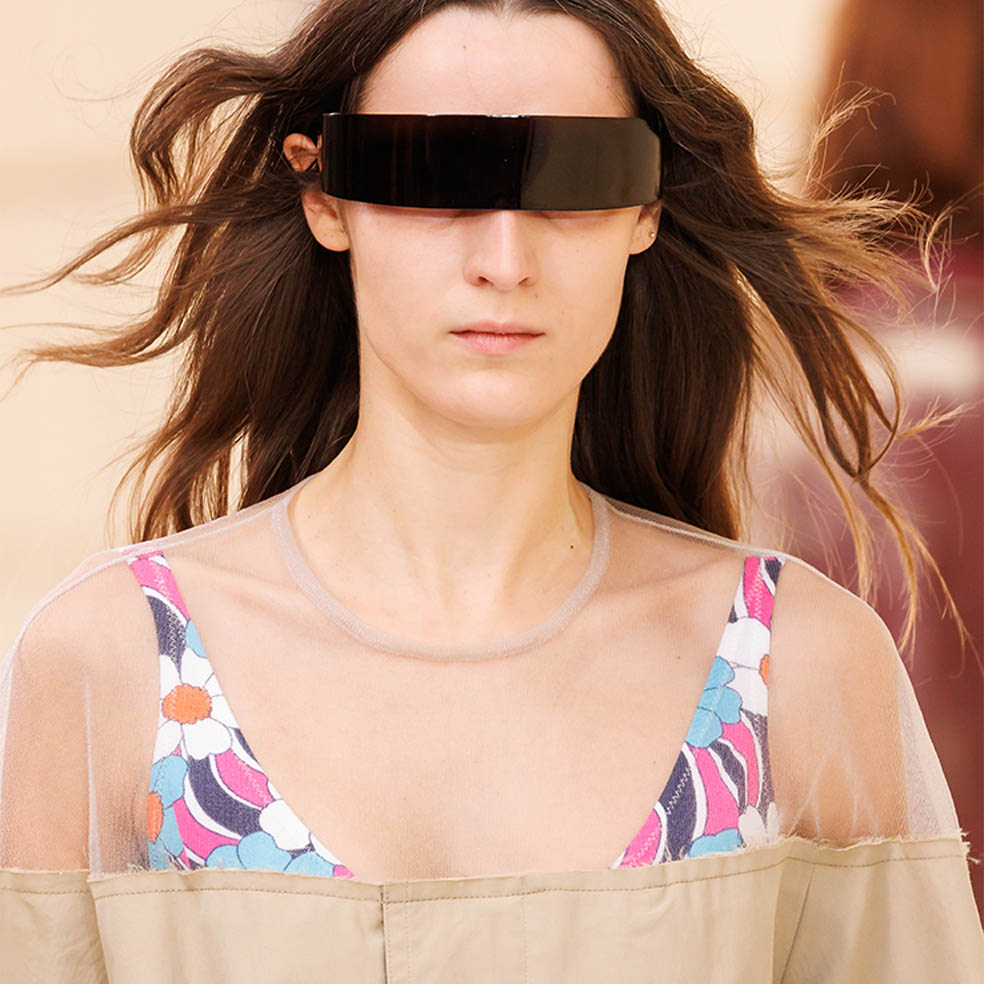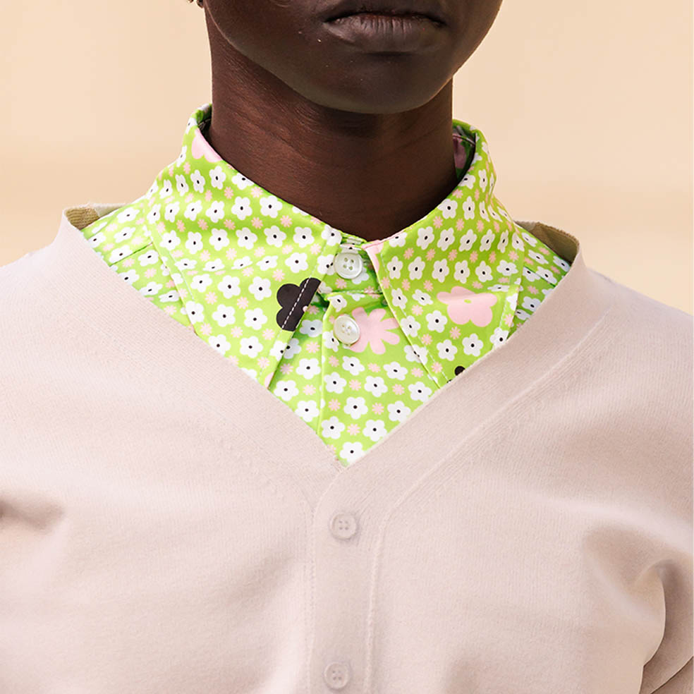 The Collection: Rewriting the Everyday — The SS26 lineup was a masterclass in transforming wardrobe staples into objects of desire, balancing streamlined silhouettes with off-kilter details that winked at the house’s deconstructivist roots. The color palette—a “panoply of post-it colors”—mixed thrift-inspired neutrals (grays, beiges, faded blacks) with electric jolts of acid green, neon blue, and a revived archival geometric floral print in vivid hues. Fabrics ranged from distressed leathers to crisp cottons, with frayed hems and dangling end-of-roll labels adding tactile imperfection. Each piece felt like a conversation between the curated and the chaotic, designed for a wearer who moves effortlessly between the gallery and the grit of the street. Standout looks included garment-bag blousons and capes, their structured yet fluid forms evoking both practicality and surrealism. Tailored trousers masqueraded as denim, while high-waisted jeans embraced relaxed, almost slouchy fits in faded washes or bold prints. Camp-collar shirts and buttoned blousons, often layered with illusionary prints, nodded to a retro sensibility, their covered buttons lending a veneer of “neat” appropriateness. Pantsuits were scrambled with mismatched fabrics, and shift dresses, crafted from garment-bag motifs, swayed with frayed edges that danced in the Milan breeze. Accessories leaned into the playful: satin fanny packs slung low, kitten-heel loafers reimagined as mules, and the house’s signature censor-bar sunglasses, a subtle nod to Margiela’s ironic legacy.