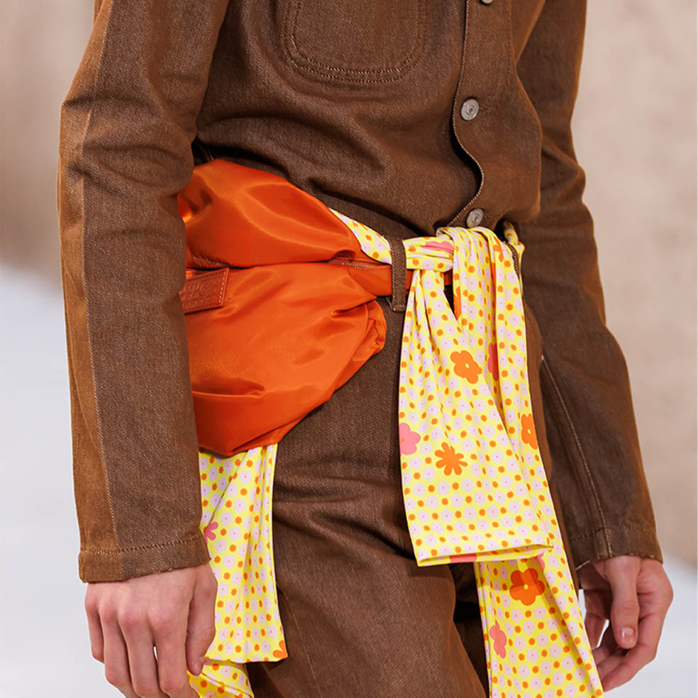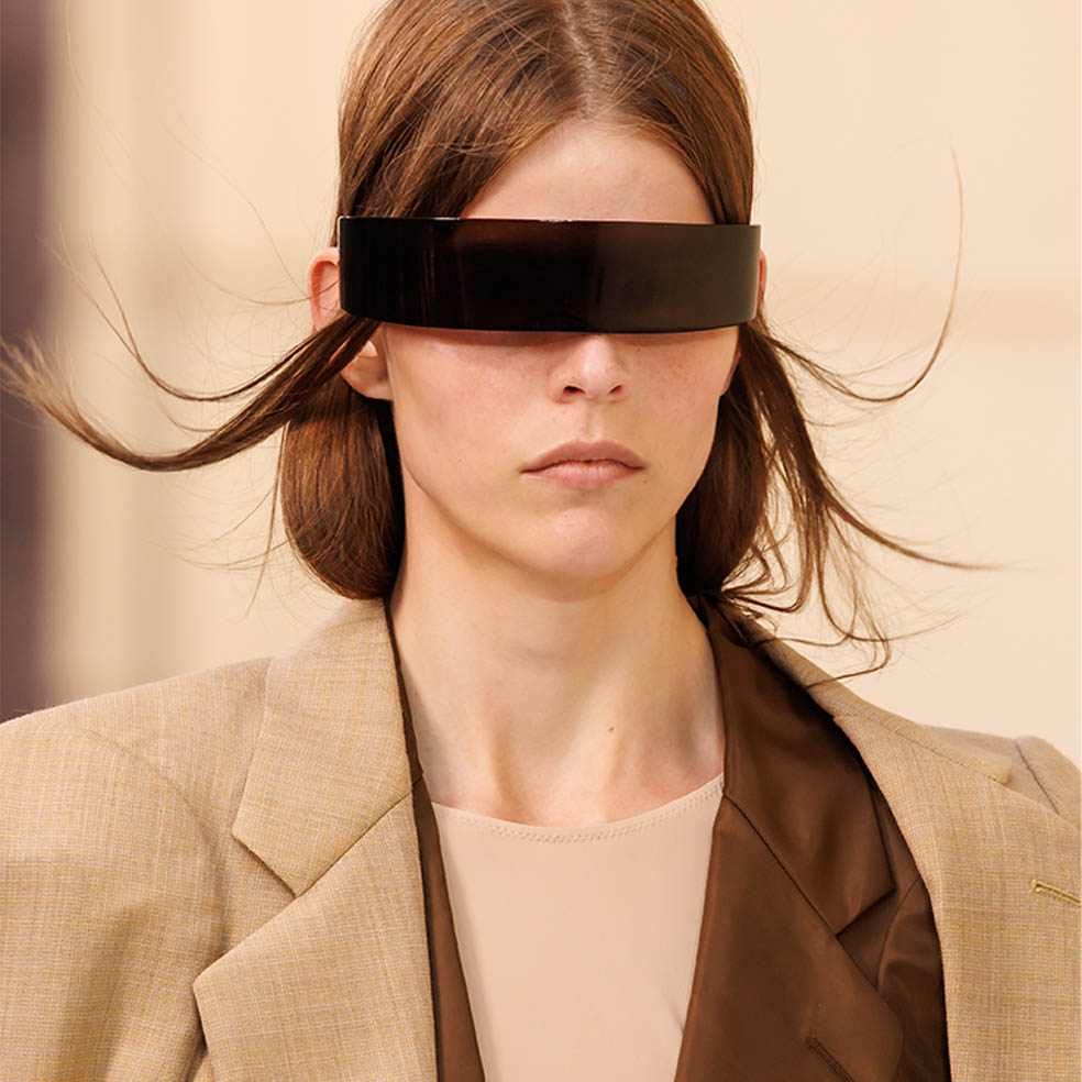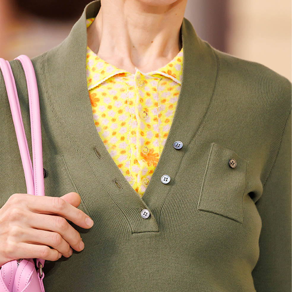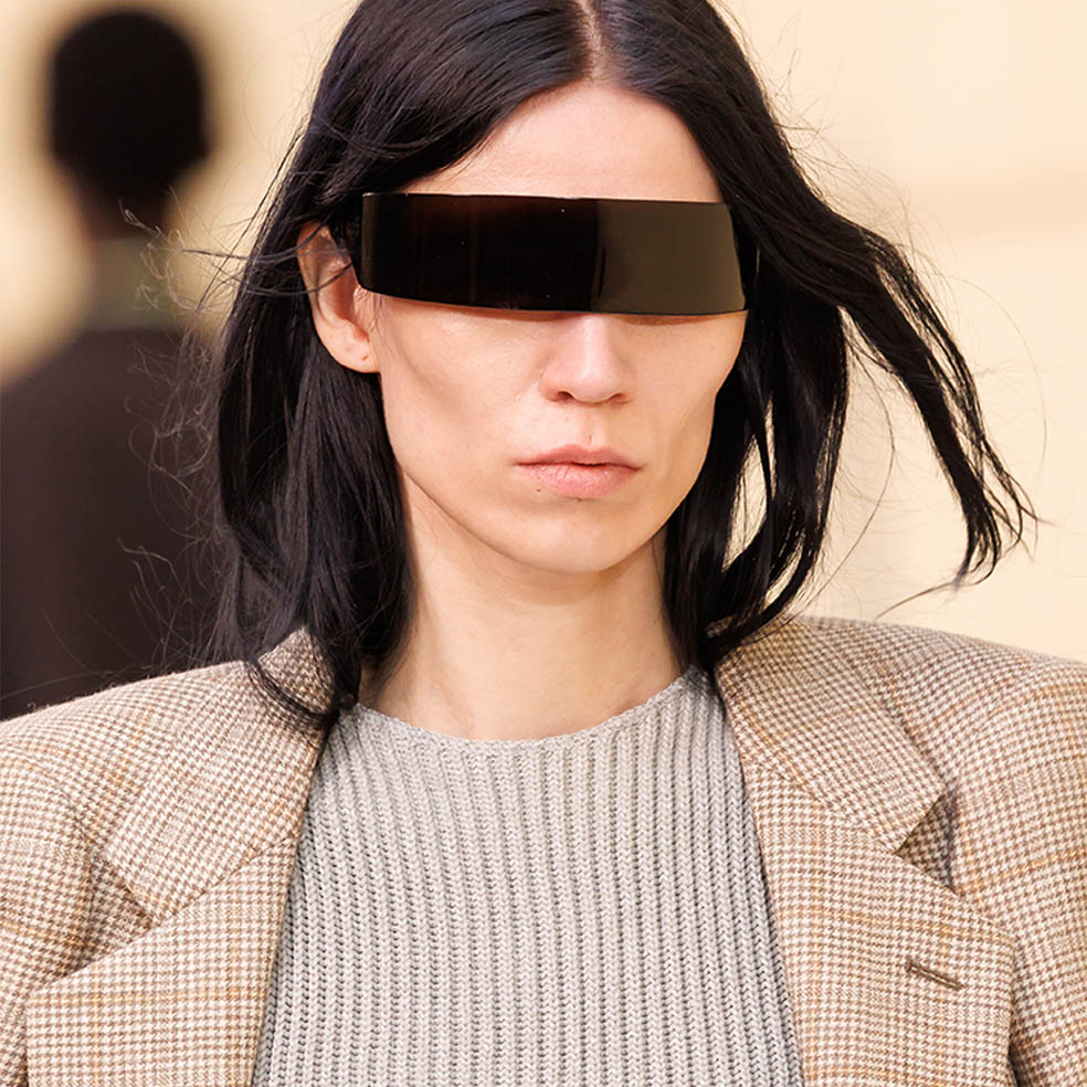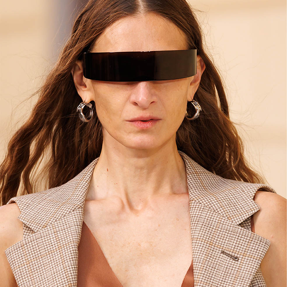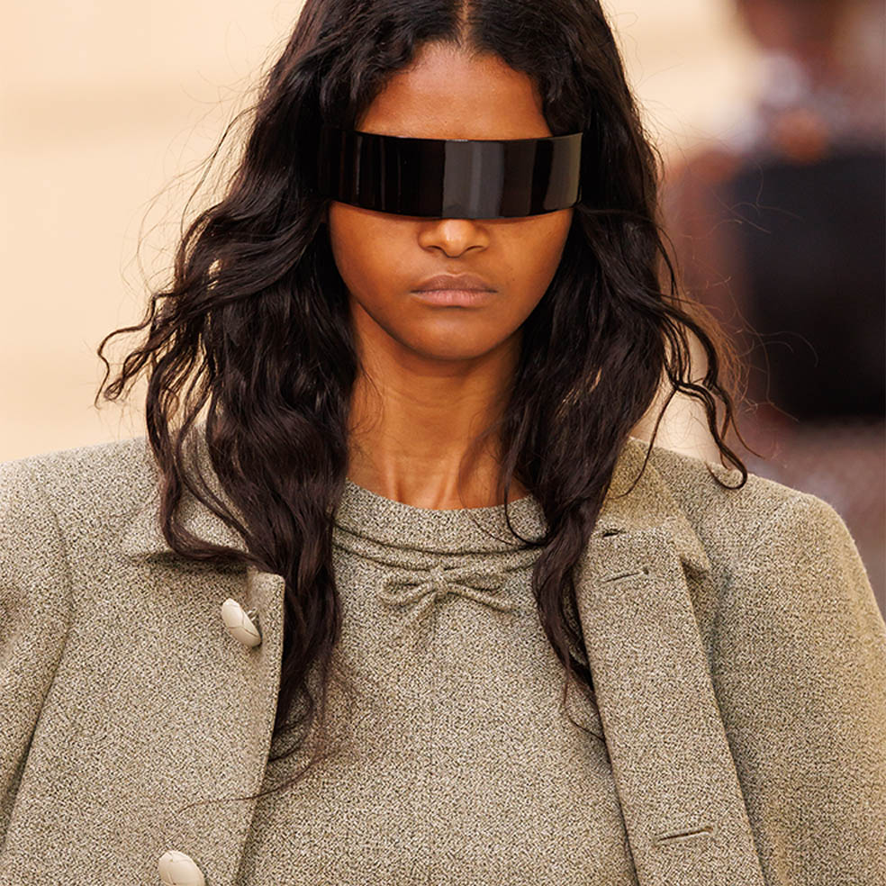 The Collection: Rewriting the Everyday — The SS26 lineup was a masterclass in transforming wardrobe staples into objects of desire, balancing streamlined silhouettes with off-kilter details that winked at the house’s deconstructivist roots. The color palette—a “panoply of post-it colors”—mixed thrift-inspired neutrals (grays, beiges, faded blacks) with electric jolts of acid green, neon blue, and a revived archival geometric floral print in vivid hues. Fabrics ranged from distressed leathers to crisp cottons, with frayed hems and dangling end-of-roll labels adding tactile imperfection. Each piece felt like a conversation between the curated and the chaotic, designed for a wearer who moves effortlessly between the gallery and the grit of the street. Standout looks included garment-bag blousons and capes, their structured yet fluid forms evoking both practicality and surrealism. Tailored trousers masqueraded as denim, while high-waisted jeans embraced relaxed, almost slouchy fits in faded washes or bold prints. Camp-collar shirts and buttoned blousons, often layered with illusionary prints, nodded to a retro sensibility, their covered buttons lending a veneer of “neat” appropriateness. Pantsuits were scrambled with mismatched fabrics, and shift dresses, crafted from garment-bag motifs, swayed with frayed edges that danced in the Milan breeze. Accessories leaned into the playful: satin fanny packs slung low, kitten-heel loafers reimagined as mules, and the house’s signature censor-bar sunglasses, a subtle nod to Margiela’s ironic legacy.
