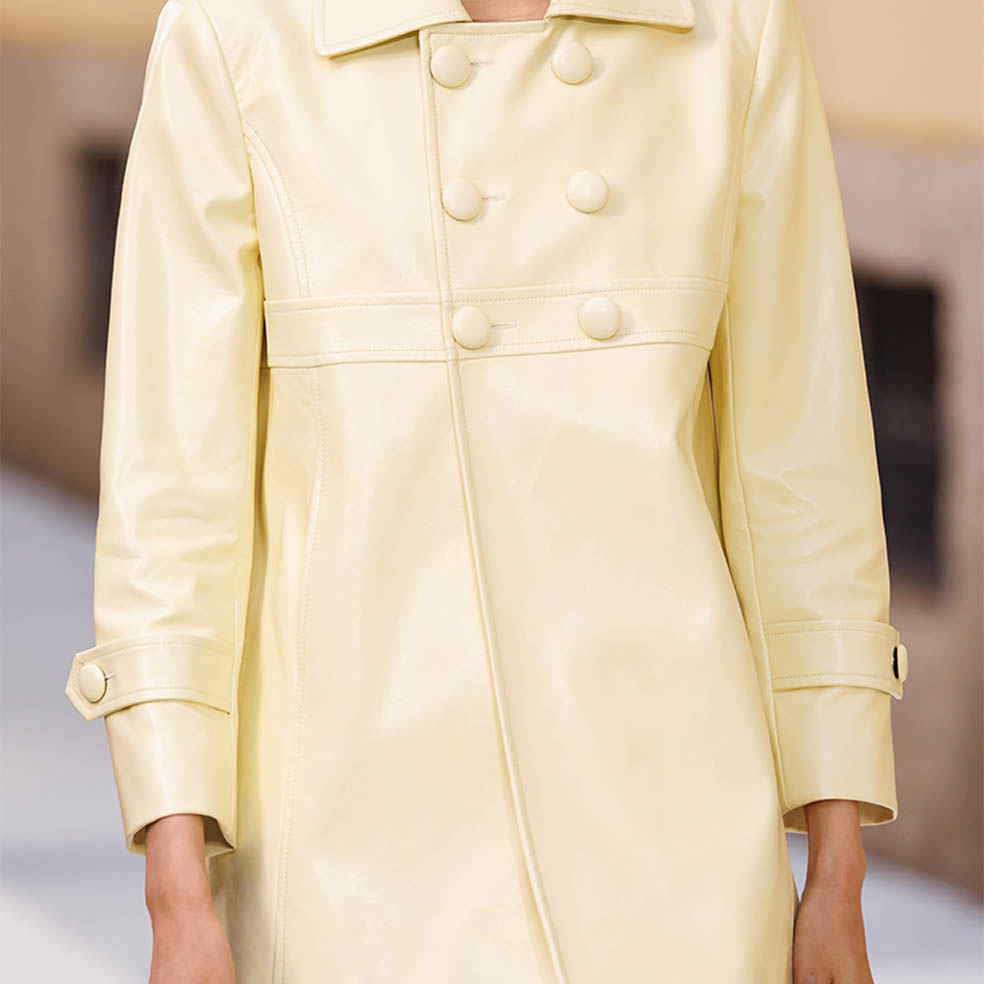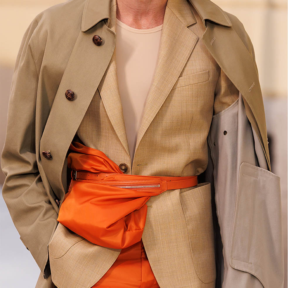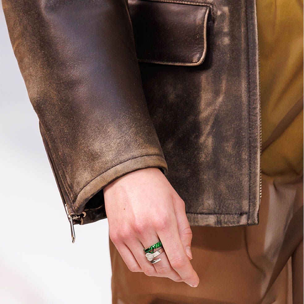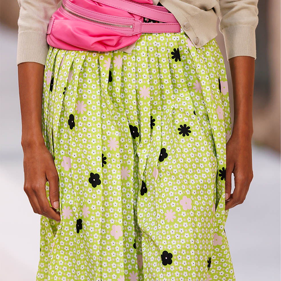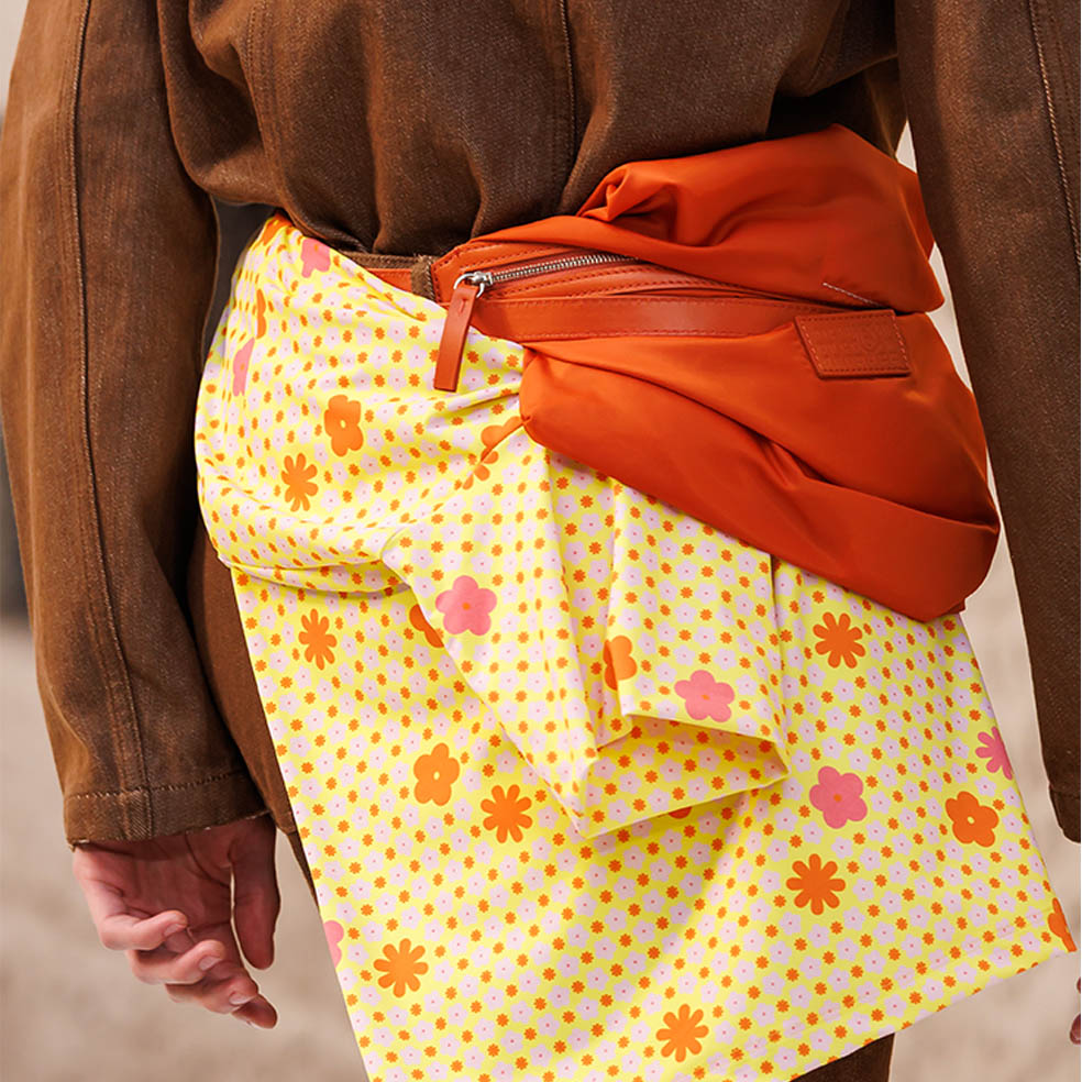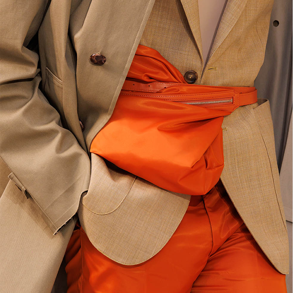 The Collection: Rewriting the Everyday — The SS26 lineup was a masterclass in transforming wardrobe staples into objects of desire, balancing streamlined silhouettes with off-kilter details that winked at the house’s deconstructivist roots. The color palette—a “panoply of post-it colors”—mixed thrift-inspired neutrals (grays, beiges, faded blacks) with electric jolts of acid green, neon blue, and a revived archival geometric floral print in vivid hues. Fabrics ranged from distressed leathers to crisp cottons, with frayed hems and dangling end-of-roll labels adding tactile imperfection. Each piece felt like a conversation between the curated and the chaotic, designed for a wearer who moves effortlessly between the gallery and the grit of the street. Standout looks included garment-bag blousons and capes, their structured yet fluid forms evoking both practicality and surrealism. Tailored trousers masqueraded as denim, while high-waisted jeans embraced relaxed, almost slouchy fits in faded washes or bold prints. Camp-collar shirts and buttoned blousons, often layered with illusionary prints, nodded to a retro sensibility, their covered buttons lending a veneer of “neat” appropriateness. Pantsuits were scrambled with mismatched fabrics, and shift dresses, crafted from garment-bag motifs, swayed with frayed edges that danced in the Milan breeze. Accessories leaned into the playful: satin fanny packs slung low, kitten-heel loafers reimagined as mules, and the house’s signature censor-bar sunglasses, a subtle nod to Margiela’s ironic legacy.