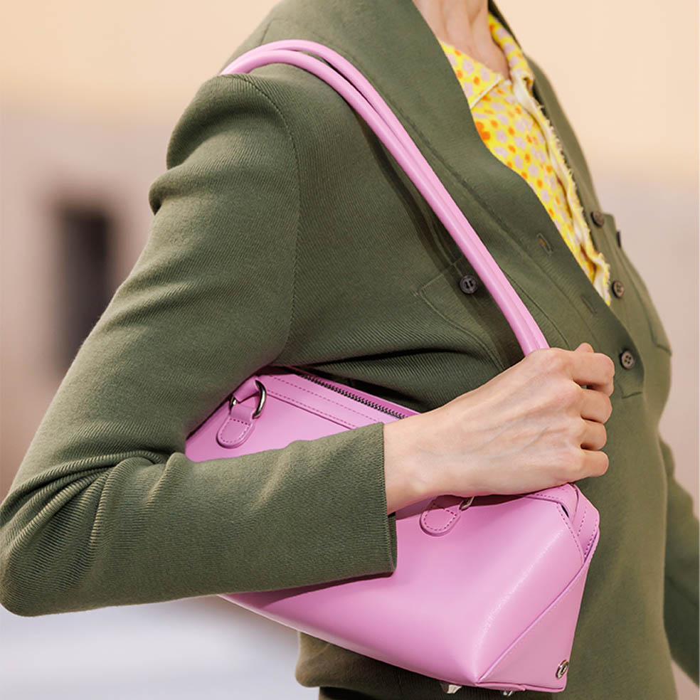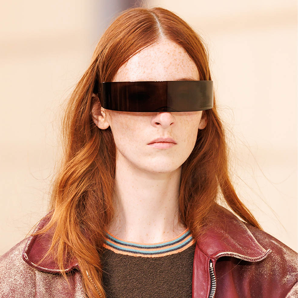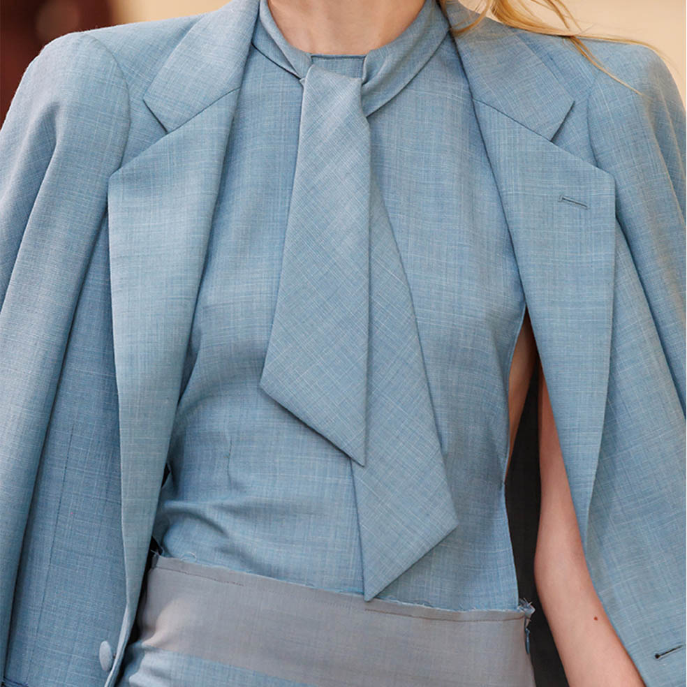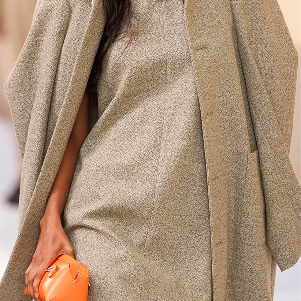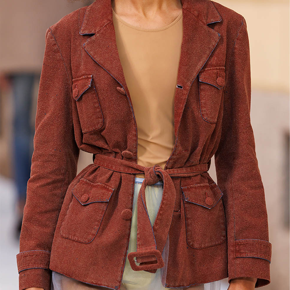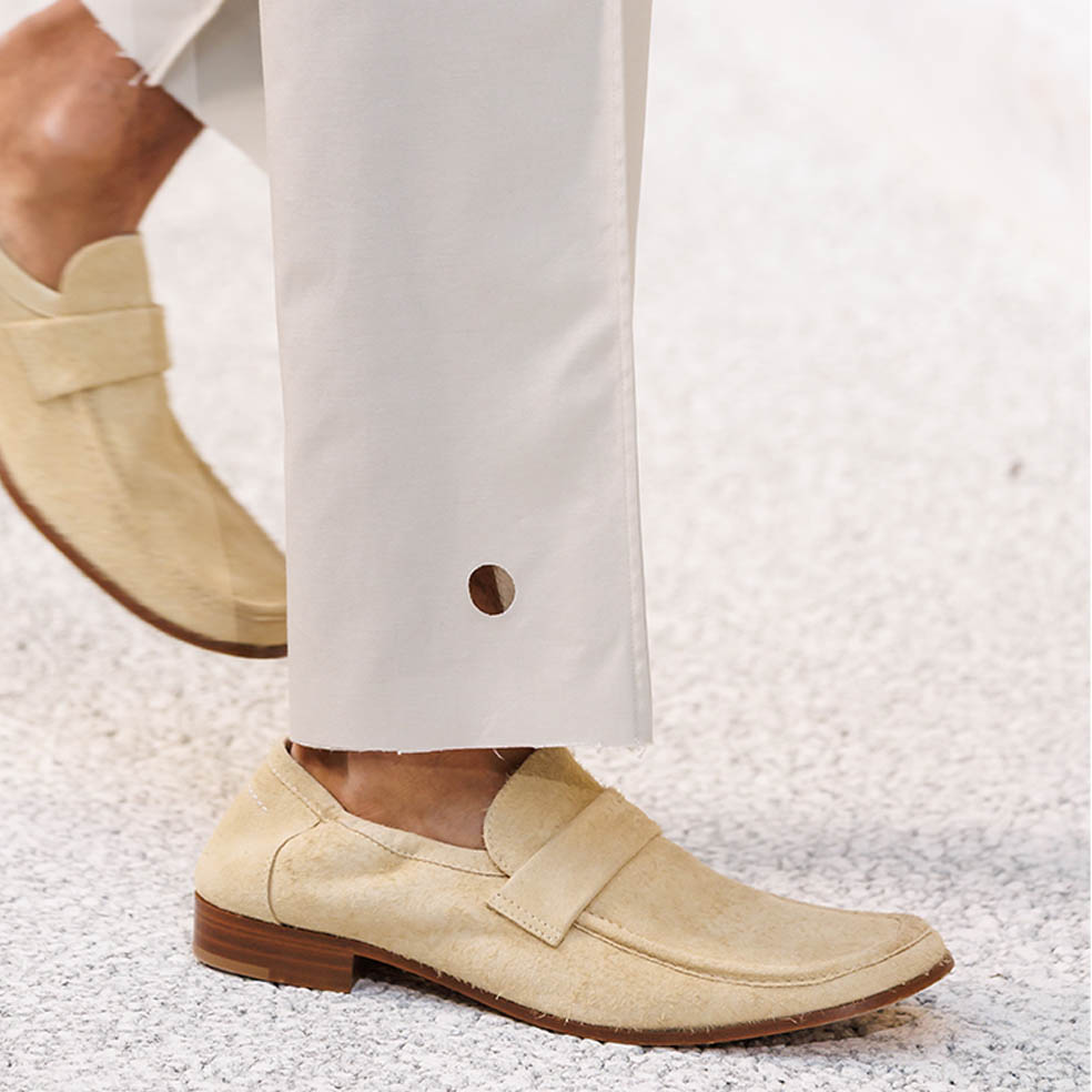 The Collection: Rewriting the Everyday — The SS26 lineup was a masterclass in transforming wardrobe staples into objects of desire, balancing streamlined silhouettes with off-kilter details that winked at the house’s deconstructivist roots. The color palette—a “panoply of post-it colors”—mixed thrift-inspired neutrals (grays, beiges, faded blacks) with electric jolts of acid green, neon blue, and a revived archival geometric floral print in vivid hues. Fabrics ranged from distressed leathers to crisp cottons, with frayed hems and dangling end-of-roll labels adding tactile imperfection. Each piece felt like a conversation between the curated and the chaotic, designed for a wearer who moves effortlessly between the gallery and the grit of the street. Standout looks included garment-bag blousons and capes, their structured yet fluid forms evoking both practicality and surrealism. Tailored trousers masqueraded as denim, while high-waisted jeans embraced relaxed, almost slouchy fits in faded washes or bold prints. Camp-collar shirts and buttoned blousons, often layered with illusionary prints, nodded to a retro sensibility, their covered buttons lending a veneer of “neat” appropriateness. Pantsuits were scrambled with mismatched fabrics, and shift dresses, crafted from garment-bag motifs, swayed with frayed edges that danced in the Milan breeze. Accessories leaned into the playful: satin fanny packs slung low, kitten-heel loafers reimagined as mules, and the house’s signature censor-bar sunglasses, a subtle nod to Margiela’s ironic legacy.