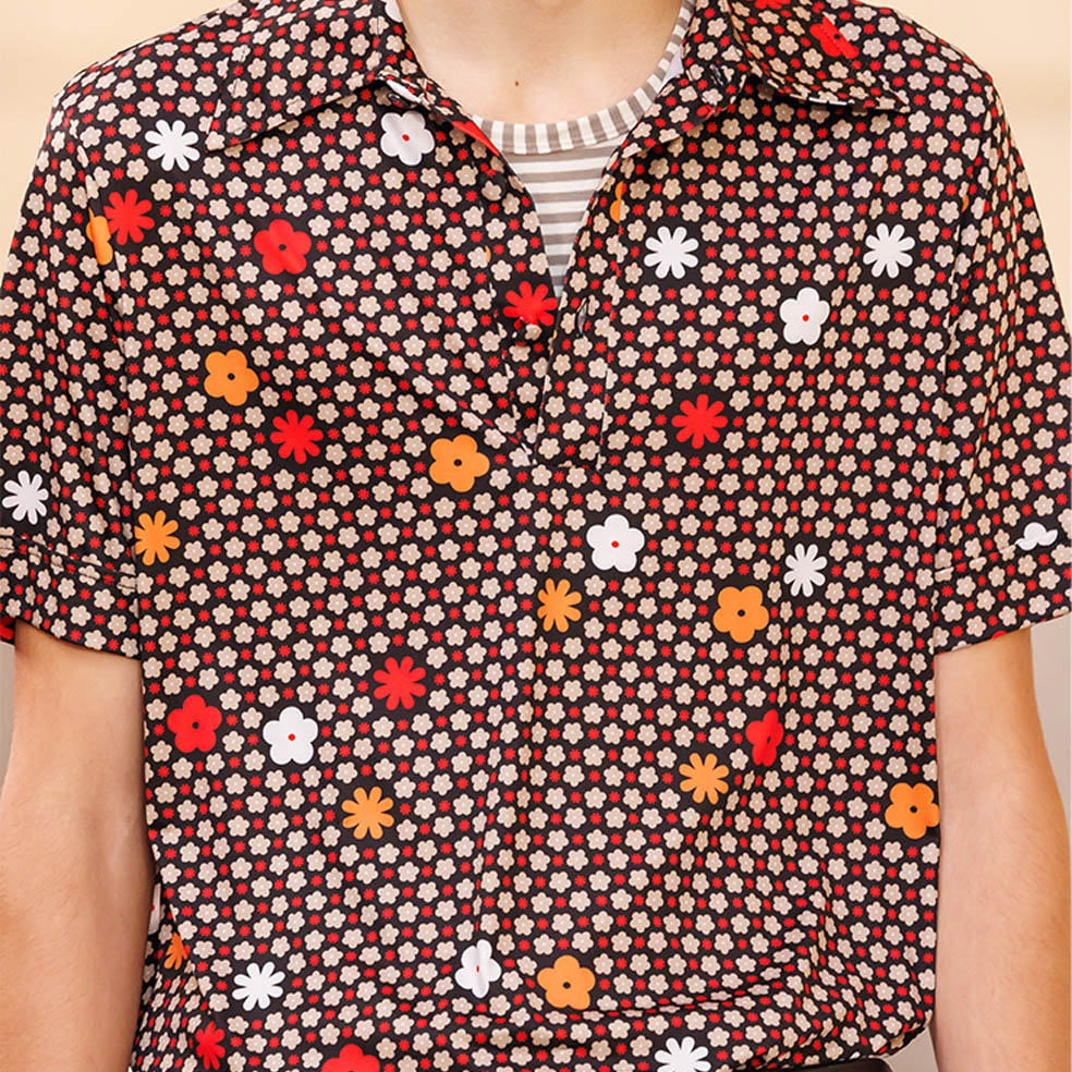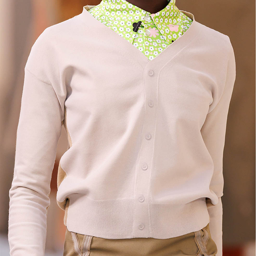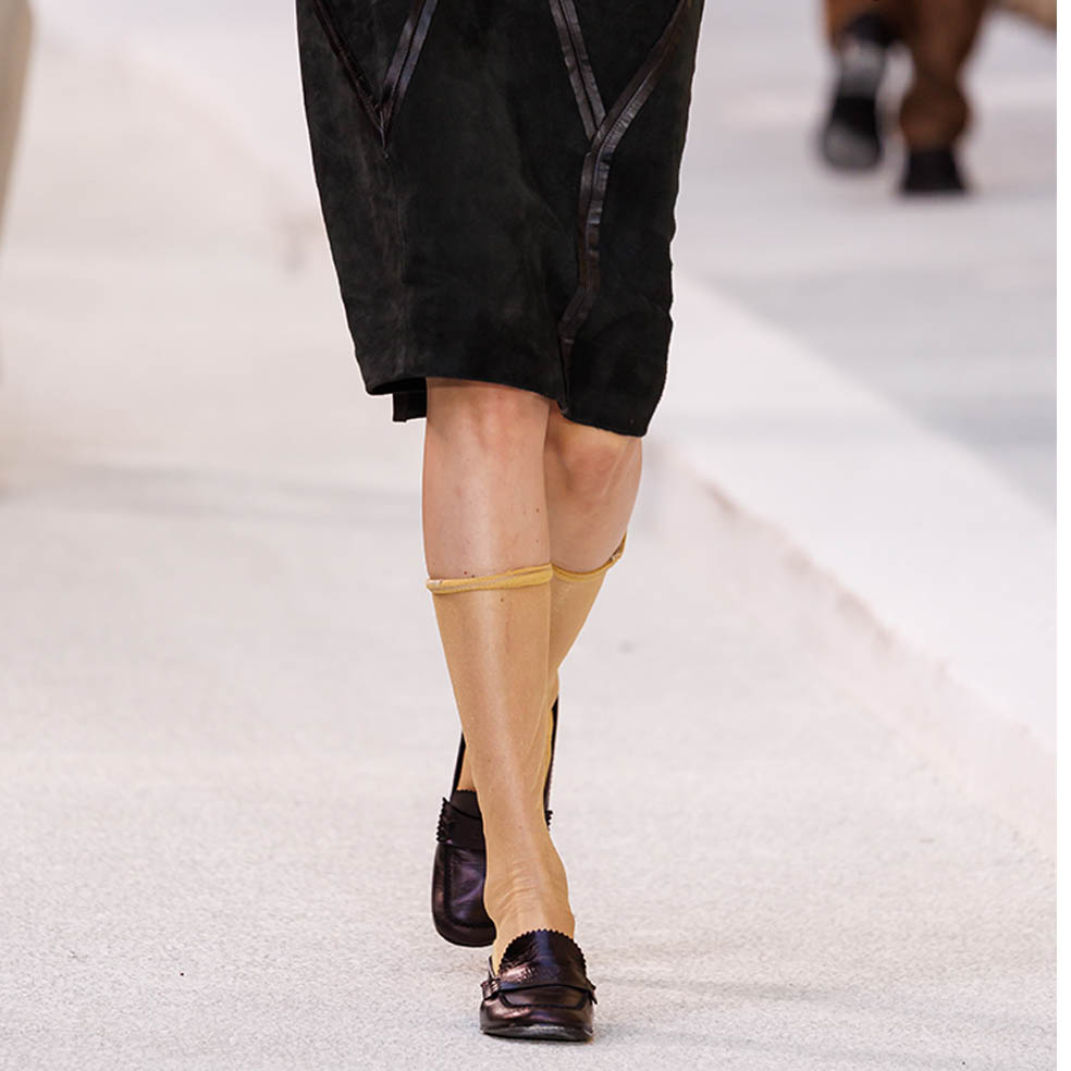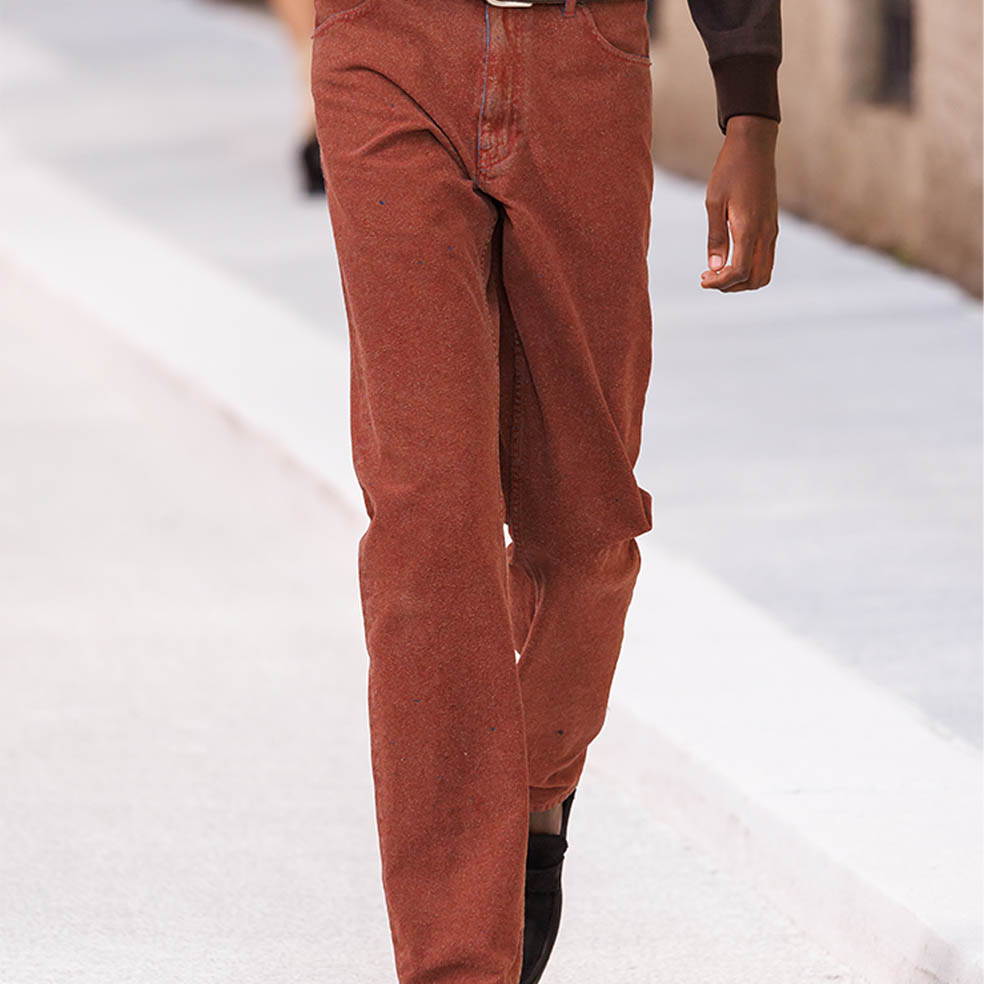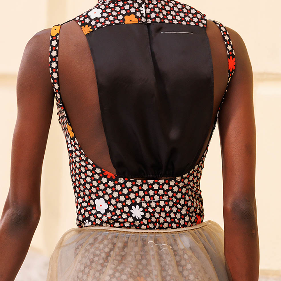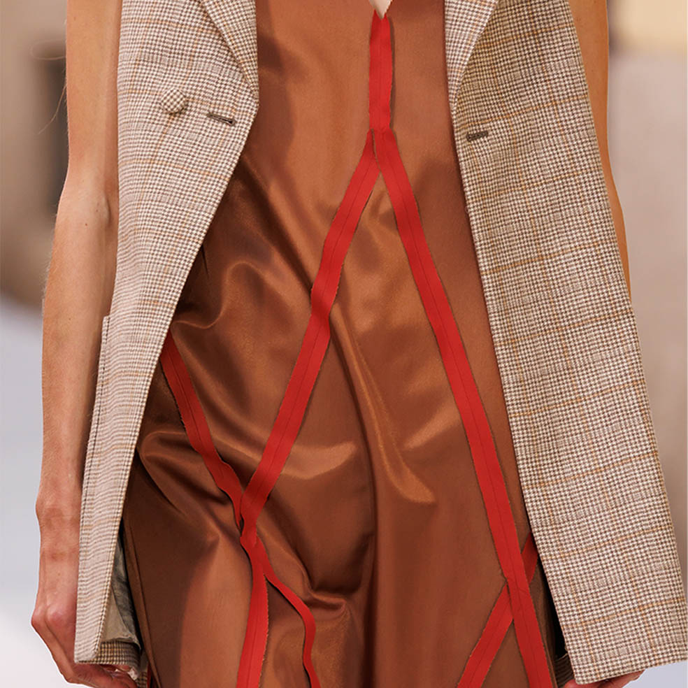 The Collection: Rewriting the Everyday — The SS26 lineup was a masterclass in transforming wardrobe staples into objects of desire, balancing streamlined silhouettes with off-kilter details that winked at the house’s deconstructivist roots. The color palette—a “panoply of post-it colors”—mixed thrift-inspired neutrals (grays, beiges, faded blacks) with electric jolts of acid green, neon blue, and a revived archival geometric floral print in vivid hues. Fabrics ranged from distressed leathers to crisp cottons, with frayed hems and dangling end-of-roll labels adding tactile imperfection. Each piece felt like a conversation between the curated and the chaotic, designed for a wearer who moves effortlessly between the gallery and the grit of the street. Standout looks included garment-bag blousons and capes, their structured yet fluid forms evoking both practicality and surrealism. Tailored trousers masqueraded as denim, while high-waisted jeans embraced relaxed, almost slouchy fits in faded washes or bold prints. Camp-collar shirts and buttoned blousons, often layered with illusionary prints, nodded to a retro sensibility, their covered buttons lending a veneer of “neat” appropriateness. Pantsuits were scrambled with mismatched fabrics, and shift dresses, crafted from garment-bag motifs, swayed with frayed edges that danced in the Milan breeze. Accessories leaned into the playful: satin fanny packs slung low, kitten-heel loafers reimagined as mules, and the house’s signature censor-bar sunglasses, a subtle nod to Margiela’s ironic legacy.