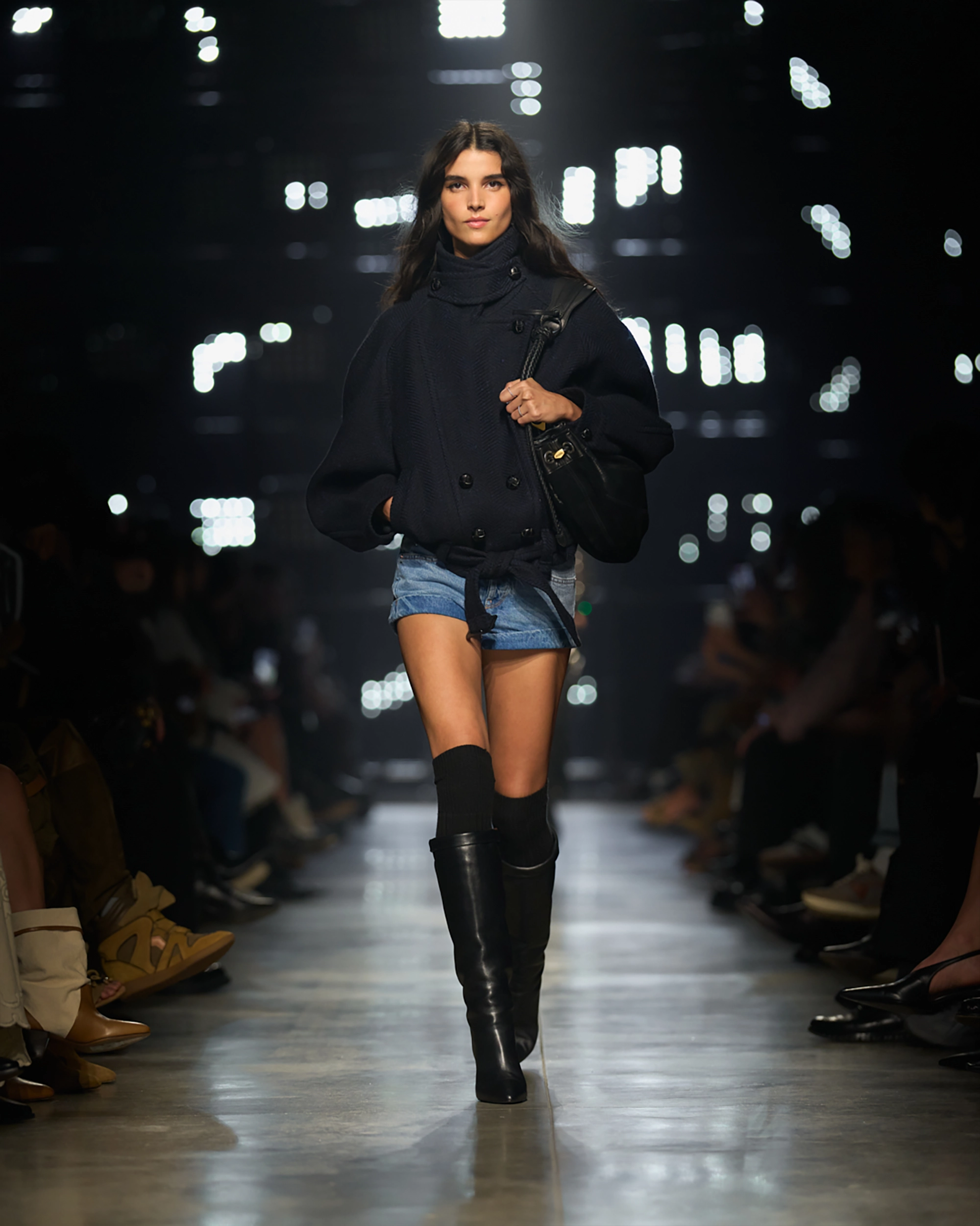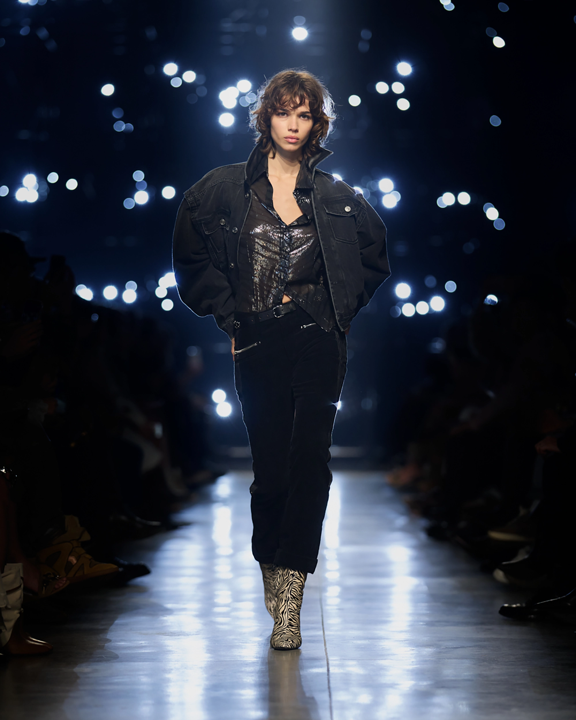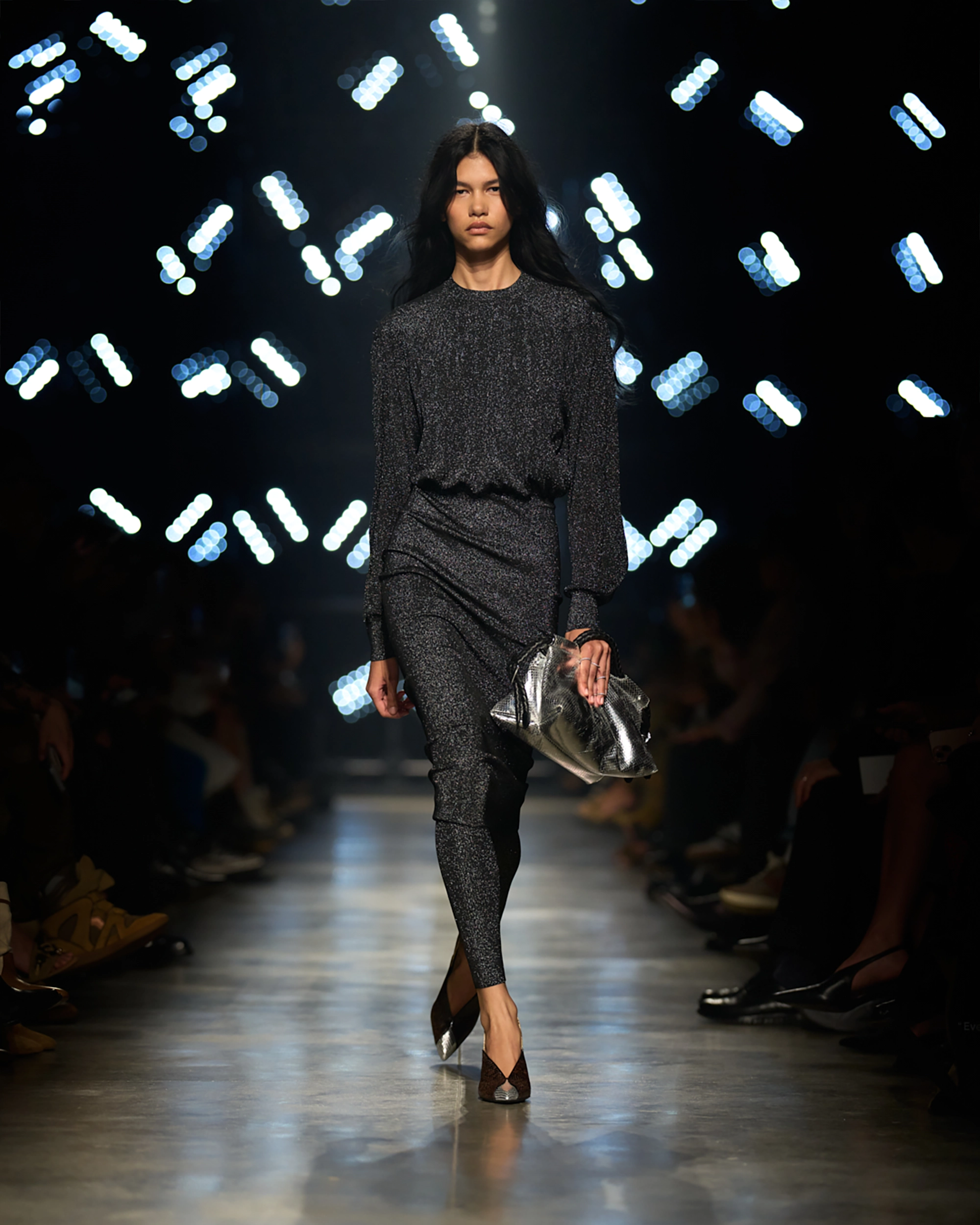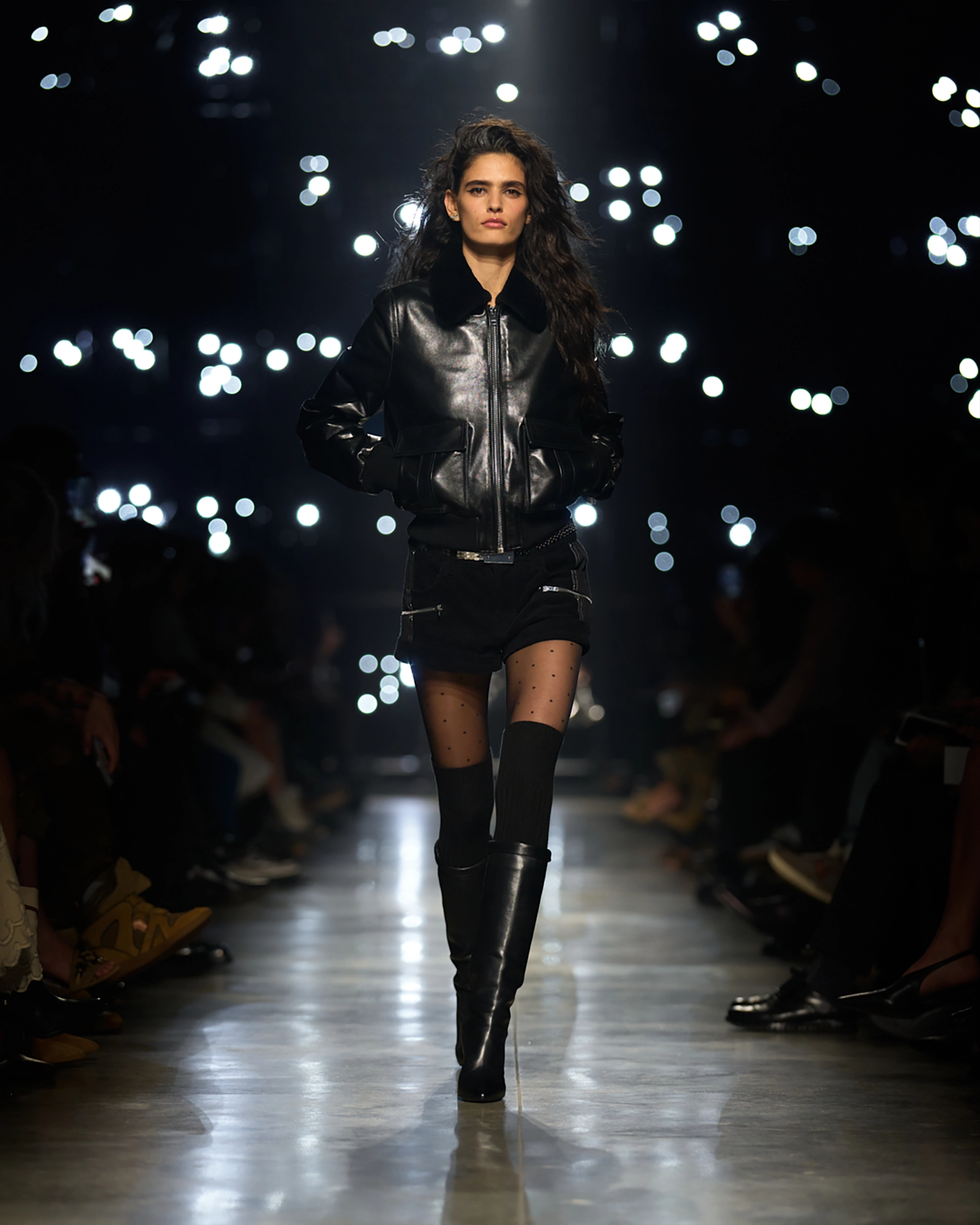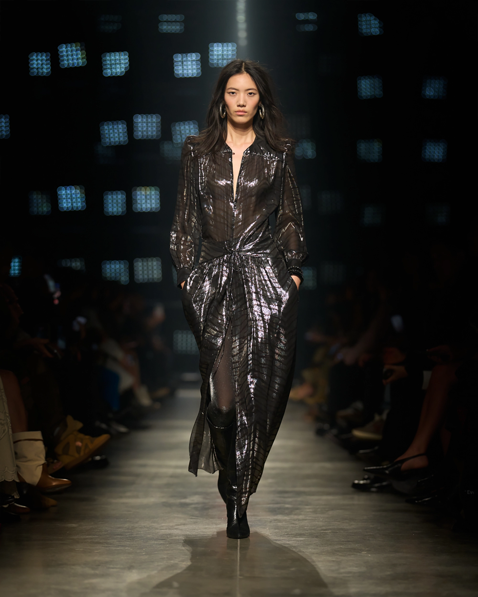 Runway styling reinforced this thematic tension. Long, floating evening dresses were grounded by sculptural leather boots, while thigh-high socks extended the line of the leg beneath cropped outerwear. Metallic surfaces caught intermittent flashes of light, creating moments of visual disruption that mirrored the unpredictability of urban nightlife. The effect was cinematic yet deeply wearable — a hallmark of Marant’s design language.