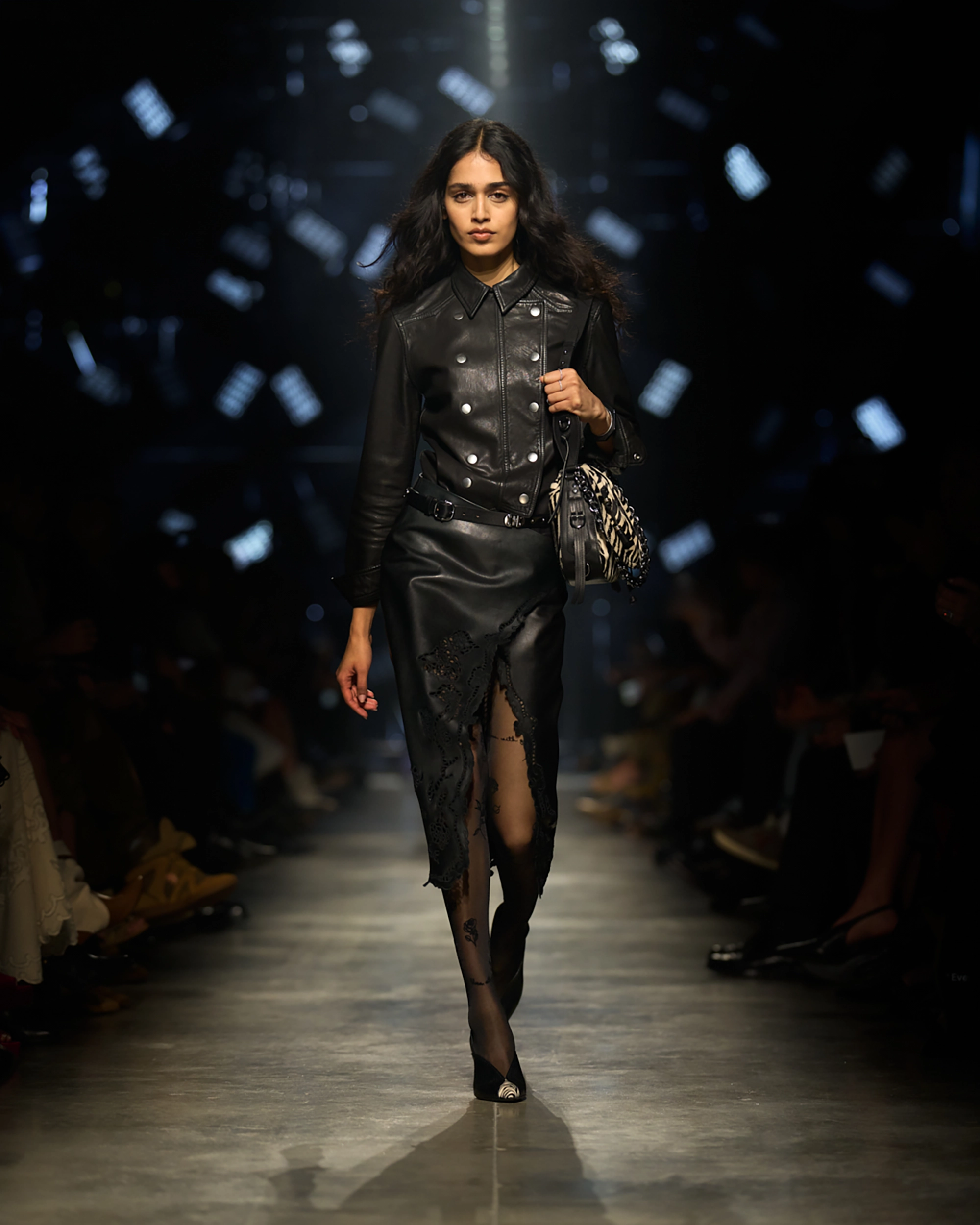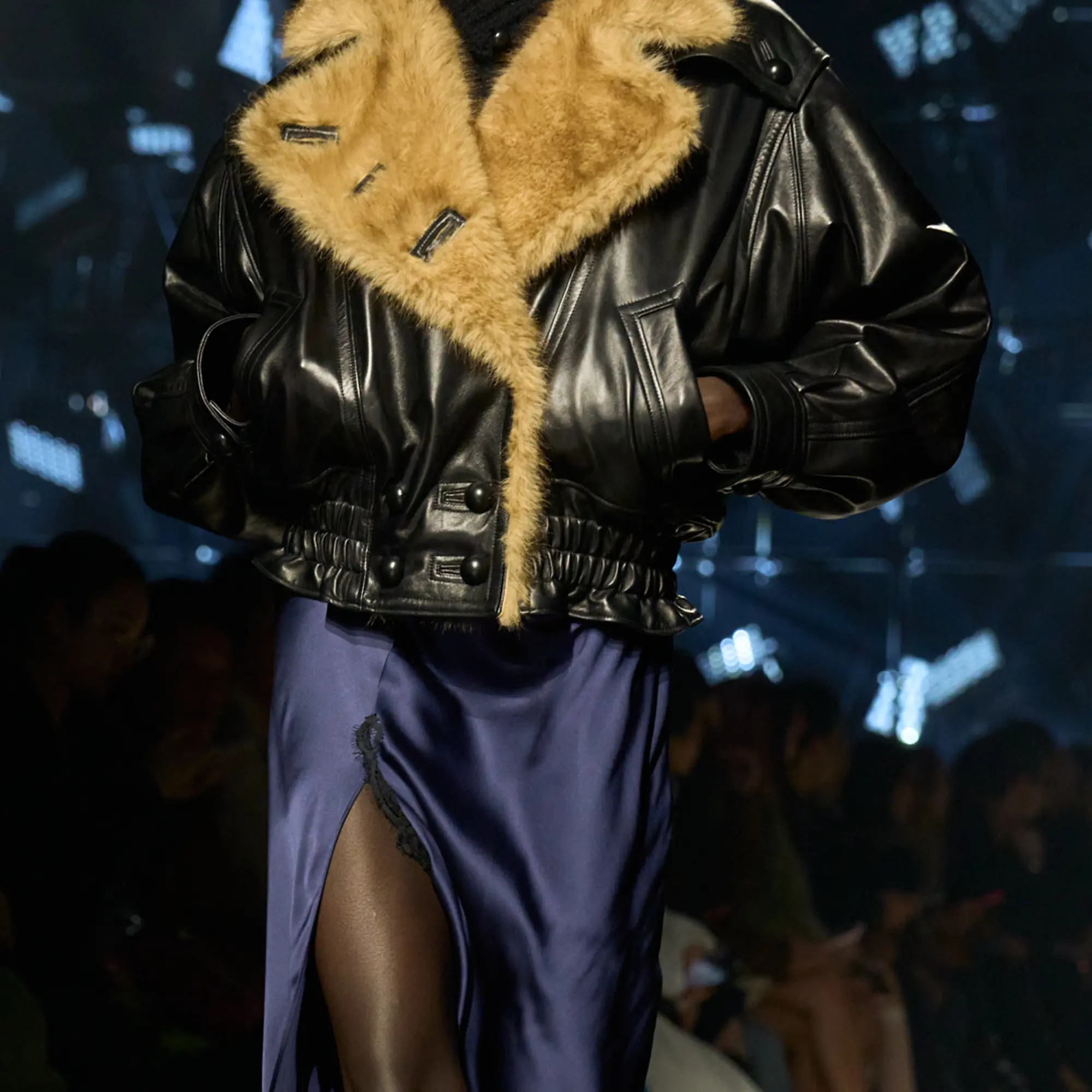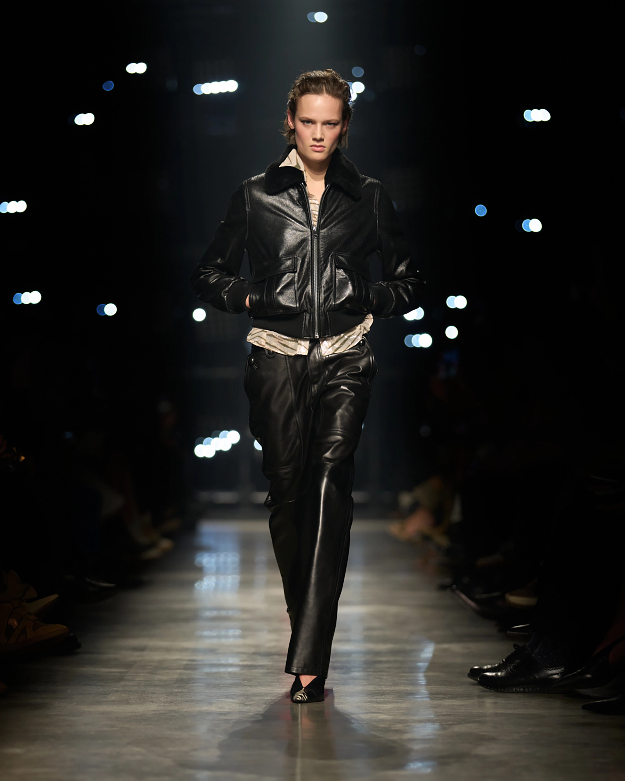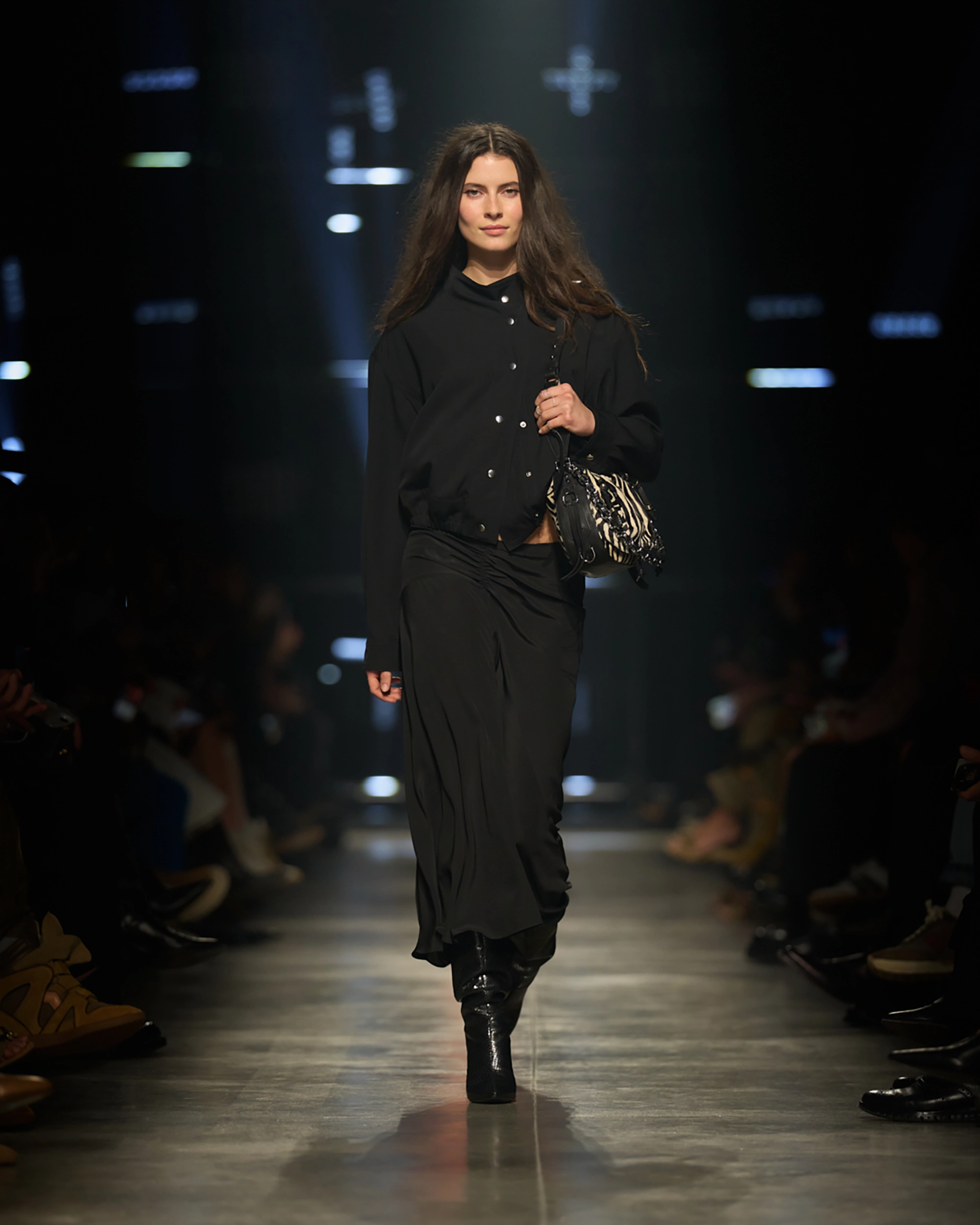 Runway styling reinforced this thematic tension. Long, floating evening dresses were grounded by sculptural leather boots, while thigh-high socks extended the line of the leg beneath cropped outerwear. Metallic surfaces caught intermittent flashes of light, creating moments of visual disruption that mirrored the unpredictability of urban nightlife. The effect was cinematic yet deeply wearable — a hallmark of Marant’s design language.