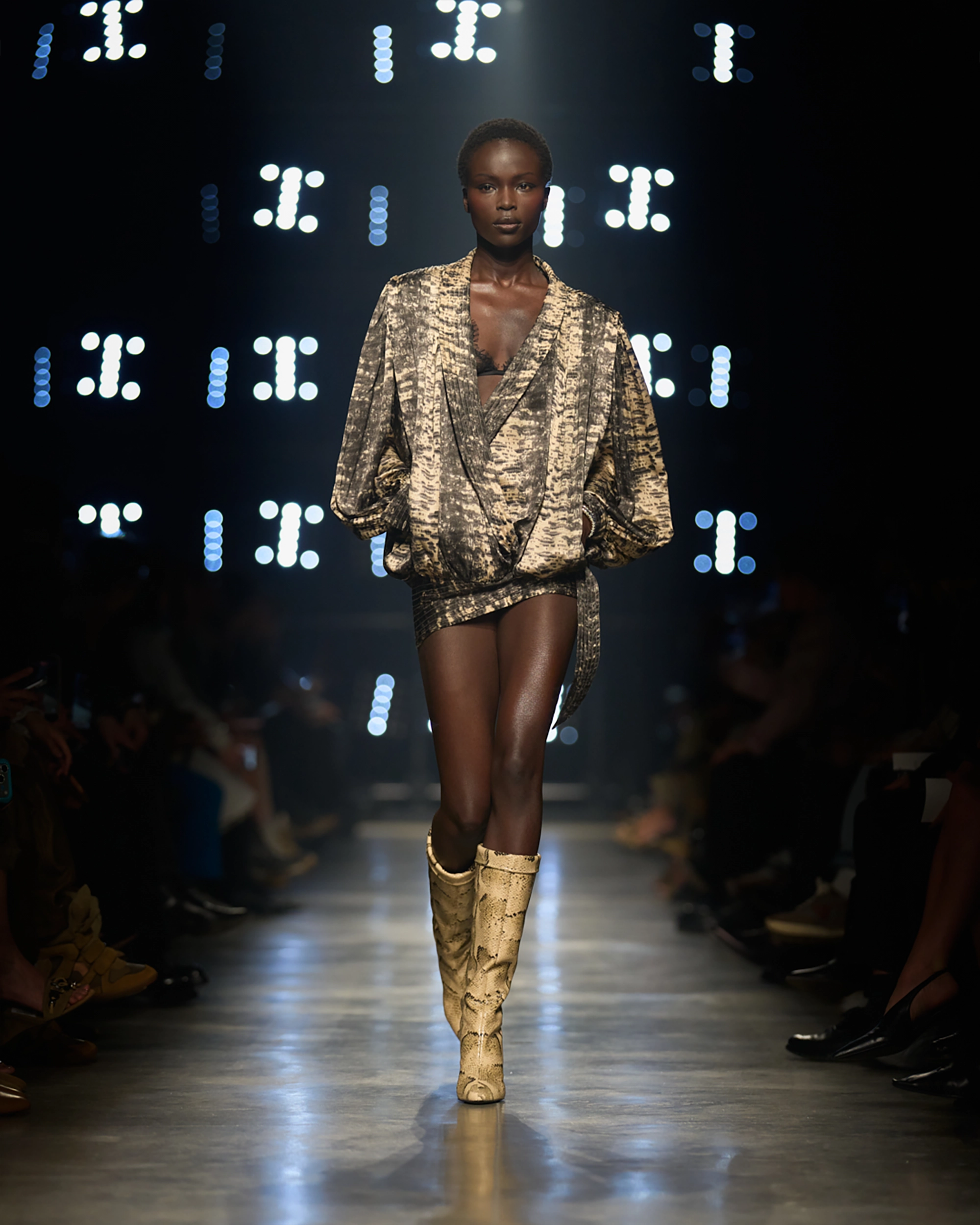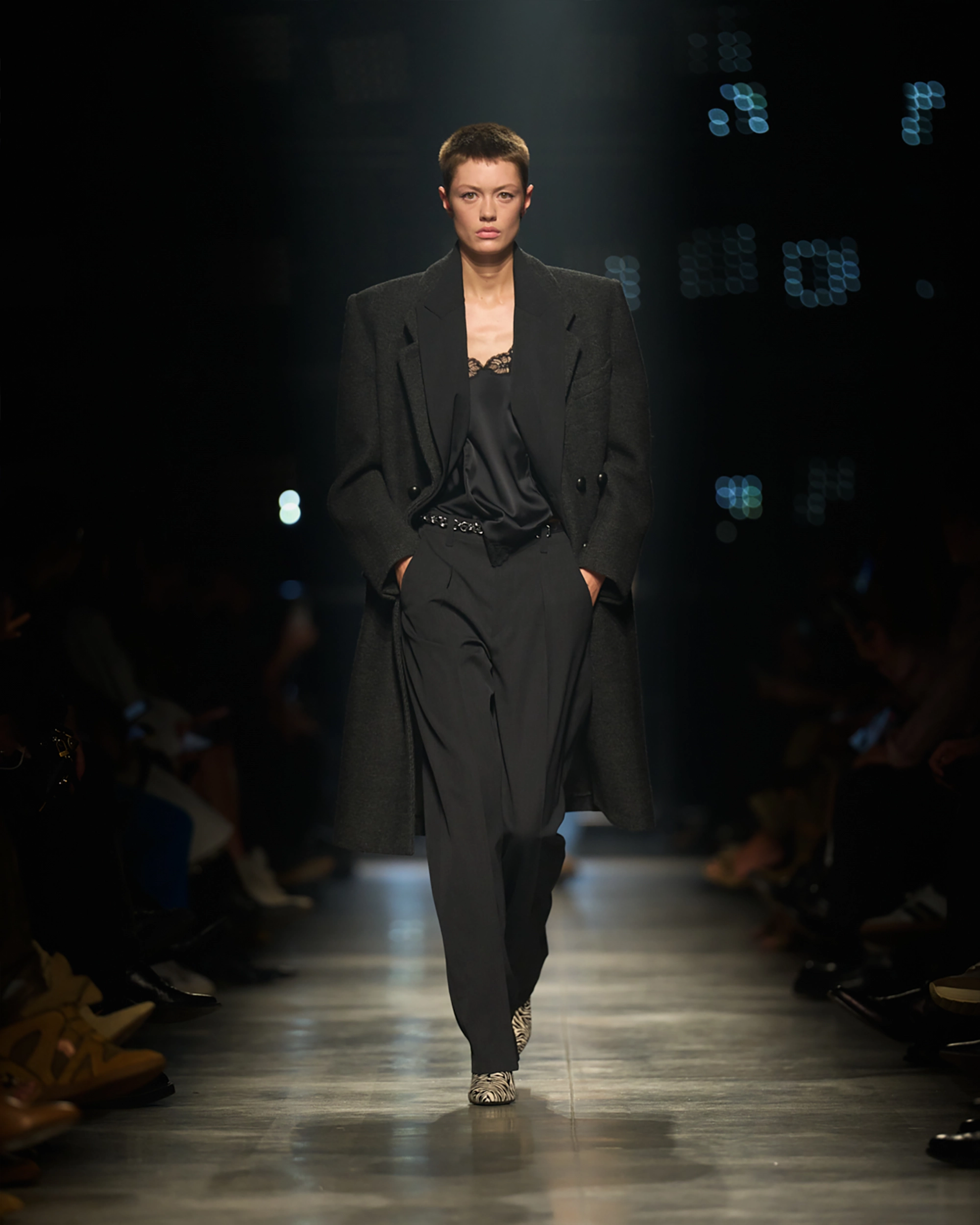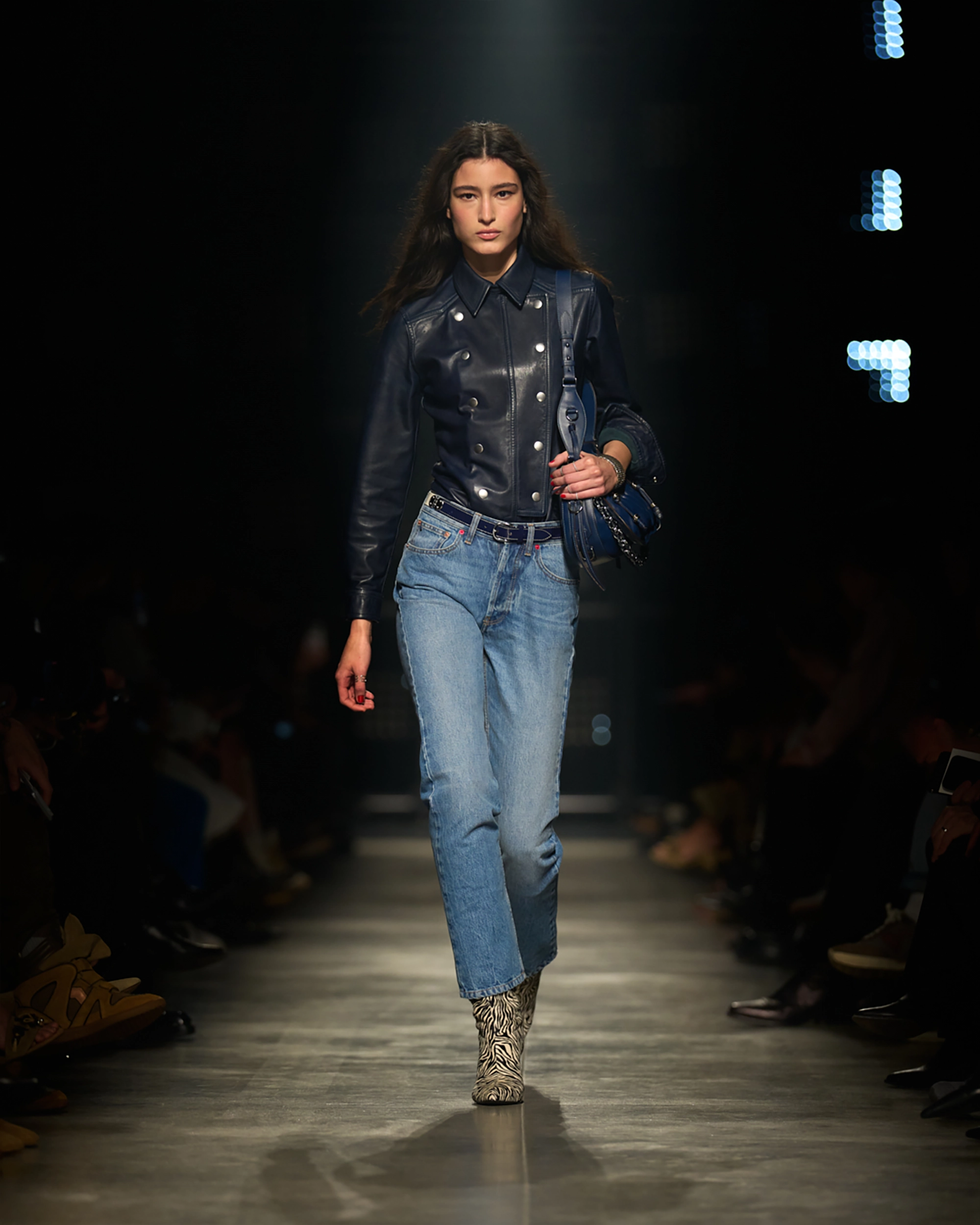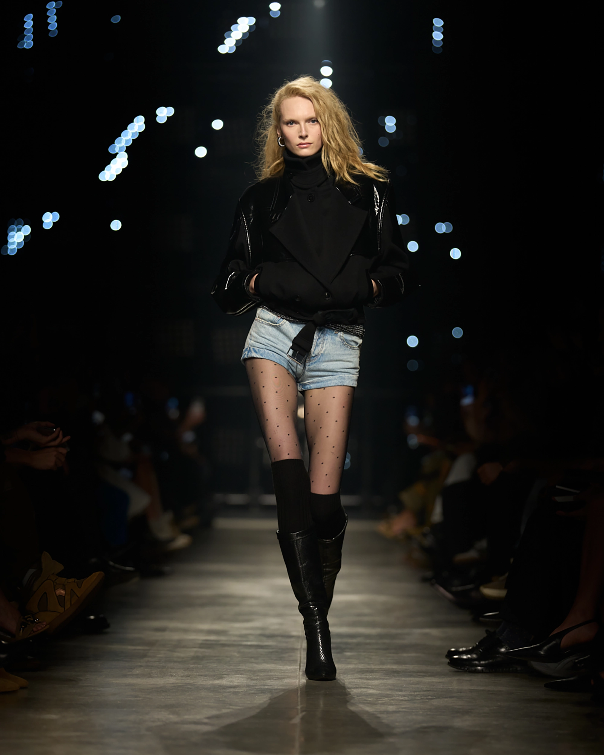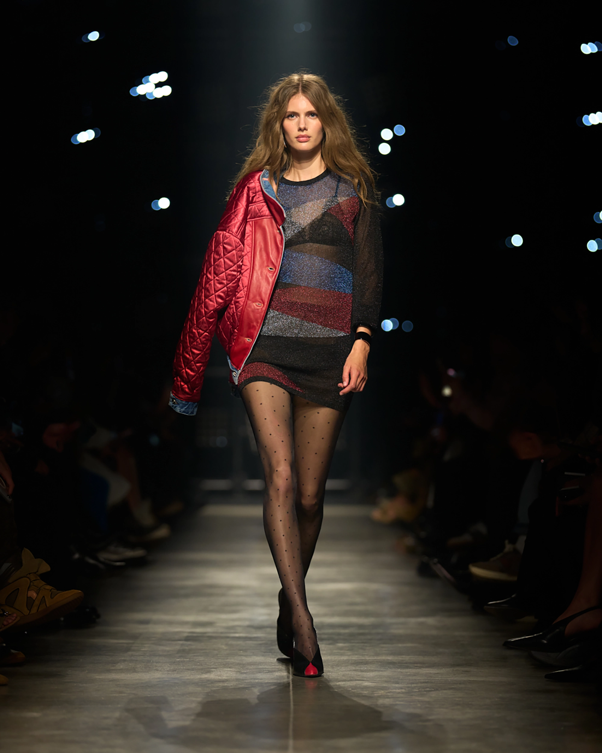 Runway styling reinforced this thematic tension. Long, floating evening dresses were grounded by sculptural leather boots, while thigh-high socks extended the line of the leg beneath cropped outerwear. Metallic surfaces caught intermittent flashes of light, creating moments of visual disruption that mirrored the unpredictability of urban nightlife. The effect was cinematic yet deeply wearable — a hallmark of Marant’s design language.