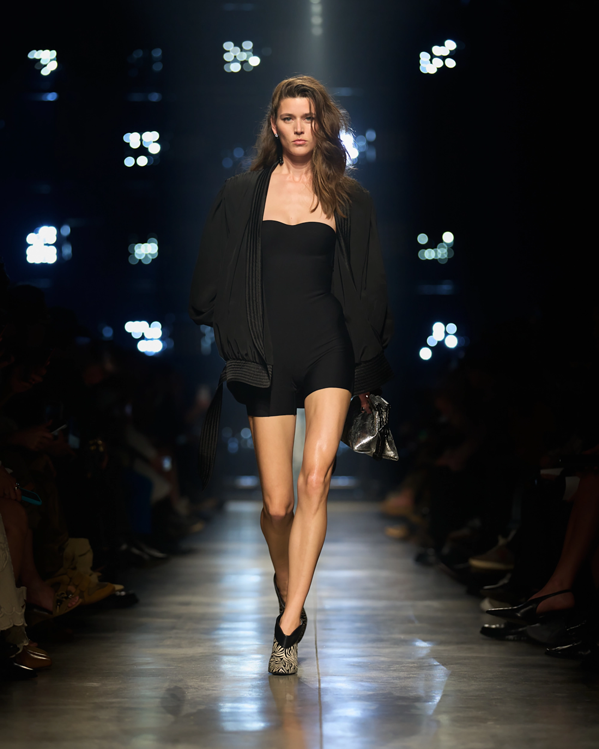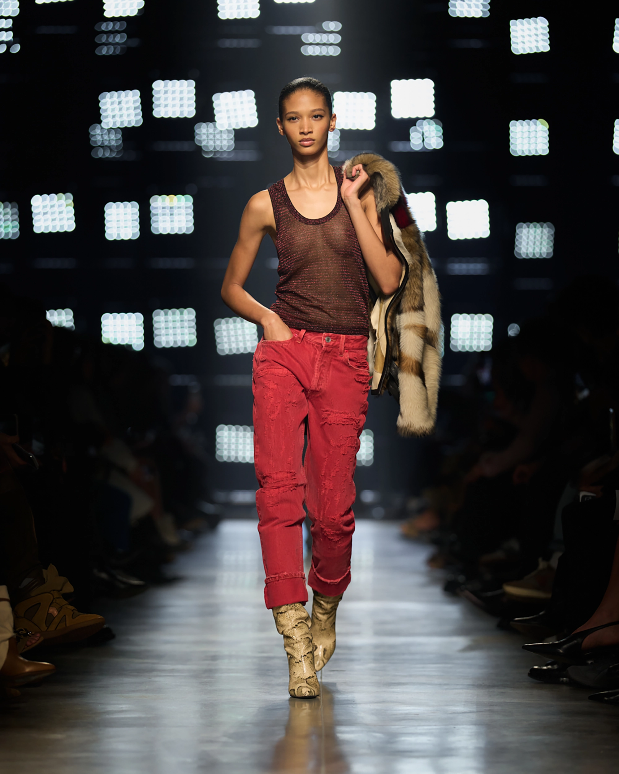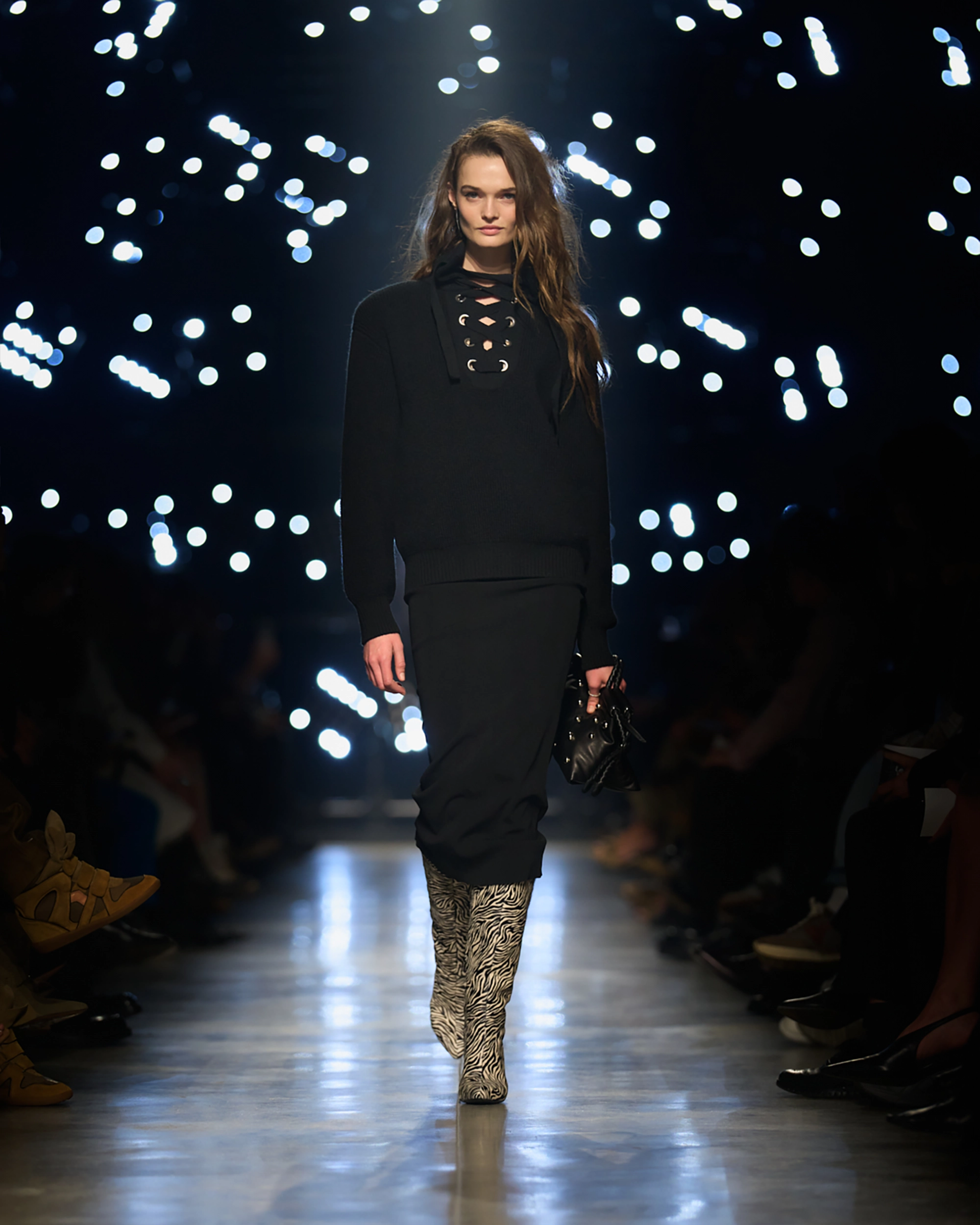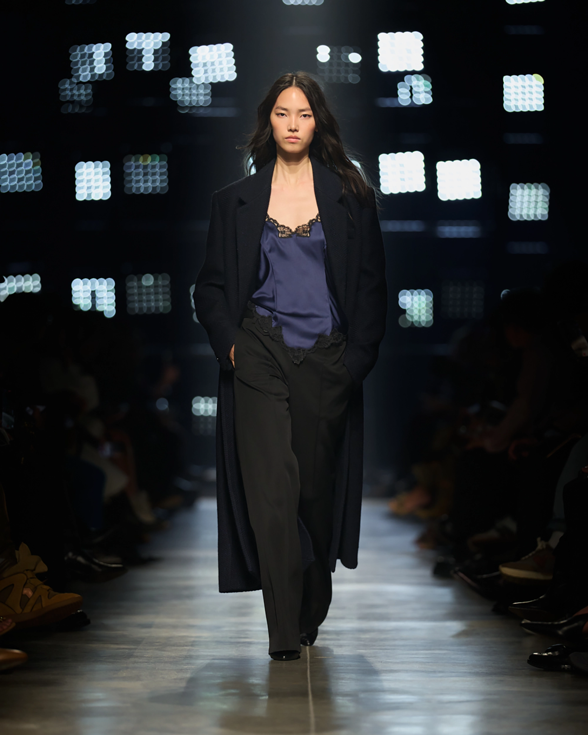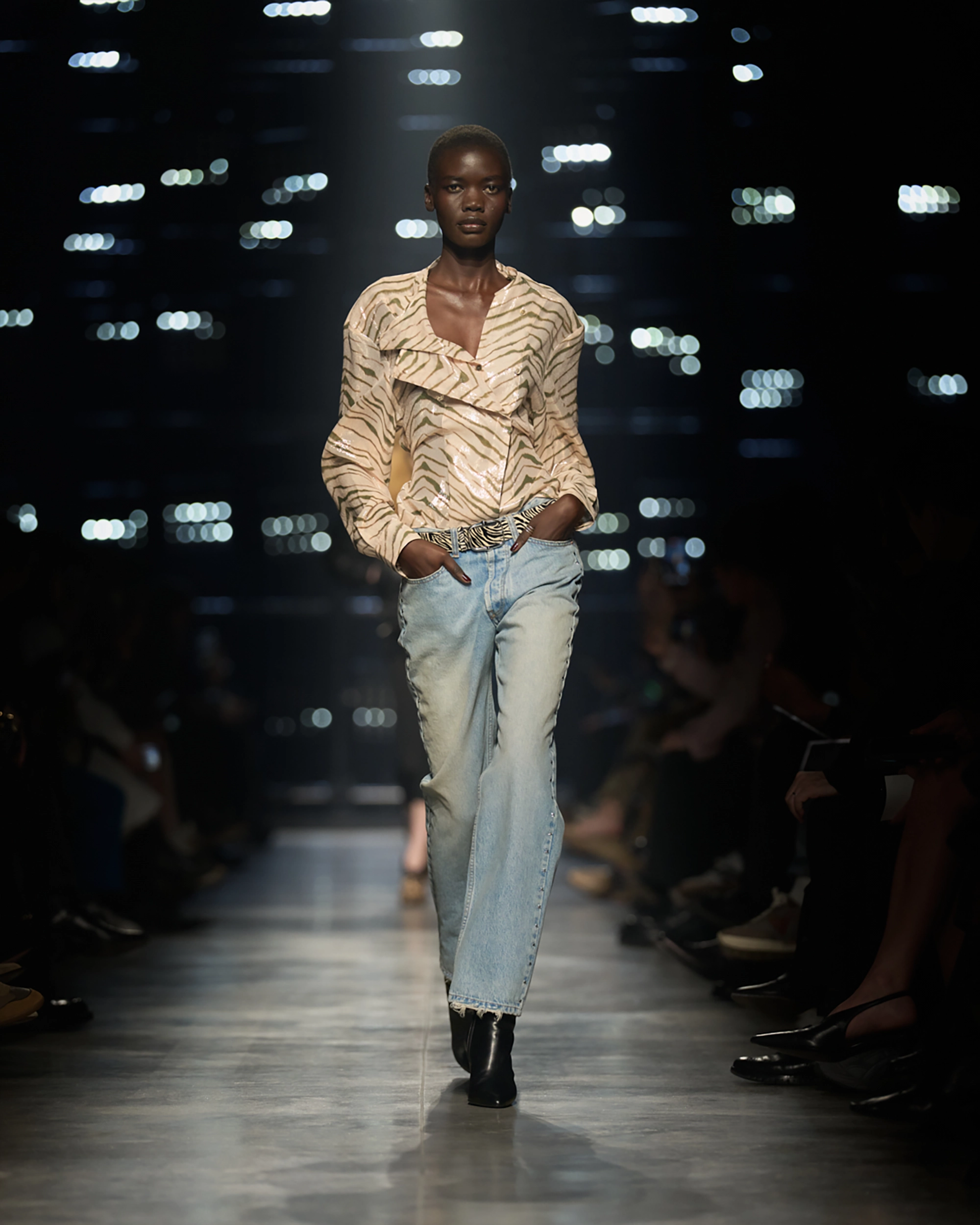 Runway styling reinforced this thematic tension. Long, floating evening dresses were grounded by sculptural leather boots, while thigh-high socks extended the line of the leg beneath cropped outerwear. Metallic surfaces caught intermittent flashes of light, creating moments of visual disruption that mirrored the unpredictability of urban nightlife. The effect was cinematic yet deeply wearable — a hallmark of Marant’s design language.