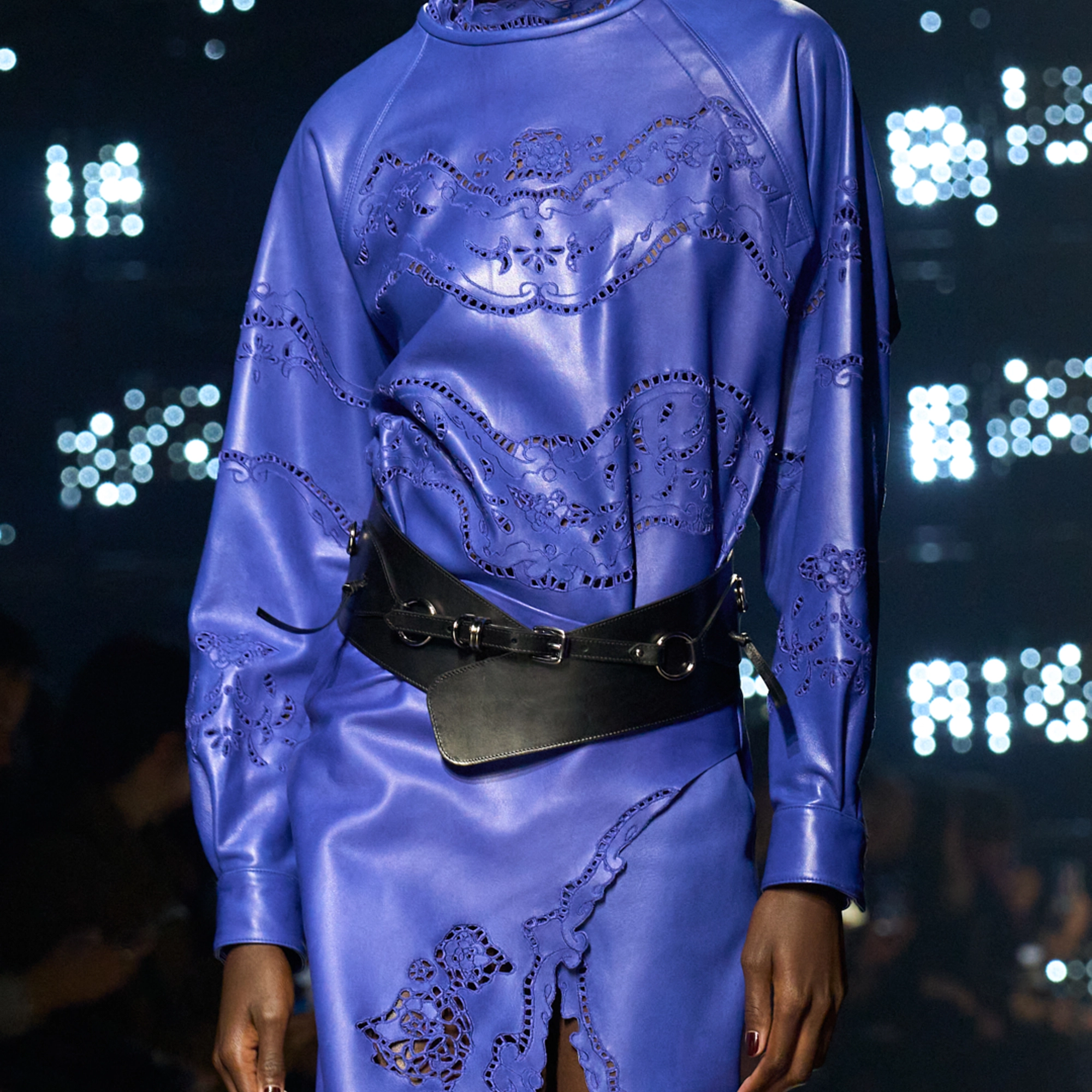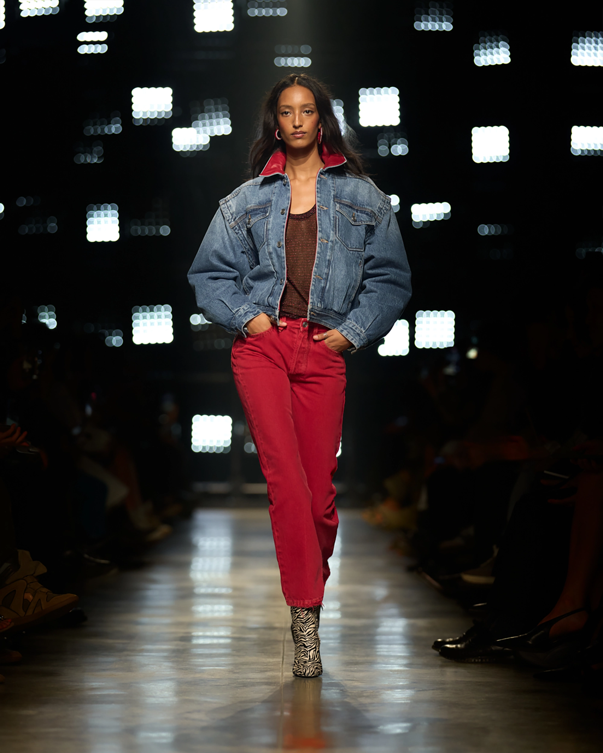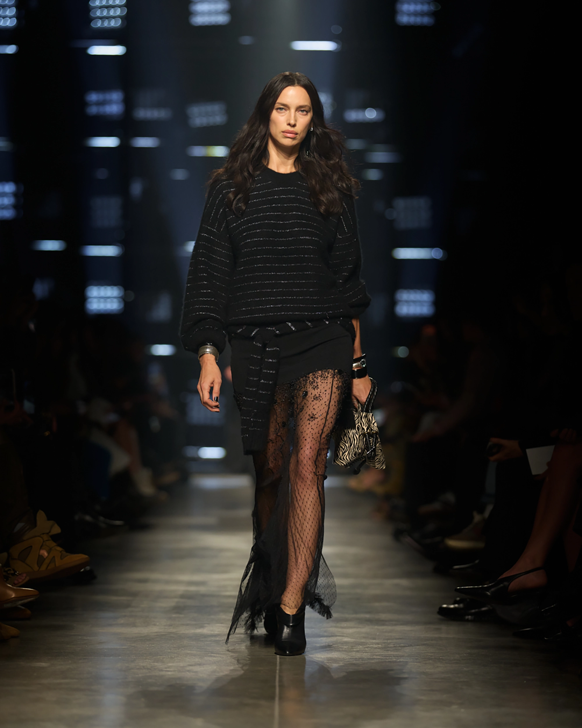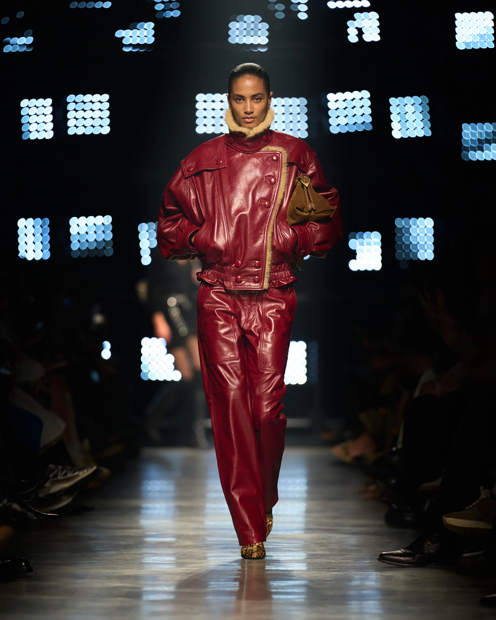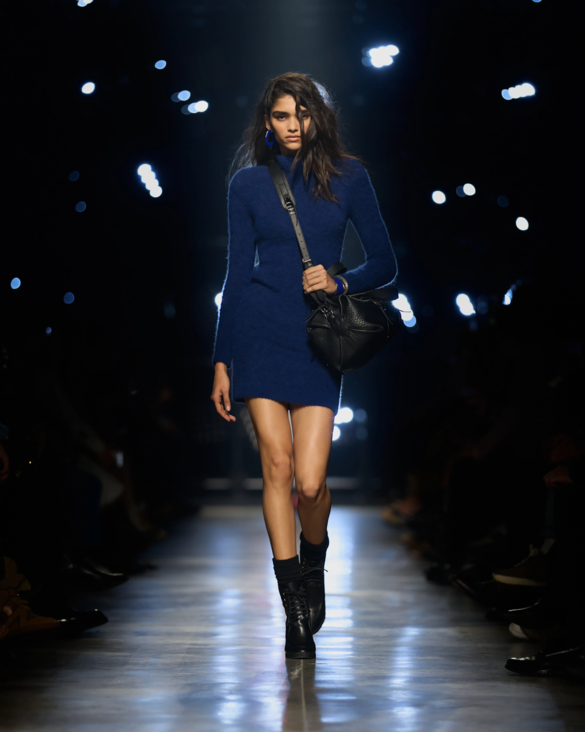 Runway styling reinforced this thematic tension. Long, floating evening dresses were grounded by sculptural leather boots, while thigh-high socks extended the line of the leg beneath cropped outerwear. Metallic surfaces caught intermittent flashes of light, creating moments of visual disruption that mirrored the unpredictability of urban nightlife. The effect was cinematic yet deeply wearable — a hallmark of Marant’s design language.