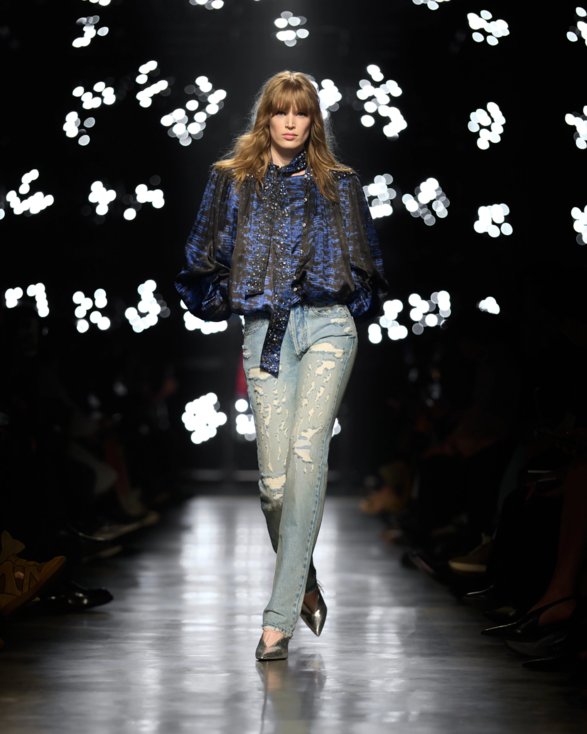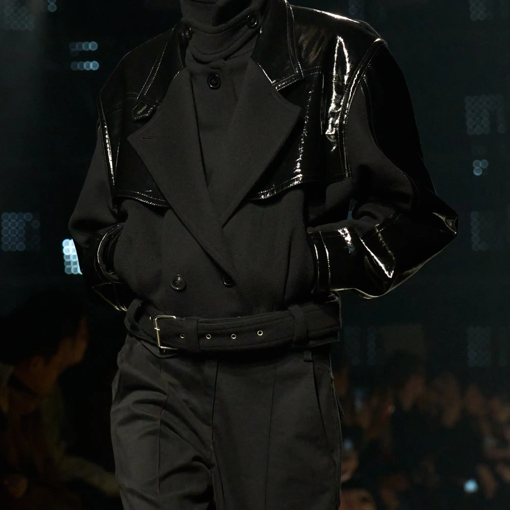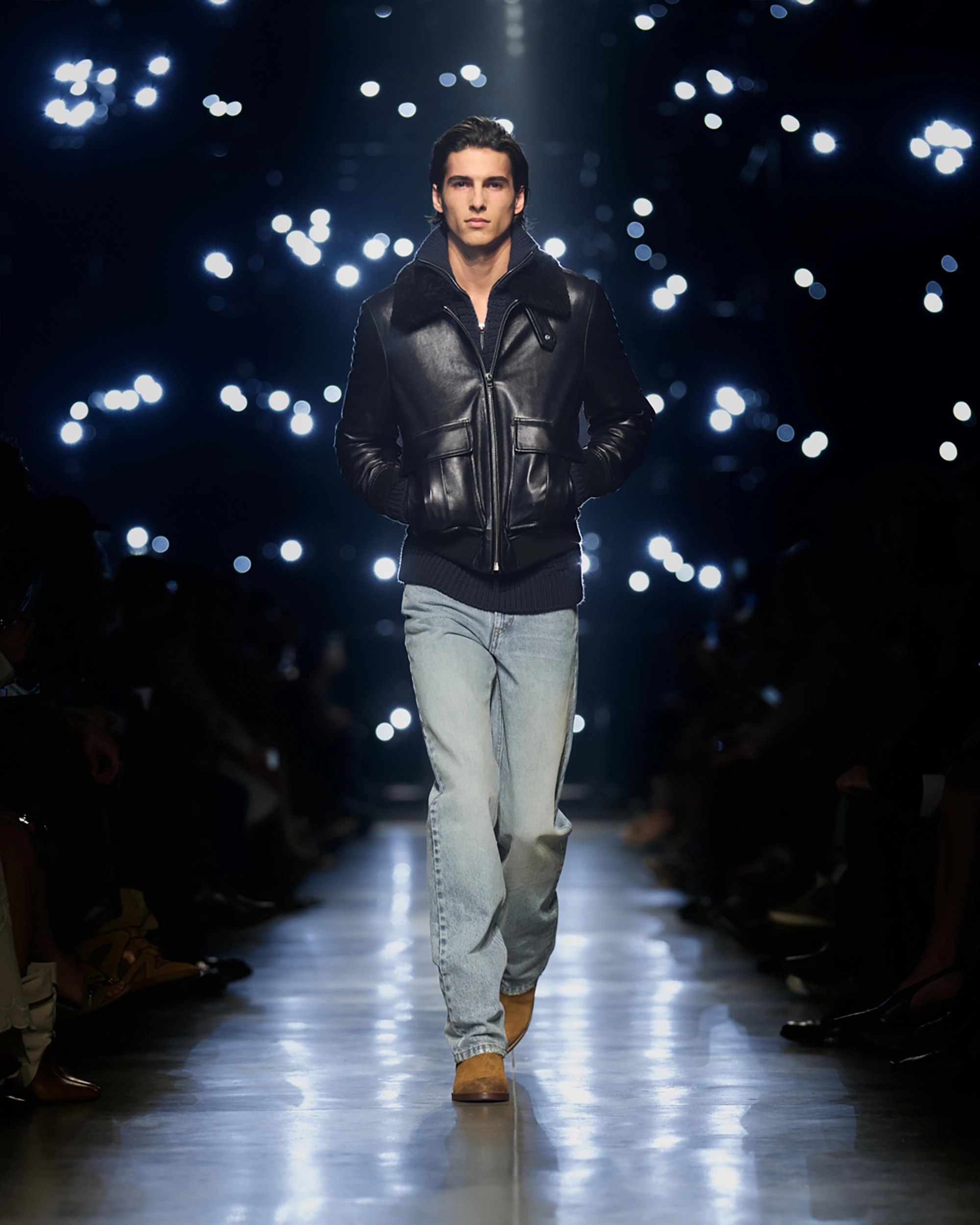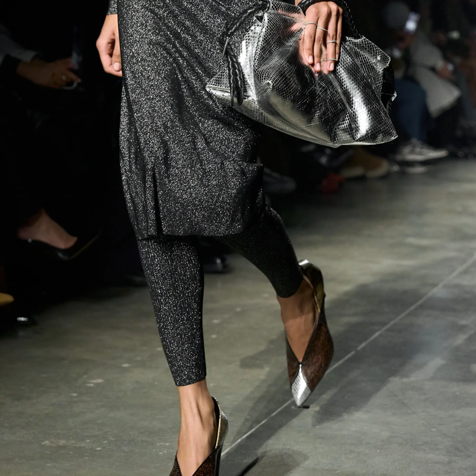 Runway styling reinforced this thematic tension. Long, floating evening dresses were grounded by sculptural leather boots, while thigh-high socks extended the line of the leg beneath cropped outerwear. Metallic surfaces caught intermittent flashes of light, creating moments of visual disruption that mirrored the unpredictability of urban nightlife. The effect was cinematic yet deeply wearable — a hallmark of Marant’s design language.