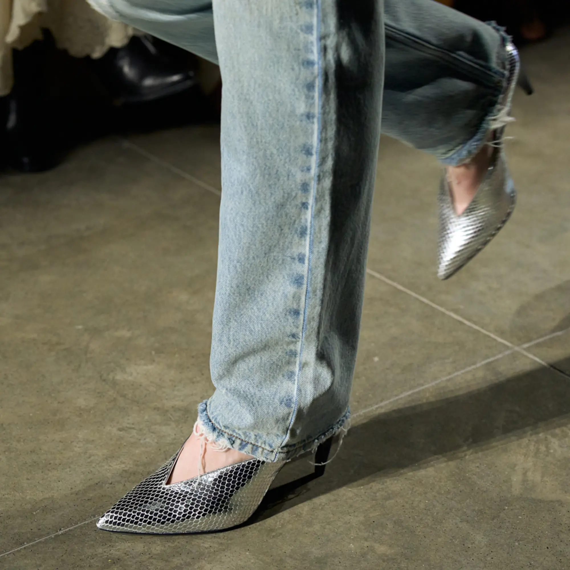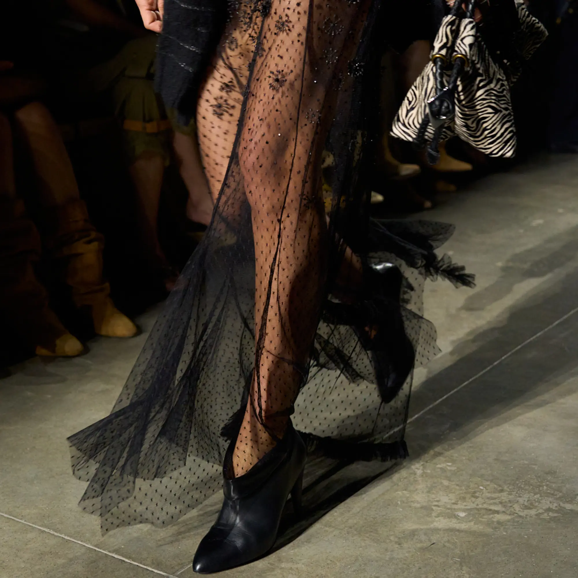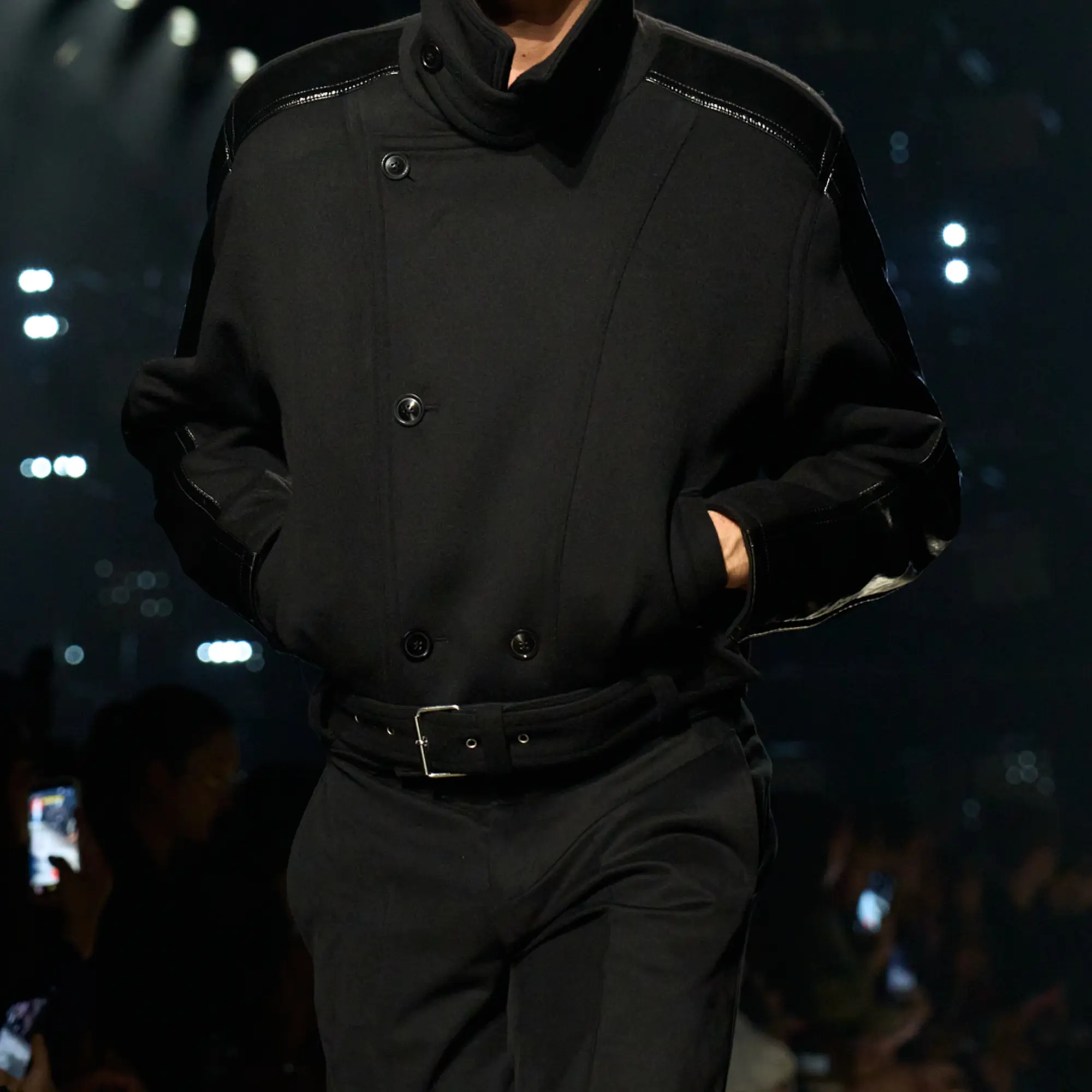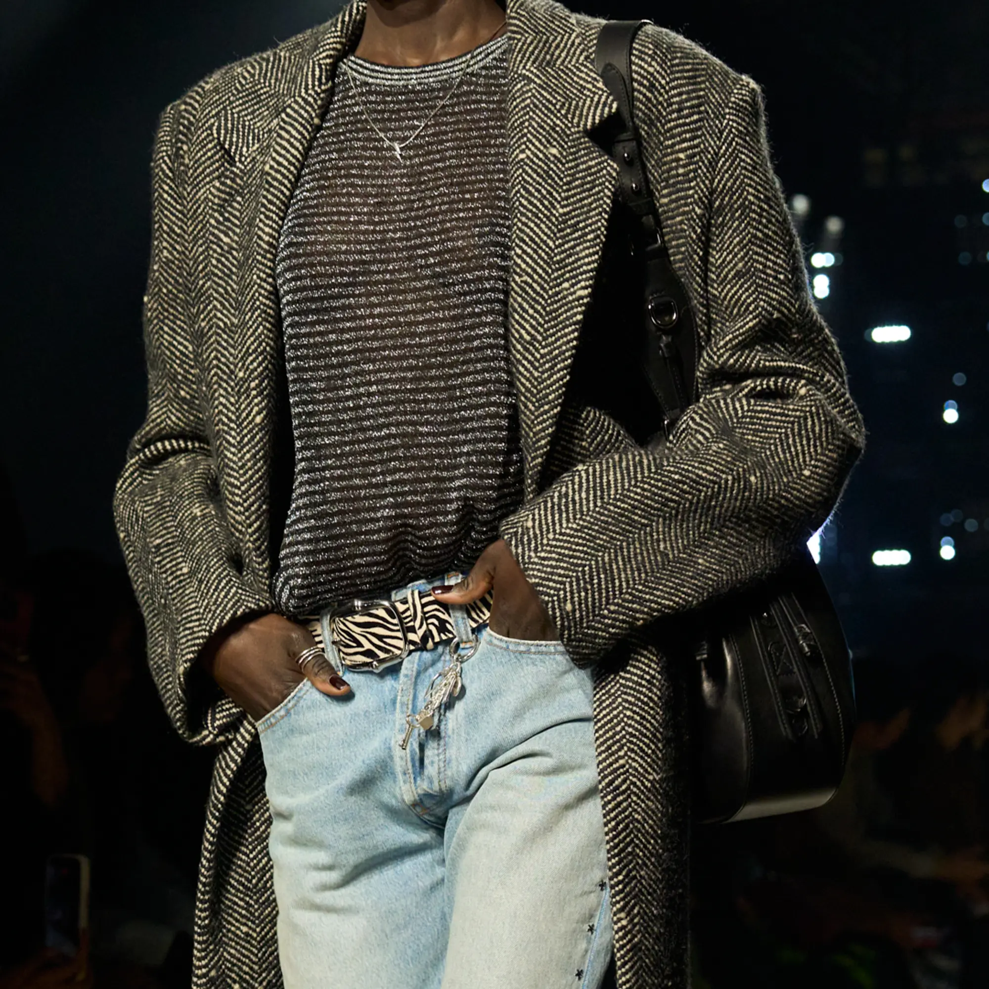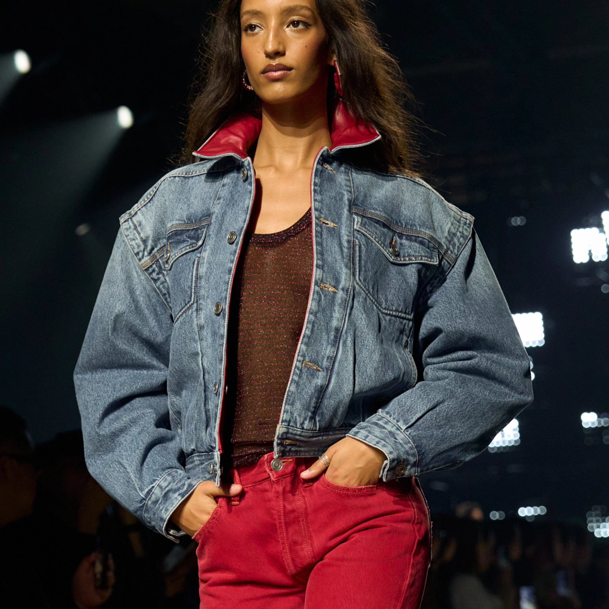 Runway styling reinforced this thematic tension. Long, floating evening dresses were grounded by sculptural leather boots, while thigh-high socks extended the line of the leg beneath cropped outerwear. Metallic surfaces caught intermittent flashes of light, creating moments of visual disruption that mirrored the unpredictability of urban nightlife. The effect was cinematic yet deeply wearable — a hallmark of Marant’s design language.