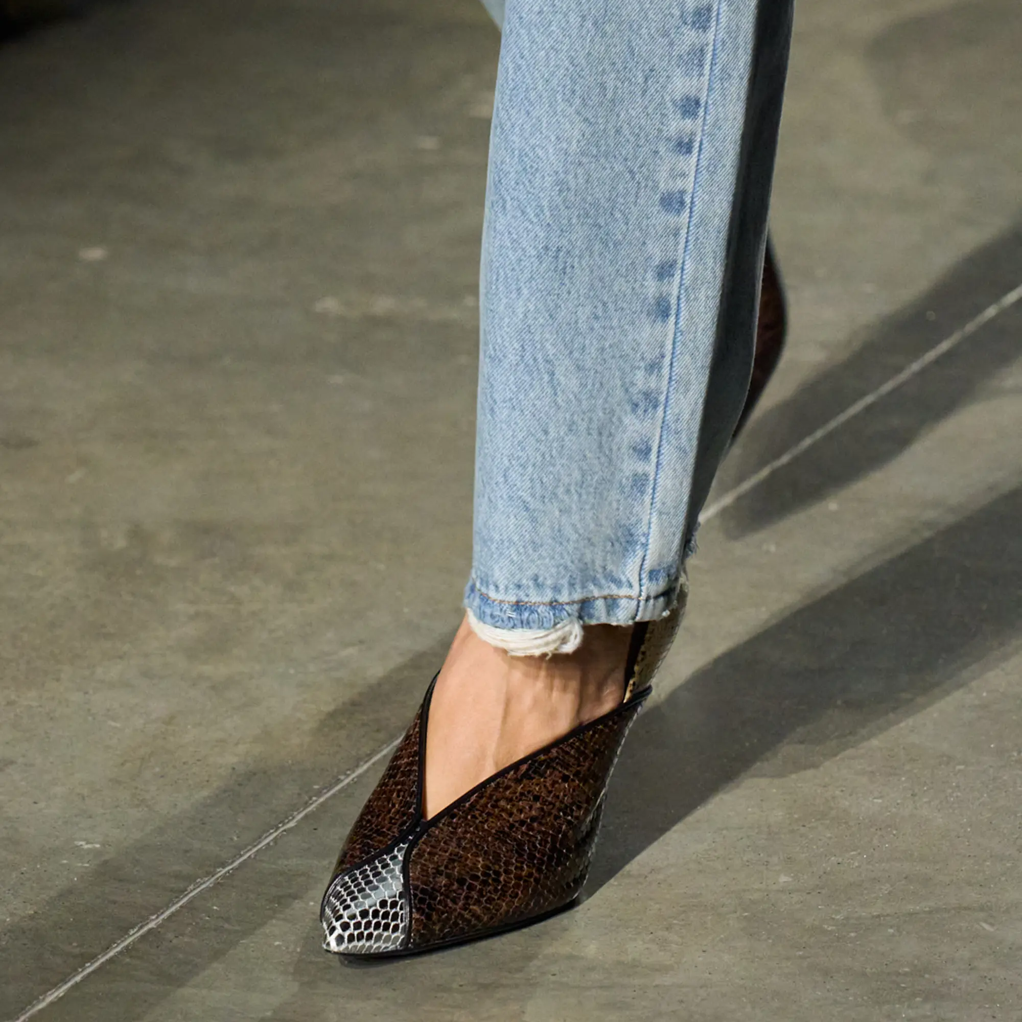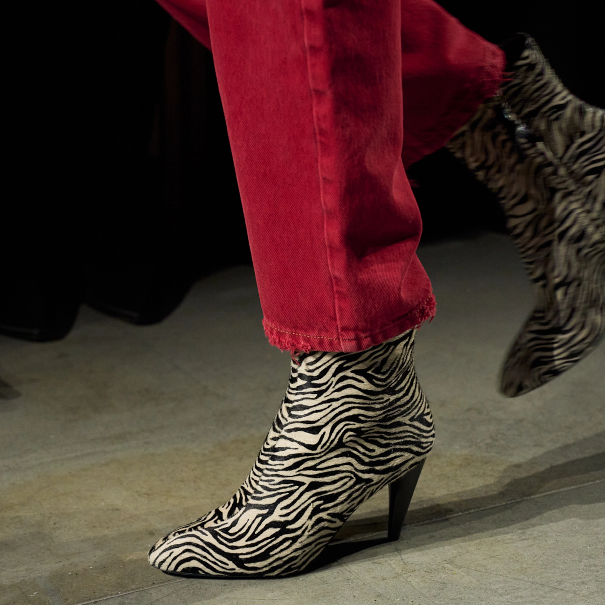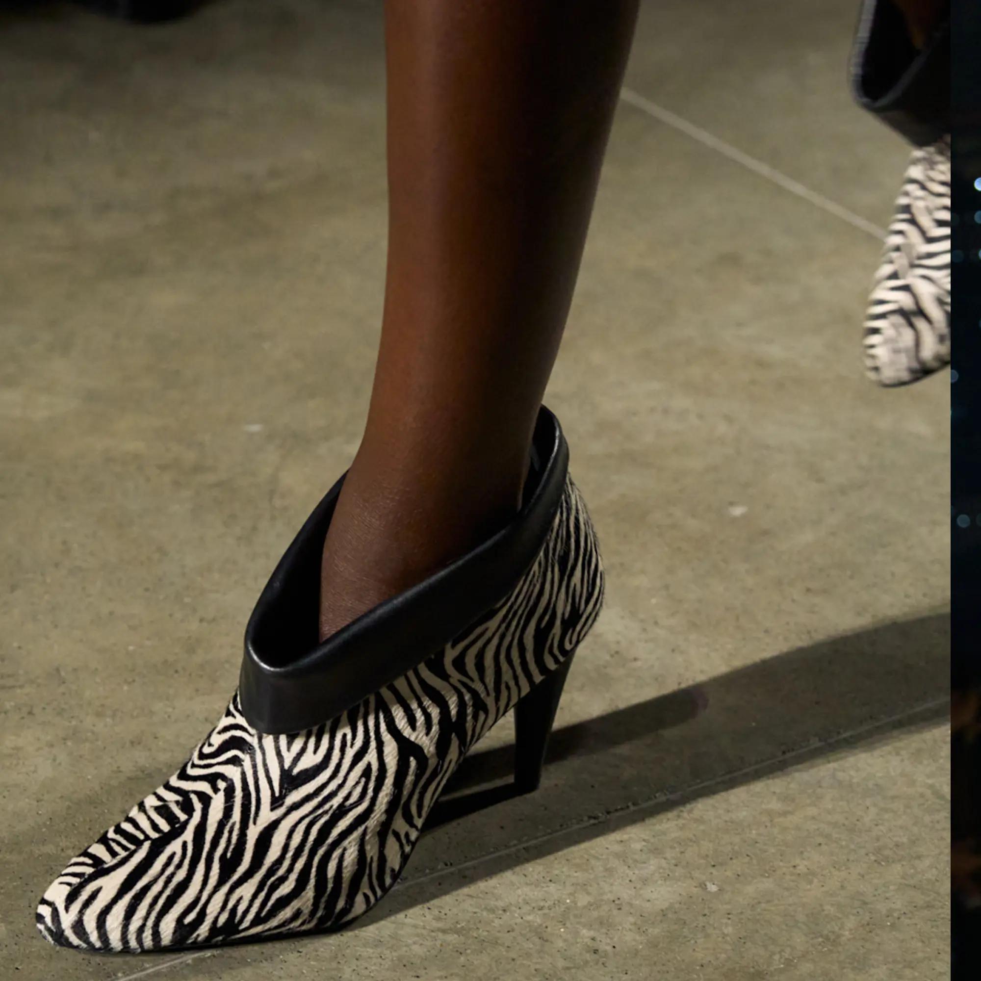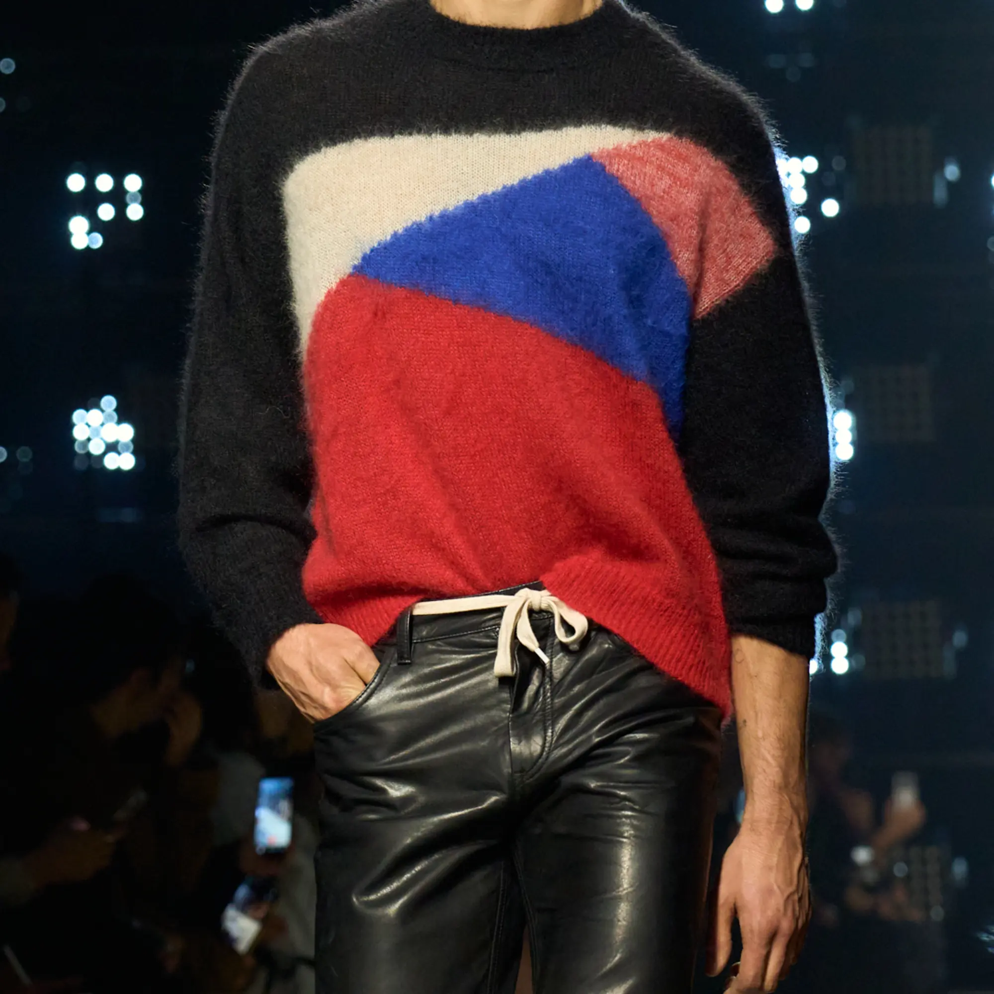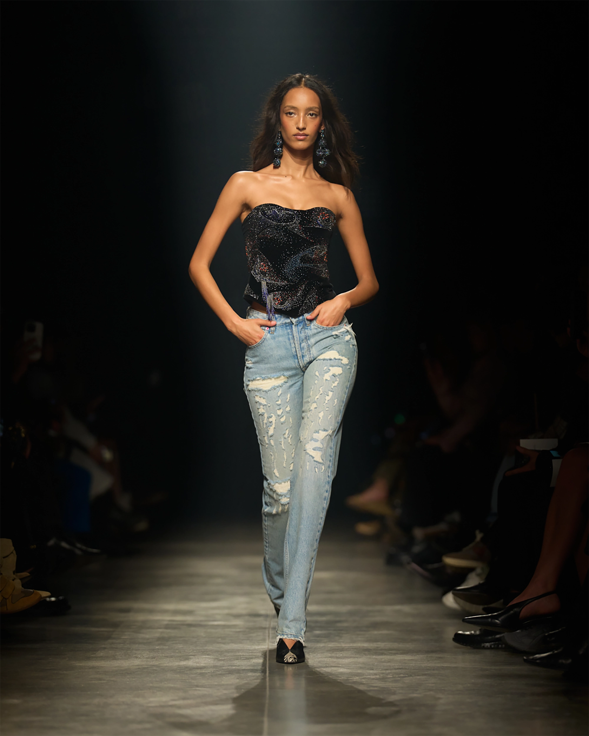 Runway styling reinforced this thematic tension. Long, floating evening dresses were grounded by sculptural leather boots, while thigh-high socks extended the line of the leg beneath cropped outerwear. Metallic surfaces caught intermittent flashes of light, creating moments of visual disruption that mirrored the unpredictability of urban nightlife. The effect was cinematic yet deeply wearable — a hallmark of Marant’s design language.