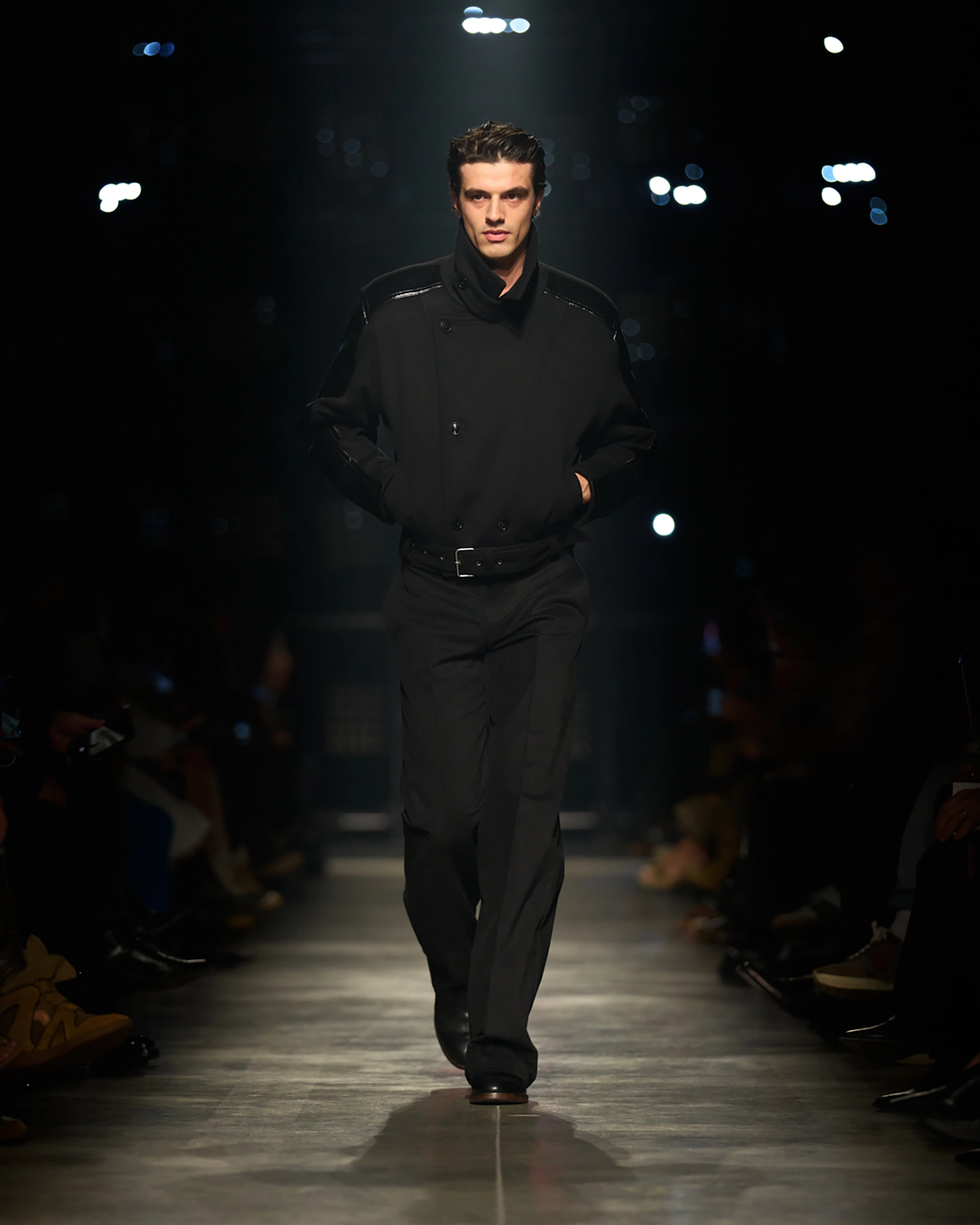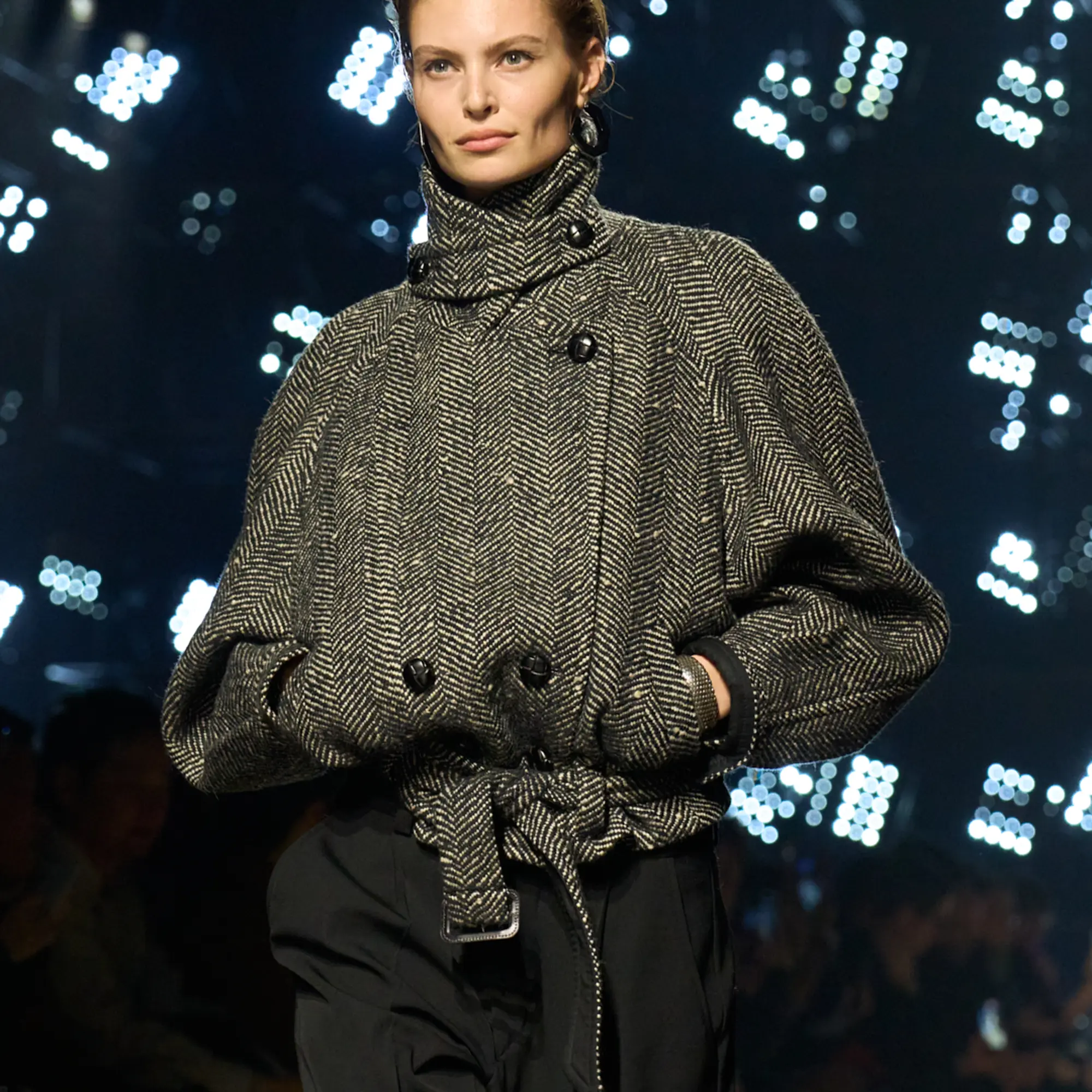 Isabel Marant’s Autumn/Winter 2026 presentation unfolded as a study in controlled momentum. The runway environment was deliberately pared black, allowing silhouette, texture and movement to define the narrative. Lighting remained low and directional, creating pockets of shadow that models moved through with quiet assurance. This spatial minimalism reinforced the collection’s central theme — a modern Parisian navigating the tension between strength and sensuality.