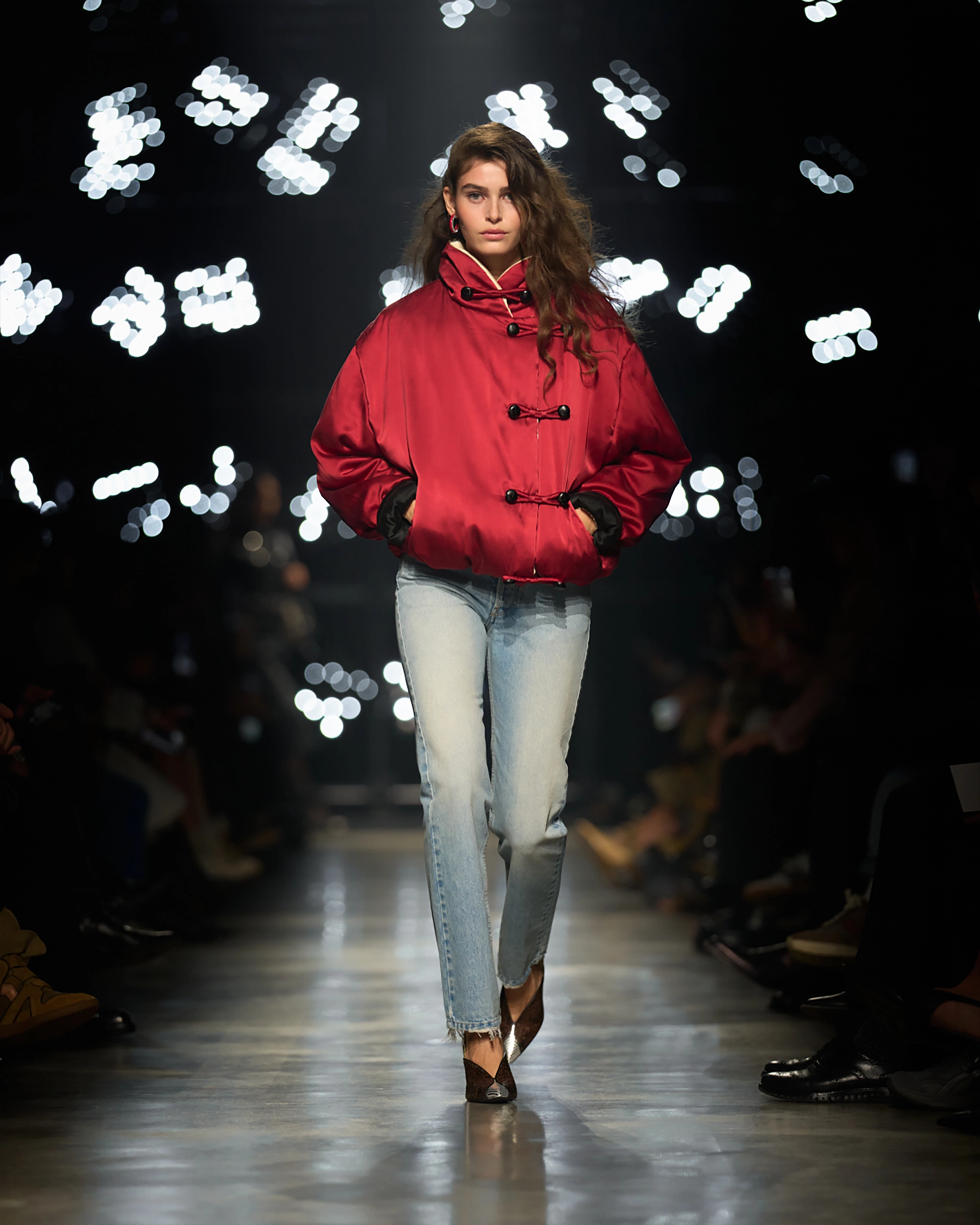 The show progressed with a measured cadence. A subdued, rhythmic soundtrack underscored the sound of footsteps striking the runway, transforming each walk into a statement of intent. Marant’s vision was not theatrical in a conventional sense; instead, it was immersive. The audience experienced the collection as a sequence of lived moments — fragments of night, encounters, departures and returns.