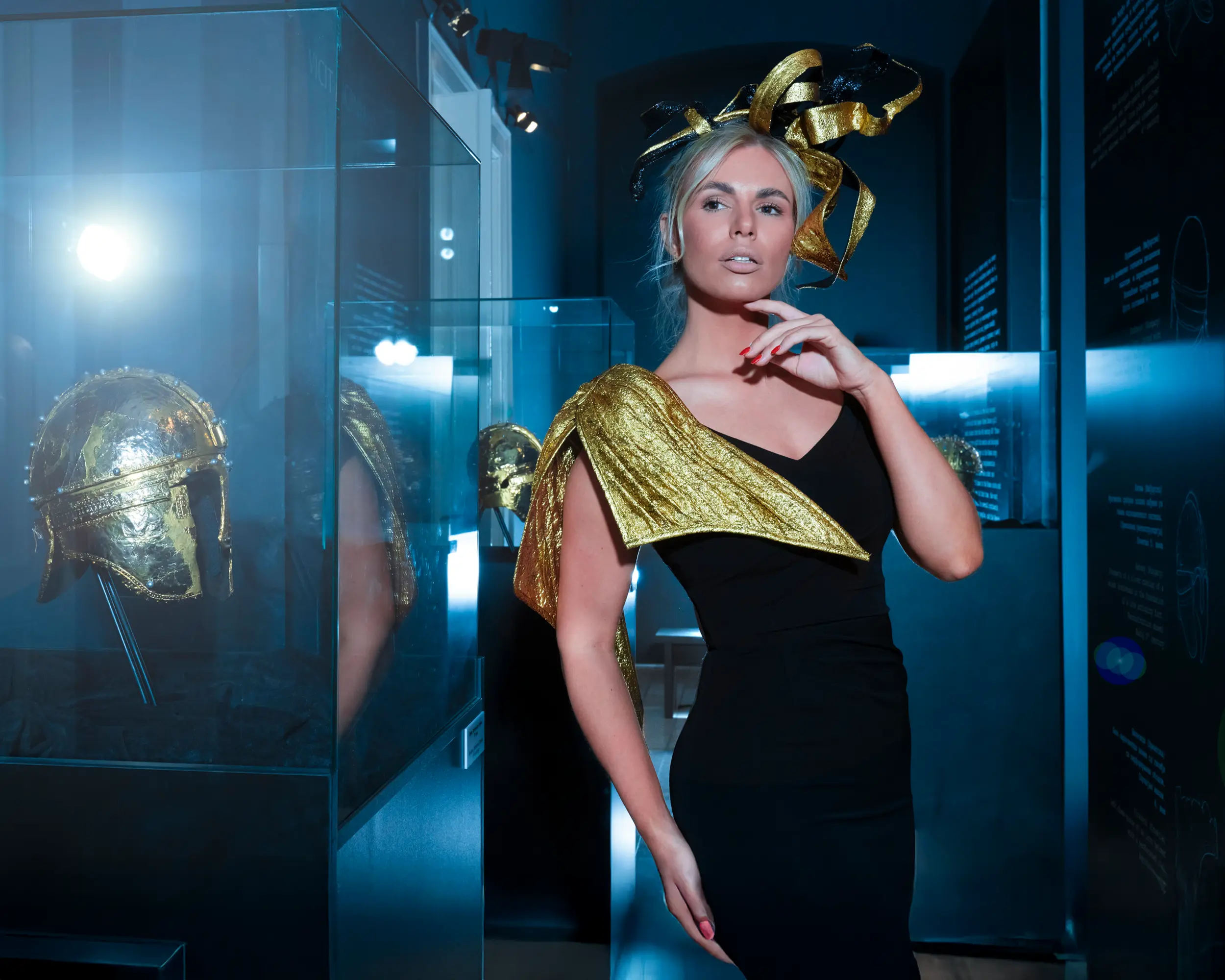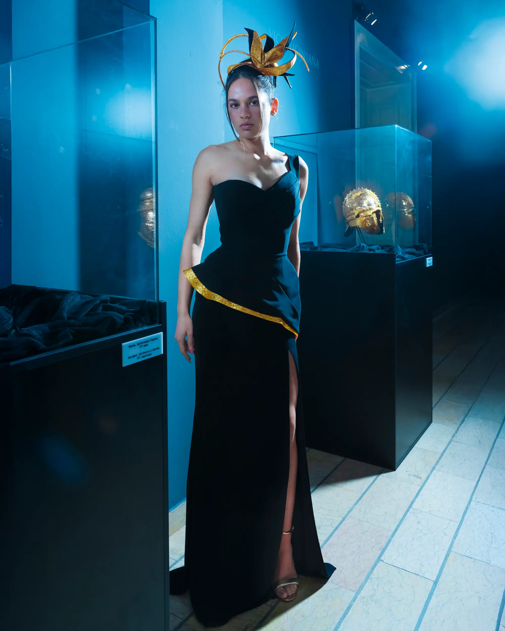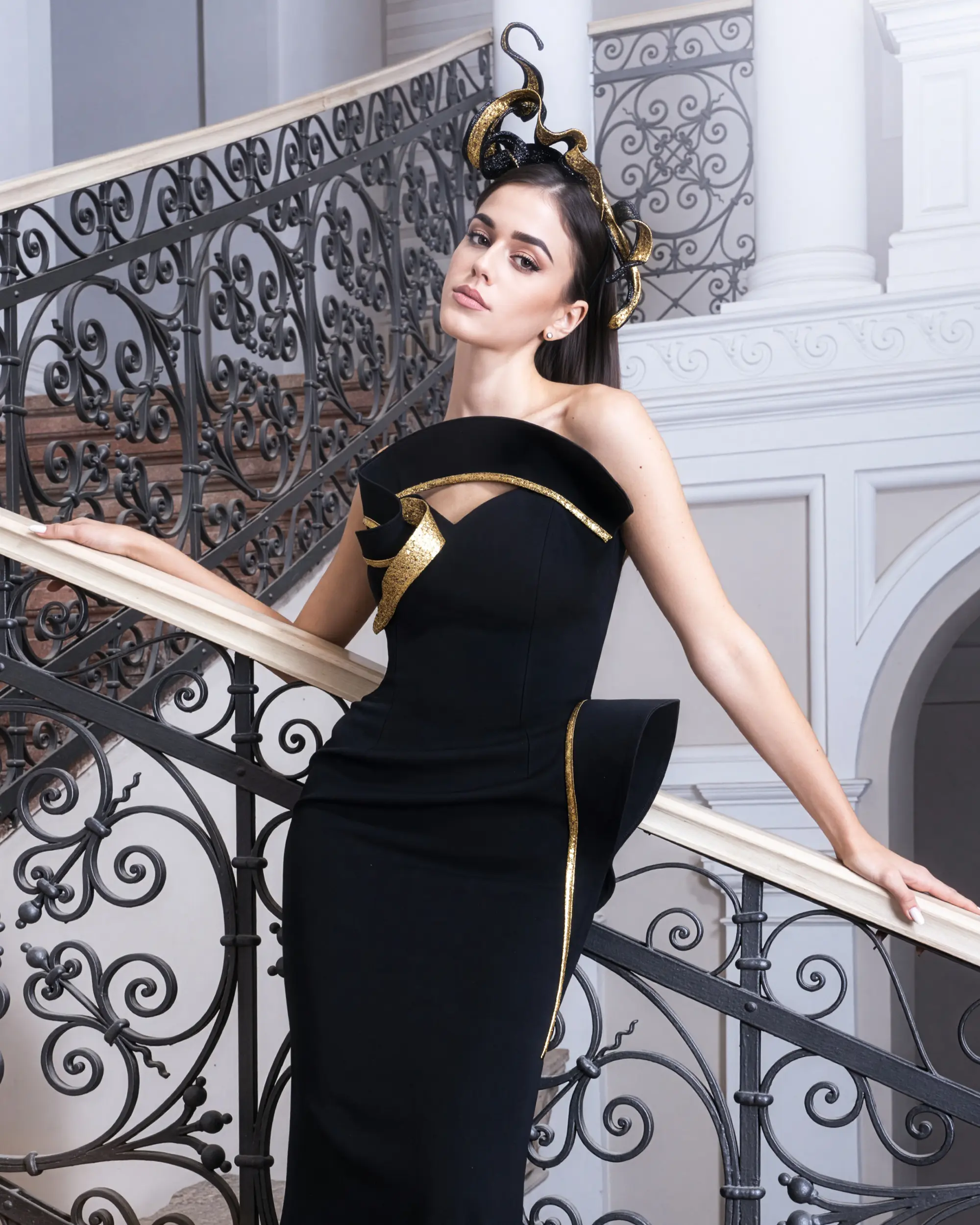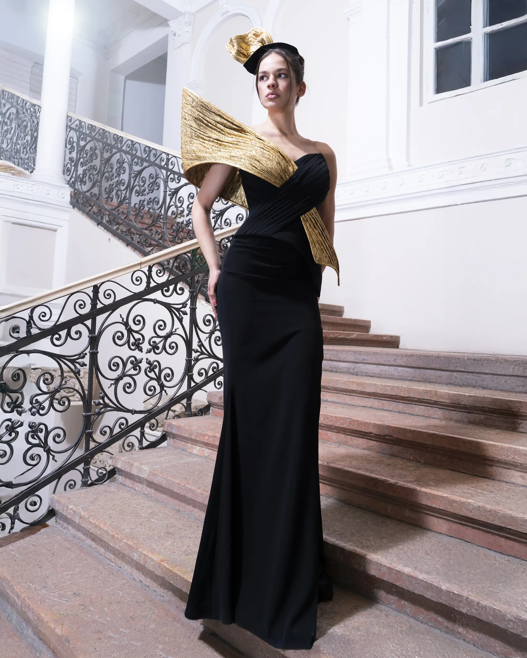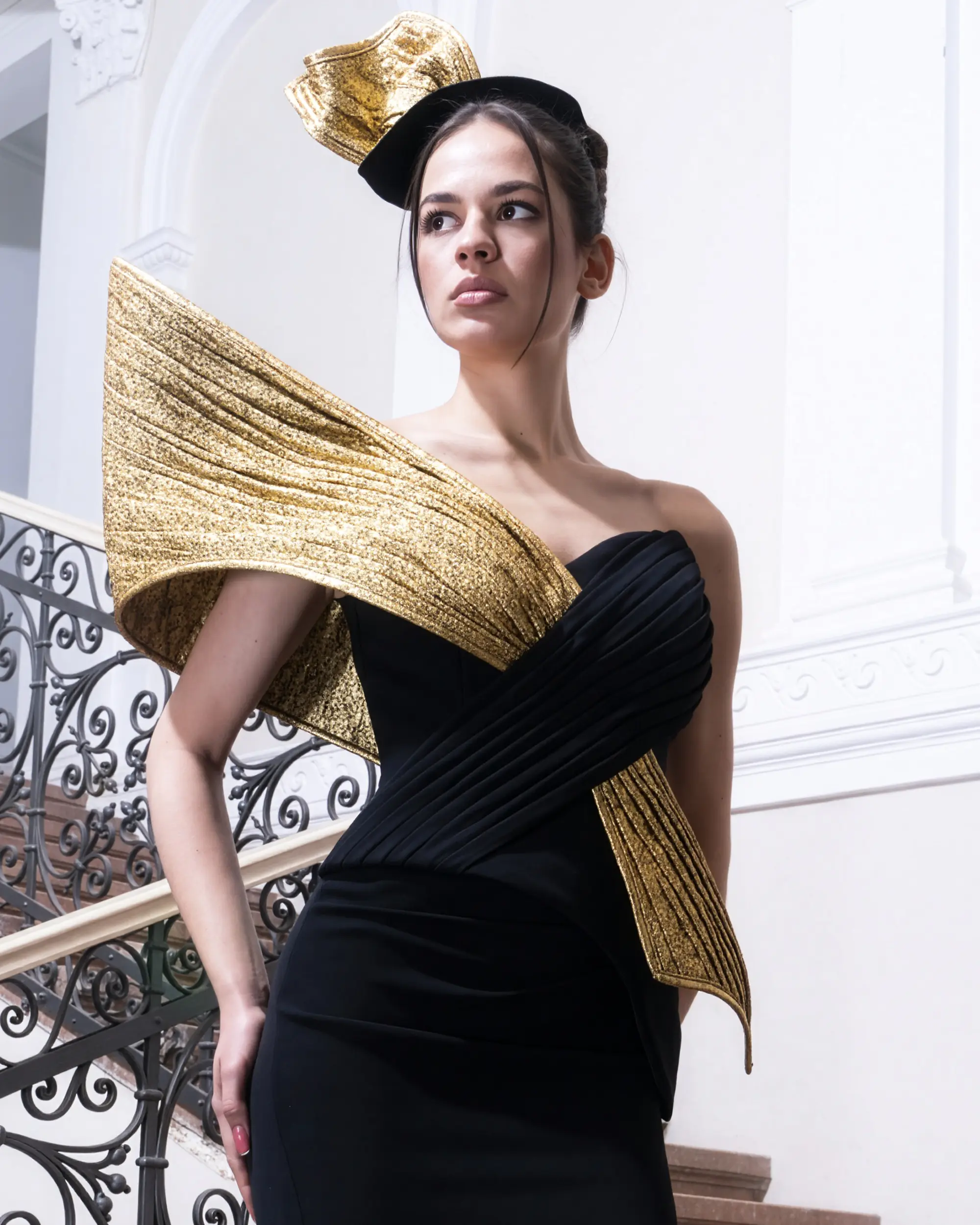 A sculptural black gown with gold accents and an ornate headpiece, styled for a bold, high-contrast fashion statement.