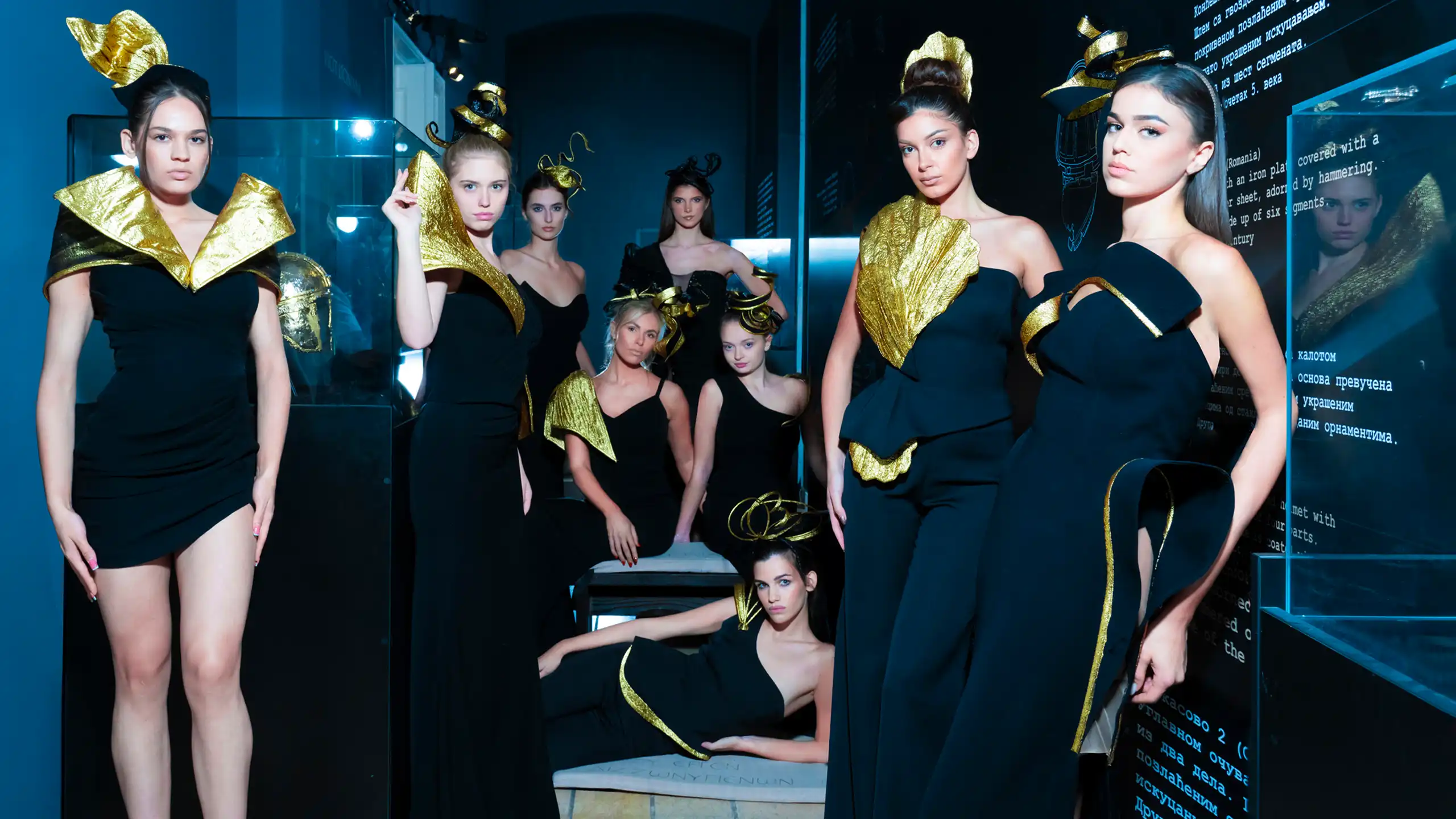 Avant-garde black silhouettes accented with sculptural gold details, worn by a striking ensemble of models in a dramatic, high-contrast setting.
