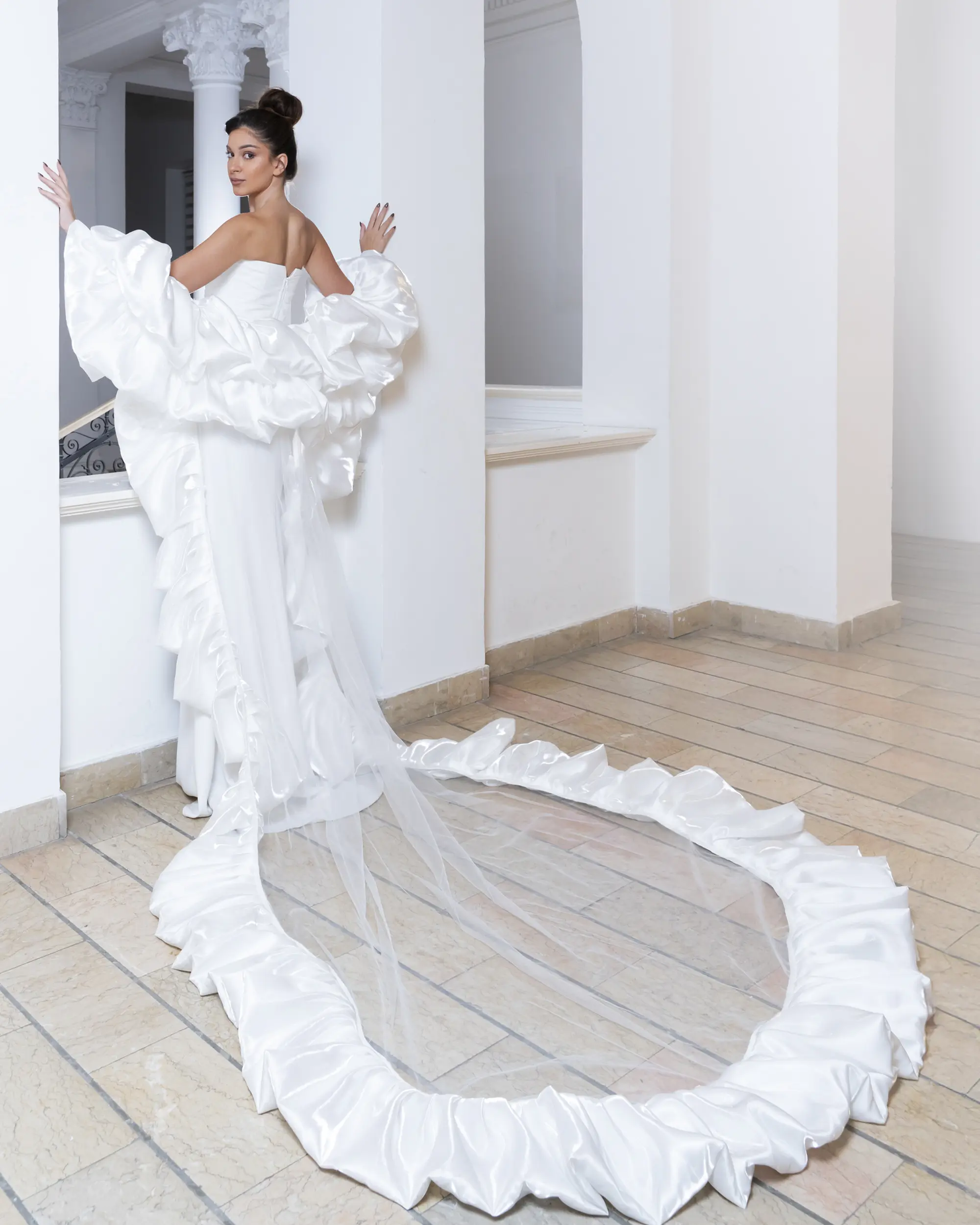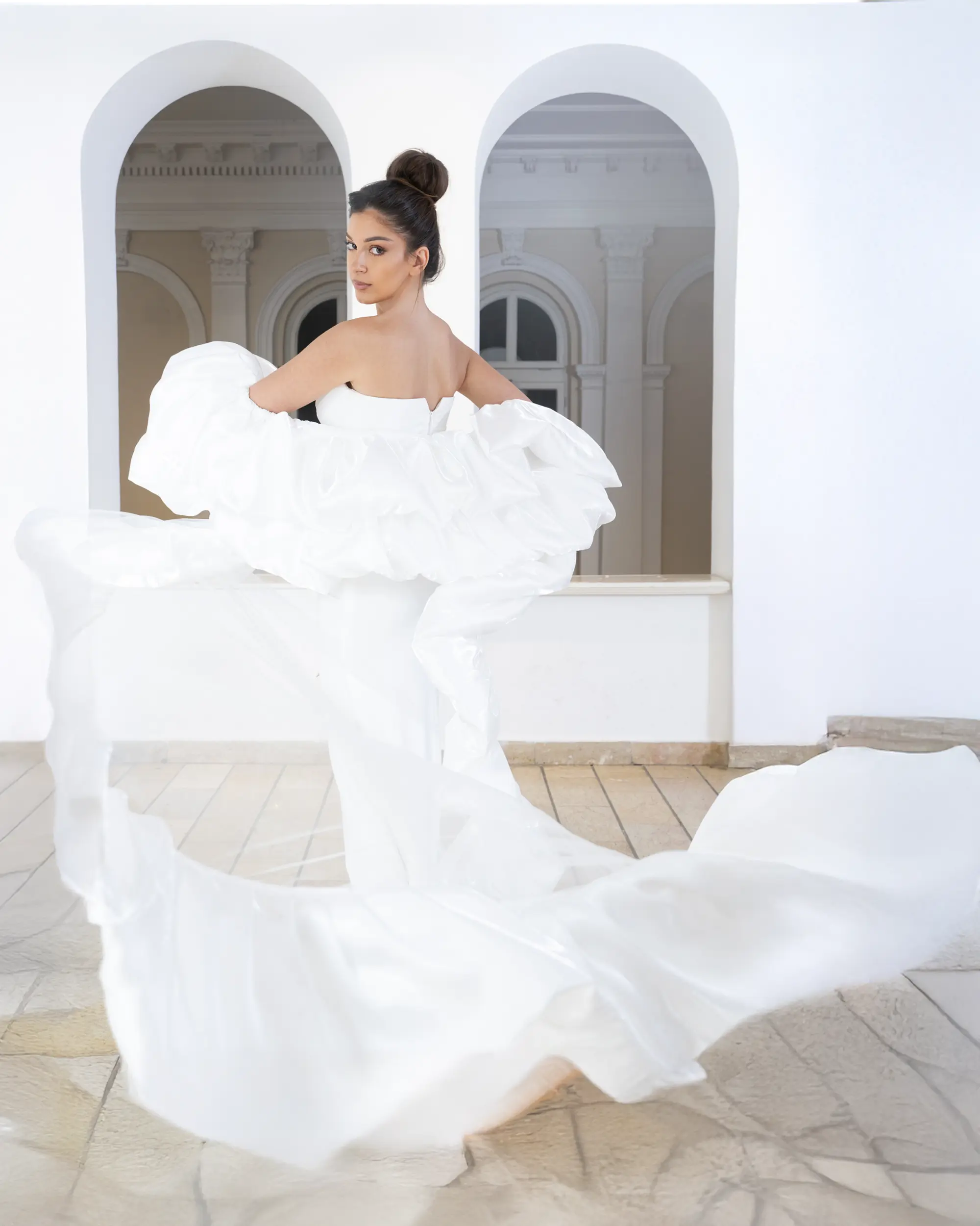 Strapless white bridal gown with voluminous ruffled sleeves and a fluid, extended train, creating movement, lightness, and sculptural romance.