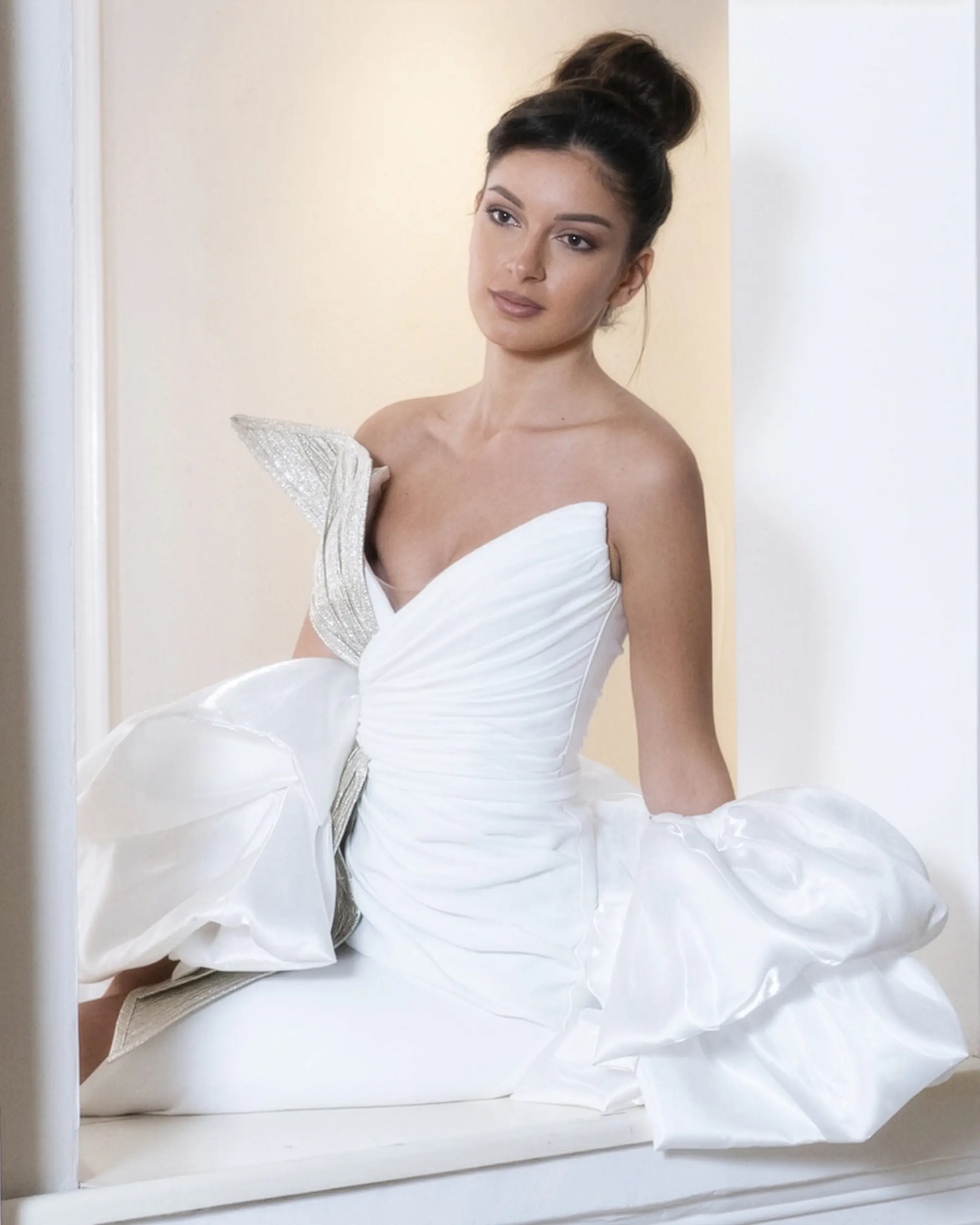 Strapless white bridal gown with sculptural draping, soft ruching, and voluminous organza sleeves, blending architectural form with romantic fluidity.