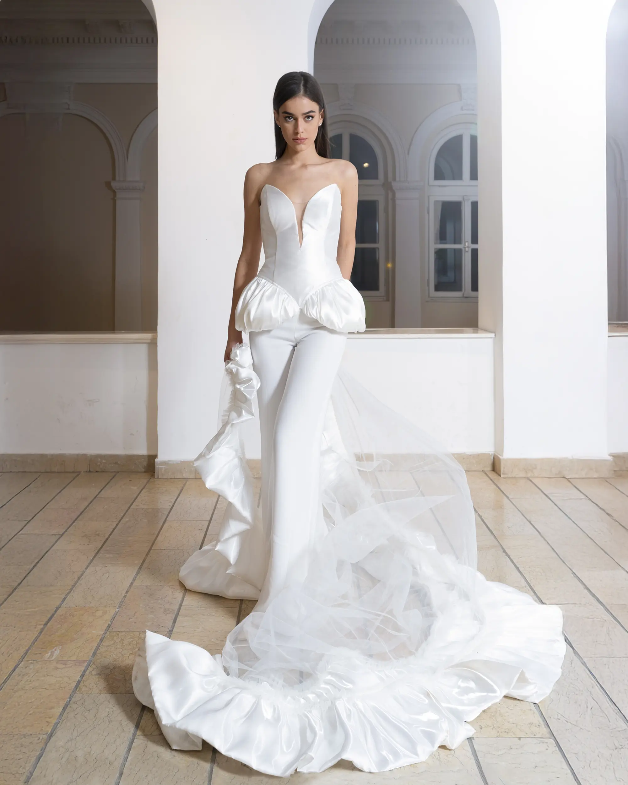 Strapless white bridal corset with sculptural peplum and tailored trousers, accented by dramatic detachable ruffled tulle for statement bridal impact.