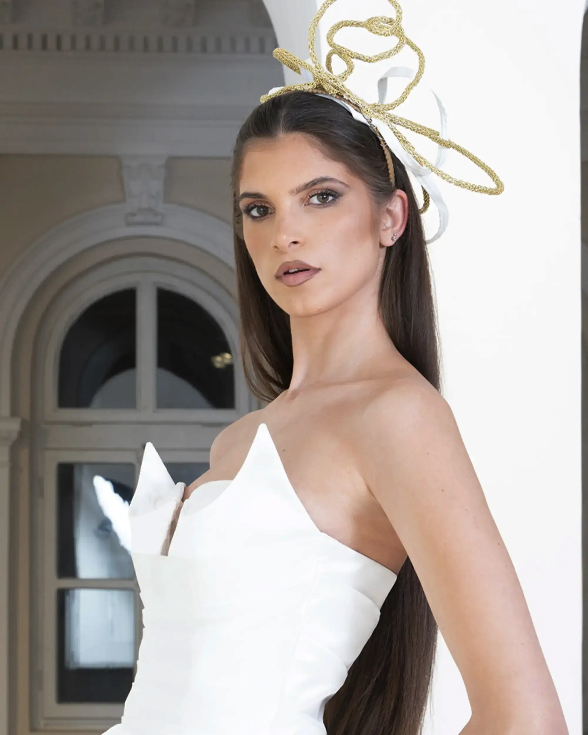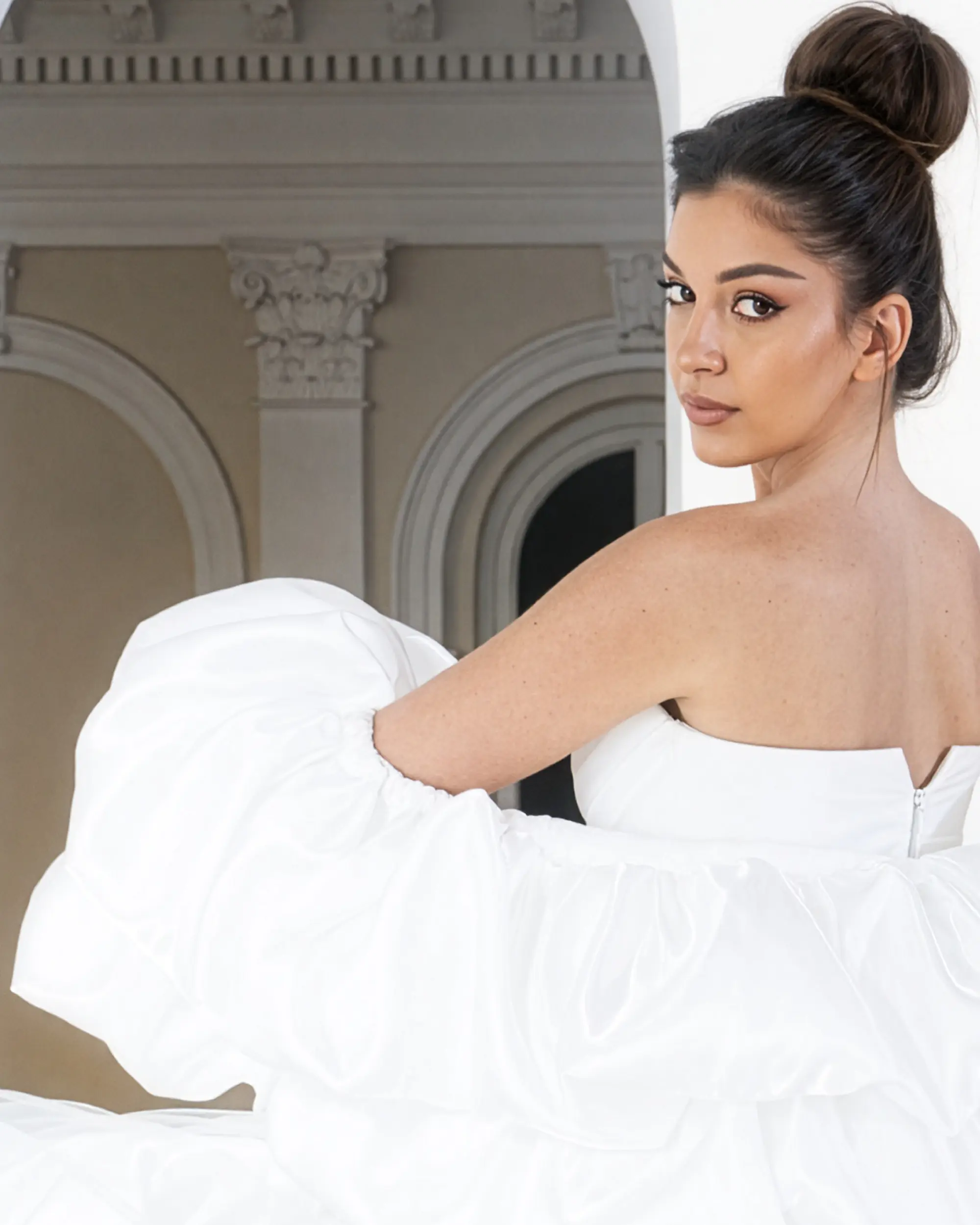 Bridal femininity unfolds—pure, sculptural, and tender, like a vow spoken in silence between arches and light.