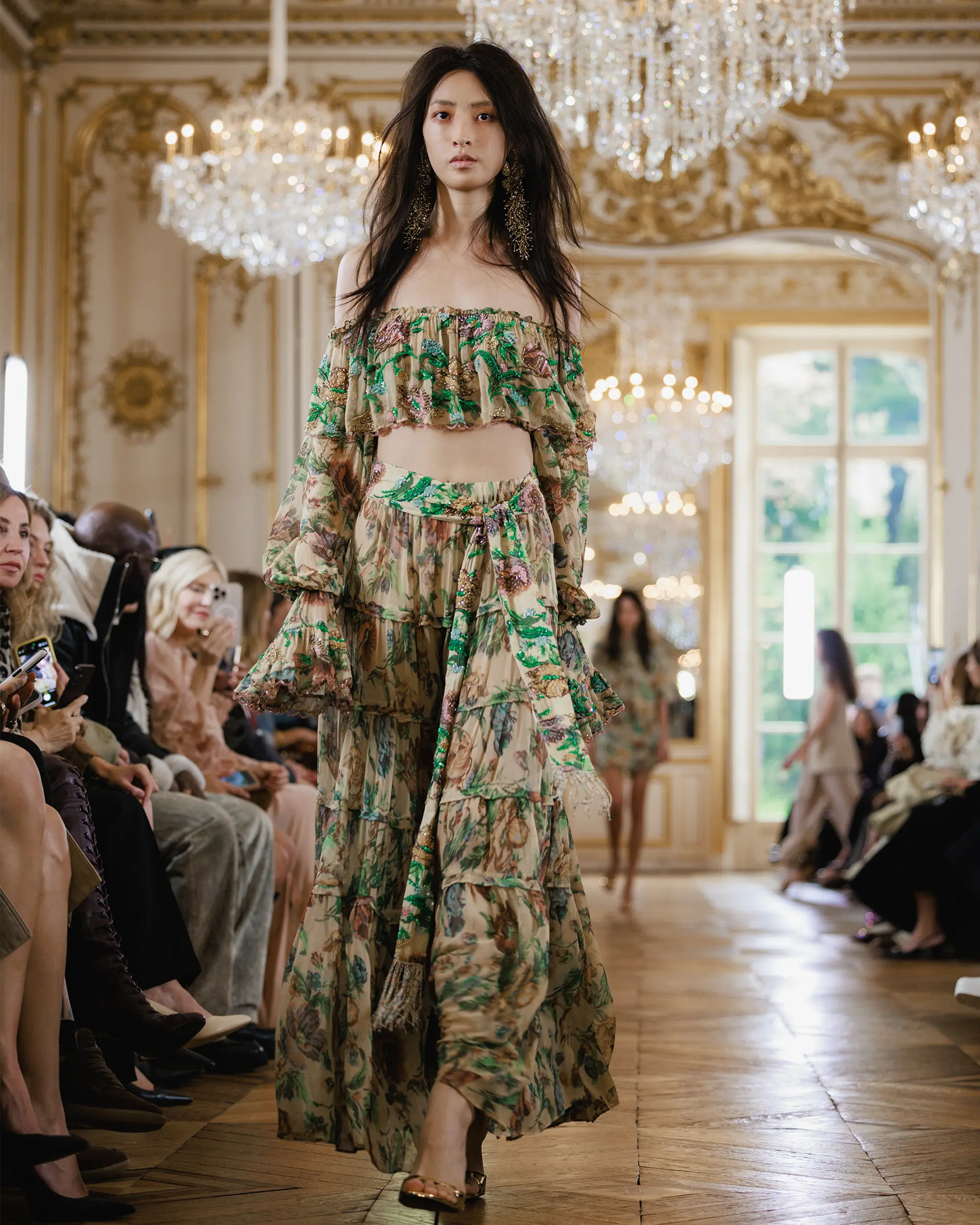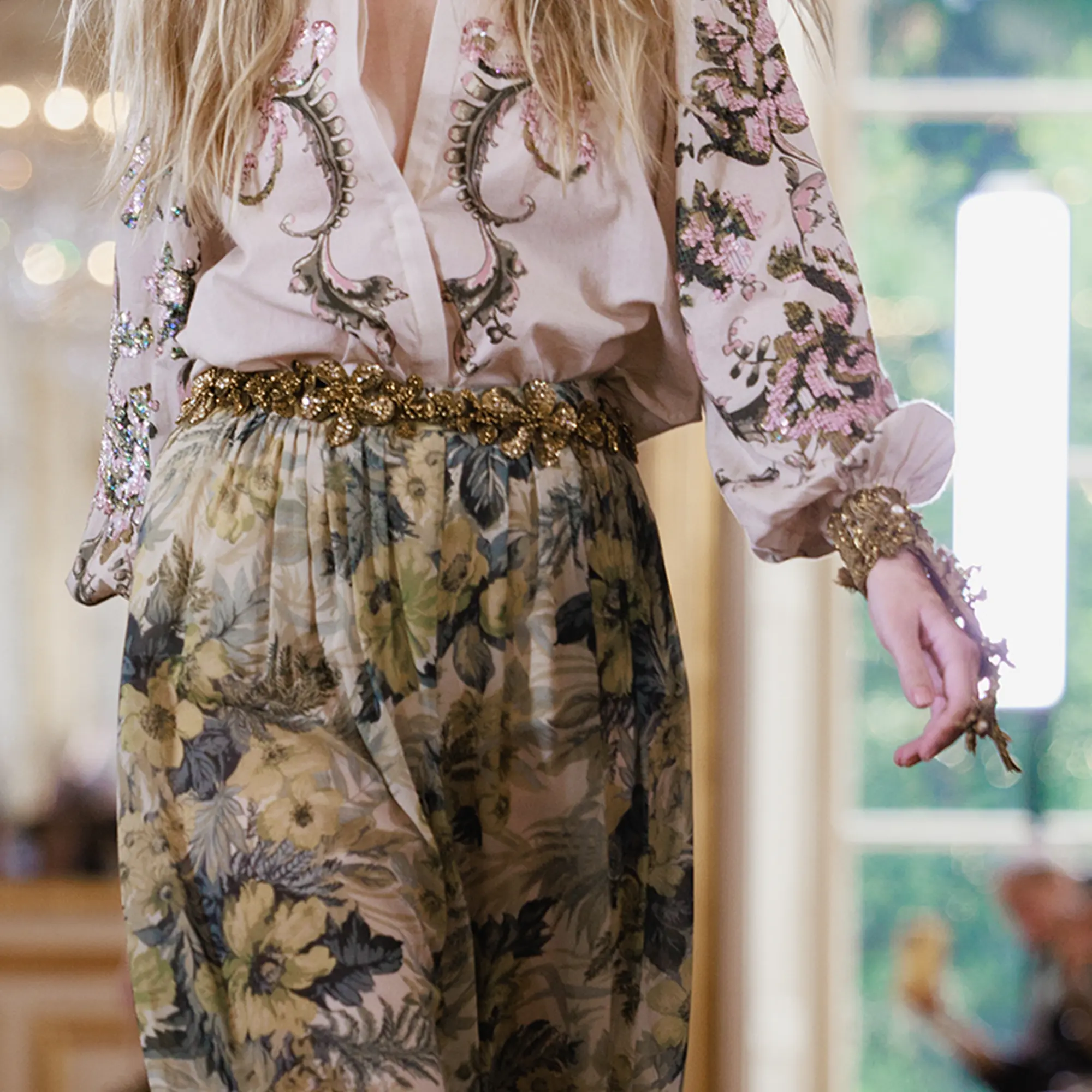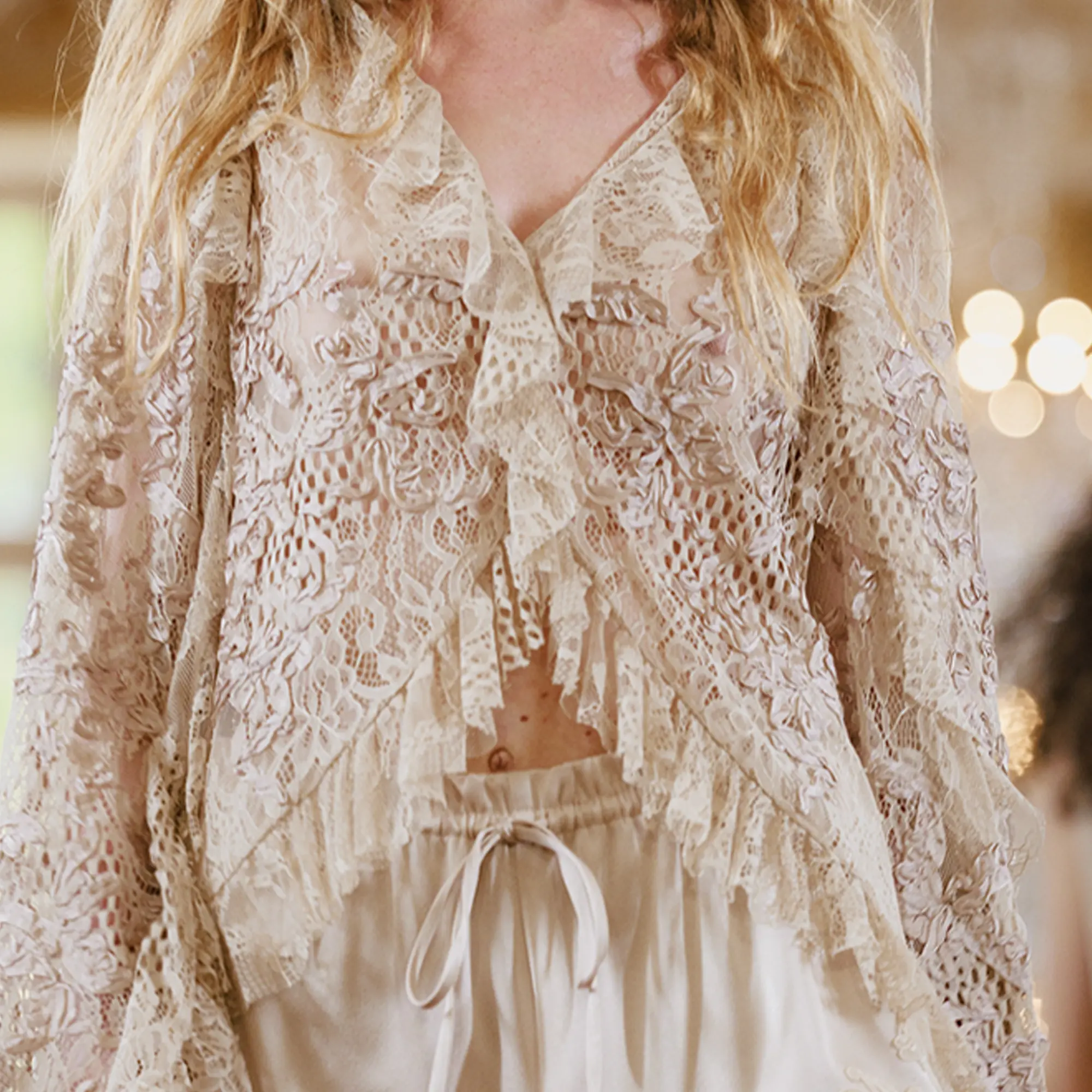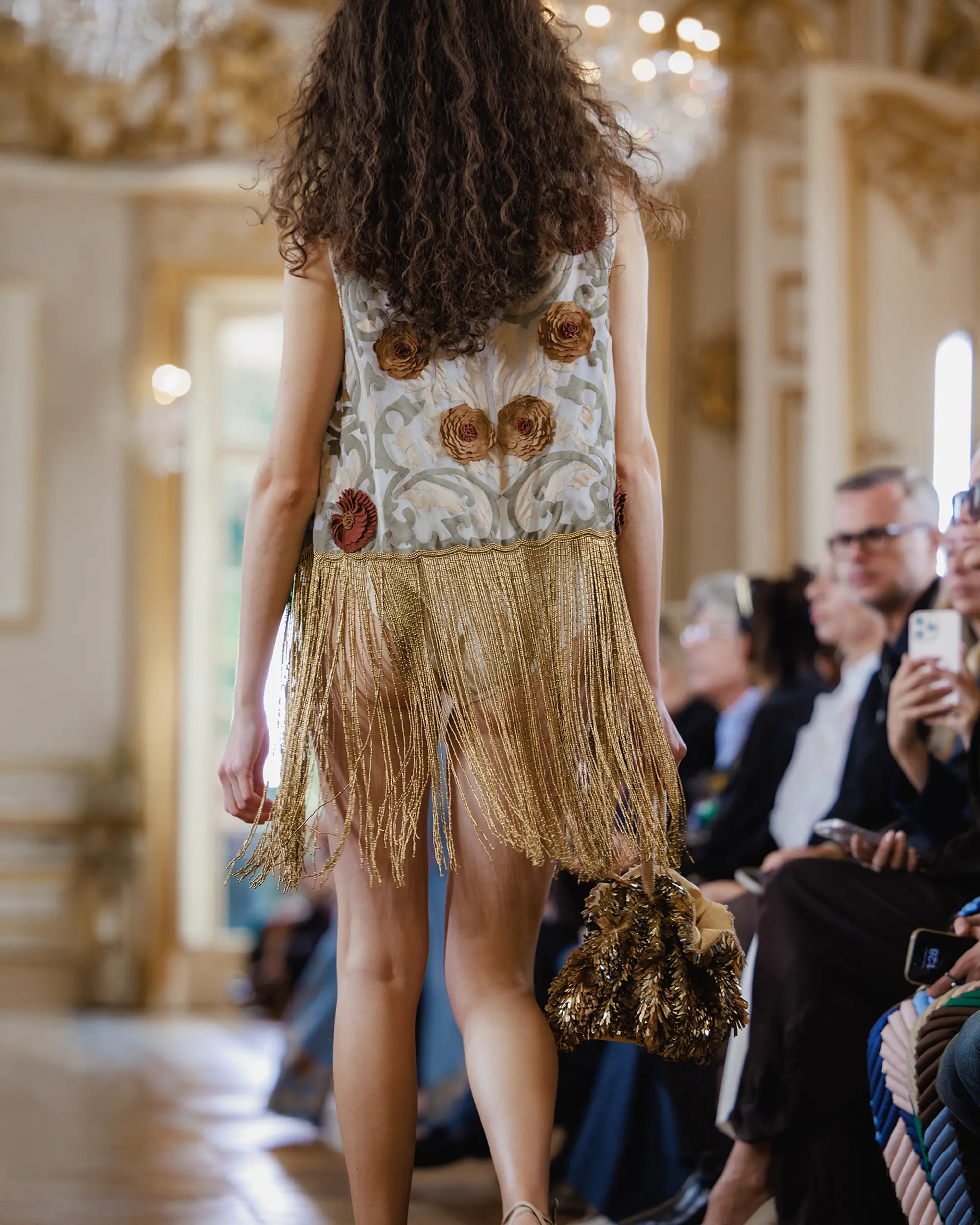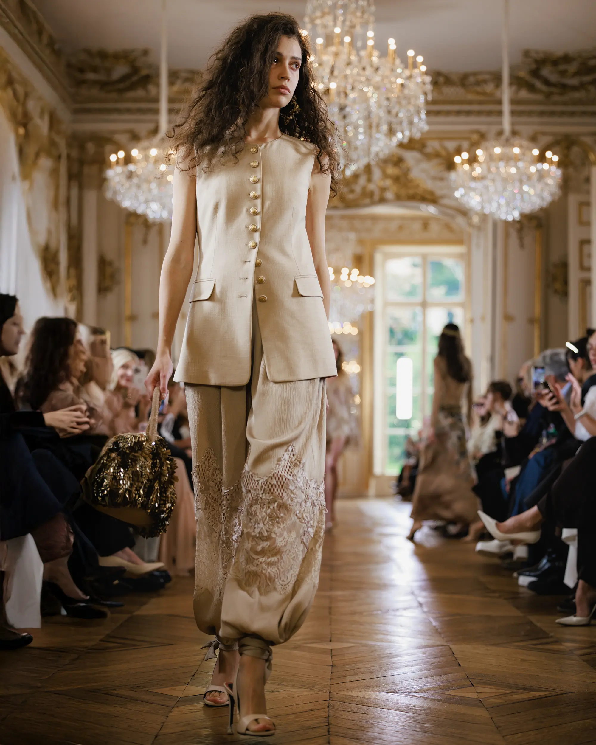 系列延续自由而优雅的气息,整体弥漫着 1970 年代的轻松韵致。飘逸的荷叶边连衣裙、浪漫的衬衫与松弛的哈伦裤随模特步伐轻缓滑过秀道,点缀以花卉刺绣、珠饰流苏与细腻纹理。自然灵感的配色——柔金、日晒沙色、浅玫瑰粉、淡绿色与大地色调——为系列的青春灵动与精致内敛铺陈出宁静氛围。