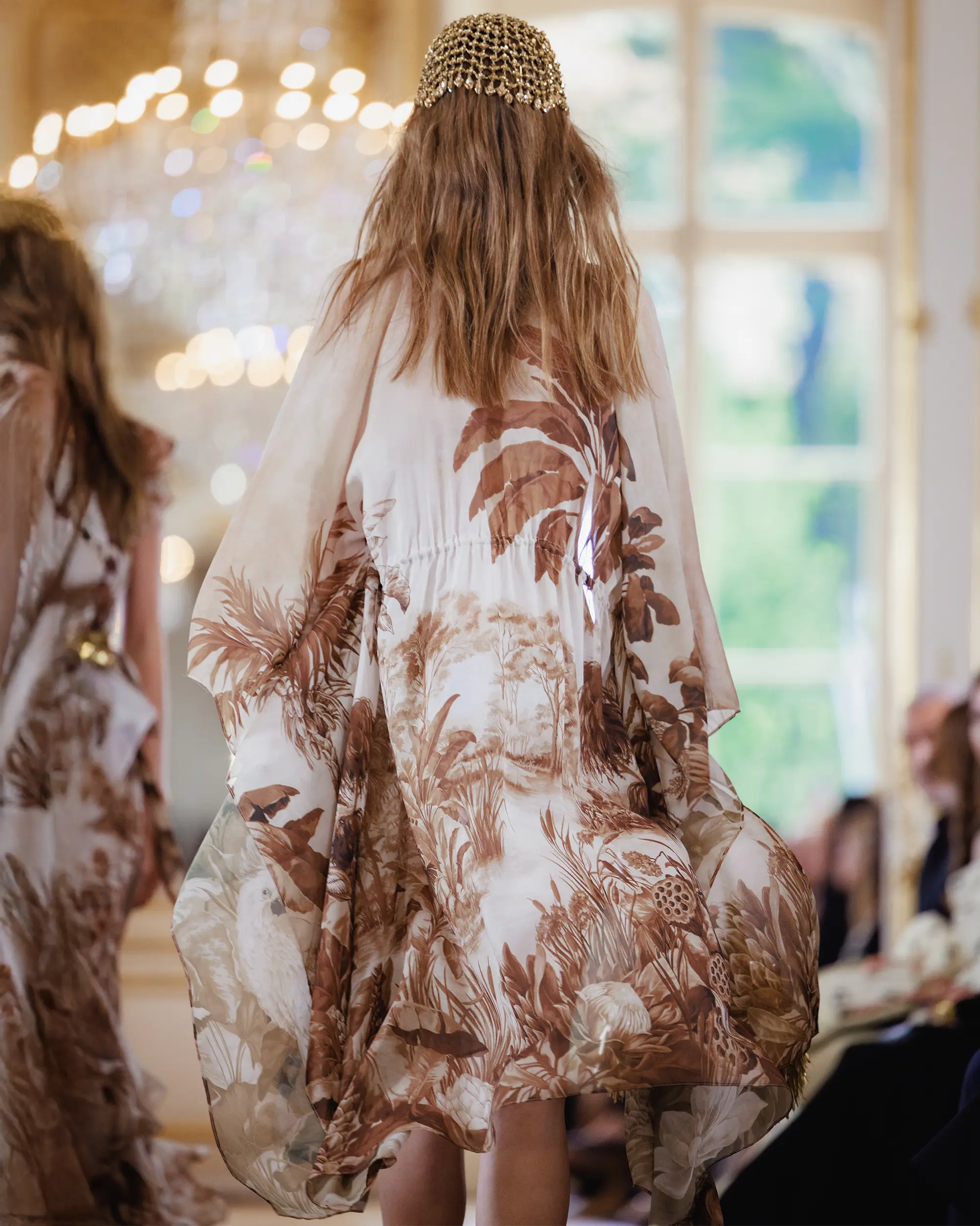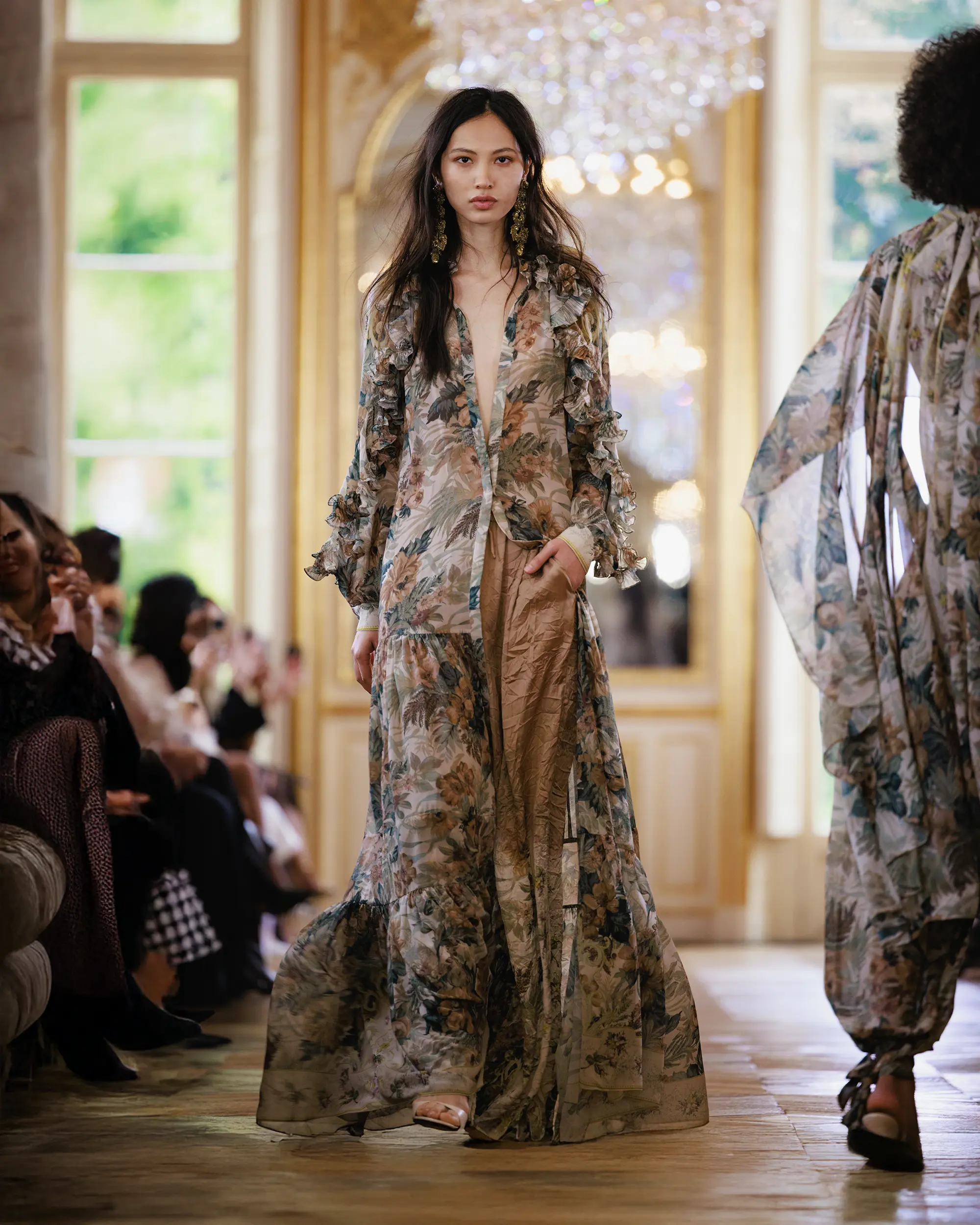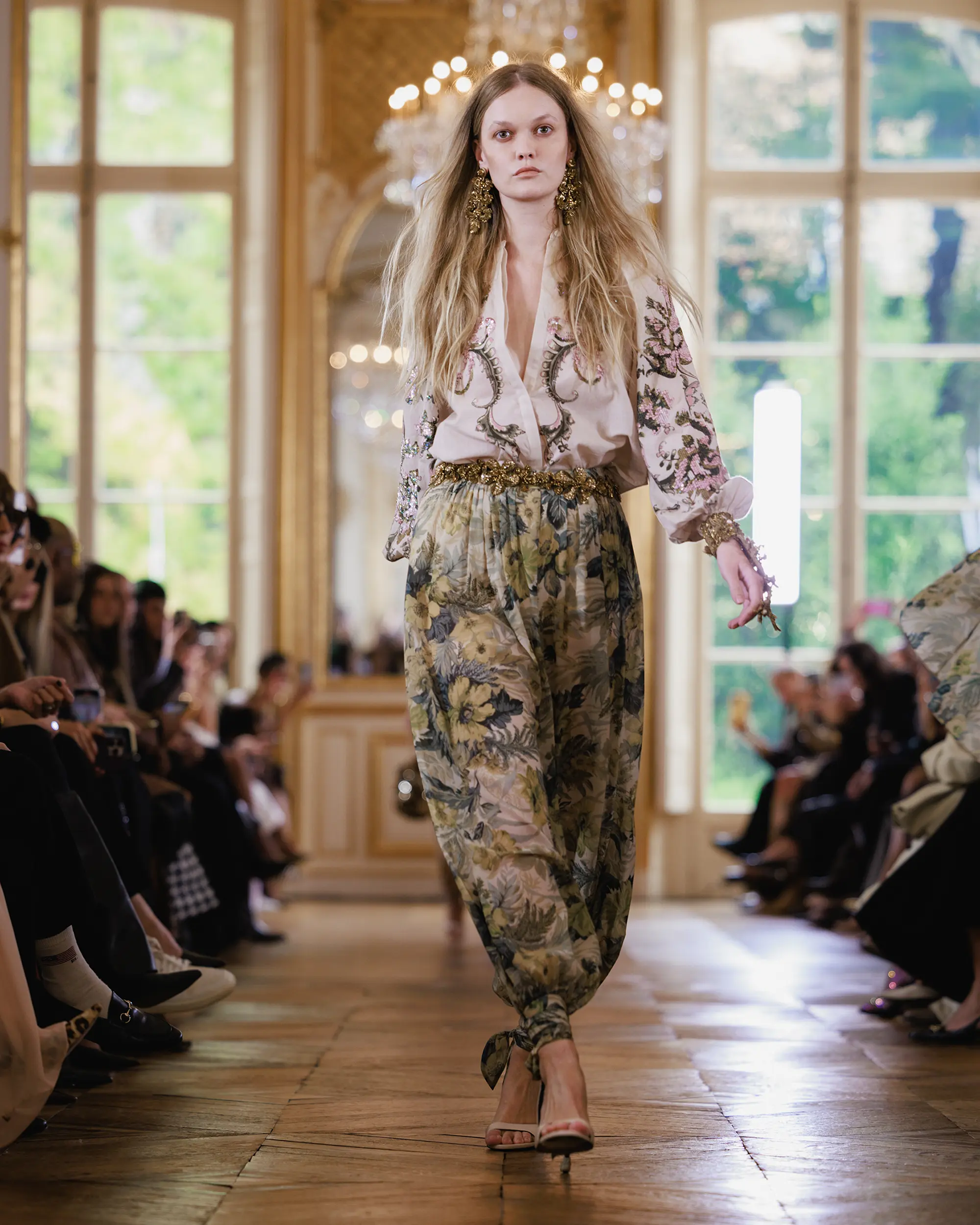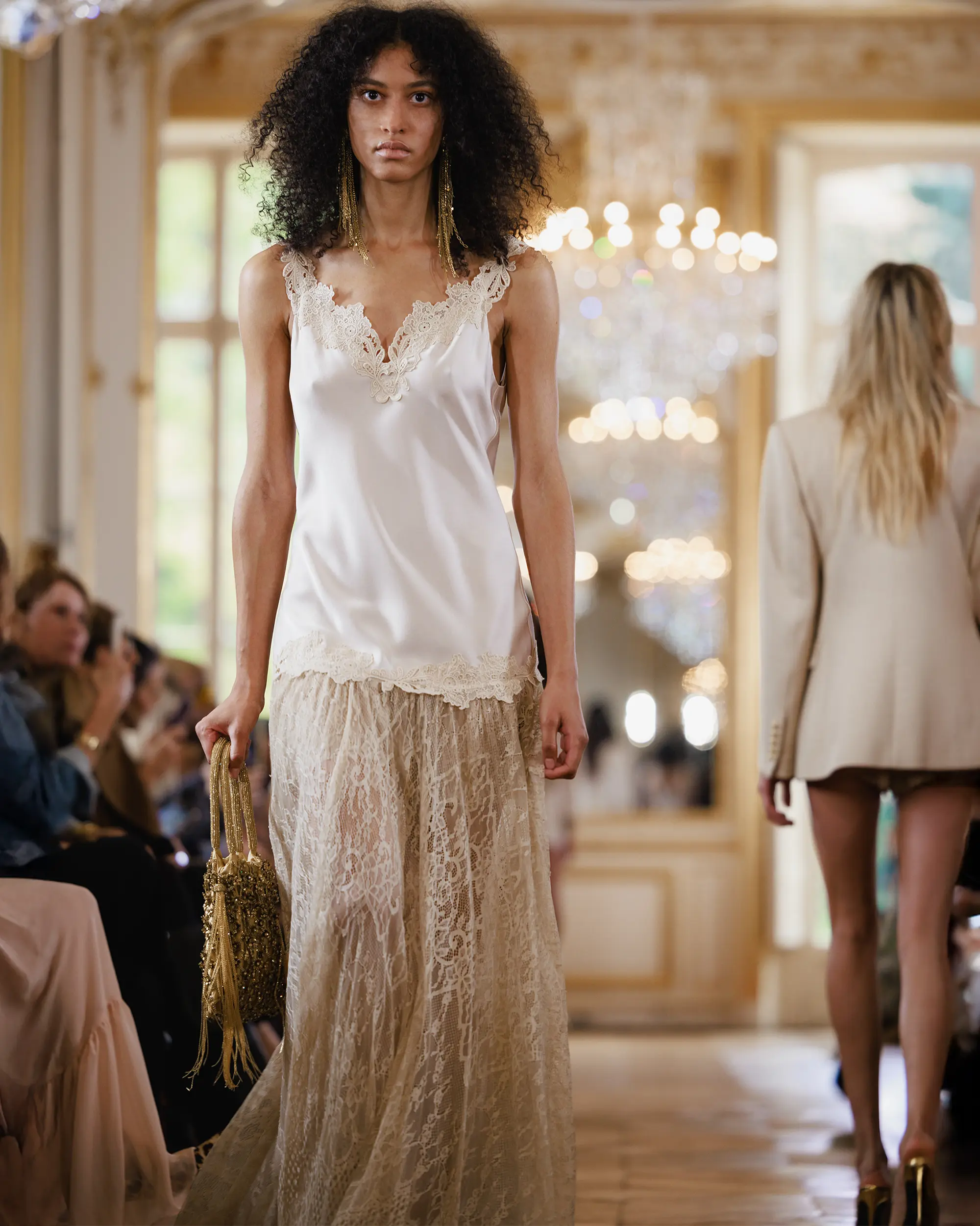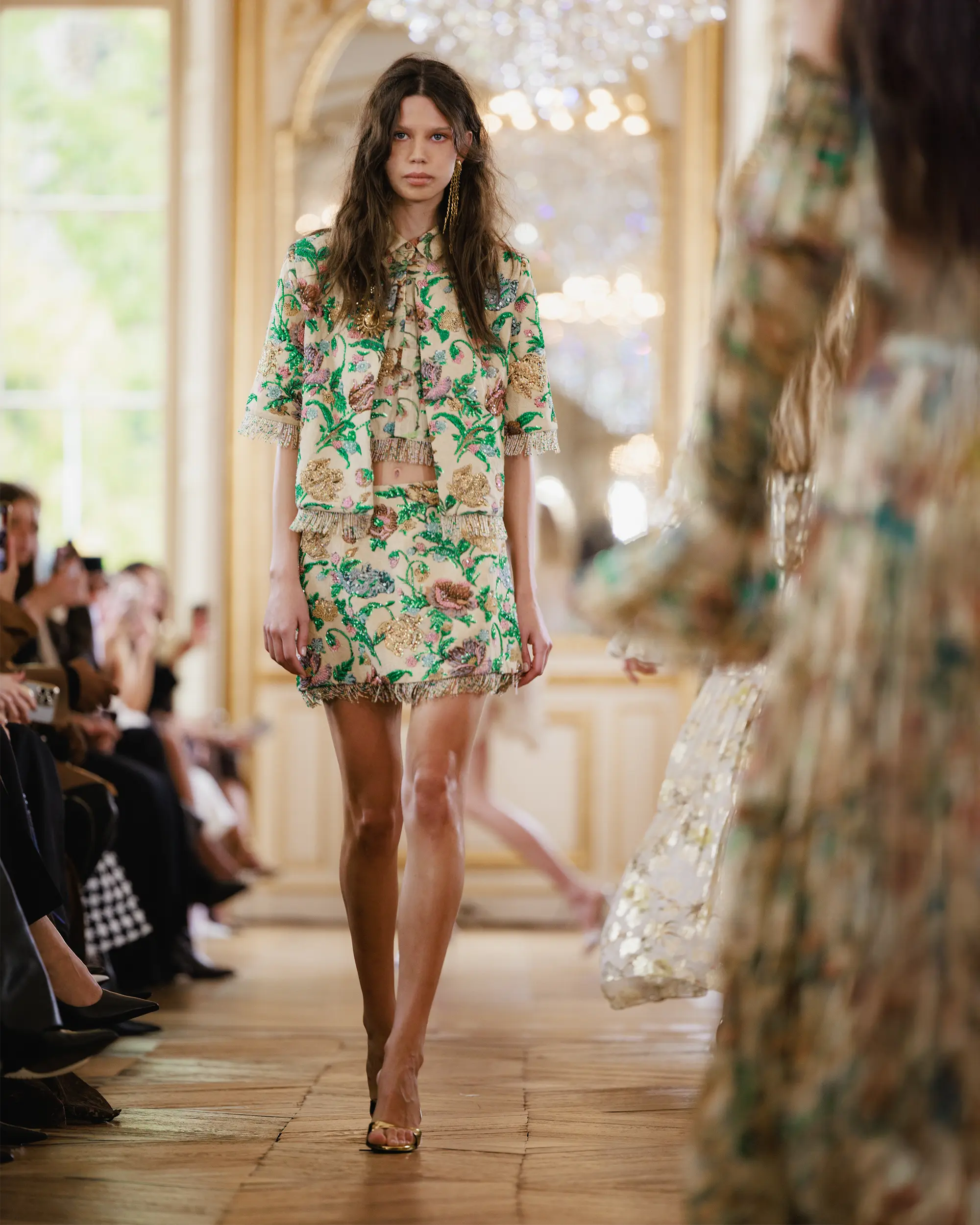系列延续自由而优雅的气息,整体弥漫着 1970 年代的轻松韵致。飘逸的荷叶边连衣裙、浪漫的衬衫与松弛的哈伦裤随模特步伐轻缓滑过秀道,点缀以花卉刺绣、珠饰流苏与细腻纹理。自然灵感的配色——柔金、日晒沙色、浅玫瑰粉、淡绿色与大地色调——为系列的青春灵动与精致内敛铺陈出宁静氛围。