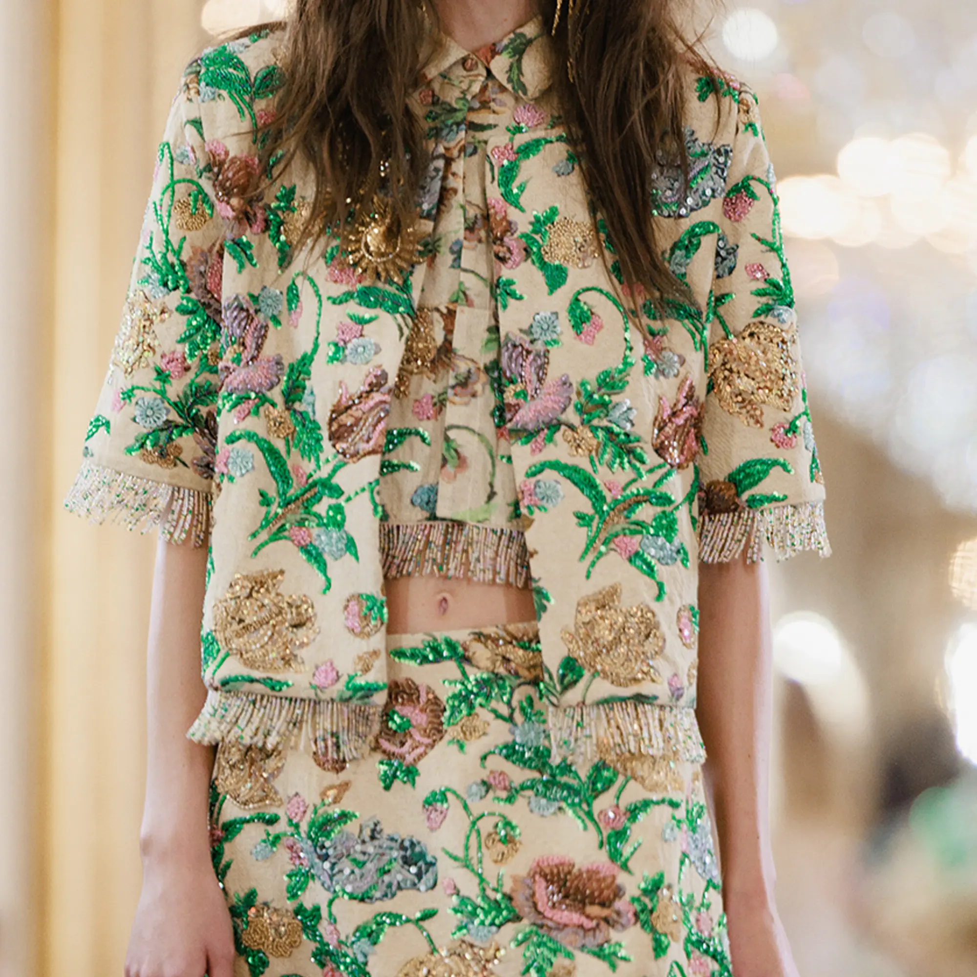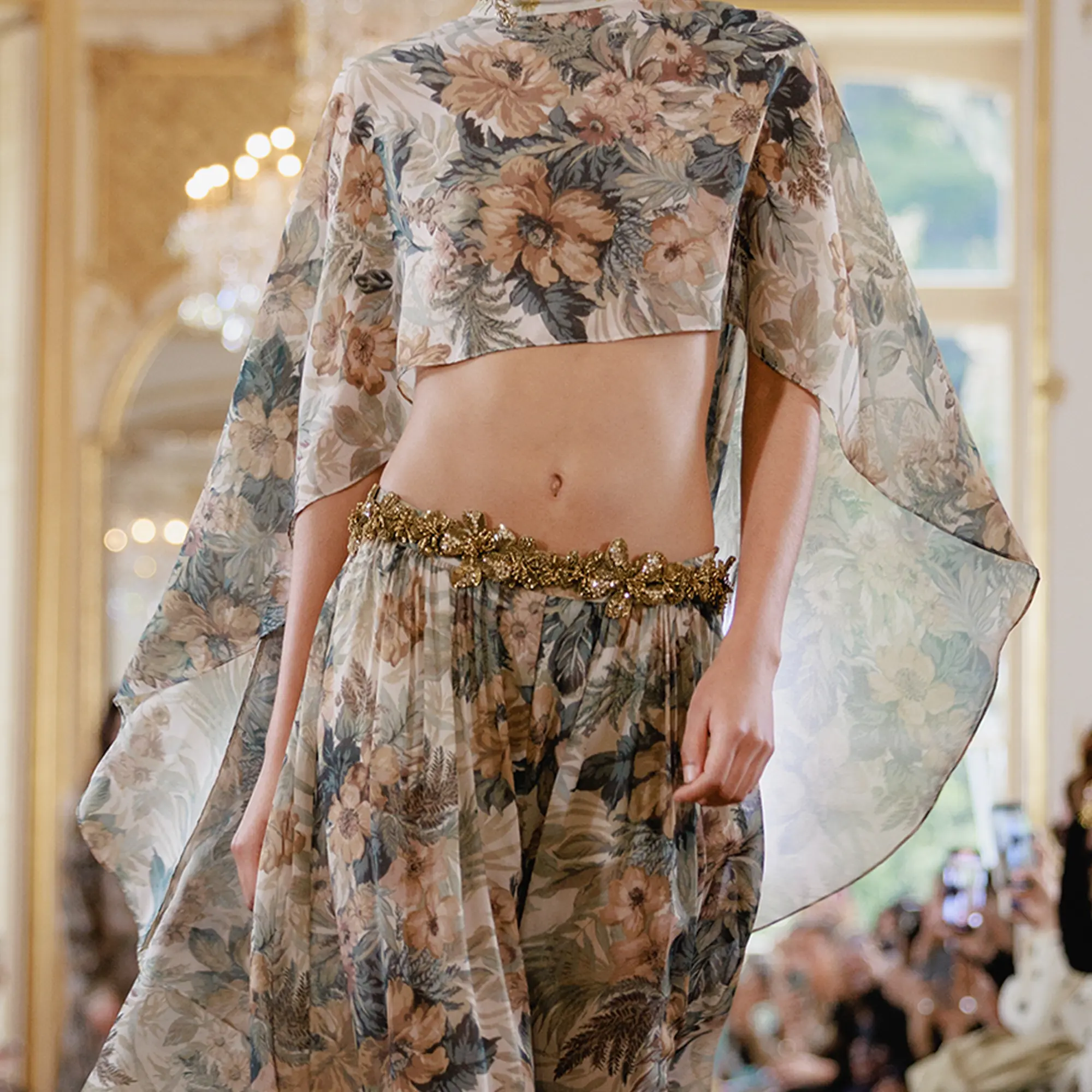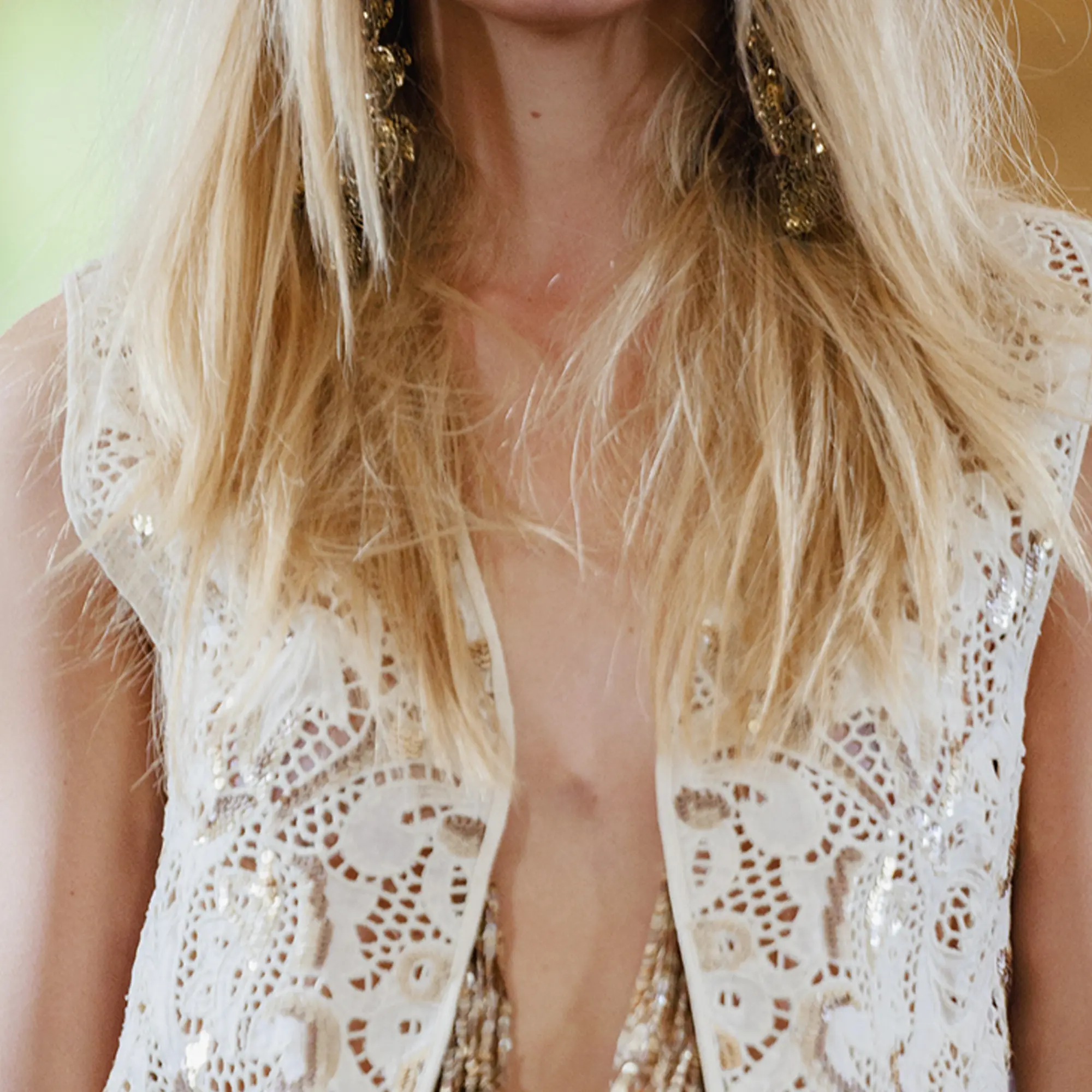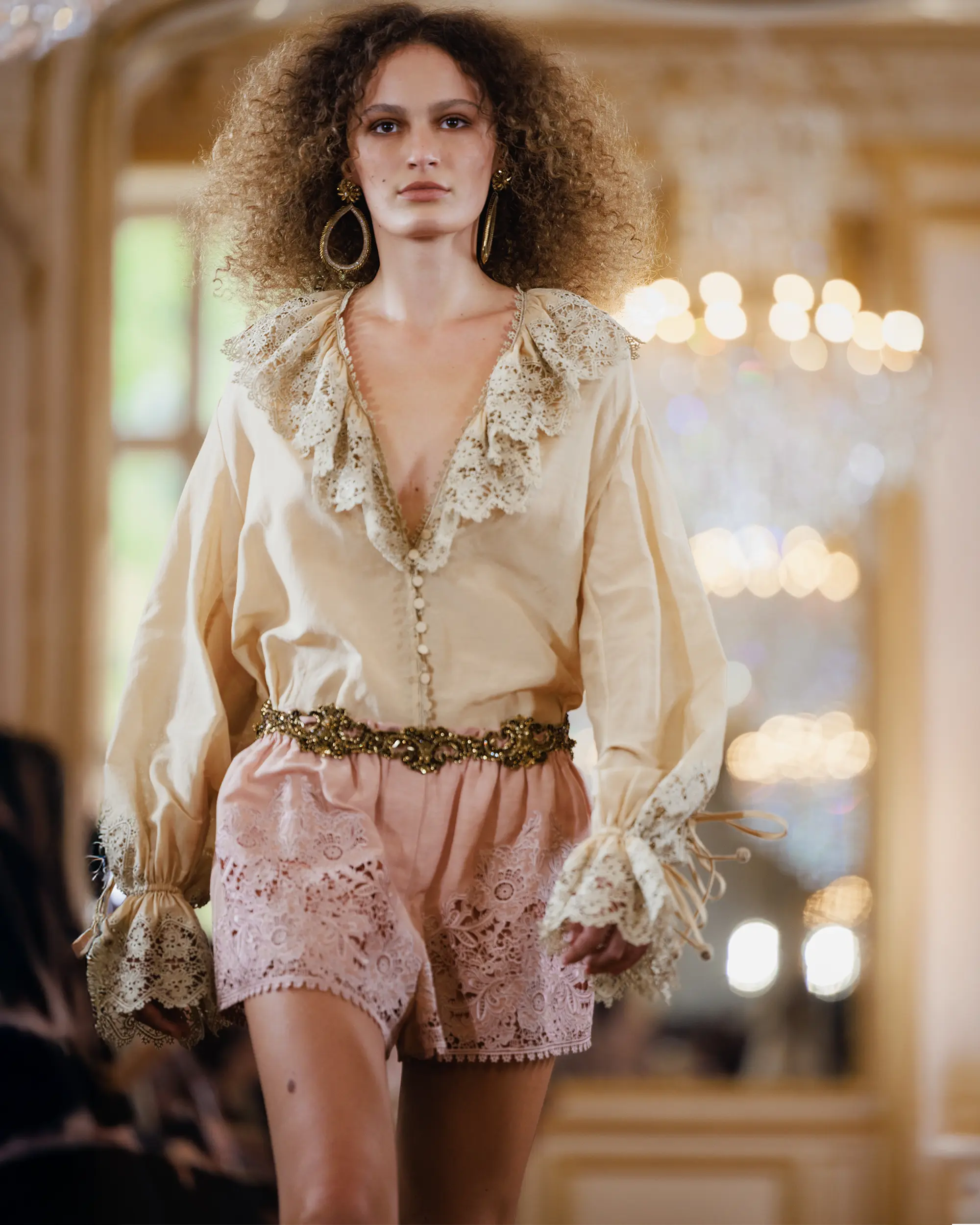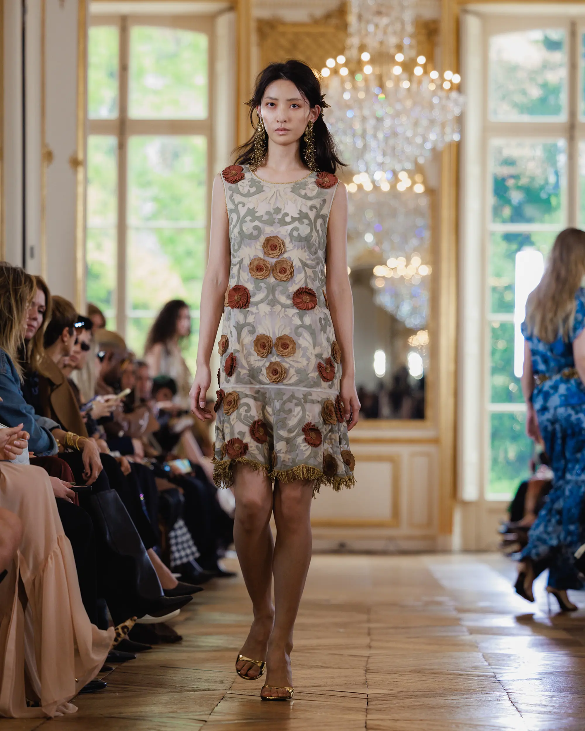 系列延续自由而优雅的气息,整体弥漫着 1970 年代的轻松韵致。飘逸的荷叶边连衣裙、浪漫的衬衫与松弛的哈伦裤随模特步伐轻缓滑过秀道,点缀以花卉刺绣、珠饰流苏与细腻纹理。自然灵感的配色——柔金、日晒沙色、浅玫瑰粉、淡绿色与大地色调——为系列的青春灵动与精致内敛铺陈出宁静氛围。