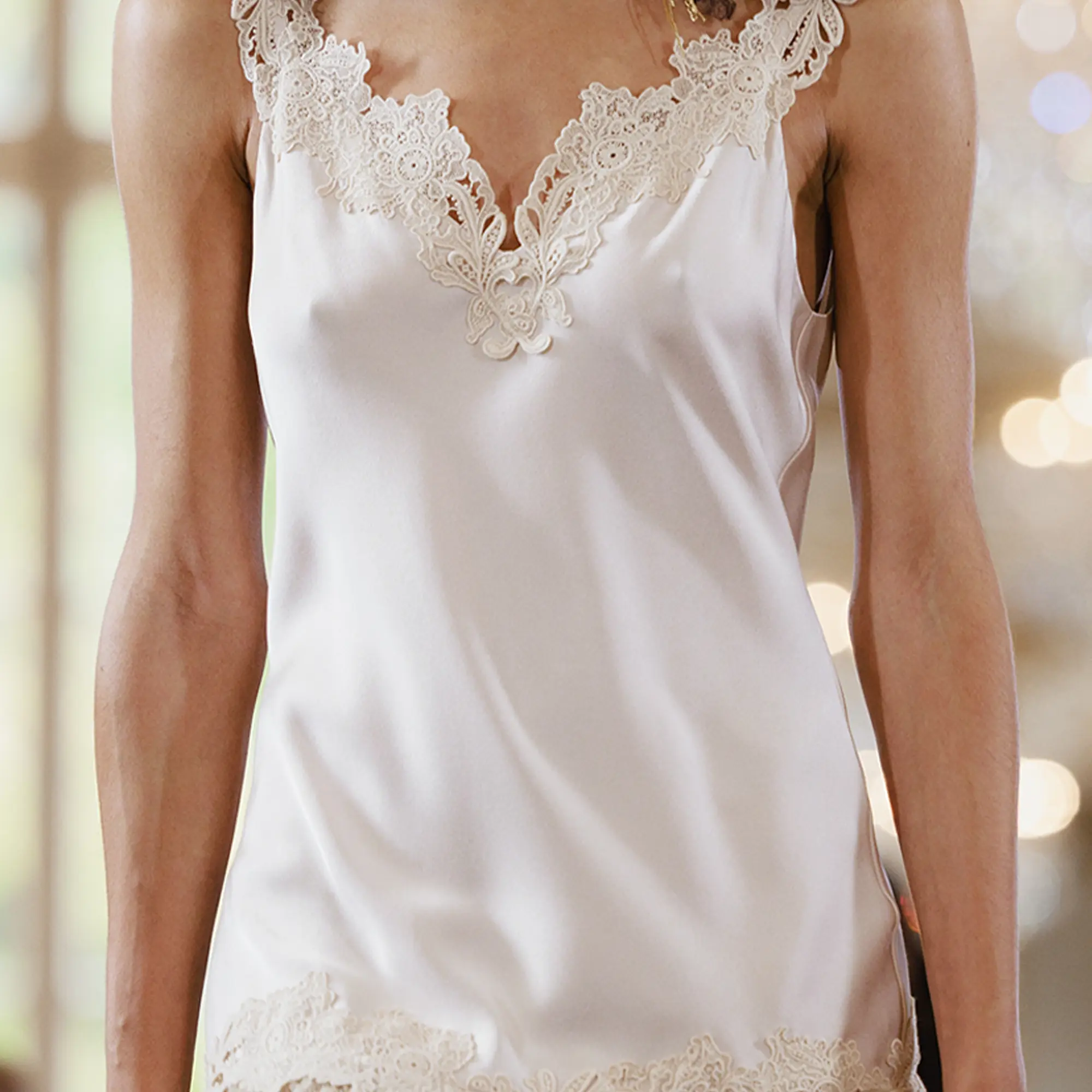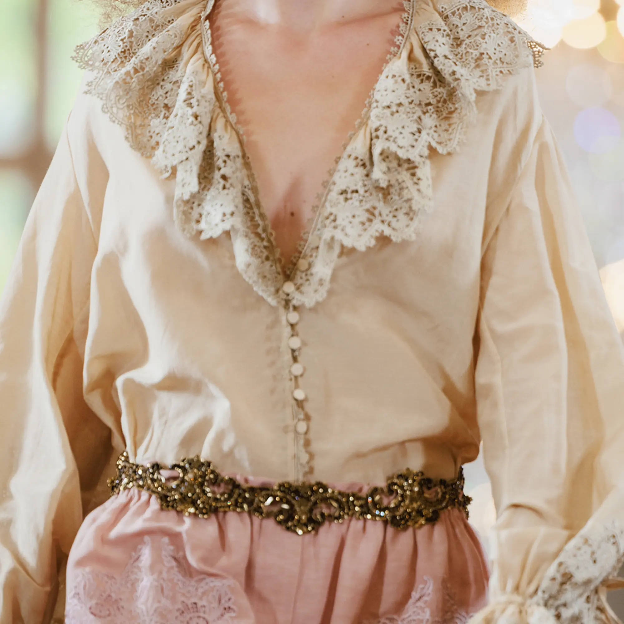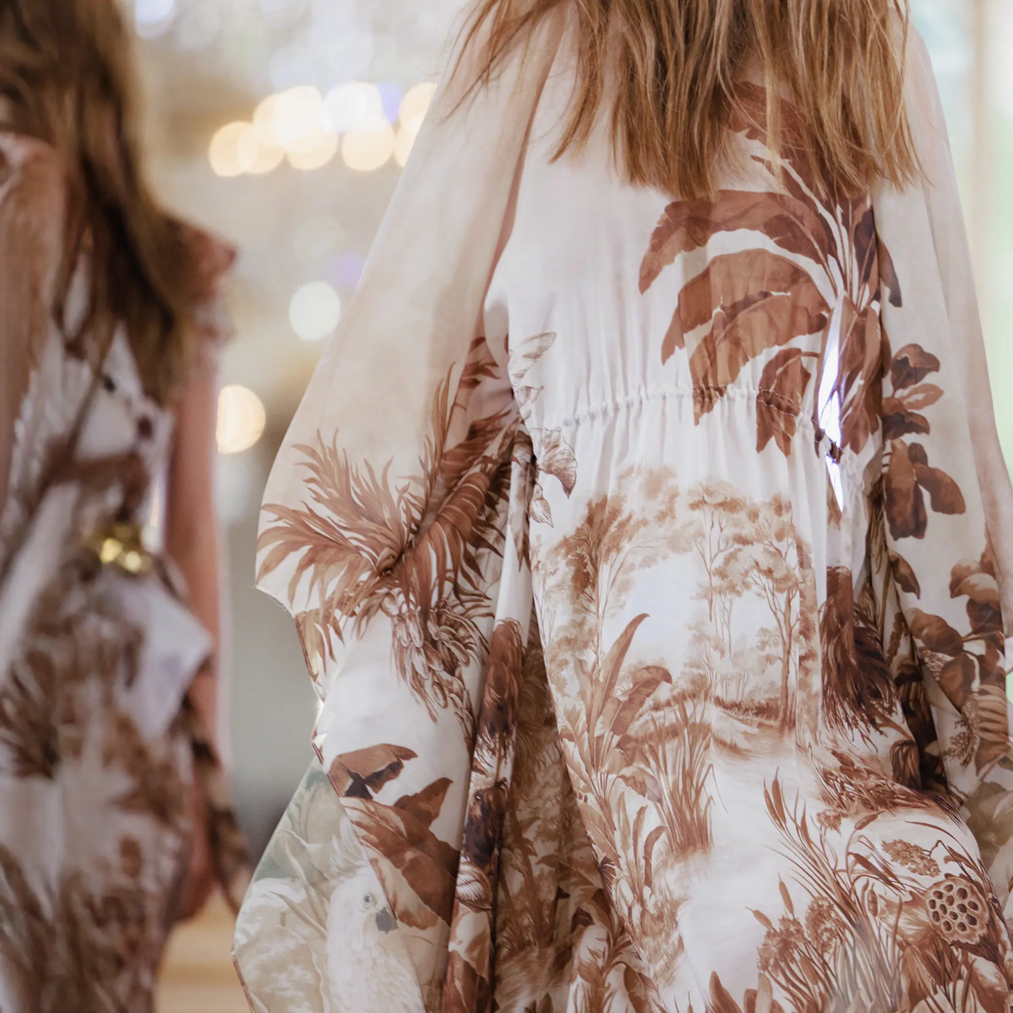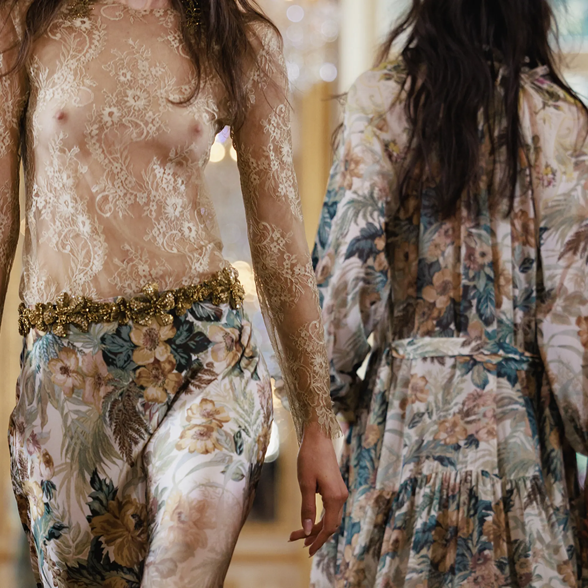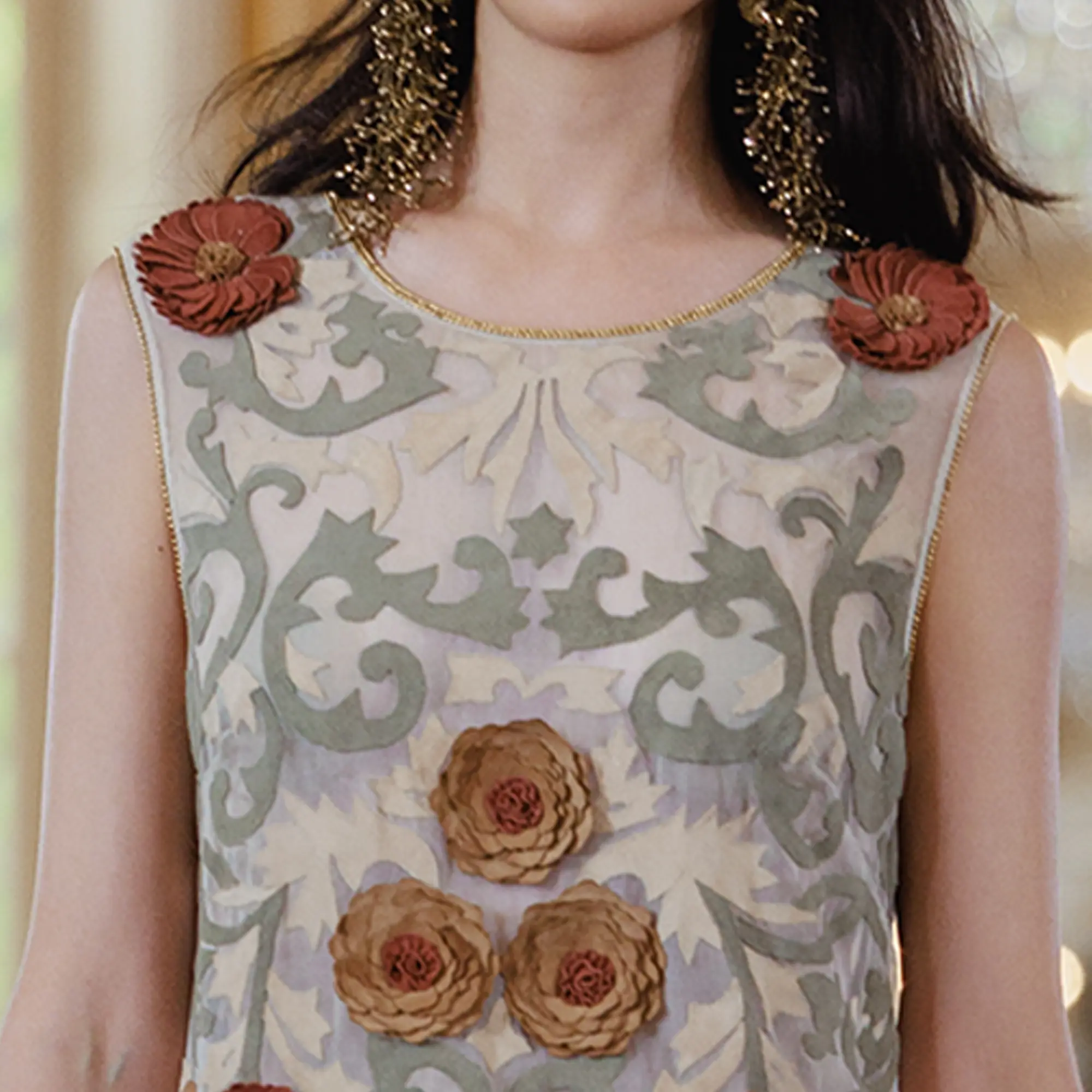 系列延续自由而优雅的气息,整体弥漫着 1970 年代的轻松韵致。飘逸的荷叶边连衣裙、浪漫的衬衫与松弛的哈伦裤随模特步伐轻缓滑过秀道,点缀以花卉刺绣、珠饰流苏与细腻纹理。自然灵感的配色——柔金、日晒沙色、浅玫瑰粉、淡绿色与大地色调——为系列的青春灵动与精致内敛铺陈出宁静氛围。