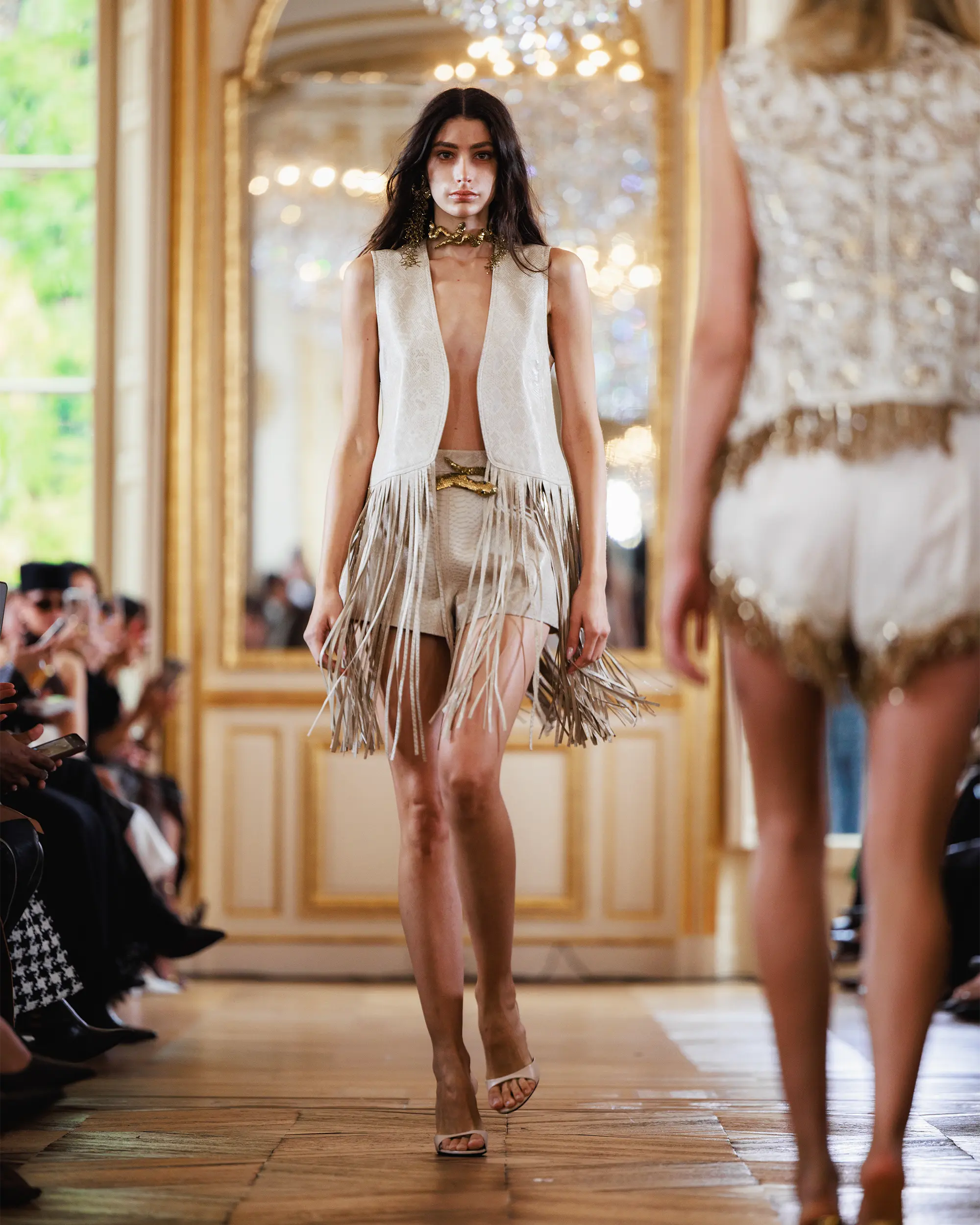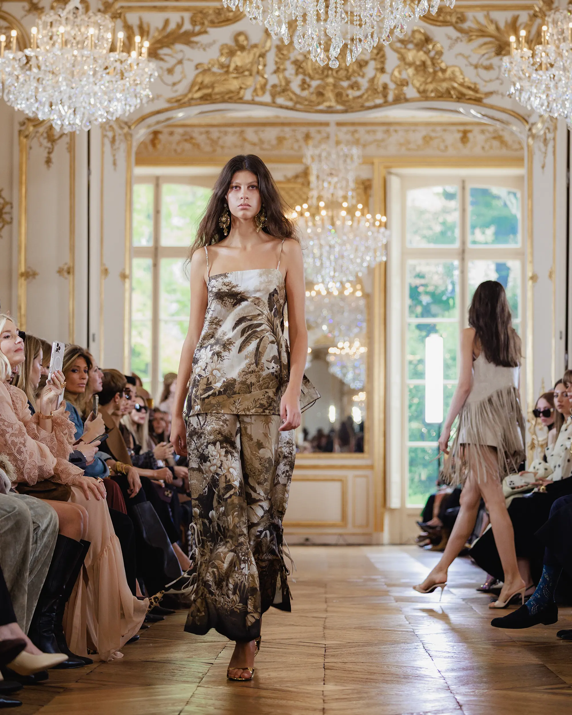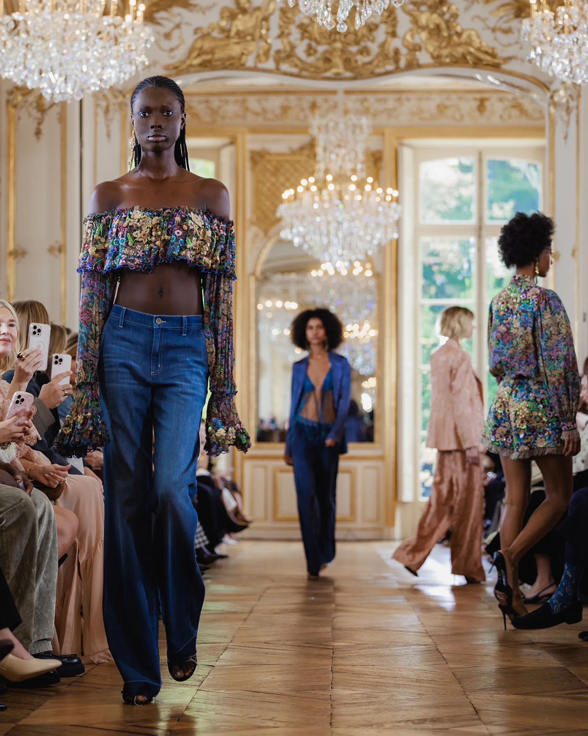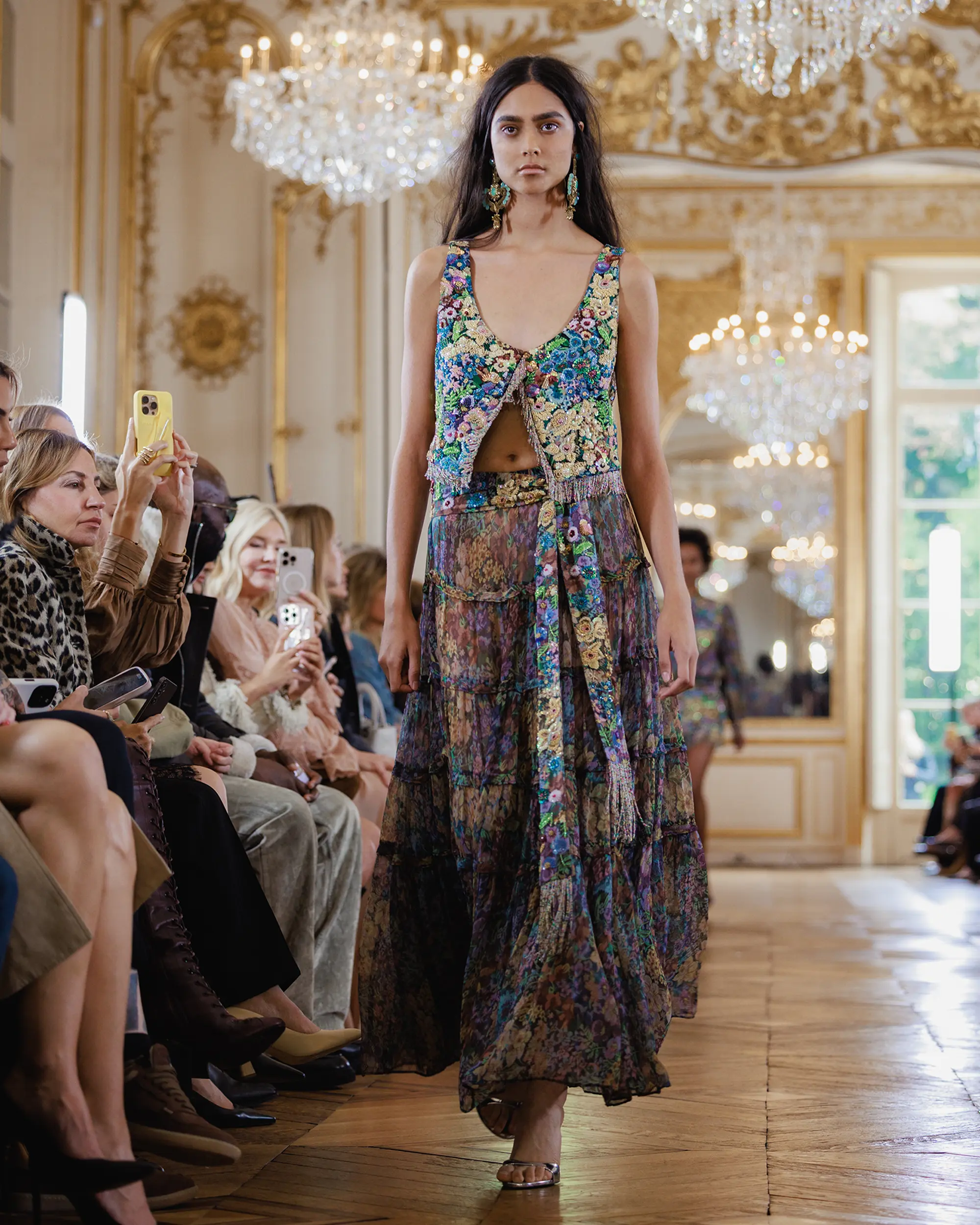质感与动感是 Halperin 叙事的核心。薄纱刺绣礼服轻盈飘动,宛若诗意;剪裁利落的马甲与闪耀裤装套装则为整体增添了建筑般的平衡感。即便是靛蓝牛仔,也因 Halperin 精准的工艺而变得更为摩登。印花哈伦裤随步伐微微摆动,散发低调感性的魅力;而刺绣花朵、闪亮珠饰与轻软流苏在波希浪漫与现代精致之间构筑起一场对话。