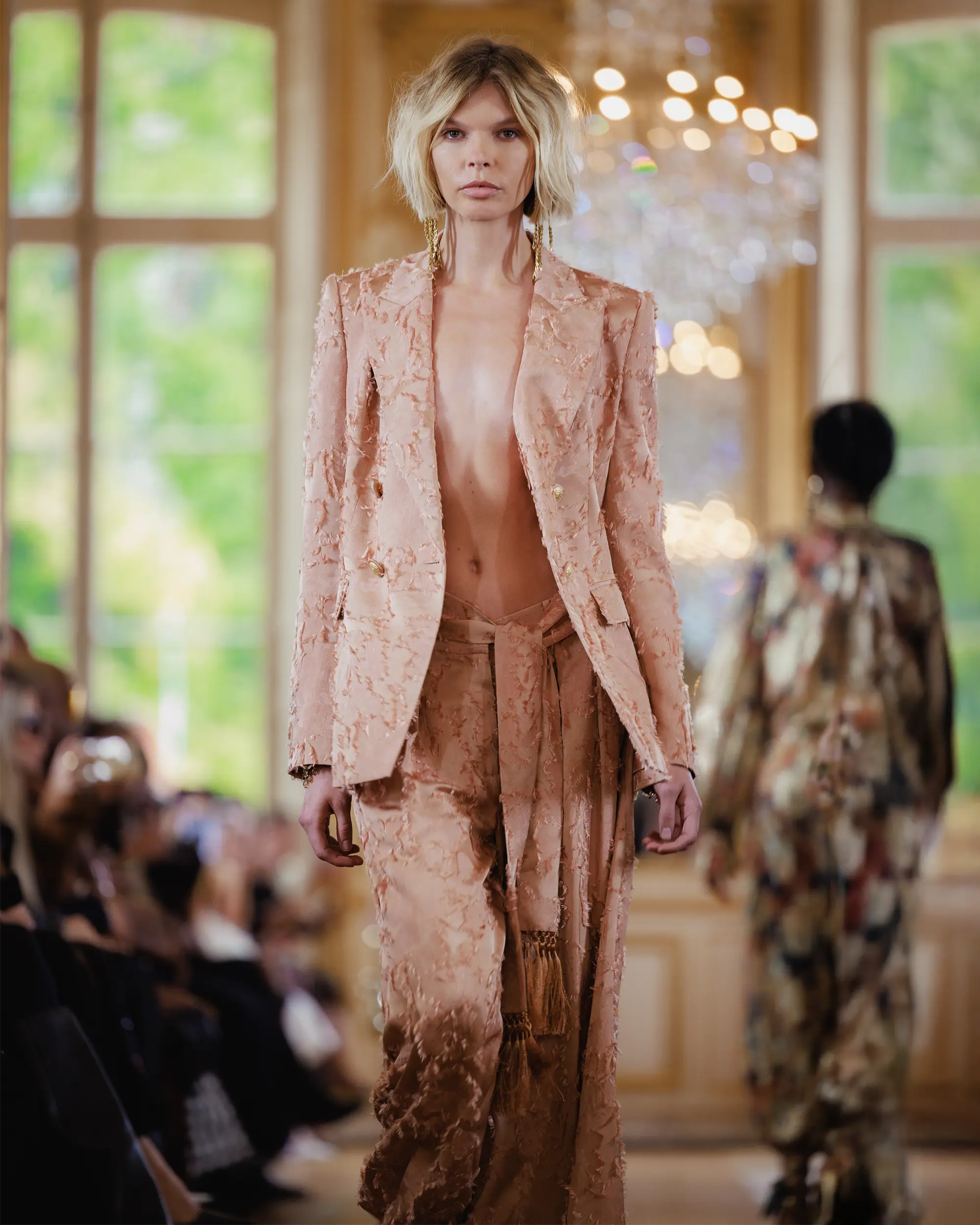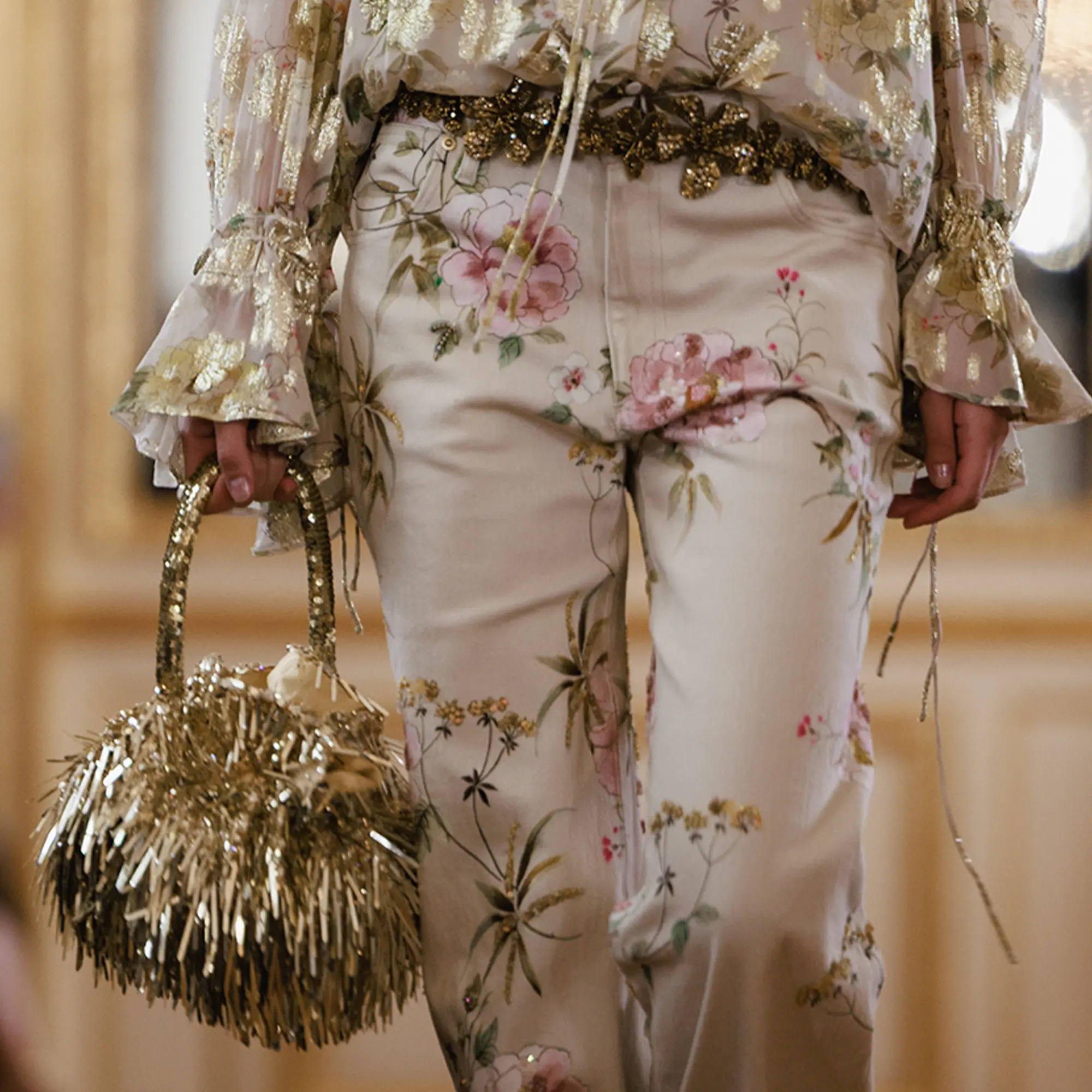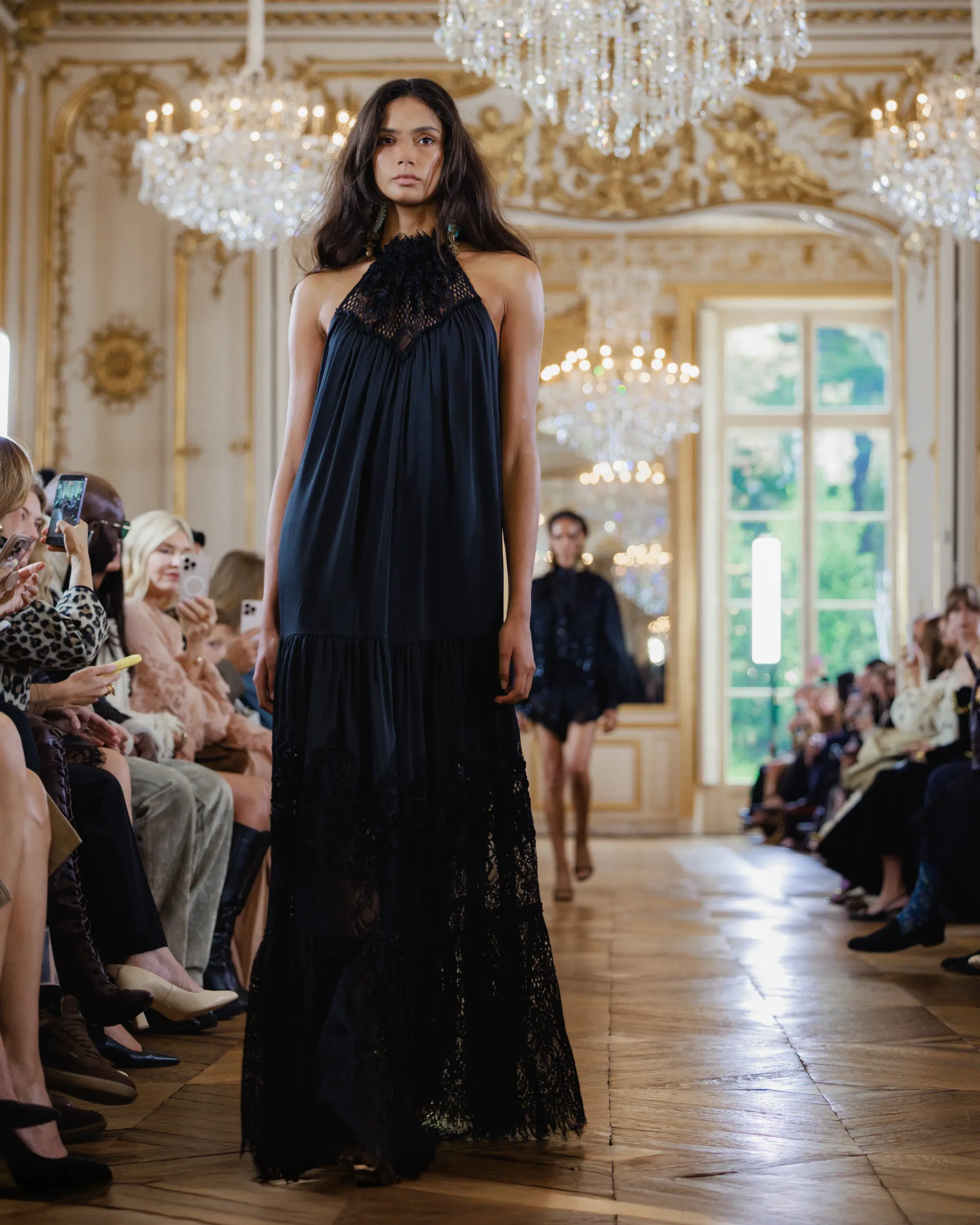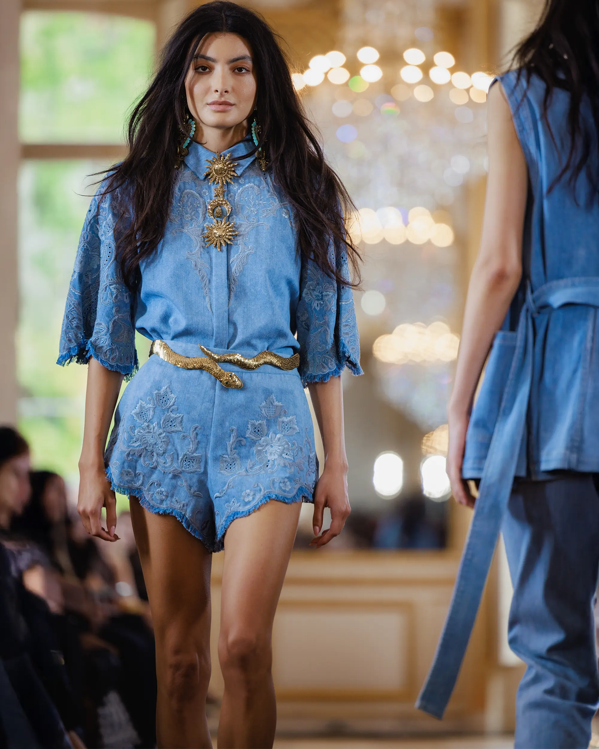 质感与动感是 Halperin 叙事的核心。薄纱刺绣礼服轻盈飘动,宛若诗意;剪裁利落的马甲与闪耀裤装套装则为整体增添了建筑般的平衡感。即便是靛蓝牛仔,也因 Halperin 精准的工艺而变得更为摩登。印花哈伦裤随步伐微微摆动,散发低调感性的魅力;而刺绣花朵、闪亮珠饰与轻软流苏在波希浪漫与现代精致之间构筑起一场对话。